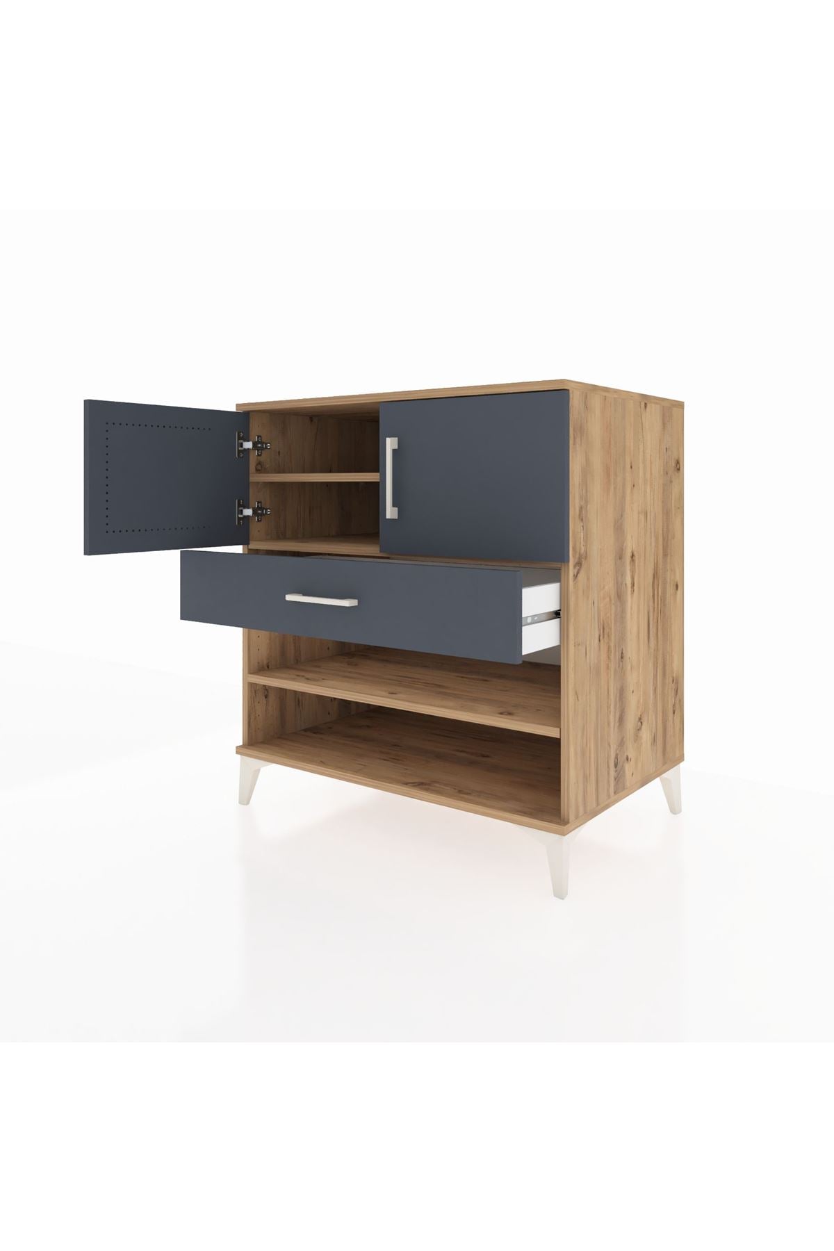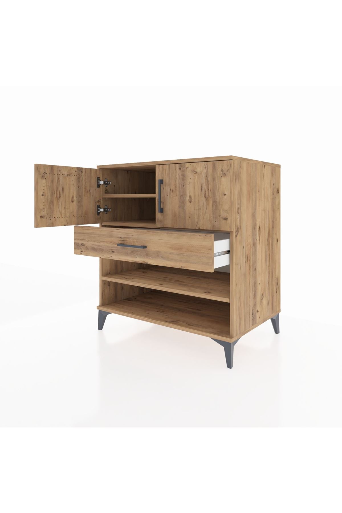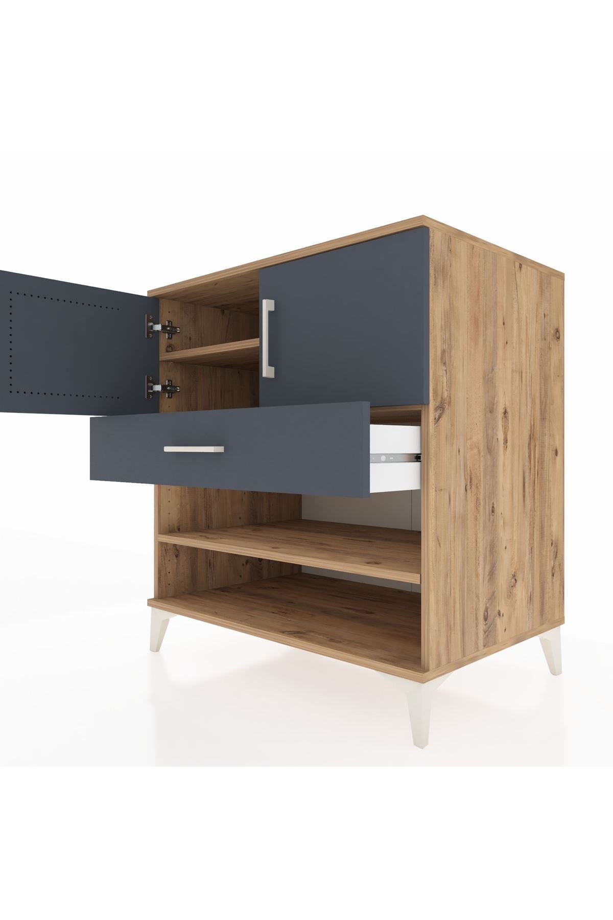 🦾 Şifonyerin tasarımında kullanılan metal ayaklar, hem modern bir görünüm sunar hem de sağlam bir yapı oluşturur. Metal ayaklar, şifonyerin dengesini korurken, aynı zamanda robot süpürge kullanımına da olanak tanır. Şık metal kulplar ise, dolap kapaklarının ve çekmecenin kolayca açılıp kapanmasını sağlar.