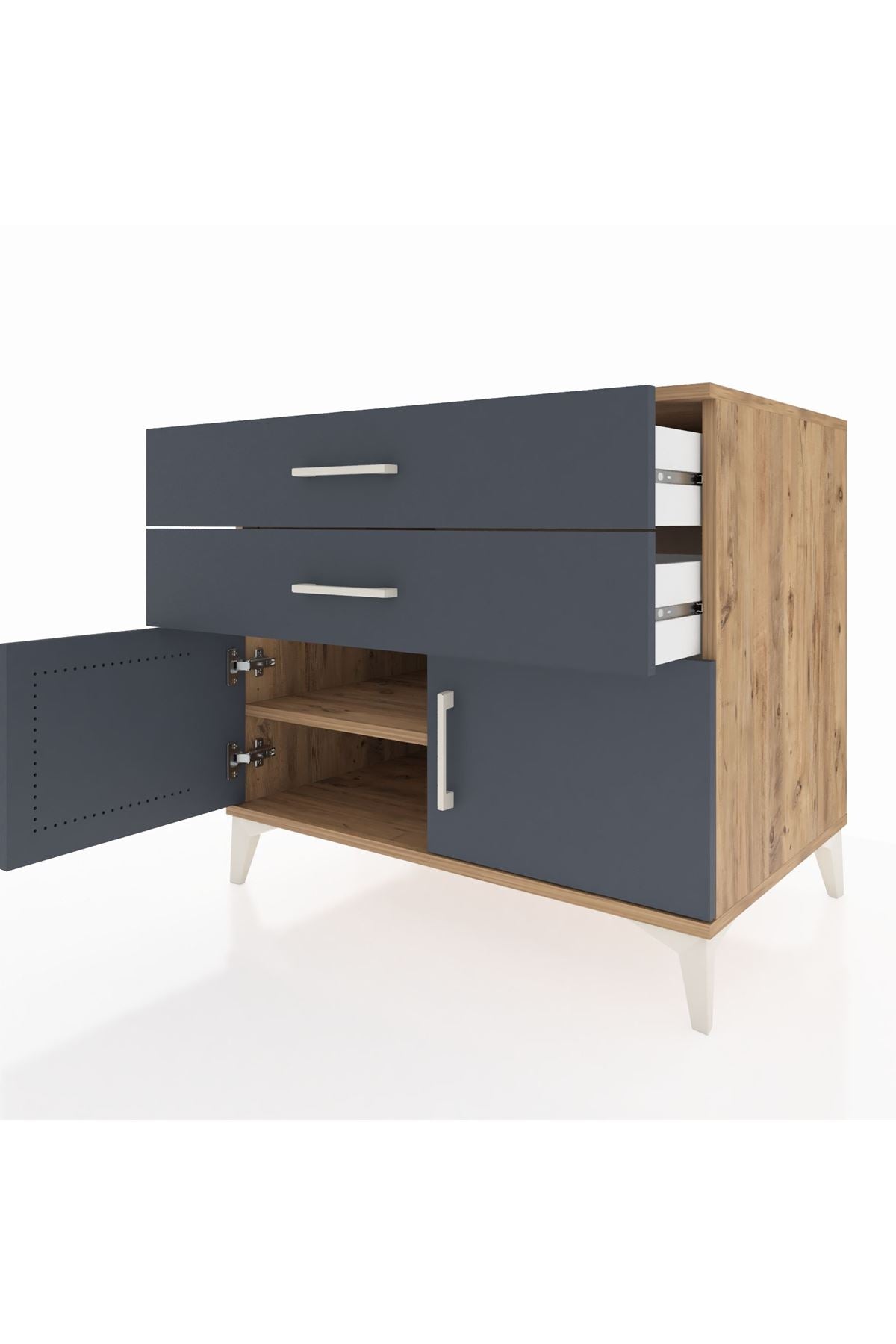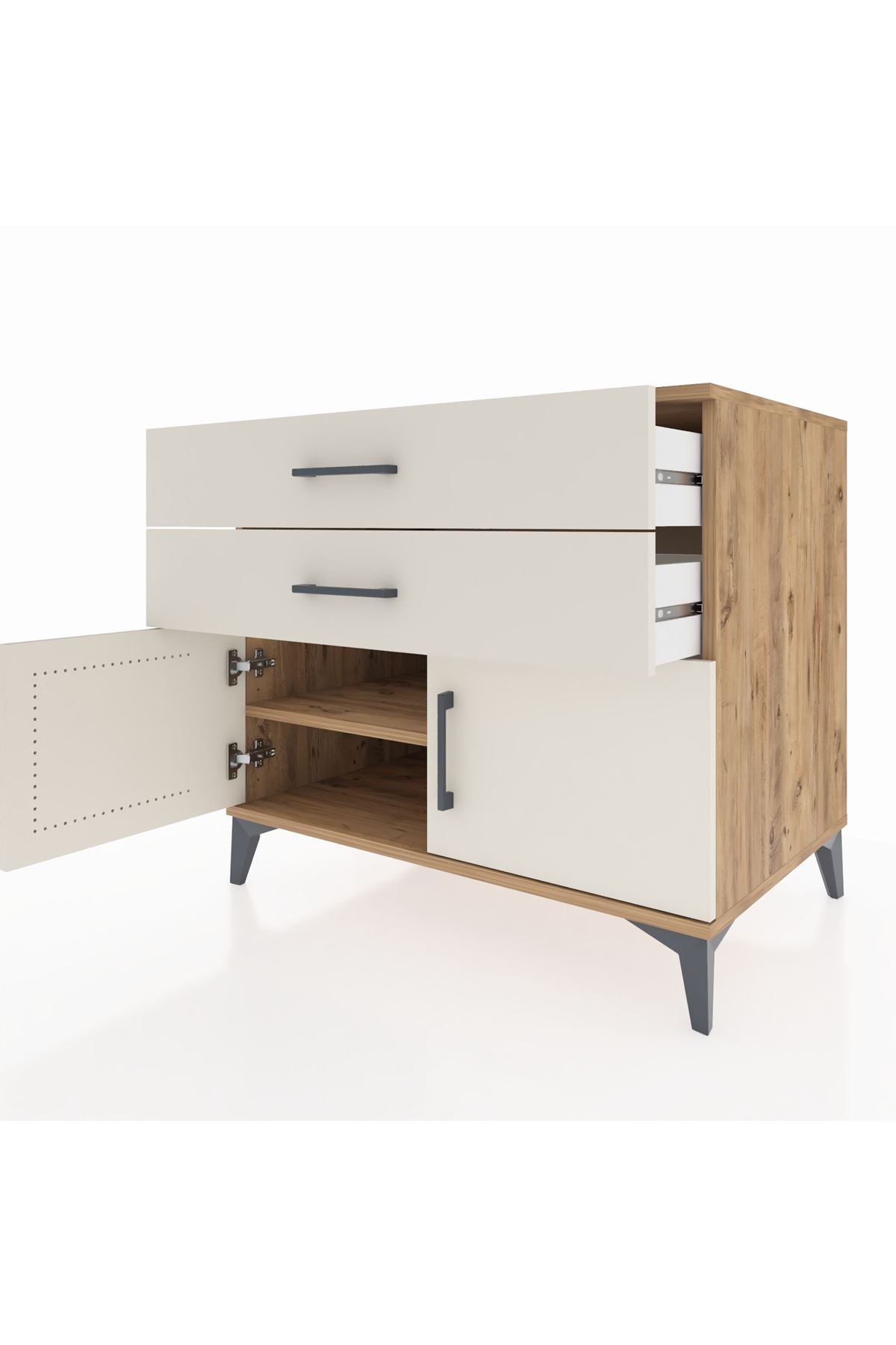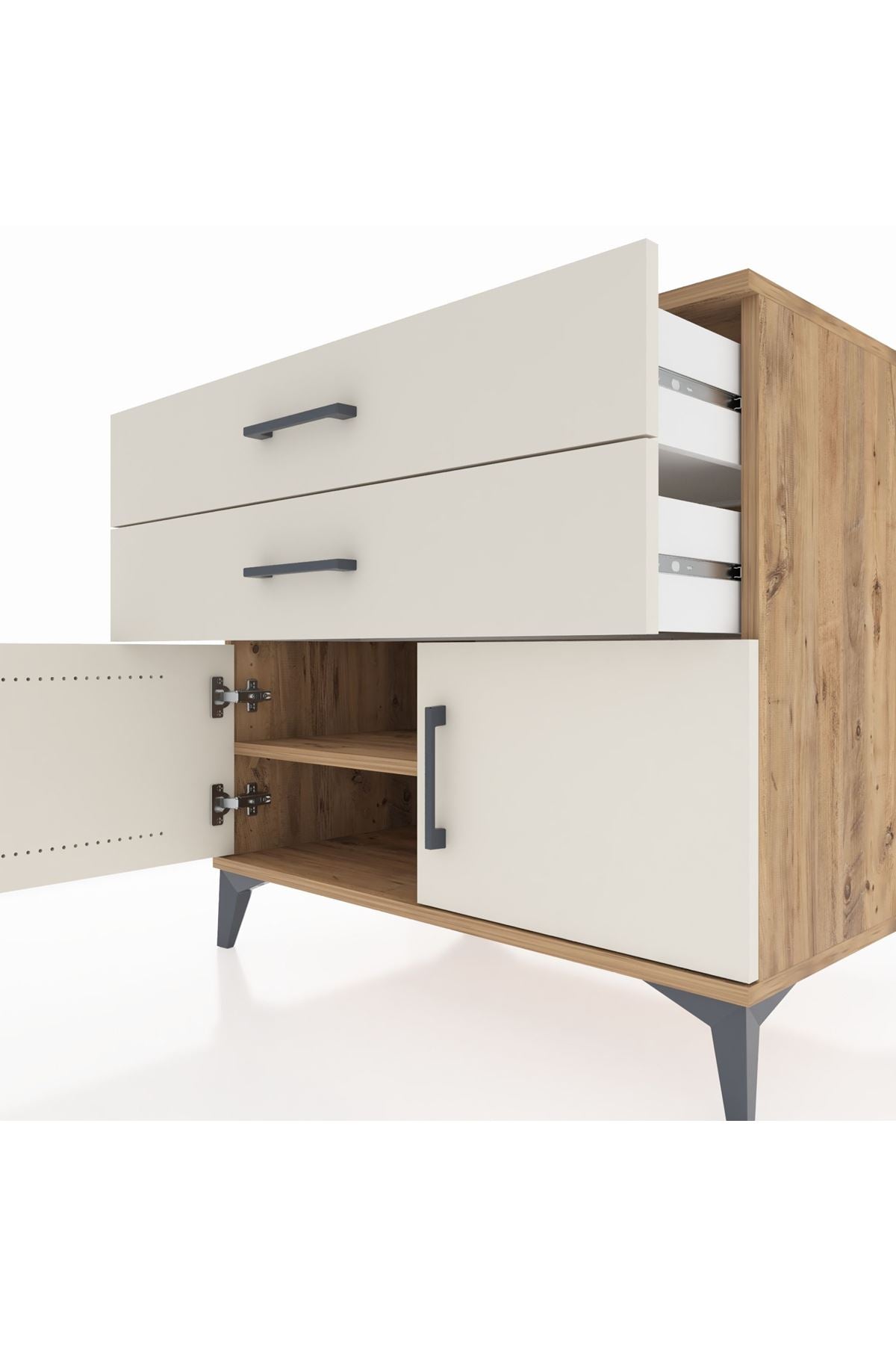 🦾 Şifonyerin modern görünümünü tamamlayan metal ayaklar, hem şık bir detay oluşturur hem de ürünün sağlamlığını artırır. Metal kulplar ise kullanım kolaylığı sağlarken tasarıma zarif bir dokunuş katar.