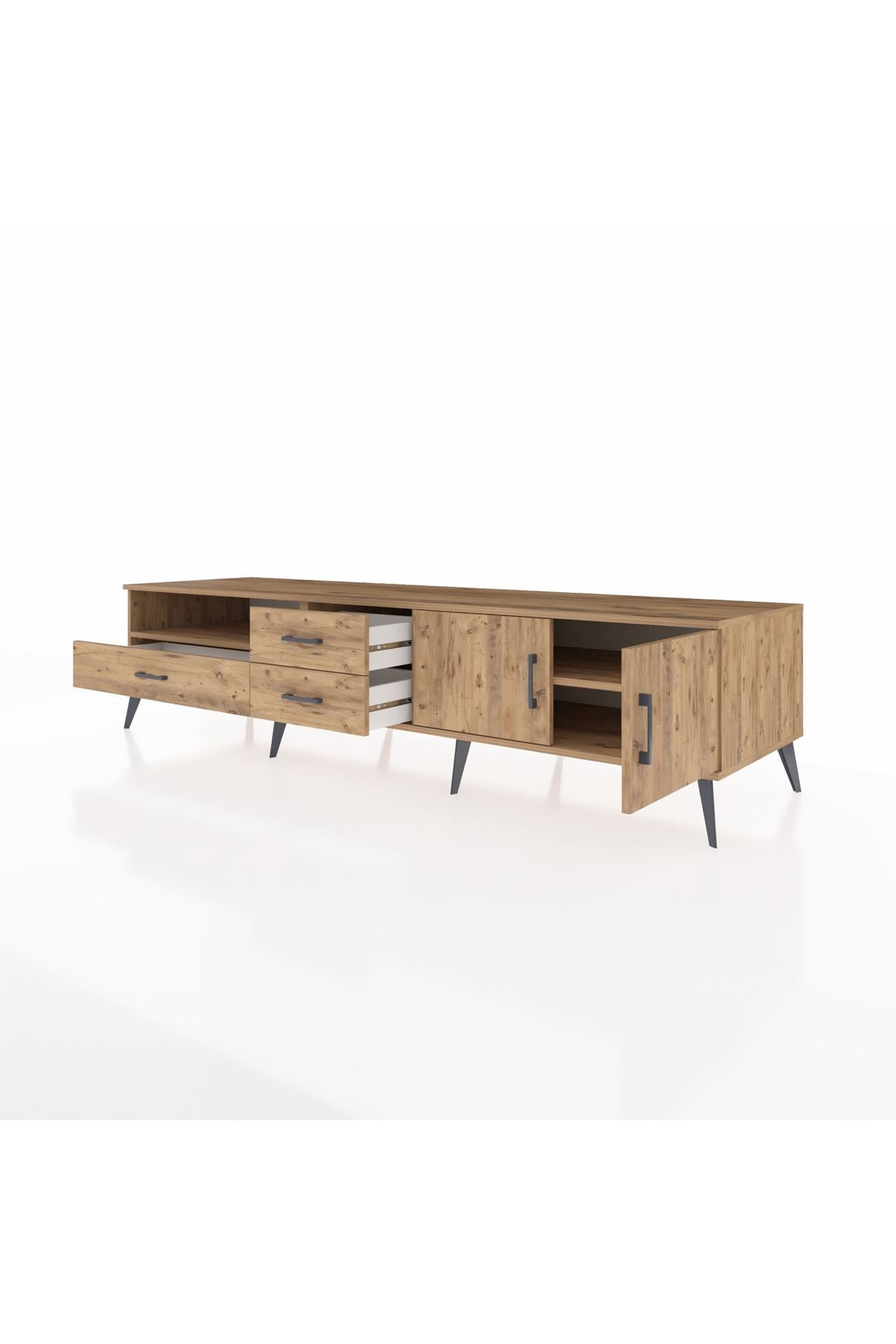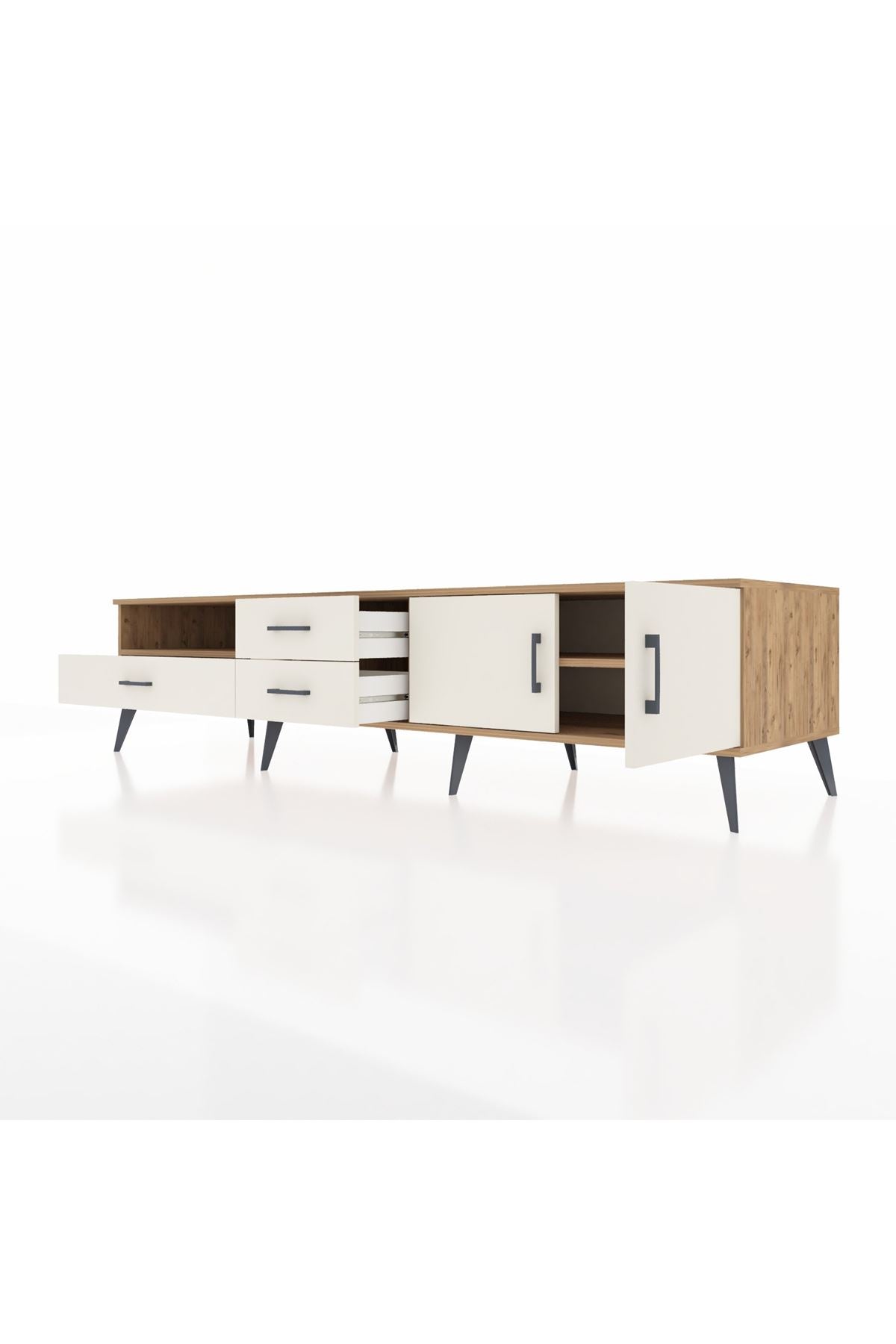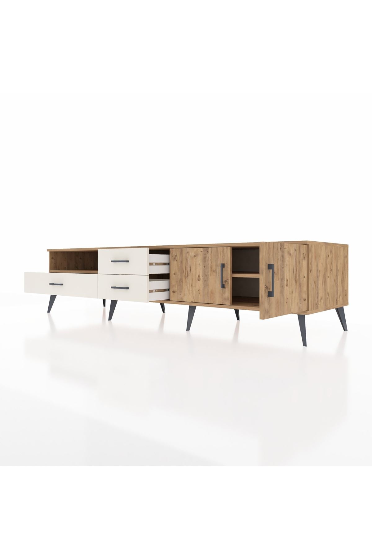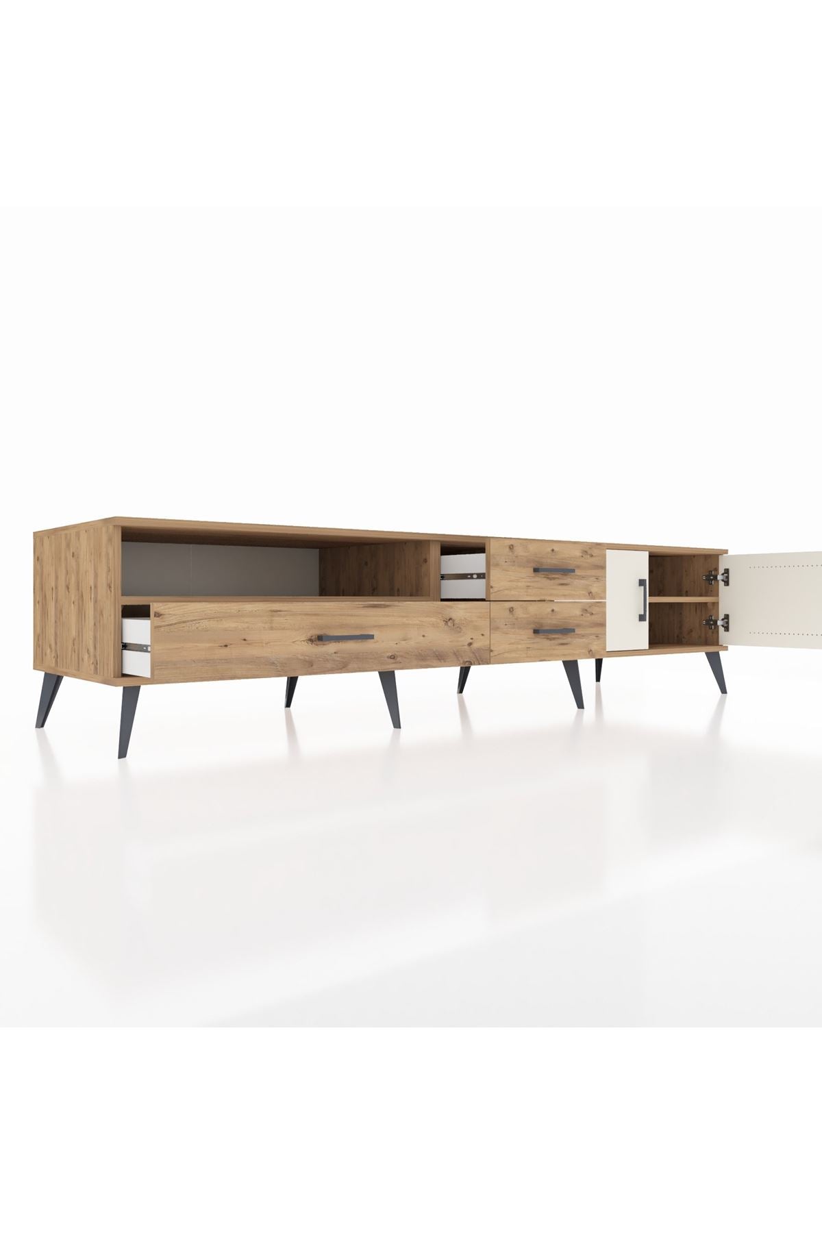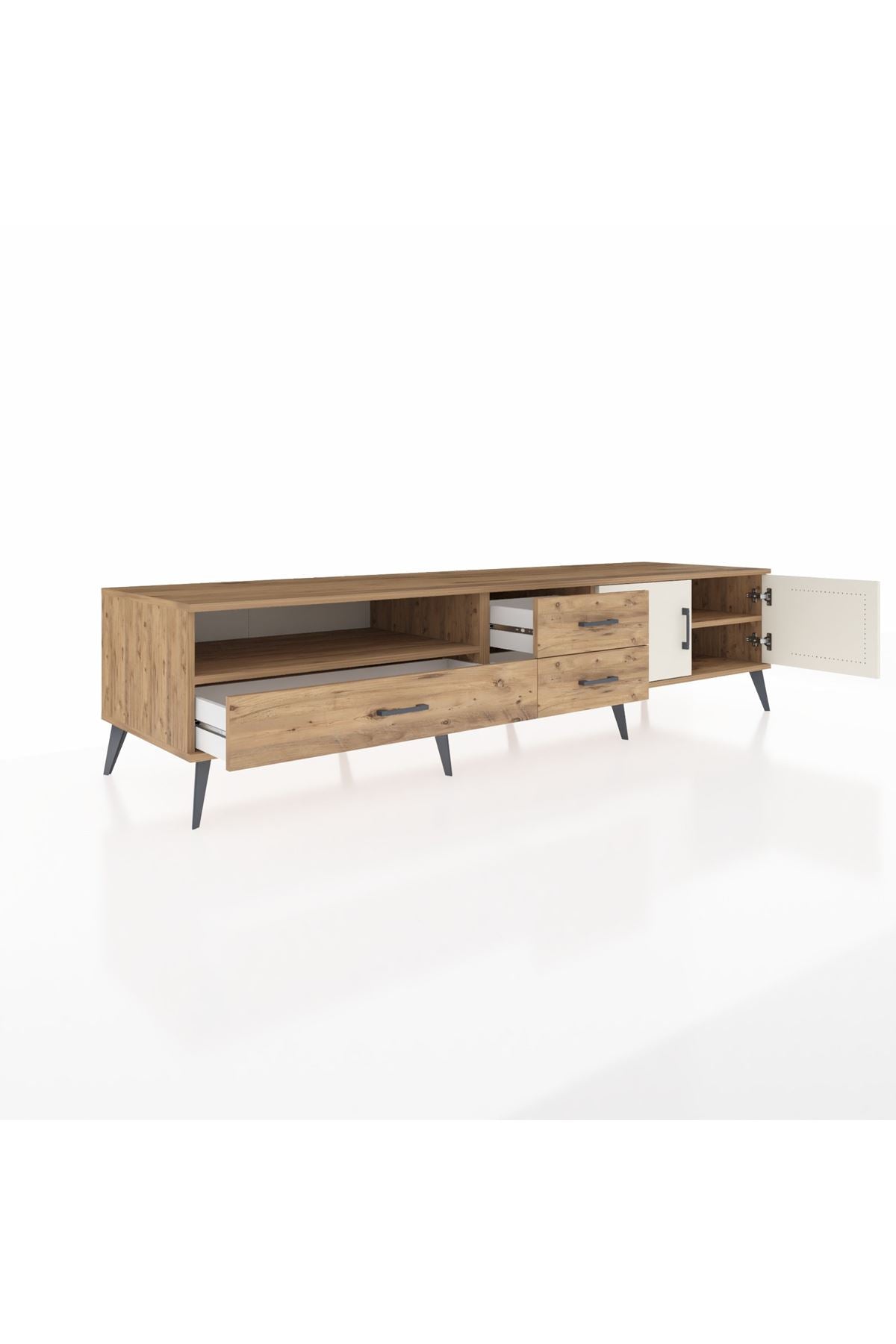 🦾 Metal ayaklar, TV ünitesine modern bir hava katarken, sağlam yapısıyla güvenli bir kullanım sunar. Metal kulplar ise çekmecelerin ve kapakların kolayca açılıp kapanmasını sağlar.