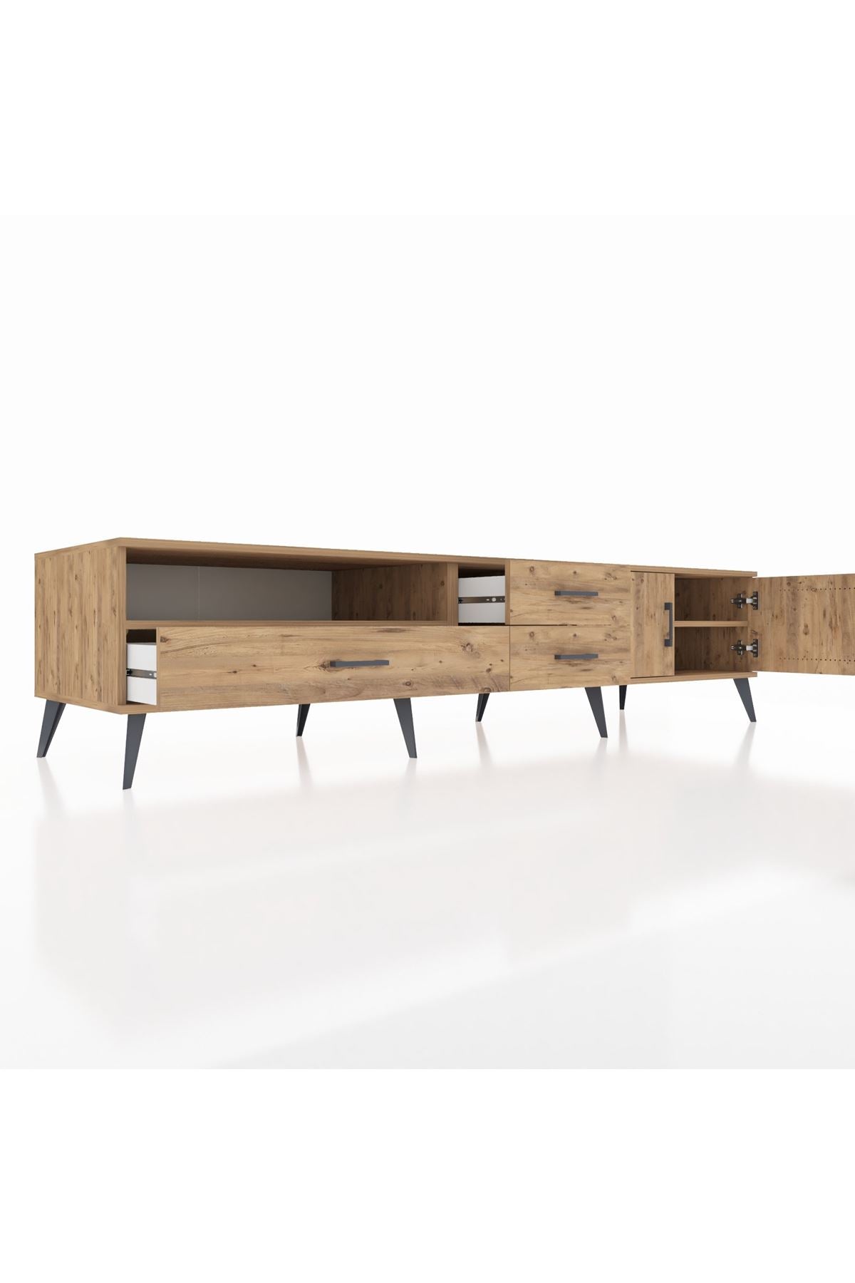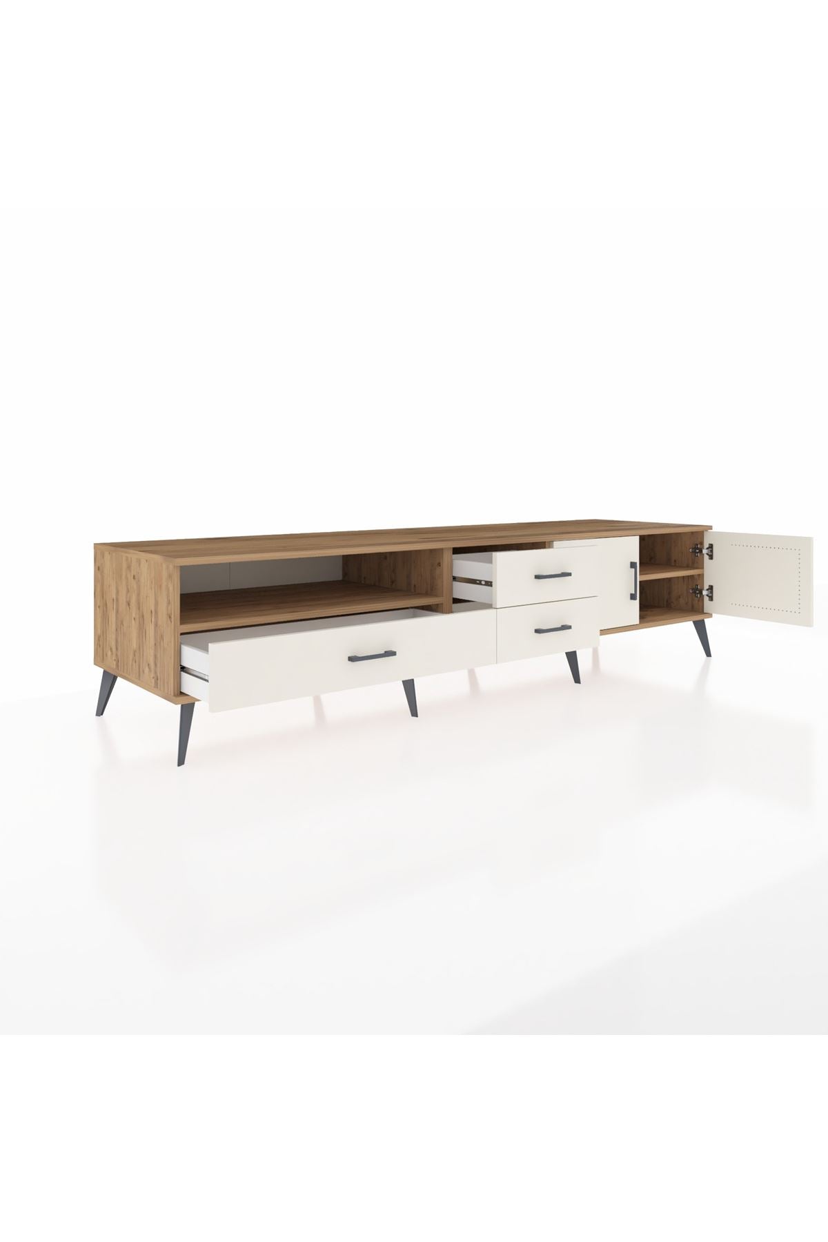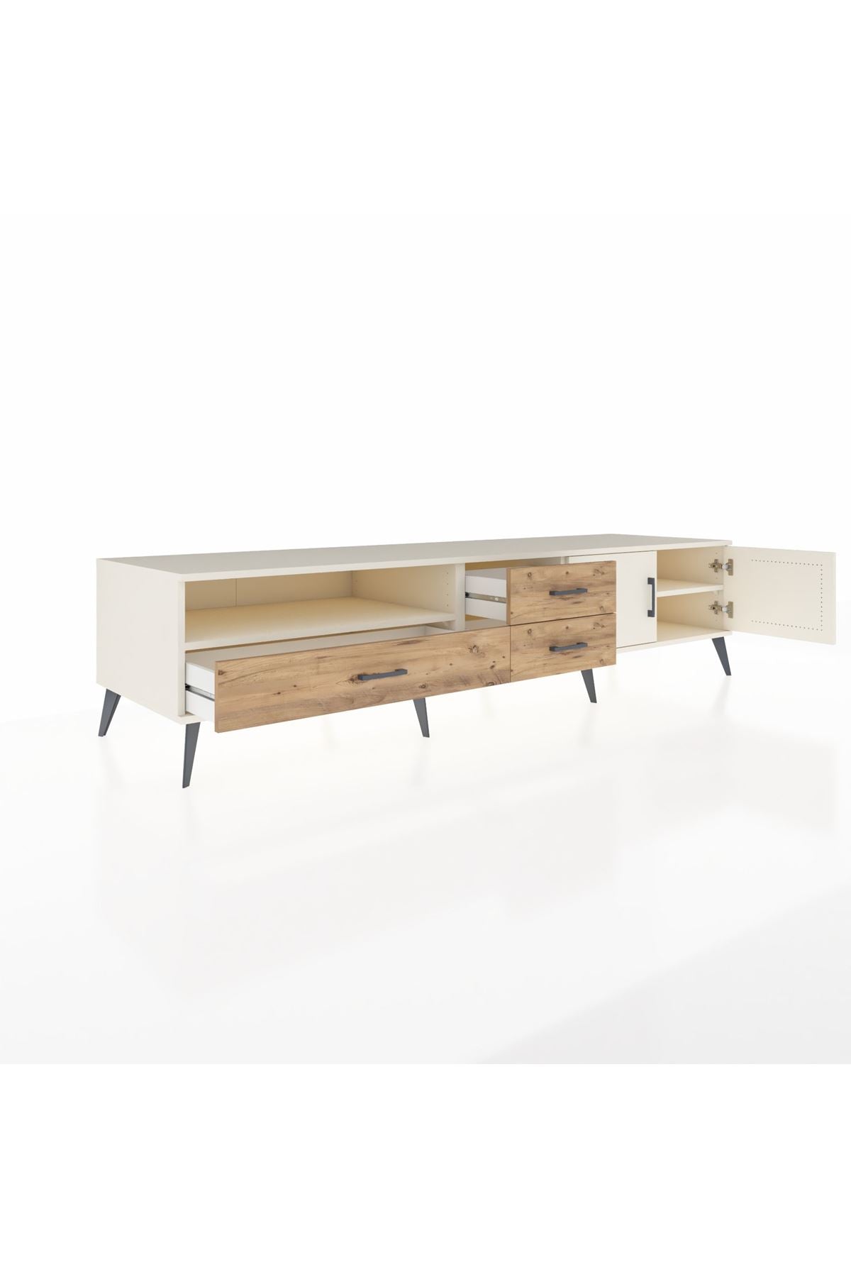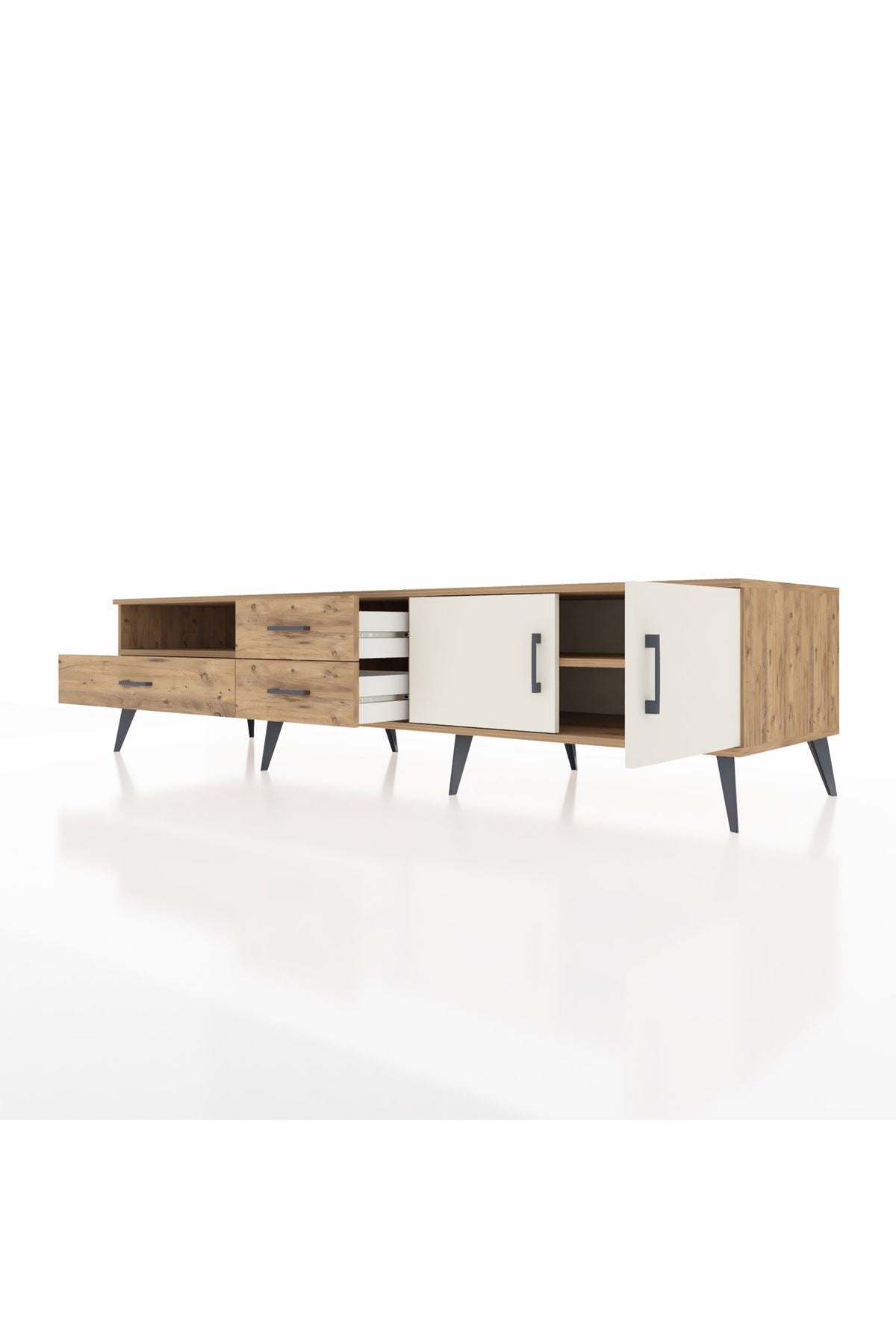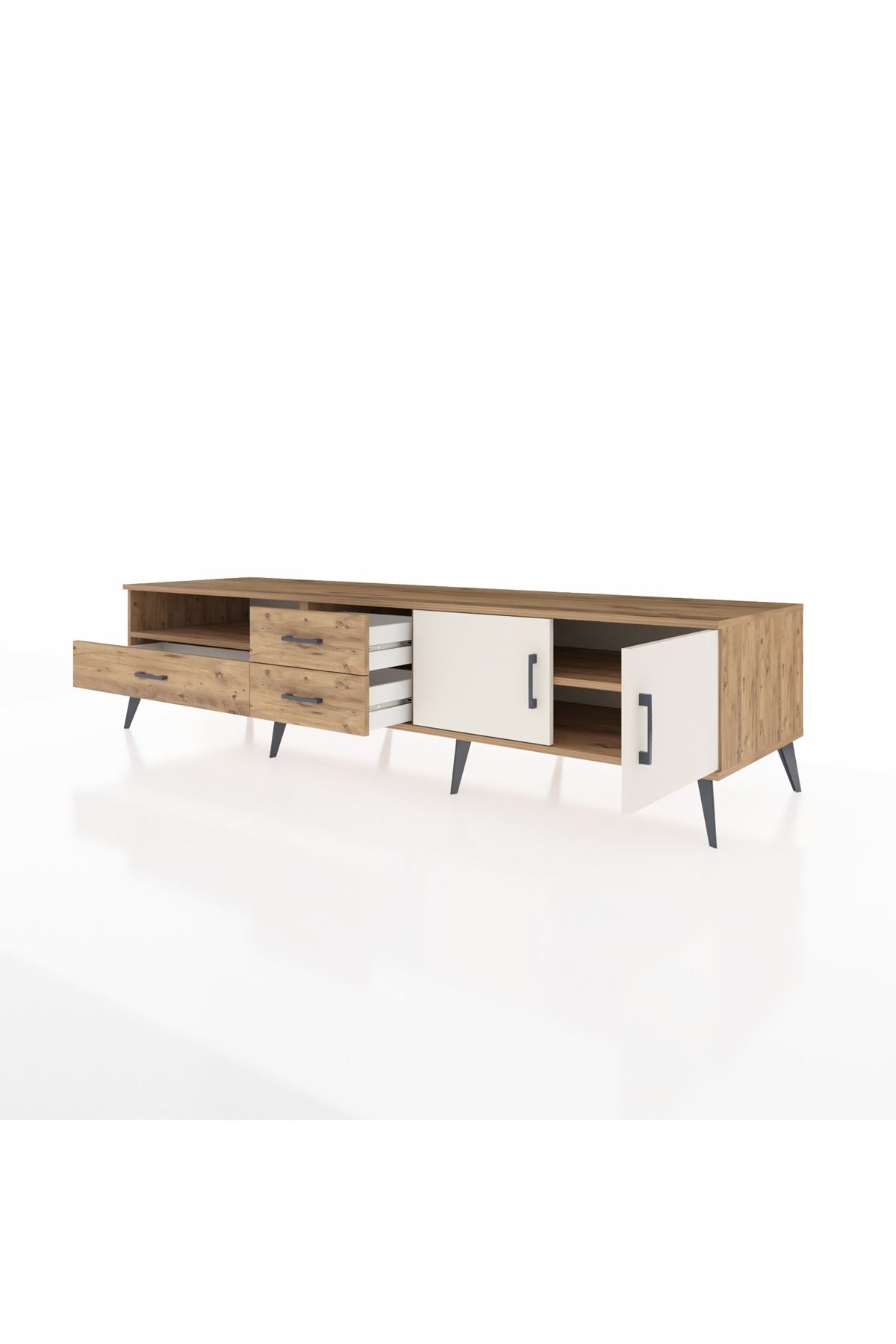 🦾 Metal ayaklar, TV ünitesine modern bir hava katarken, sağlam yapısıyla güvenli bir kullanım sunar. Metal kulplar ise çekmecelerin ve kapakların kolayca açılıp kapanmasını sağlar.