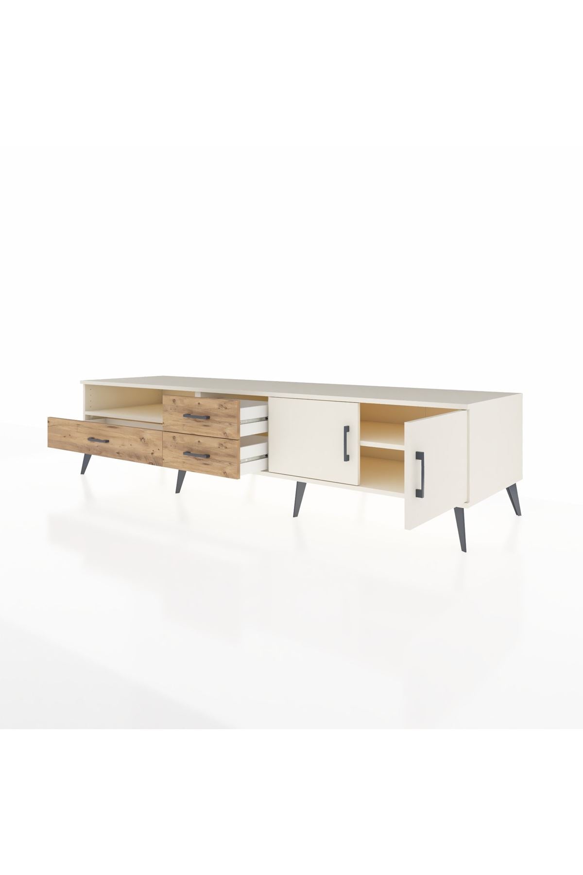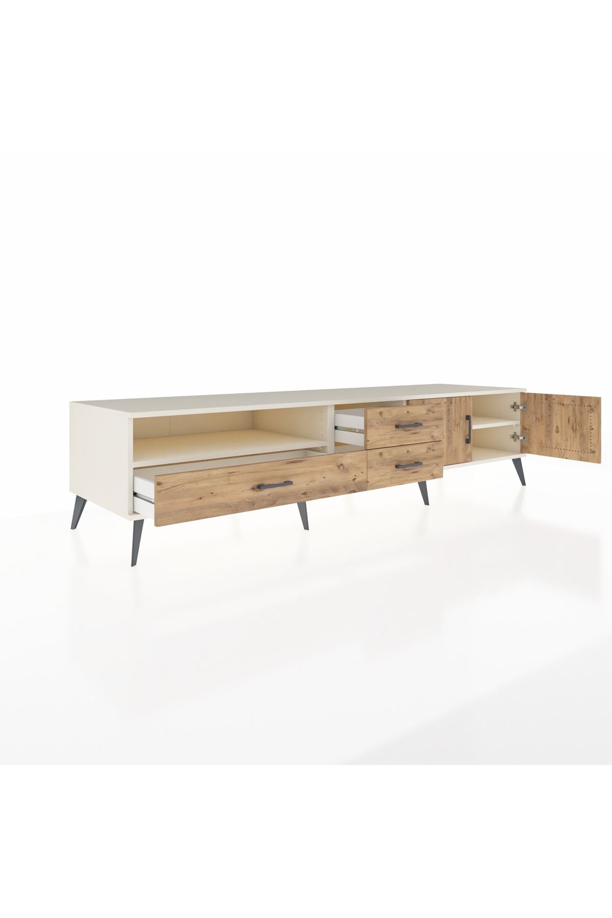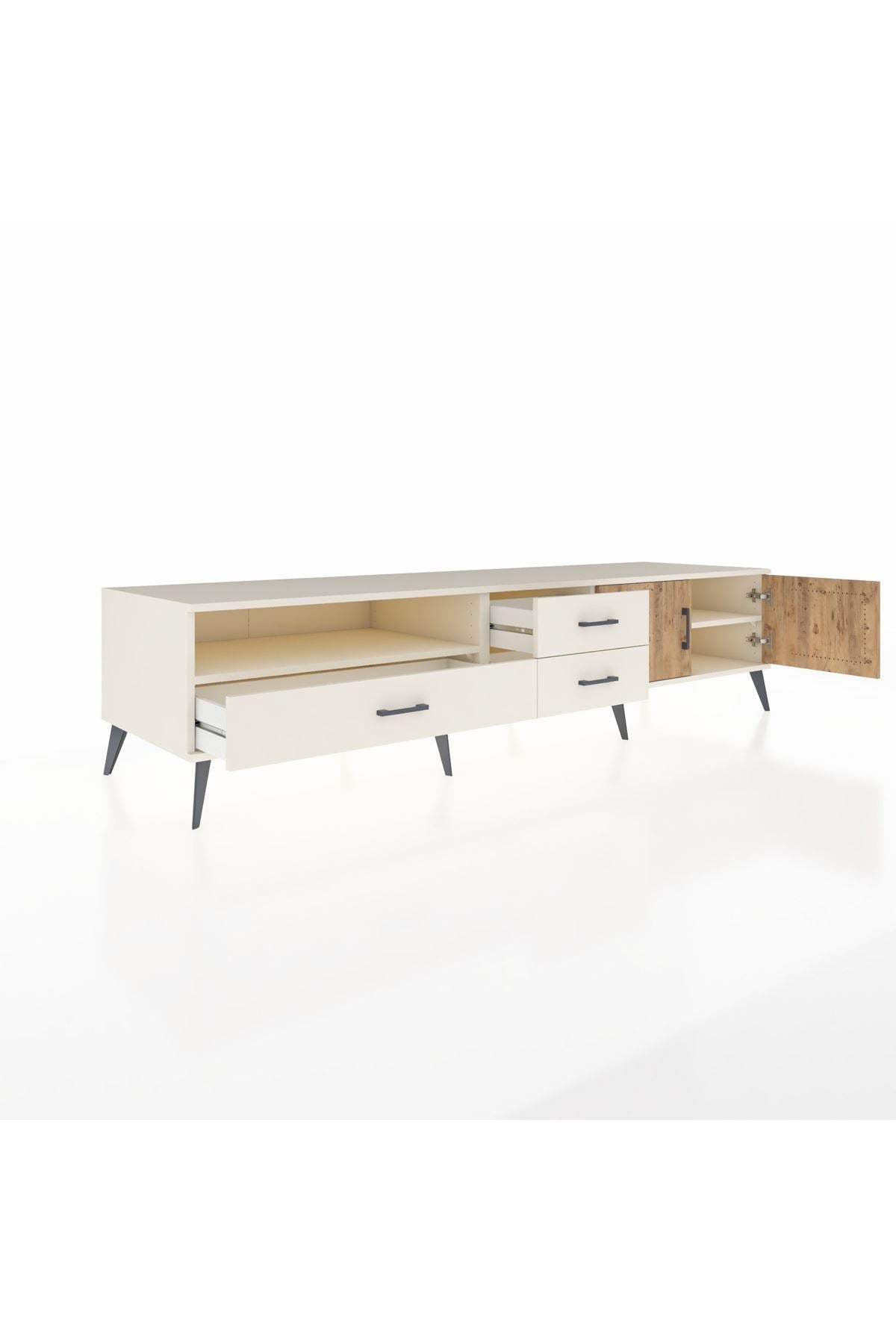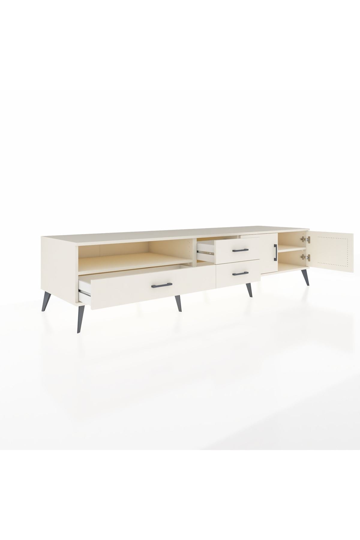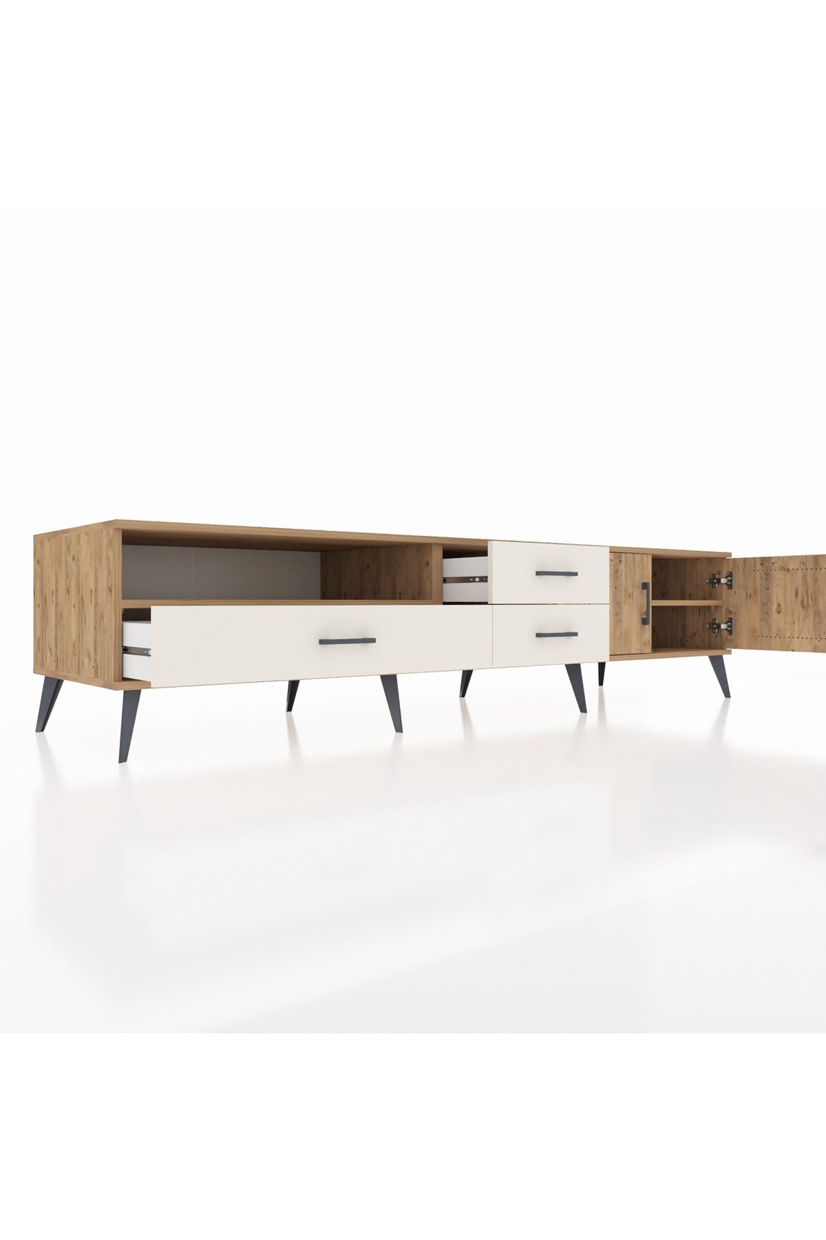 🦾 Metal ayaklar, TV ünitesine modern bir hava katarken, sağlam yapısıyla güvenli bir kullanım sunar. Metal kulplar ise çekmecelerin ve kapakların kolayca açılıp kapanmasını sağlar.