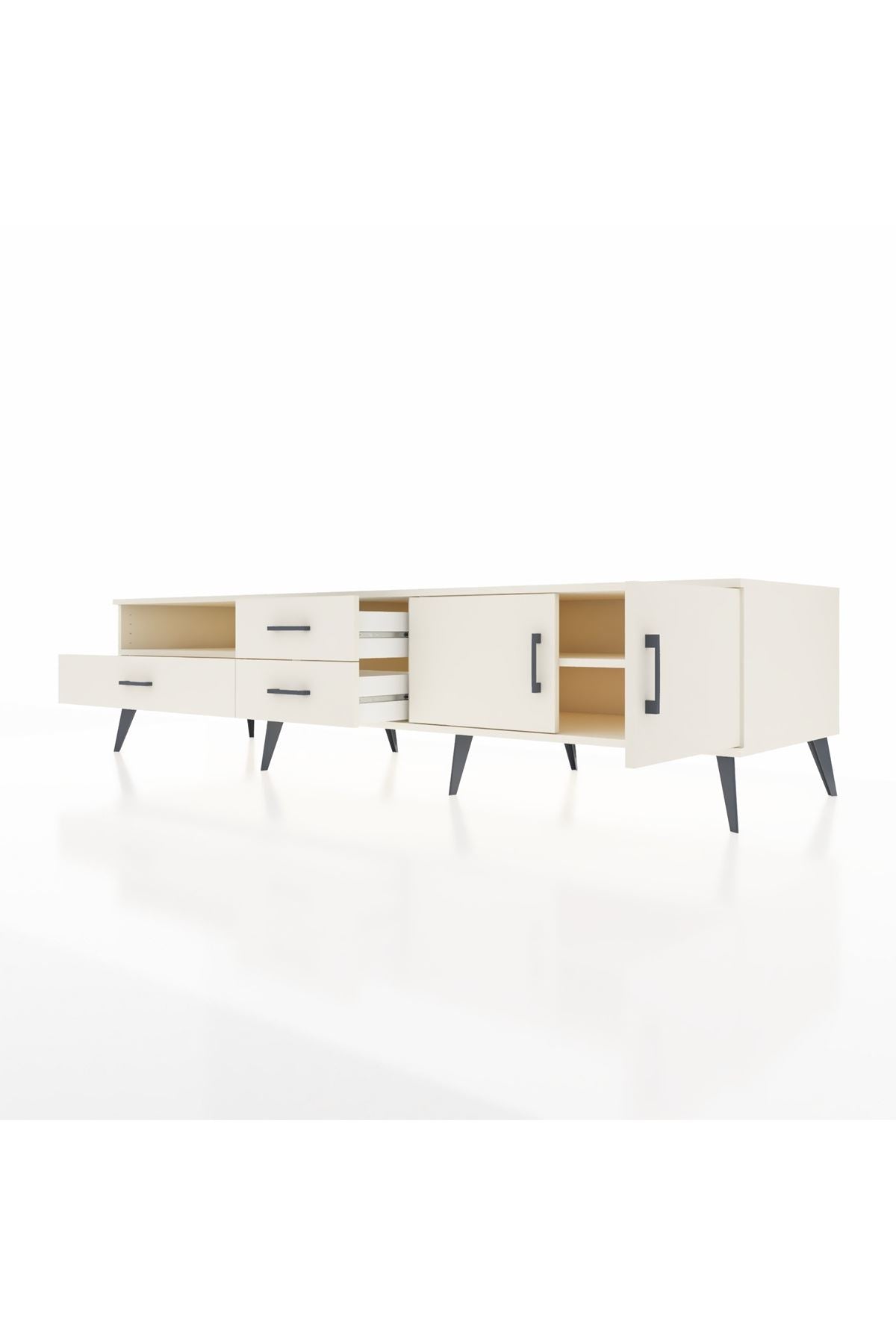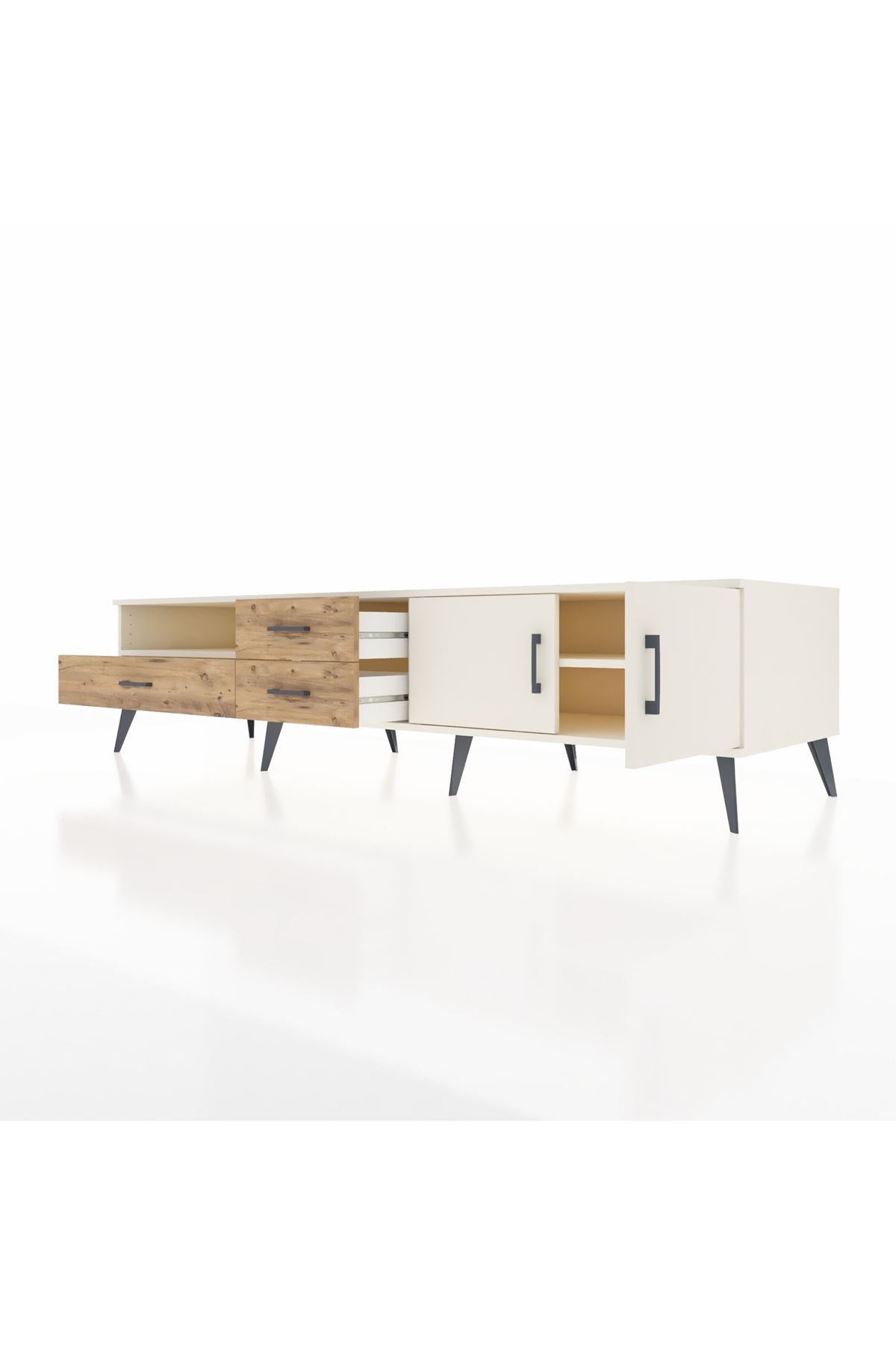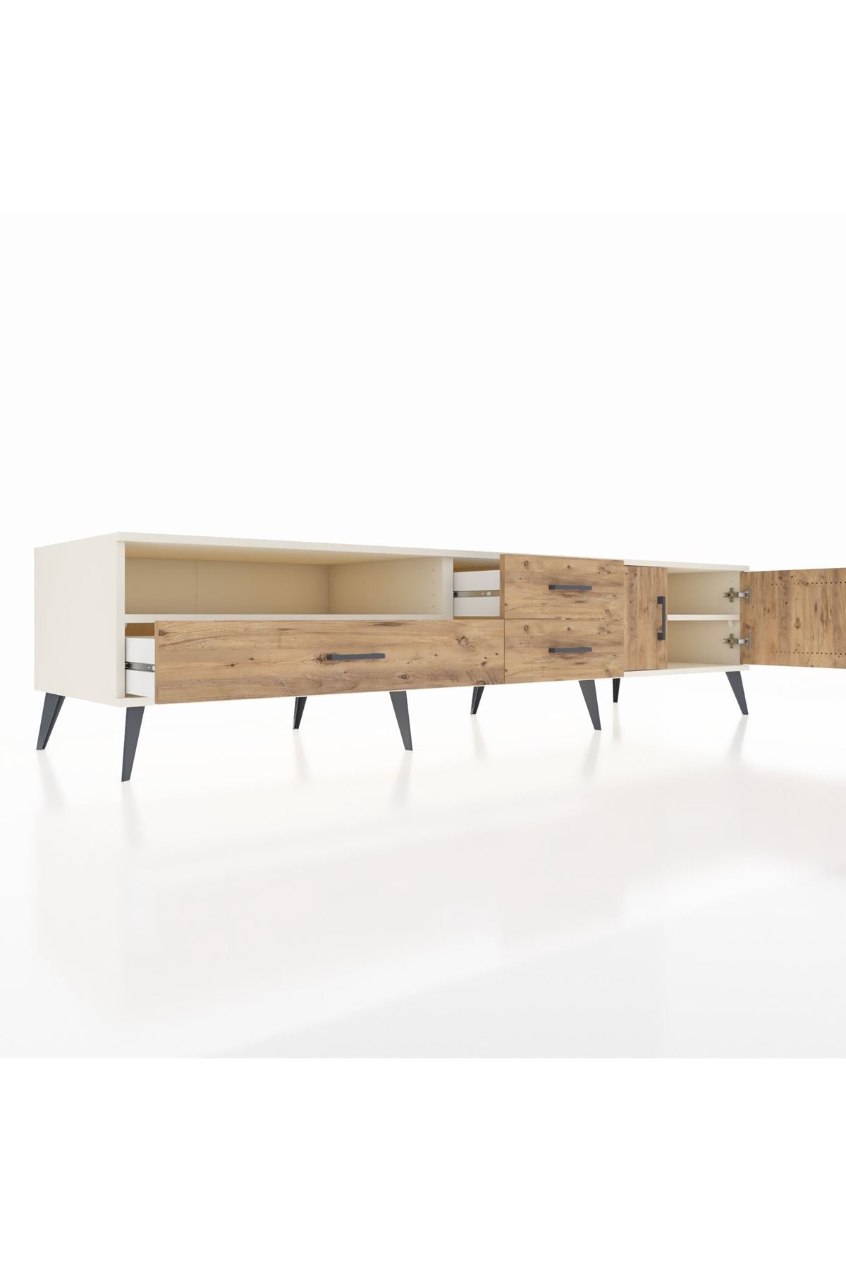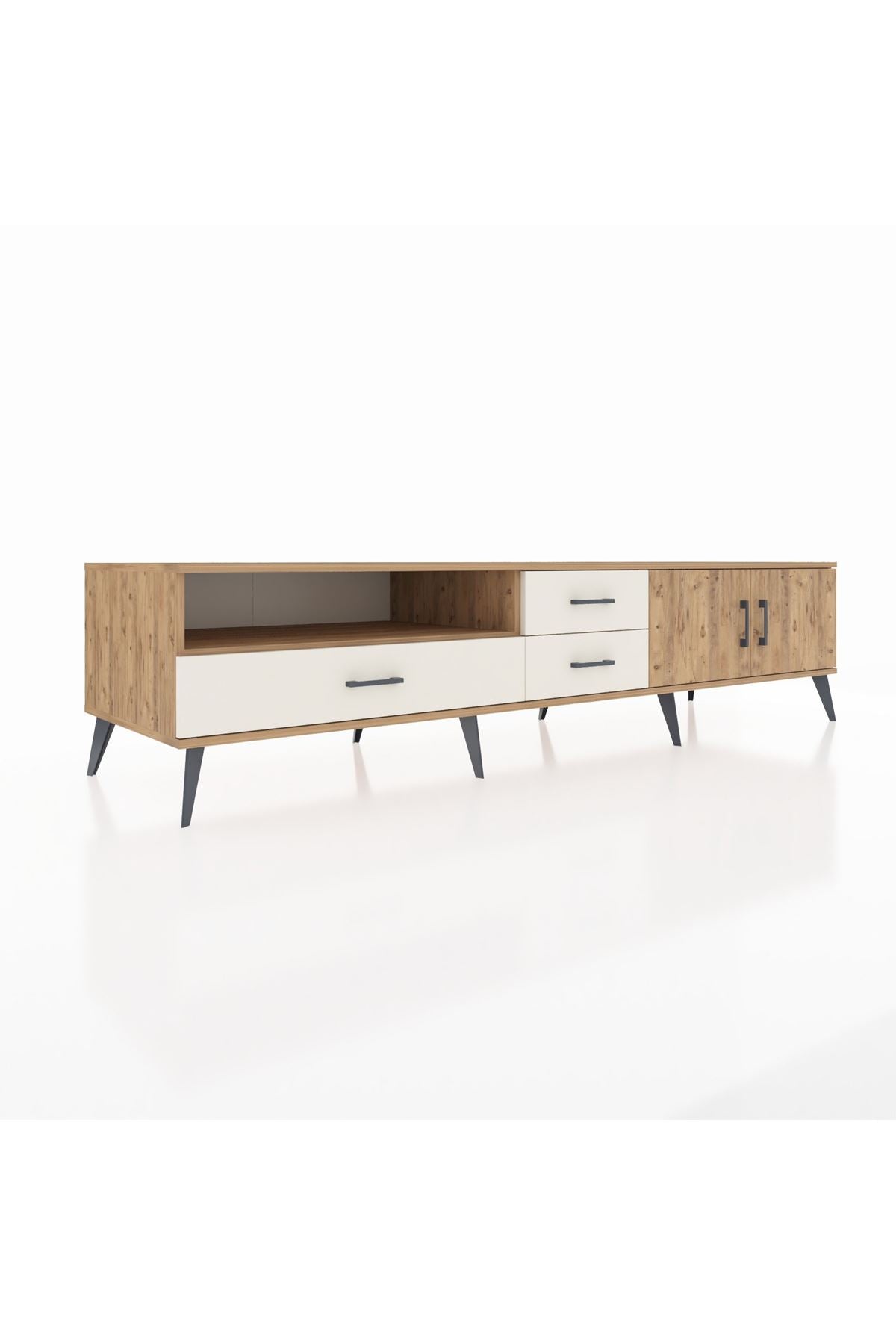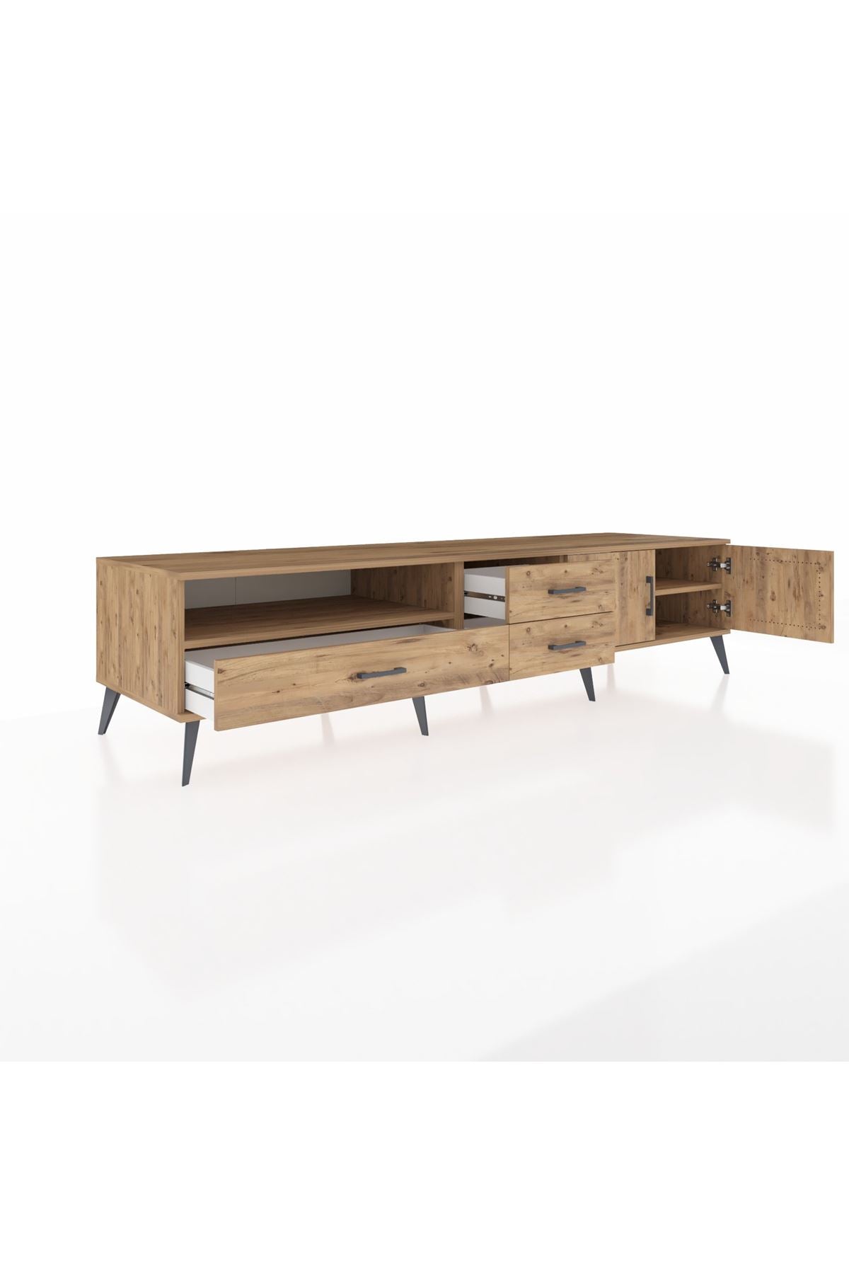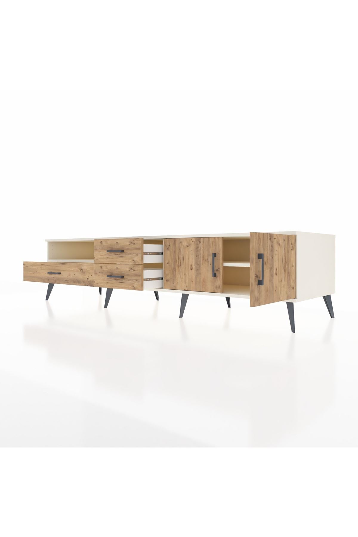 🦾 Metal ayaklar, TV ünitesine modern bir hava katarken, sağlam yapısıyla güvenli bir kullanım sunar. Metal kulplar ise çekmecelerin ve kapakların kolayca açılıp kapanmasını sağlar.