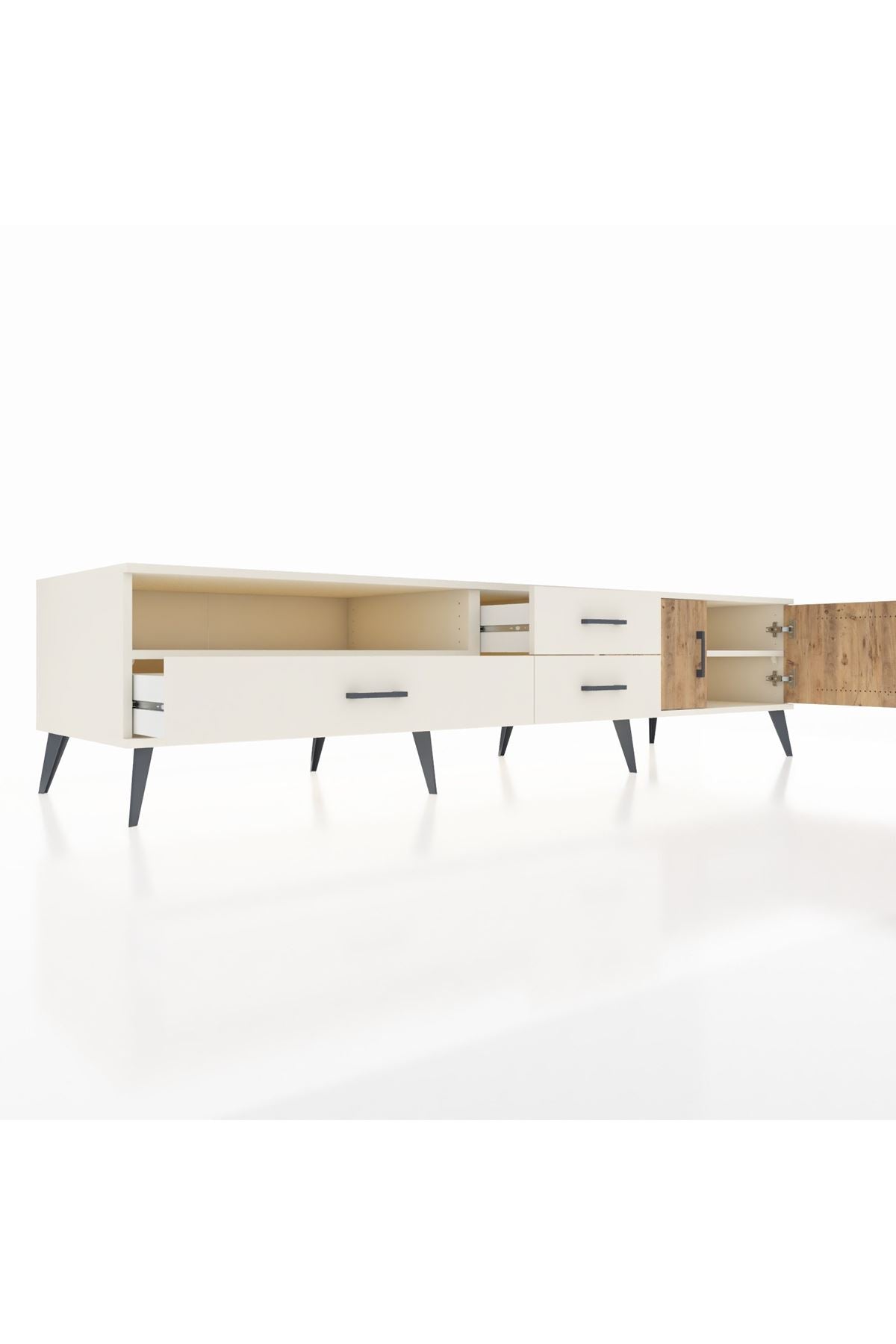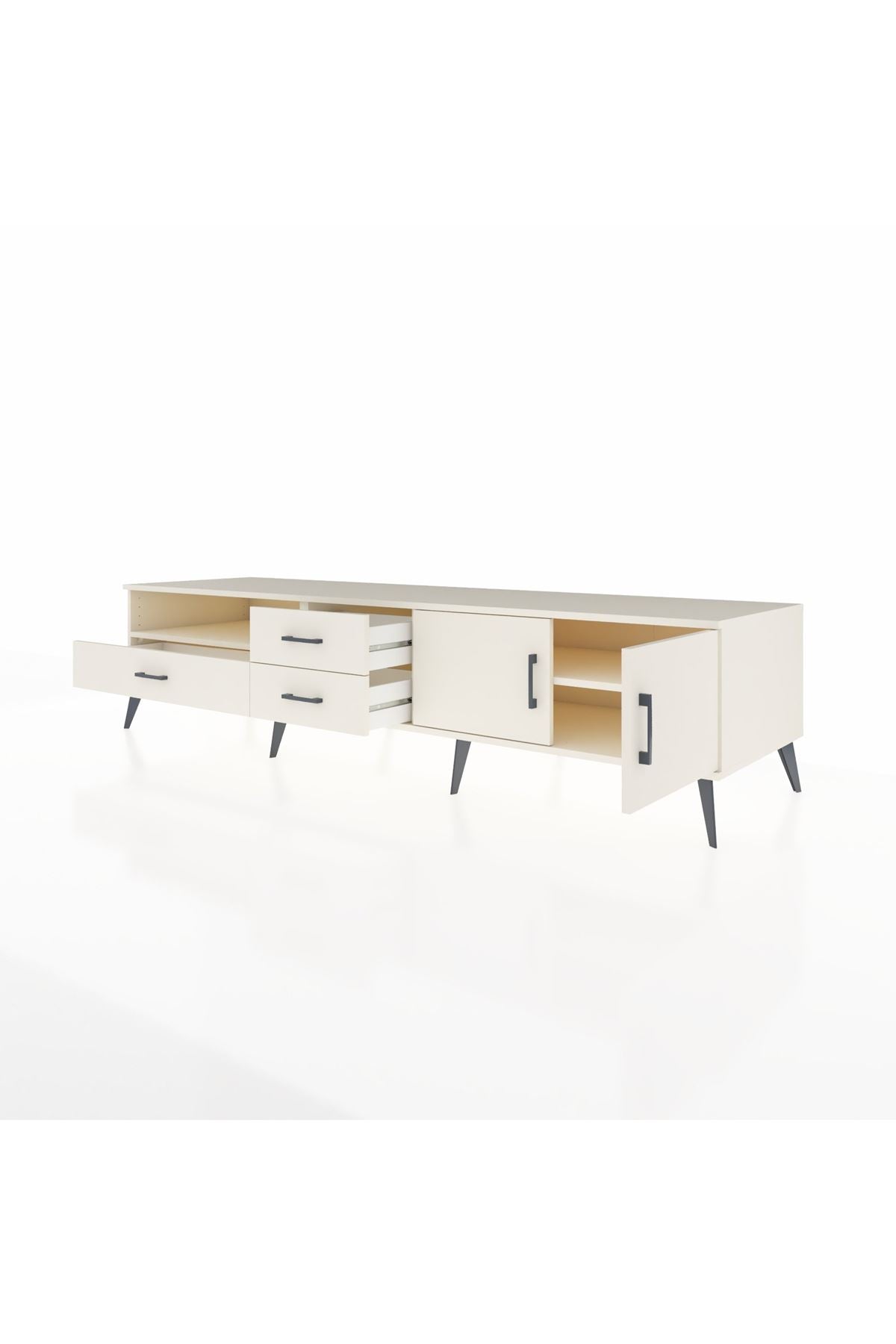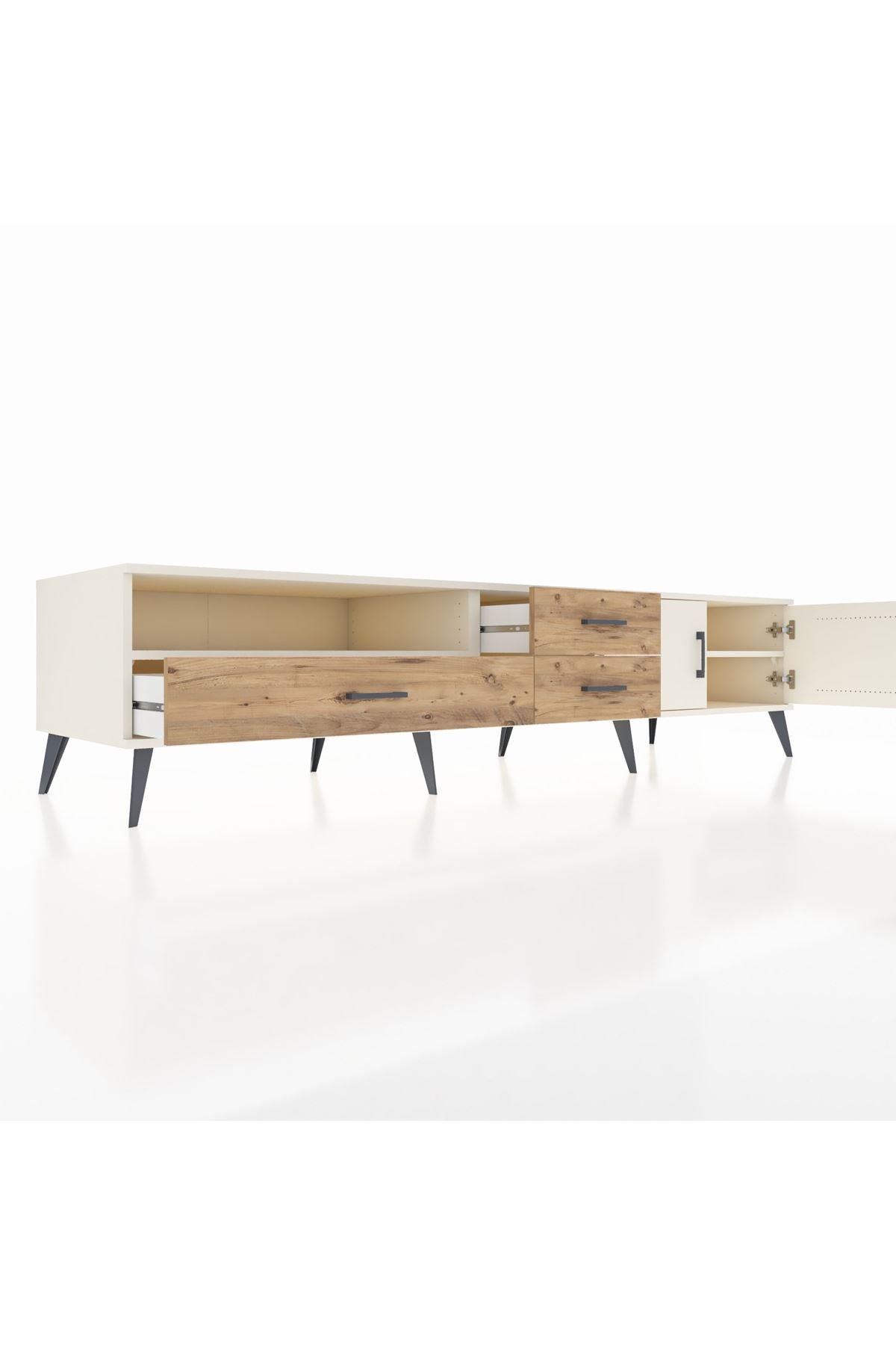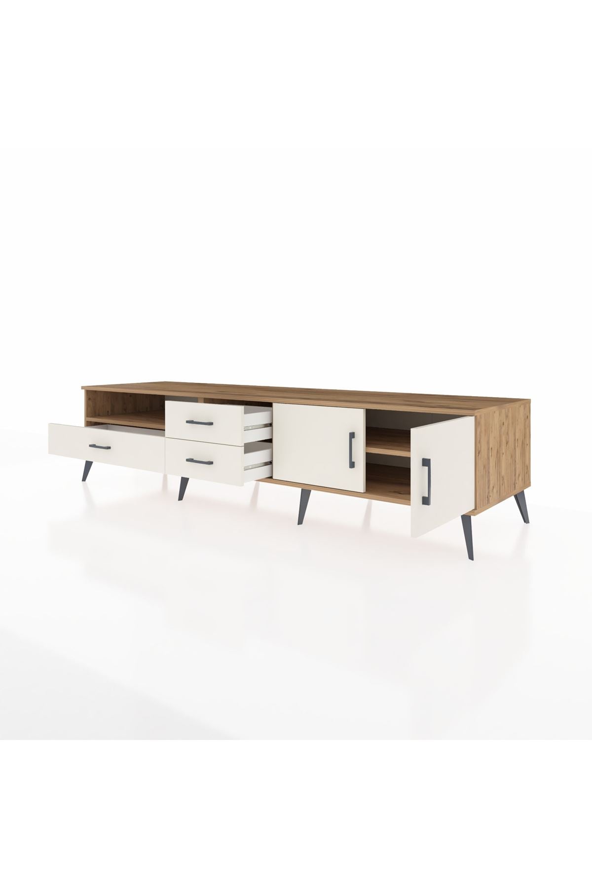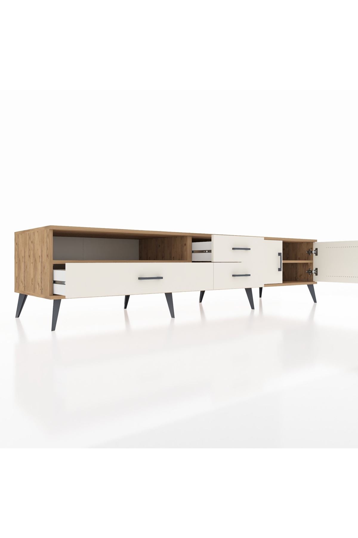 🦾 Metal ayaklar, TV ünitesine modern bir hava katarken, sağlam yapısıyla güvenli bir kullanım sunar. Metal kulplar ise çekmecelerin ve kapakların kolayca açılıp kapanmasını sağlar.