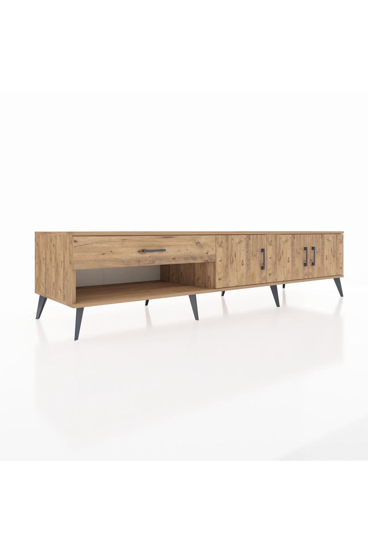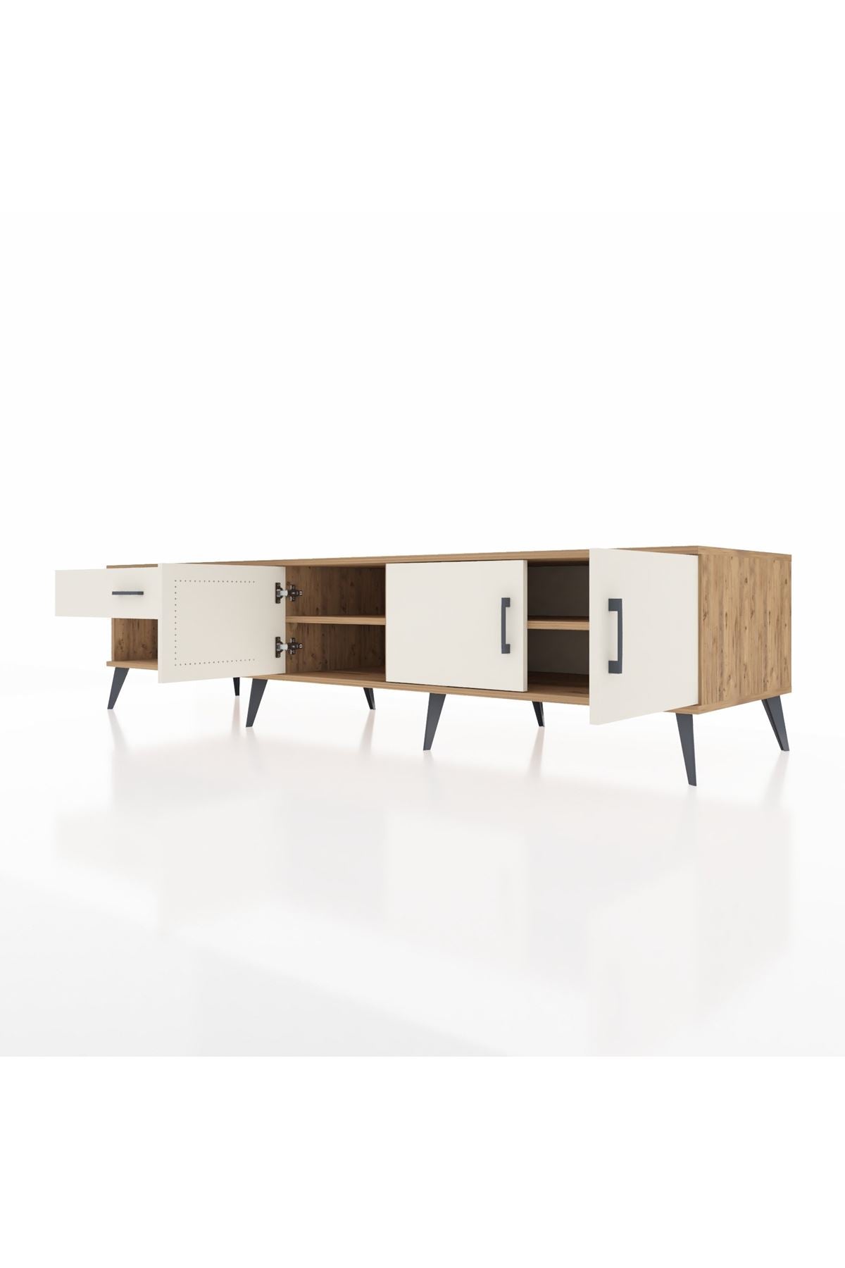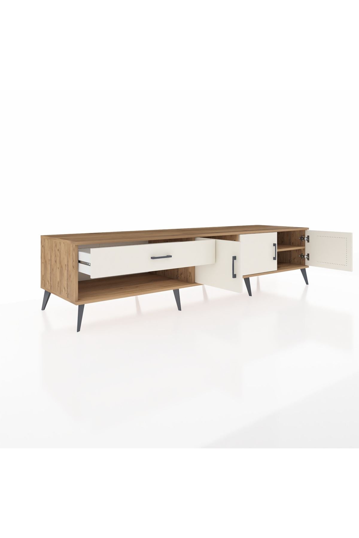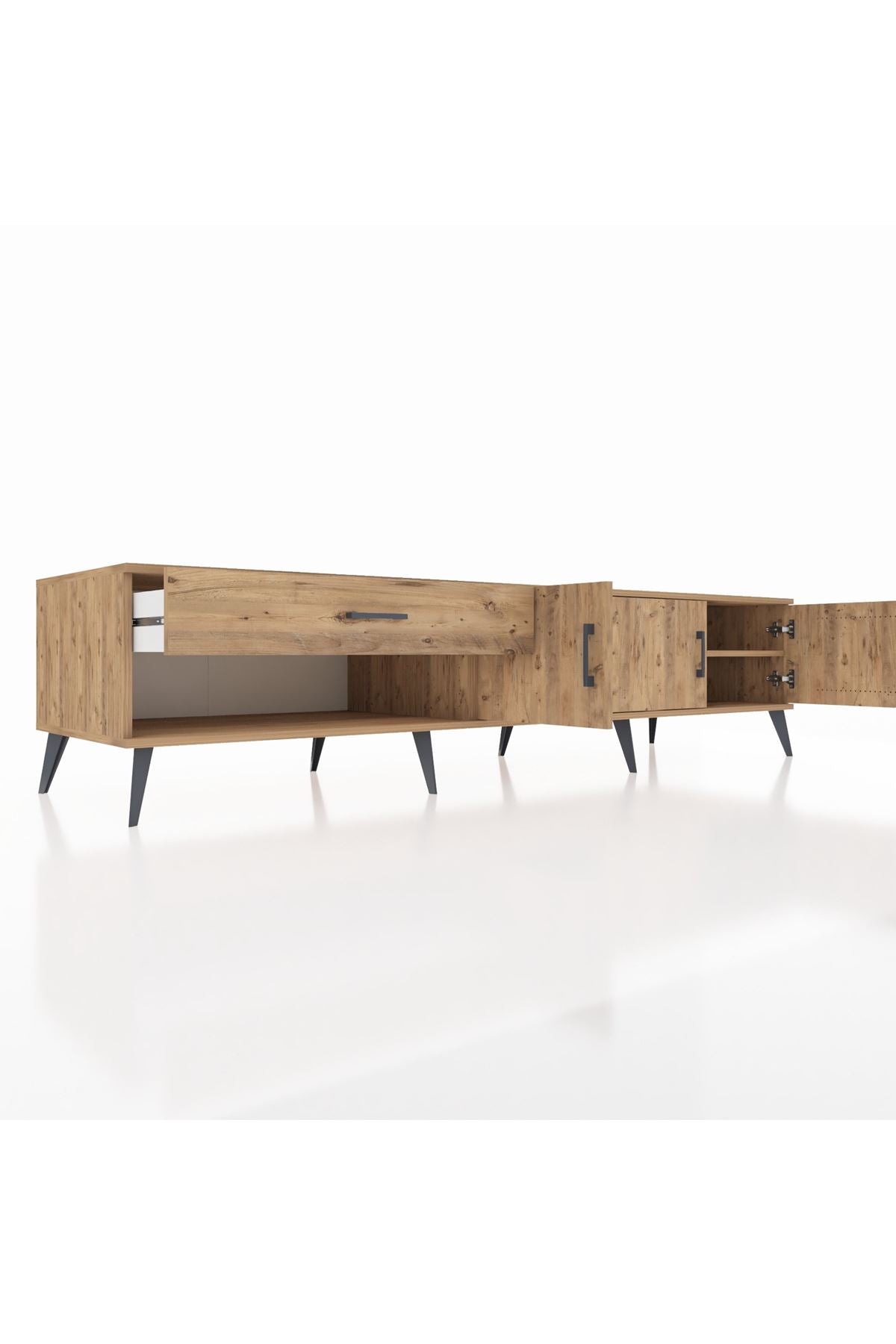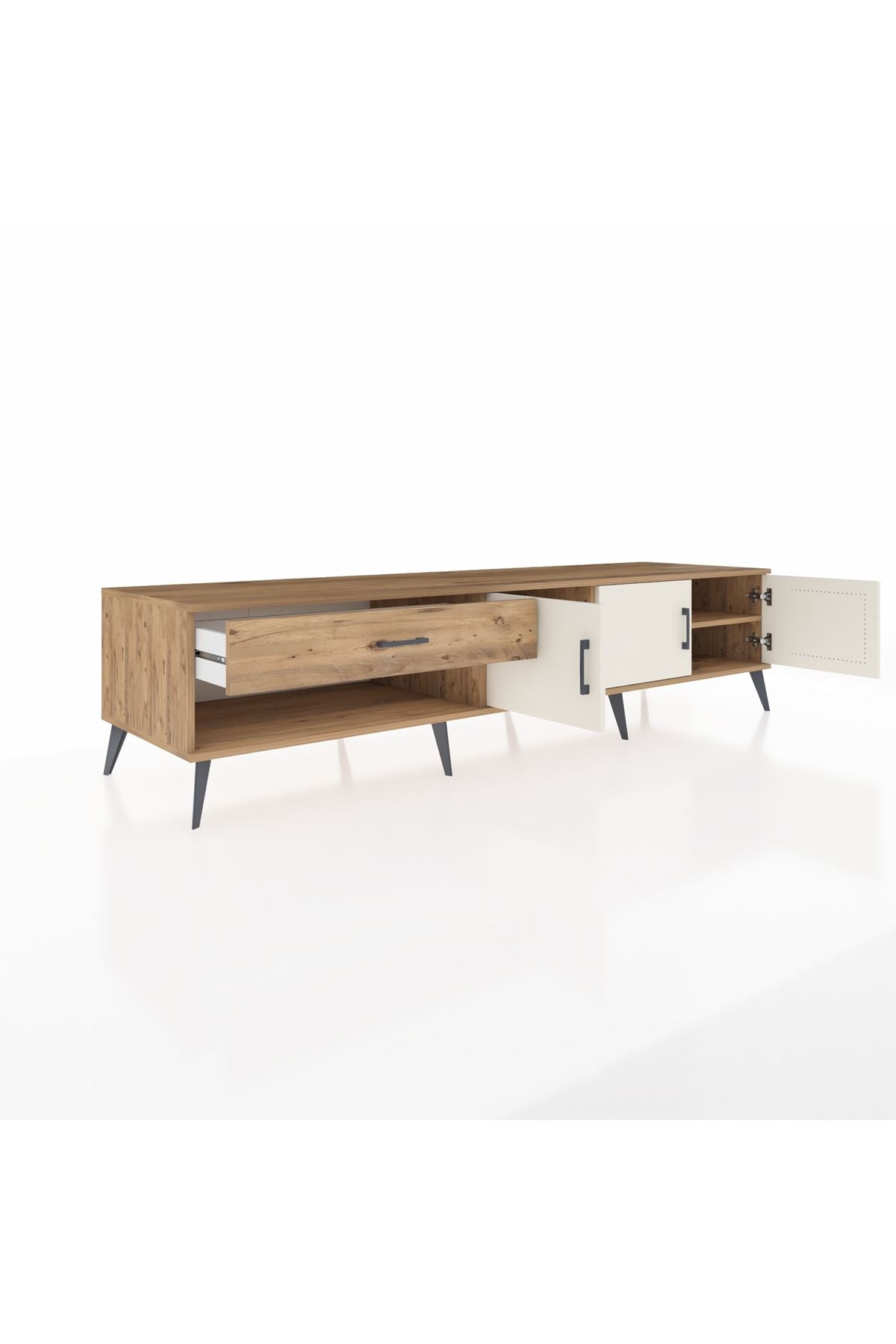🦾 Metal ayaklar, TV ünitesine modern bir görünüm kazandırırken aynı zamanda yerden yüksekliği sayesinde temizlik kolaylığı sağlar. Metal kulplar ise şık detayları tamamlayarak ürünün genel estetiğine katkıda bulunur.