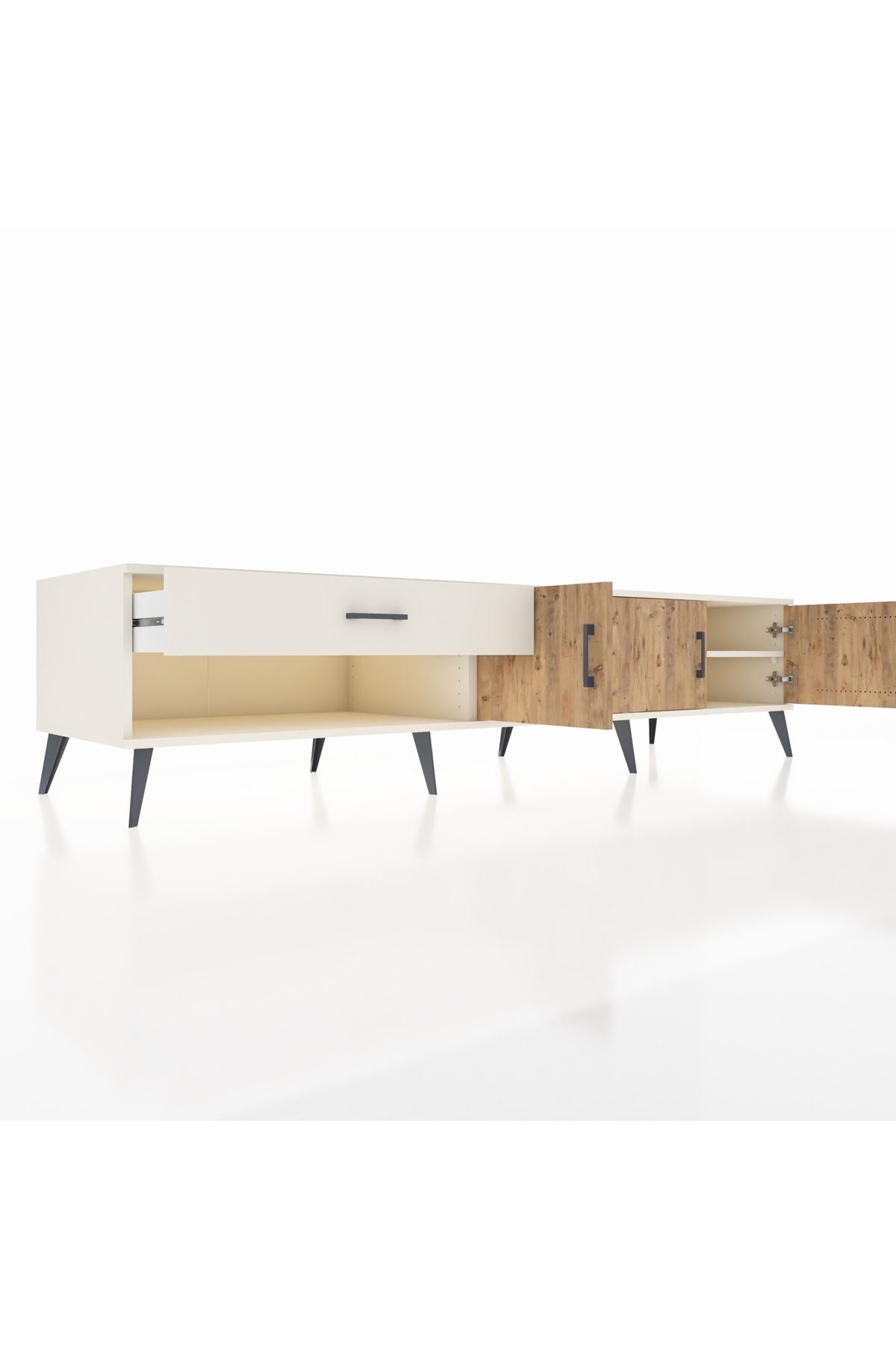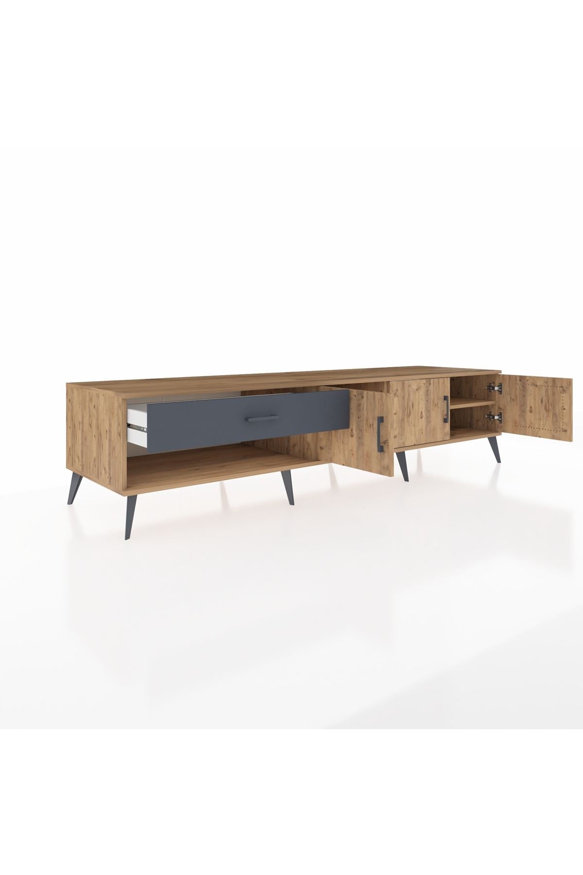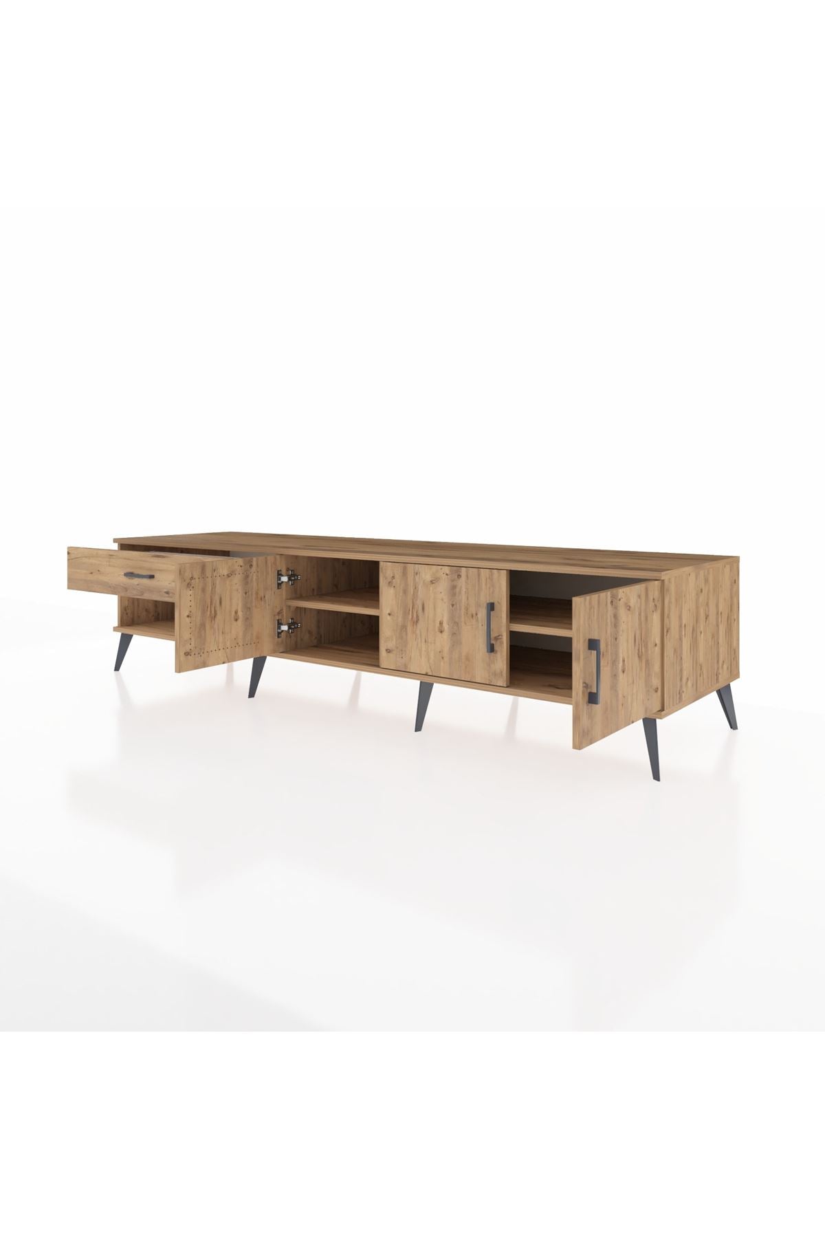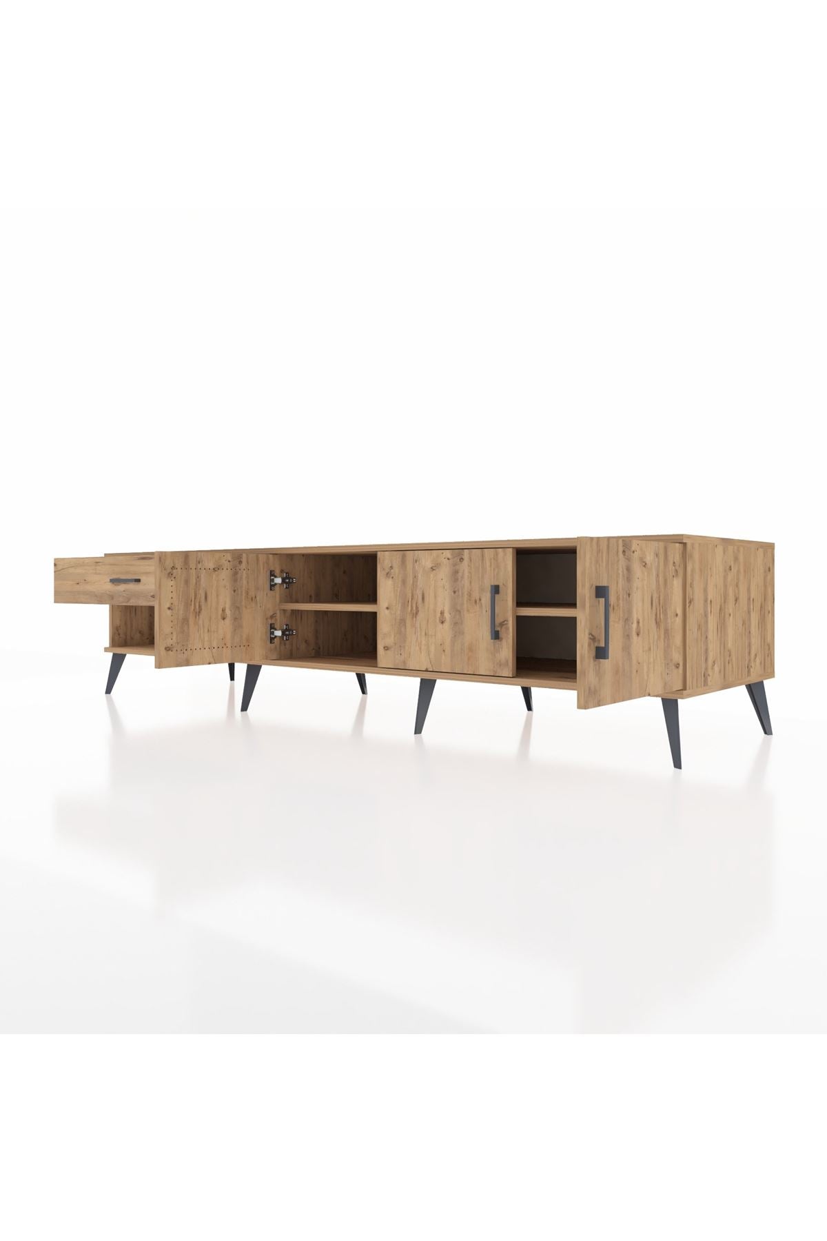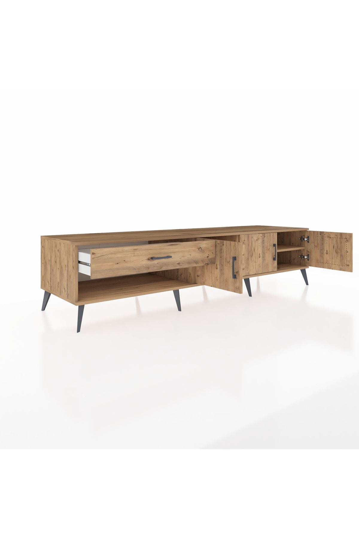 🦾 Metal ayaklar, TV ünitesine modern bir görünüm kazandırırken aynı zamanda yerden yüksekliği sayesinde temizlik kolaylığı sağlar. Metal kulplar ise şık detayları tamamlayarak ürünün genel estetiğine katkıda bulunur.