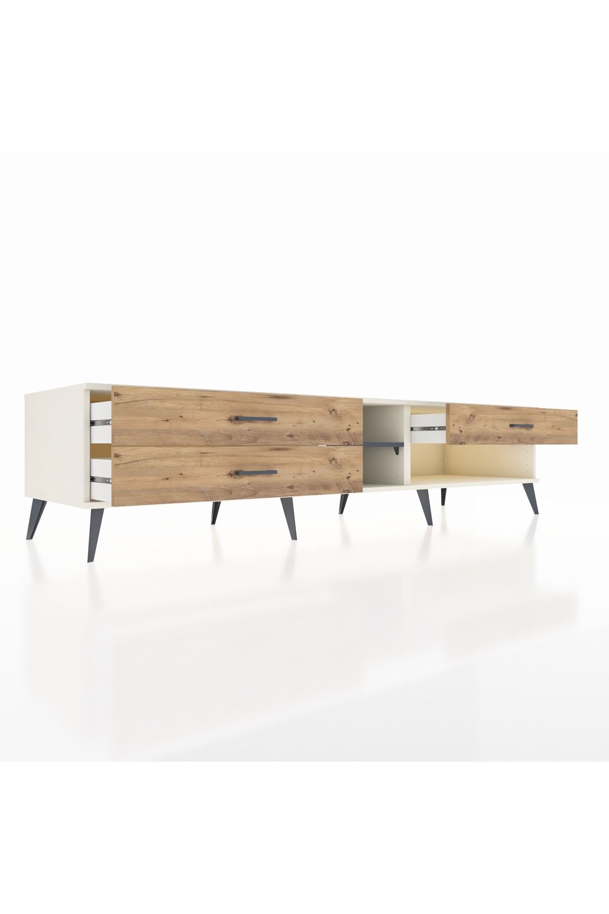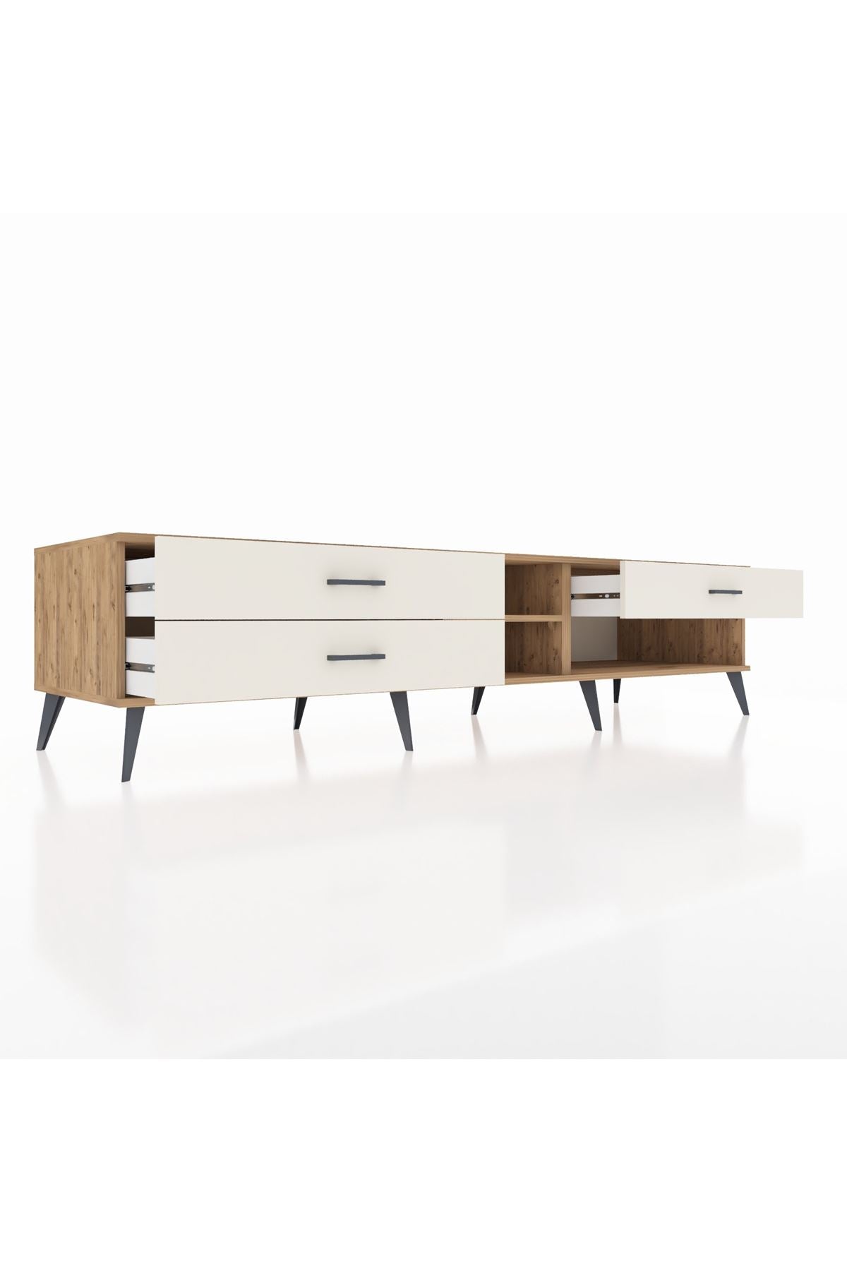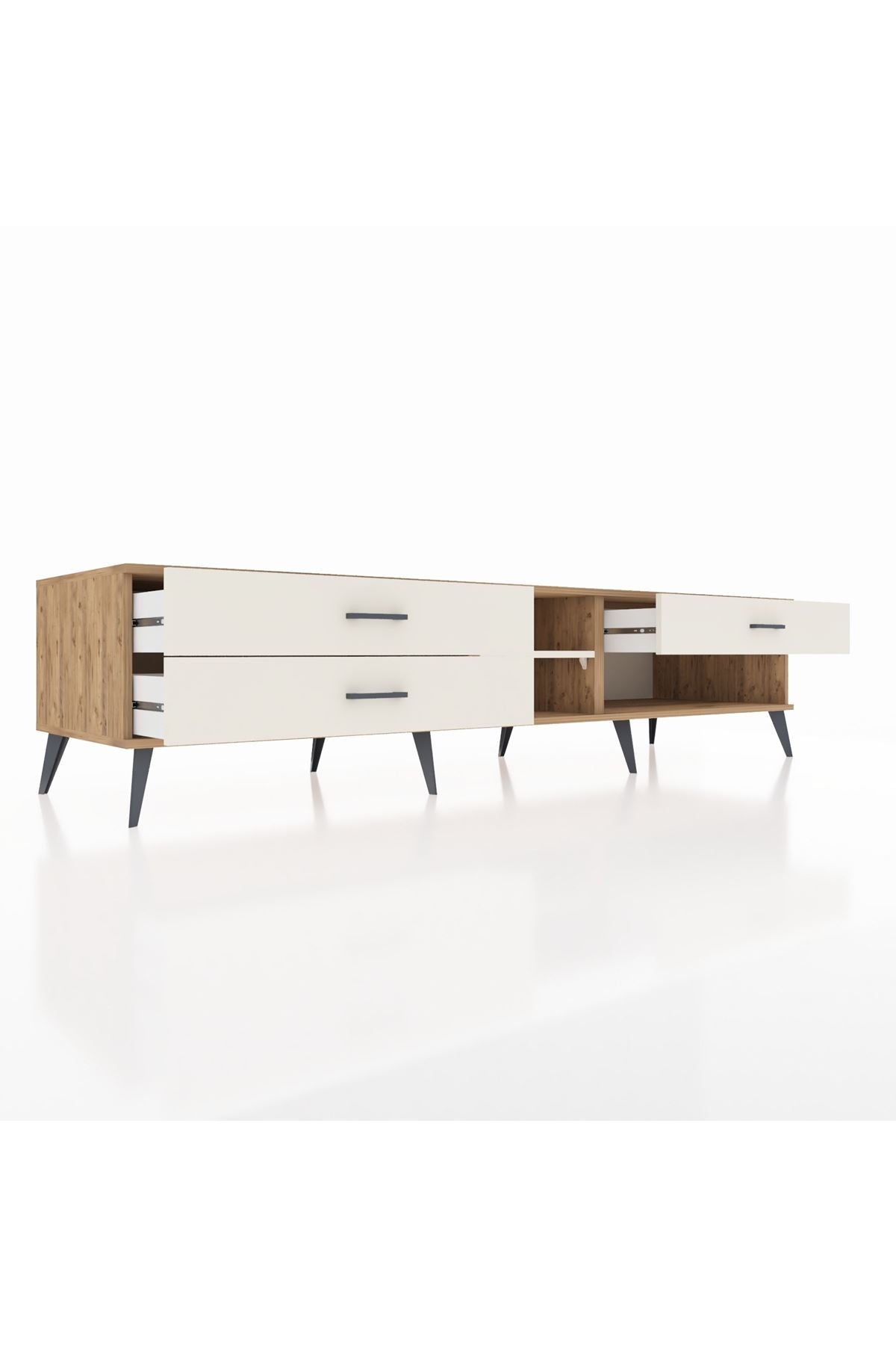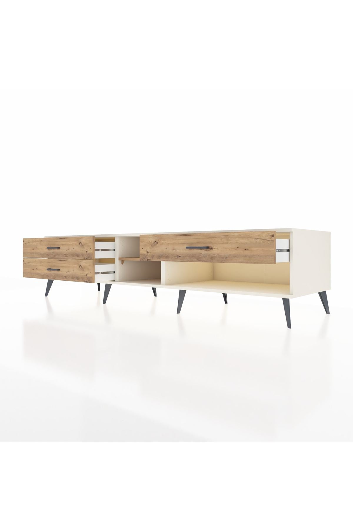 🦾 Metal ayaklar ve metal kulplar, ünitenin modern ve şık görünümünü tamamlar. Metal detaylar, hem sağlamlık sağlar hem de tasarıma zarif bir dokunuş katar. Robot süpürge kullanımına uygun ayak yüksekliği sayesinde temizlik de artık çok daha kolay.
