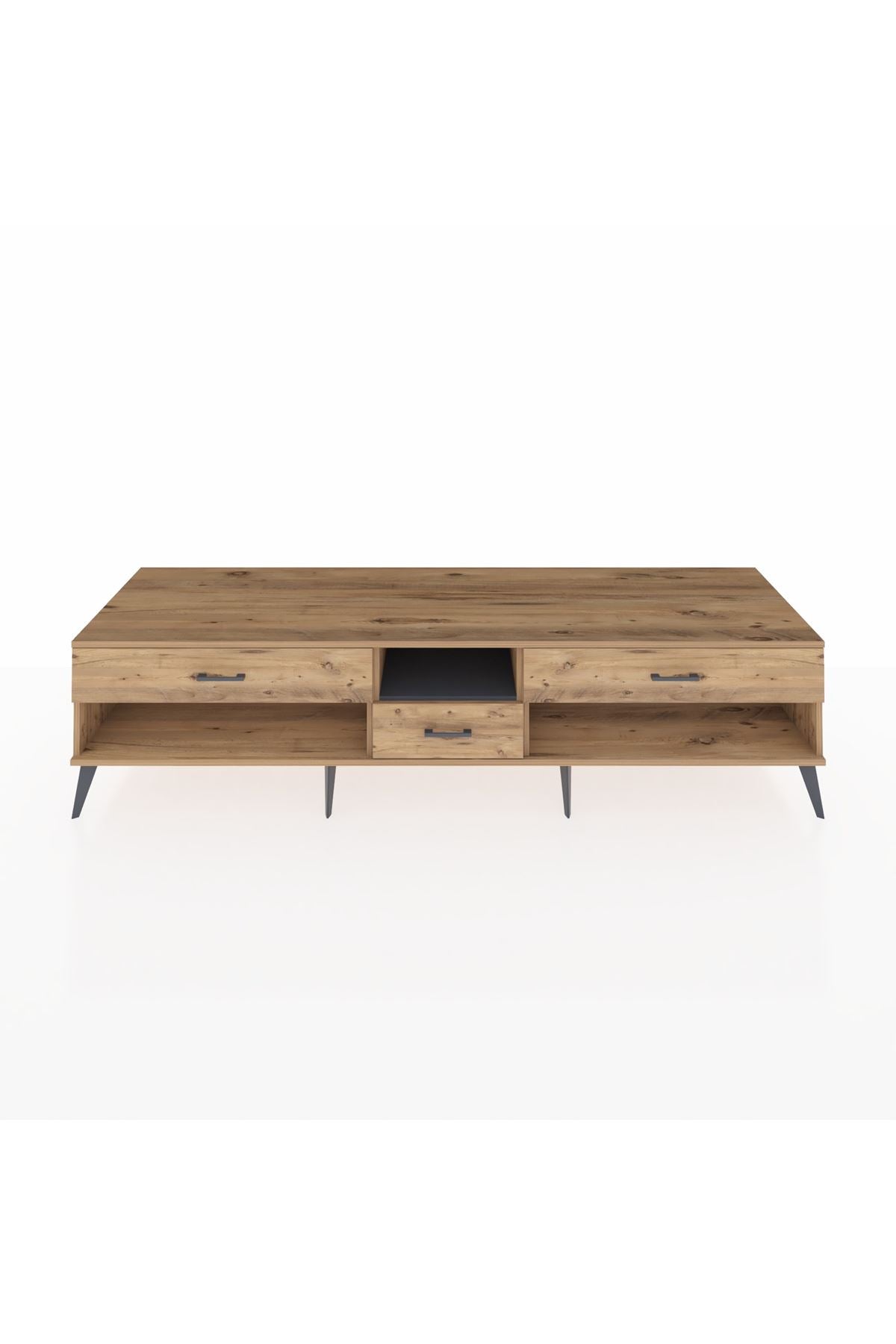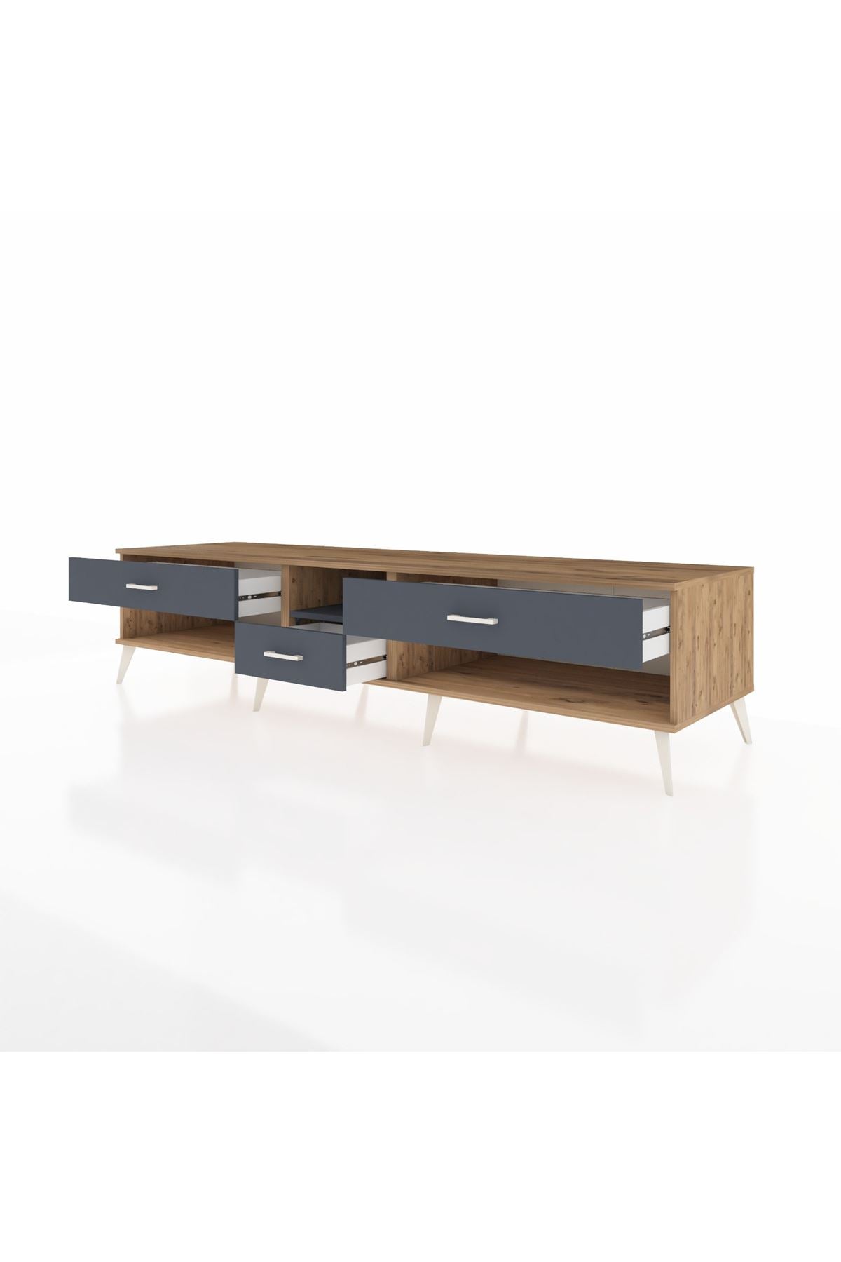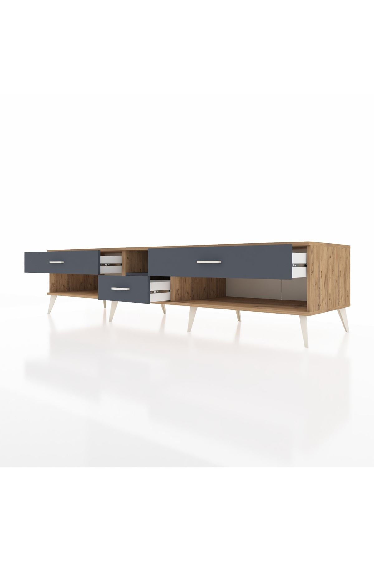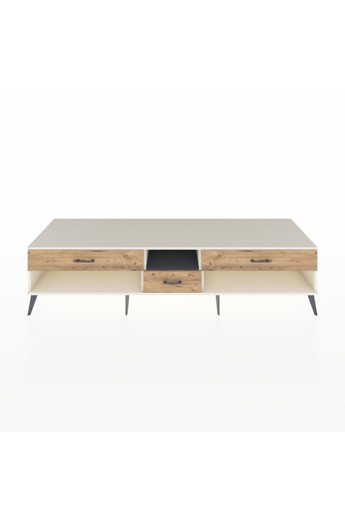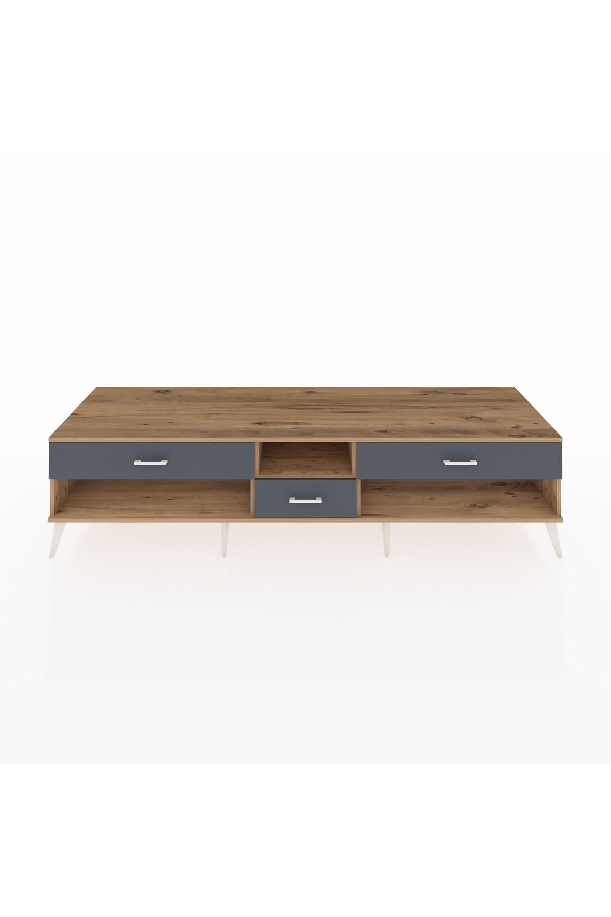 🦾 Metal ayaklar, Kronos TV Ünitesi'ne modern ve şık bir görünüm kazandırır. Metal kulplar, çekmecelerin kolayca açılmasını sağlarken, ürünün genel tasarımına uyum sağlar ve uzun yıllar sorunsuz bir kullanım sunar.