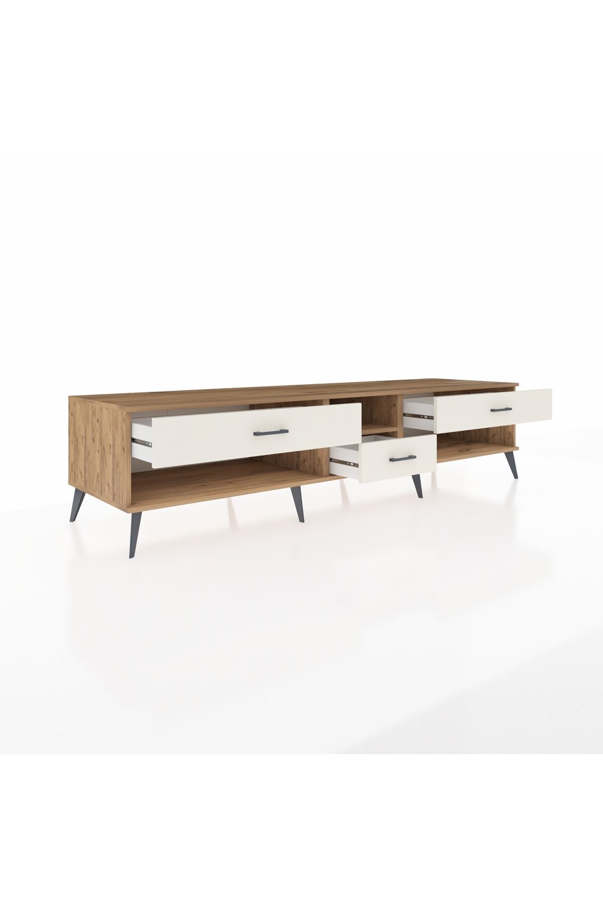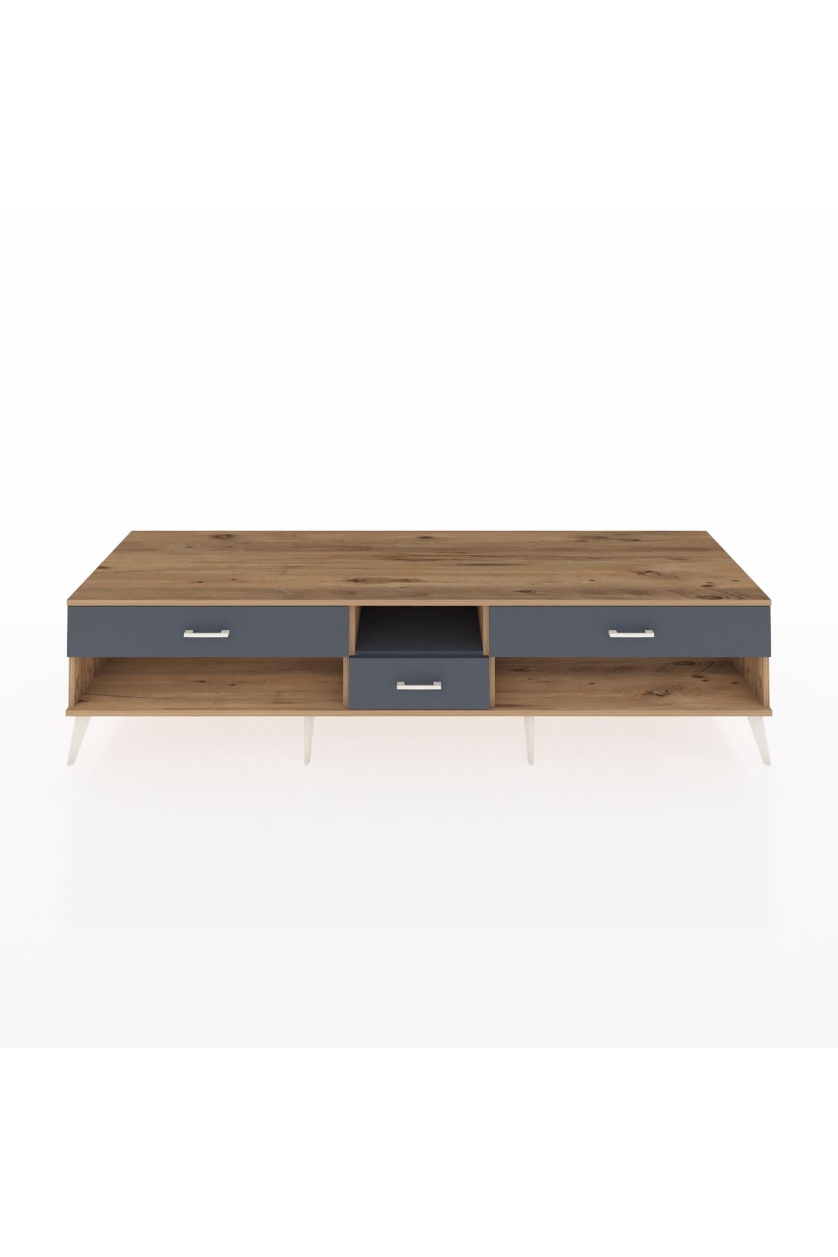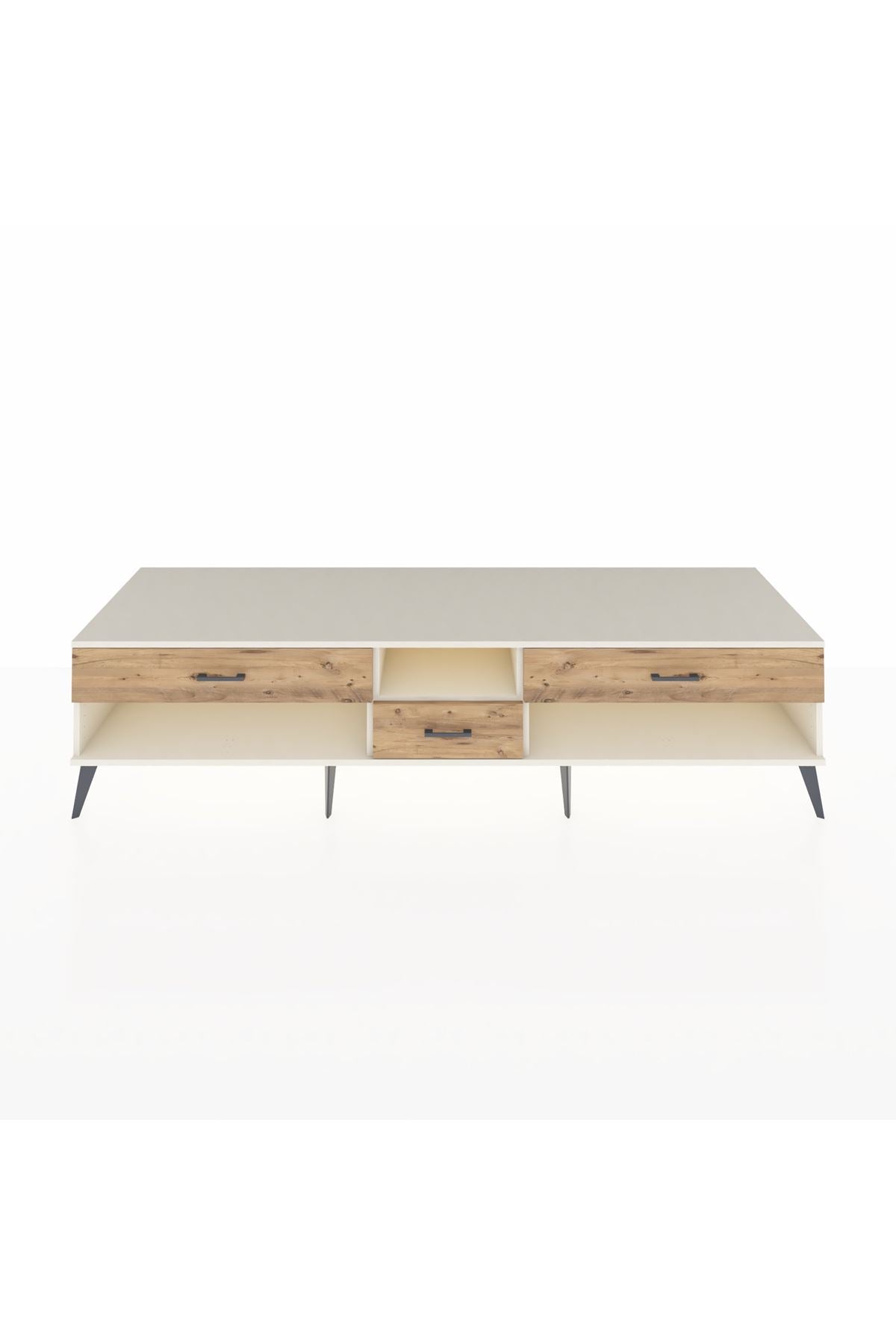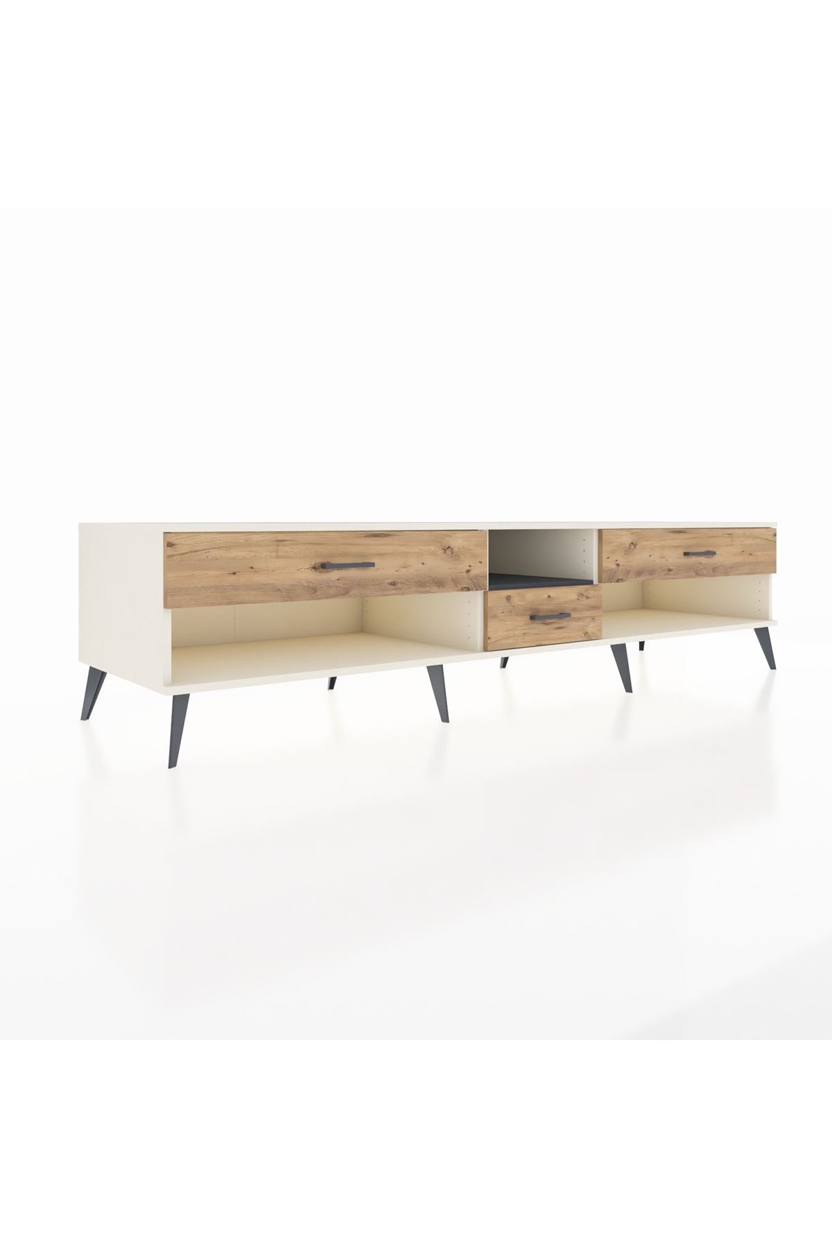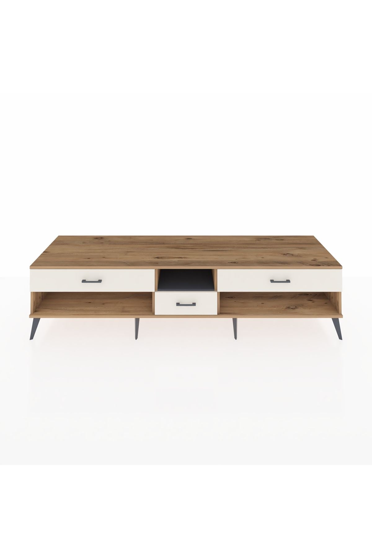🦾 Metal ayaklar, Kronos TV Ünitesi'ne modern ve şık bir görünüm kazandırır. Metal kulplar, çekmecelerin kolayca açılmasını sağlarken, ürünün genel tasarımına uyum sağlar ve uzun yıllar sorunsuz bir kullanım sunar.