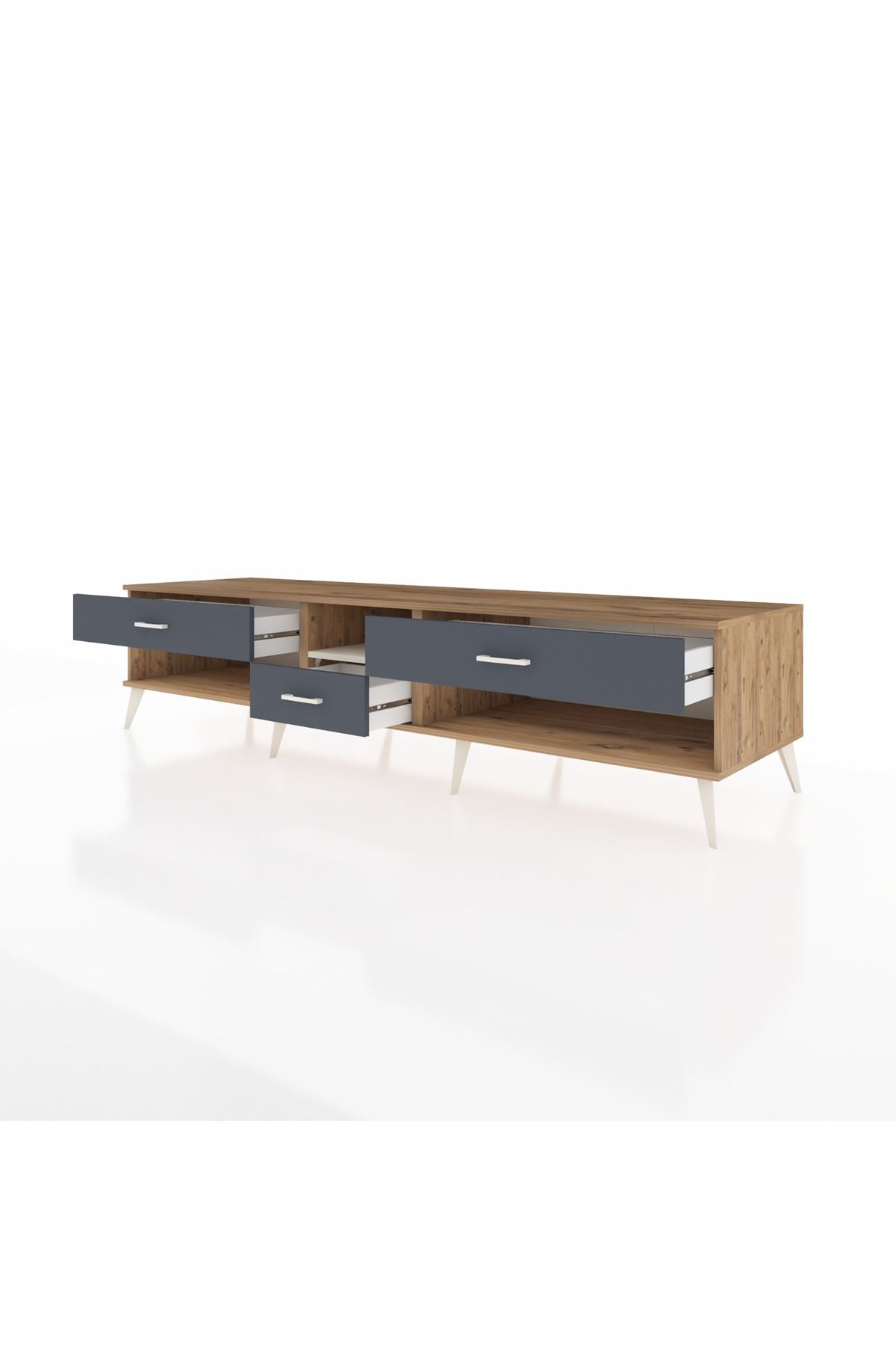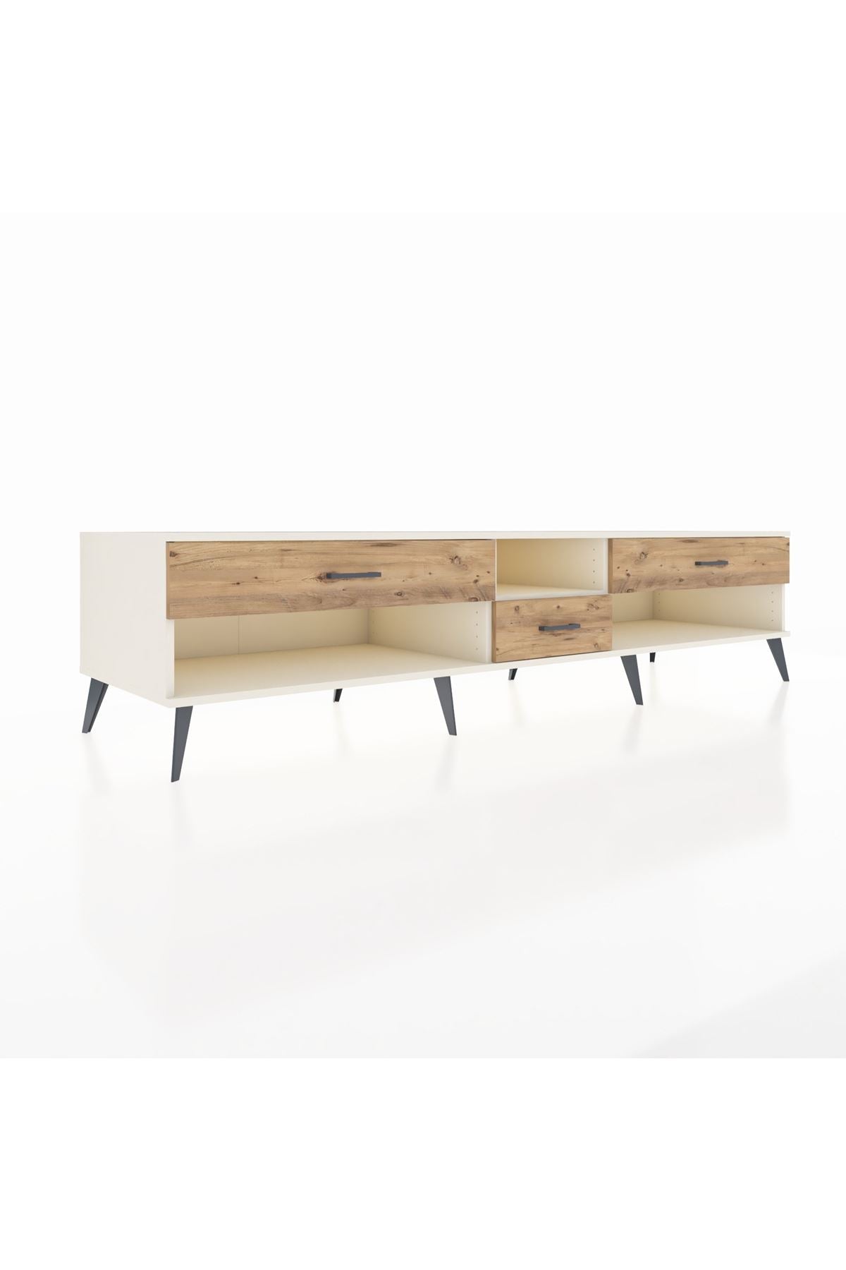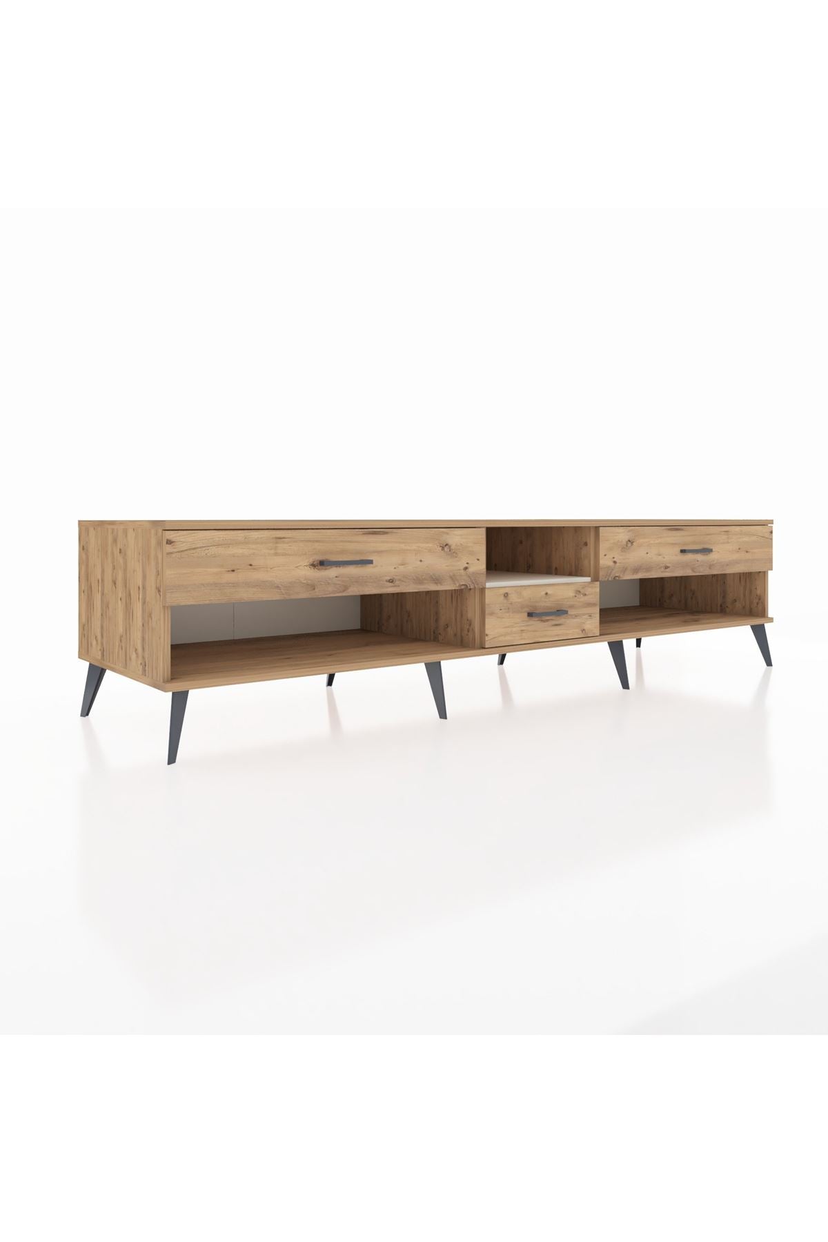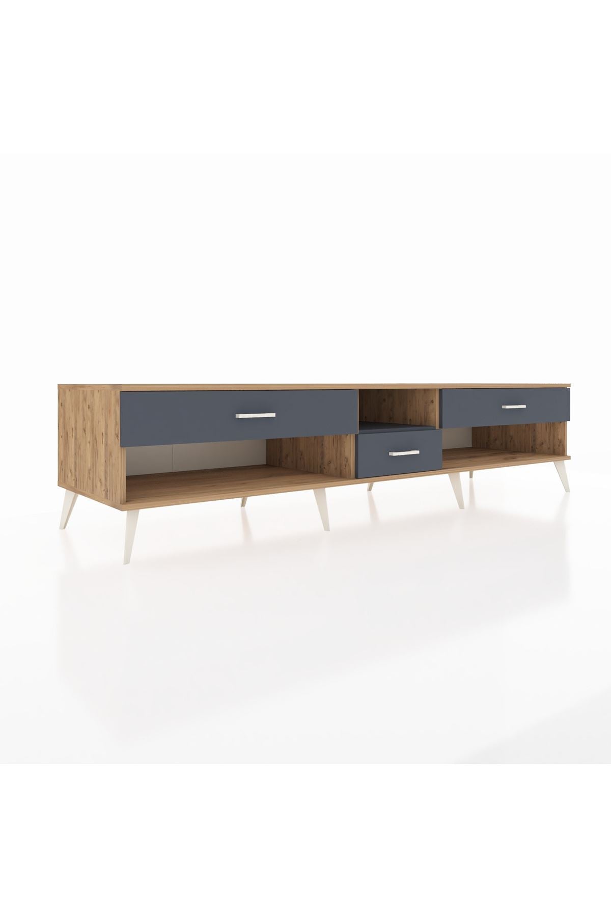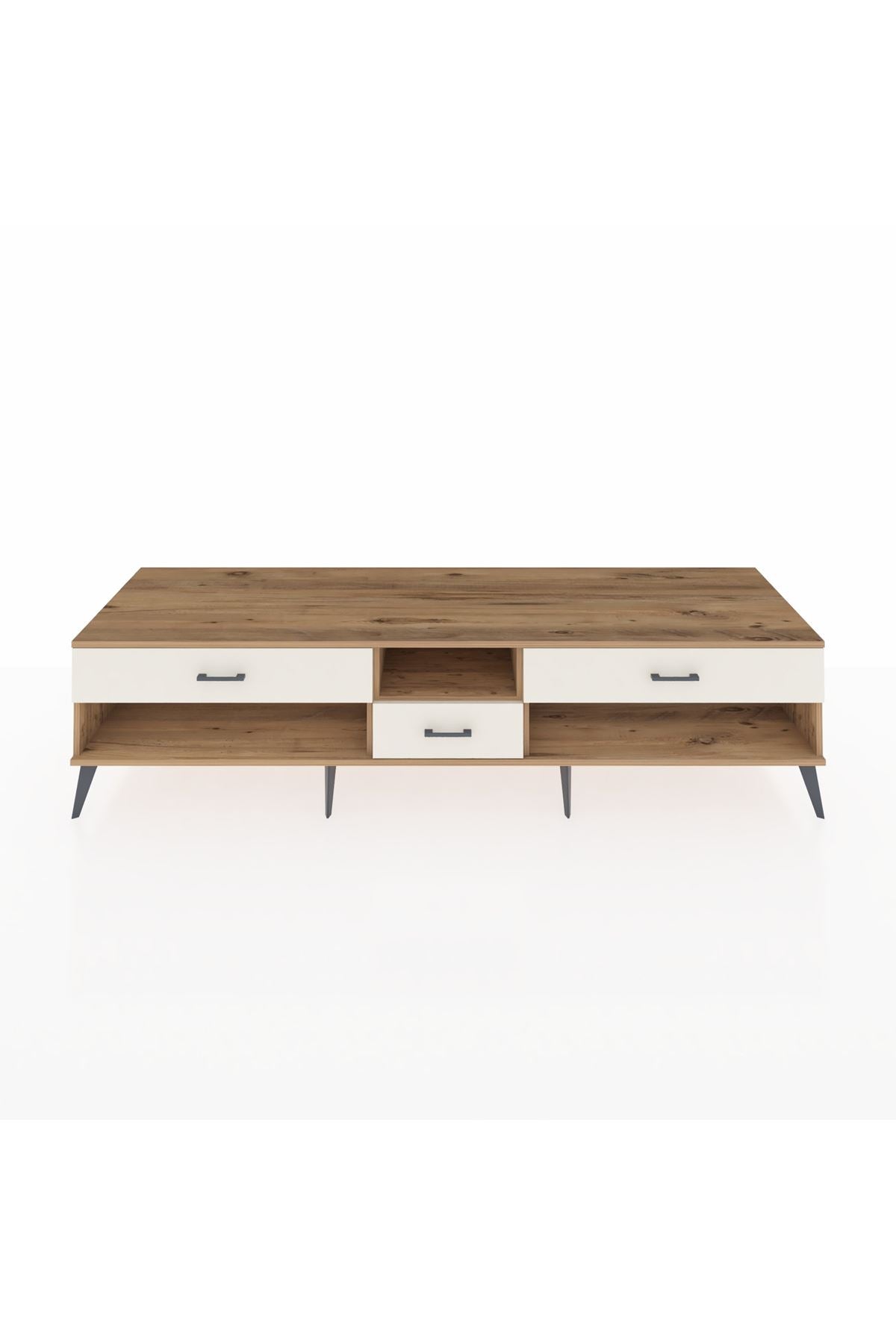 🦾 Metal ayaklar, Kronos TV Ünitesi'ne modern ve şık bir görünüm kazandırır. Metal kulplar, çekmecelerin kolayca açılmasını sağlarken, ürünün genel tasarımına uyum sağlar ve uzun yıllar sorunsuz bir kullanım sunar.