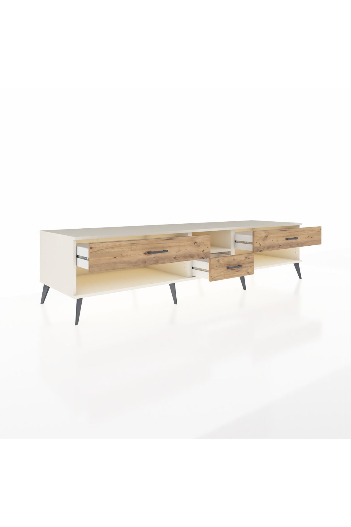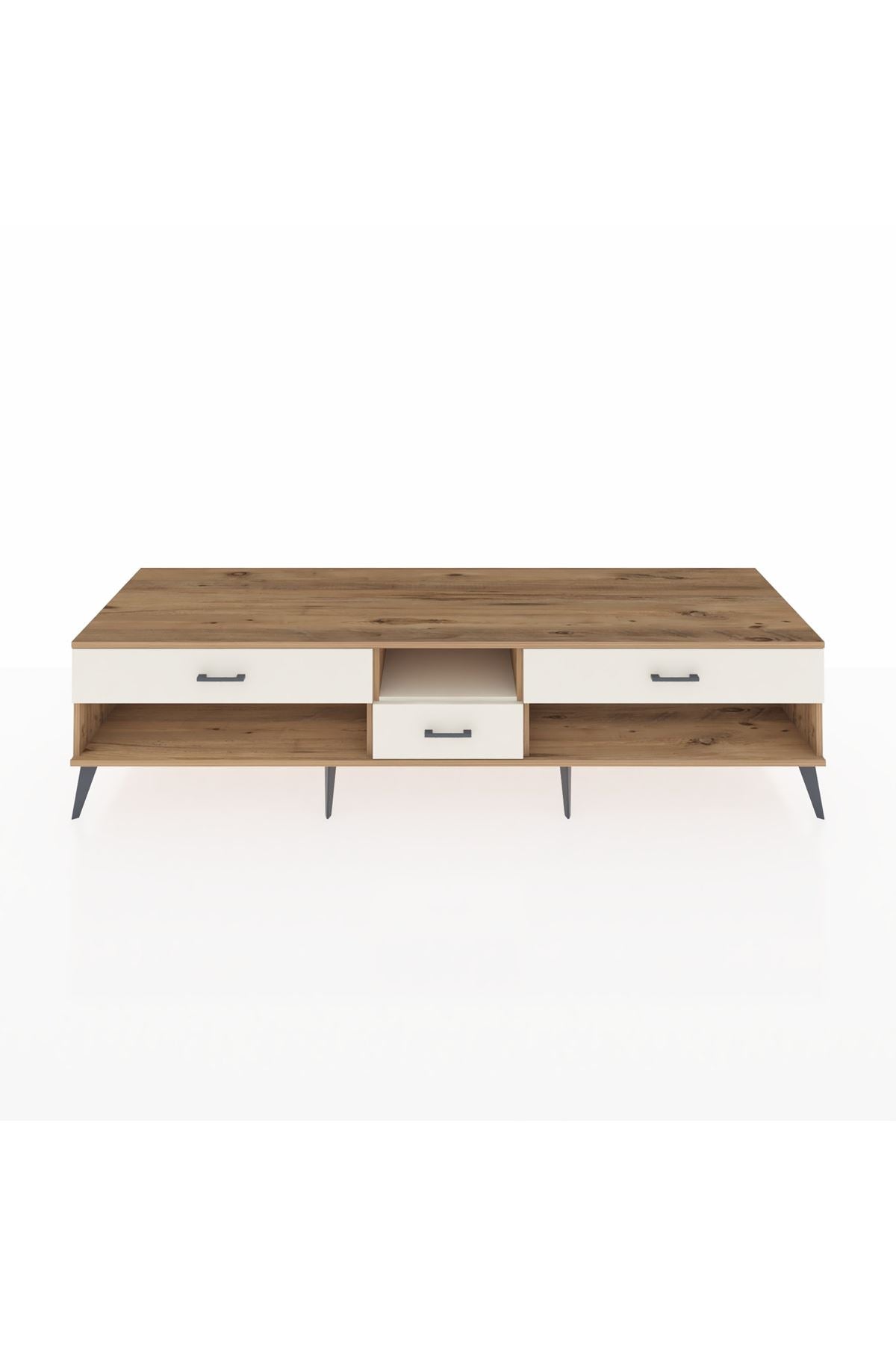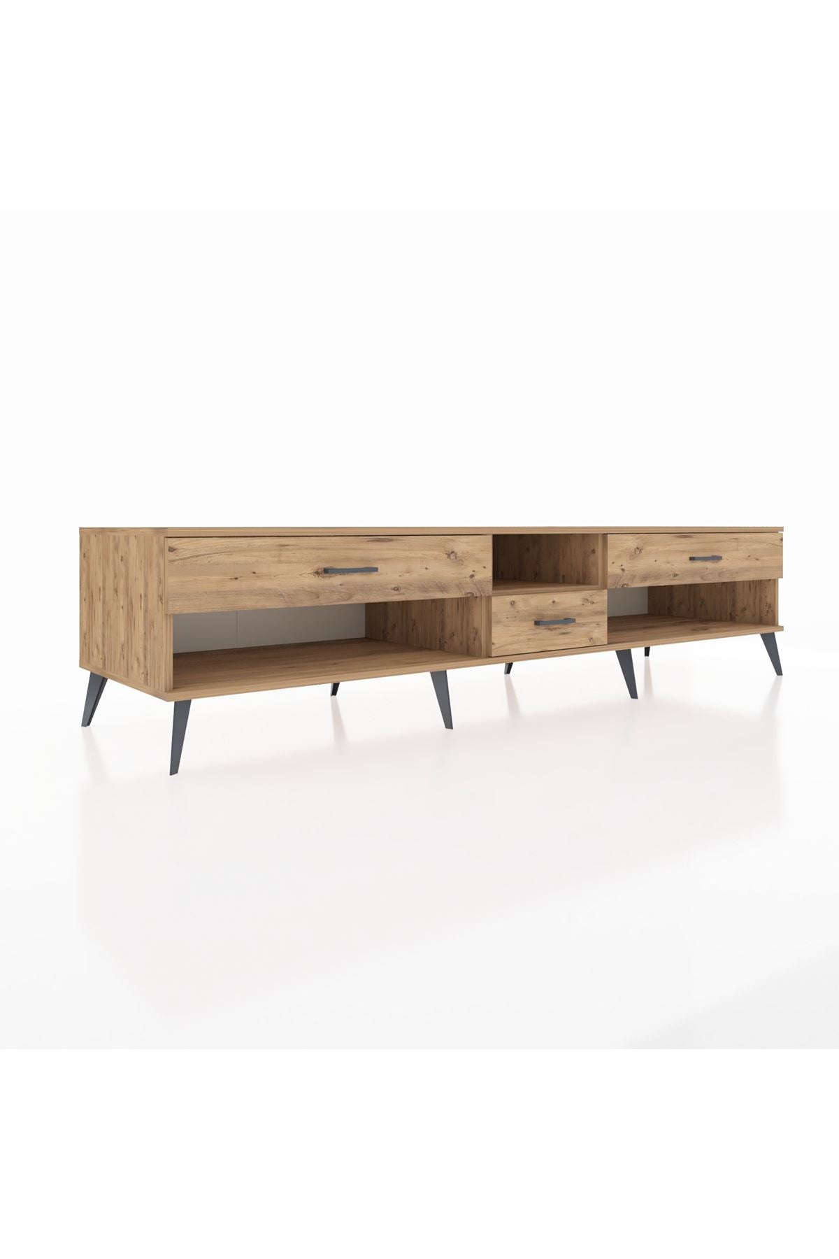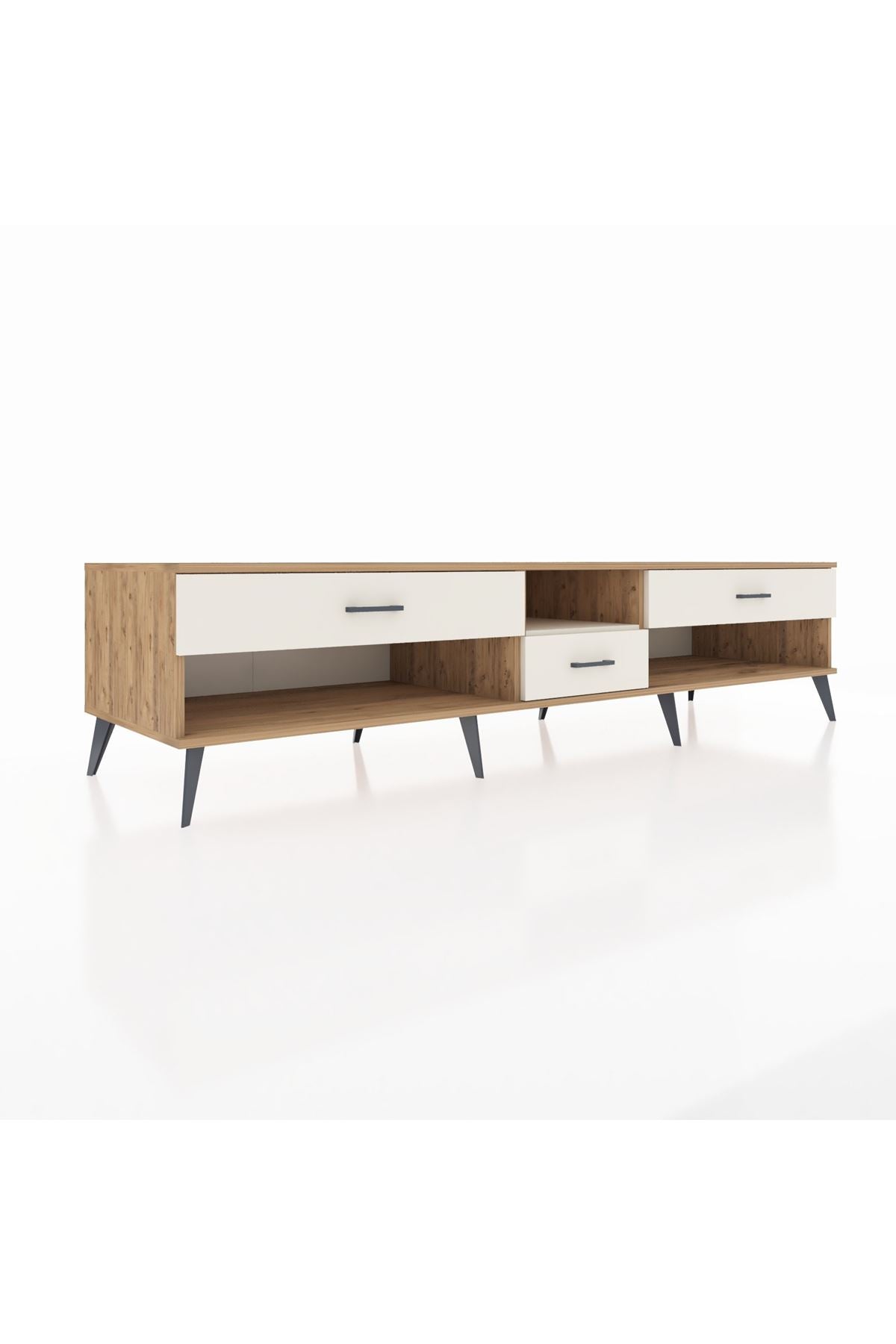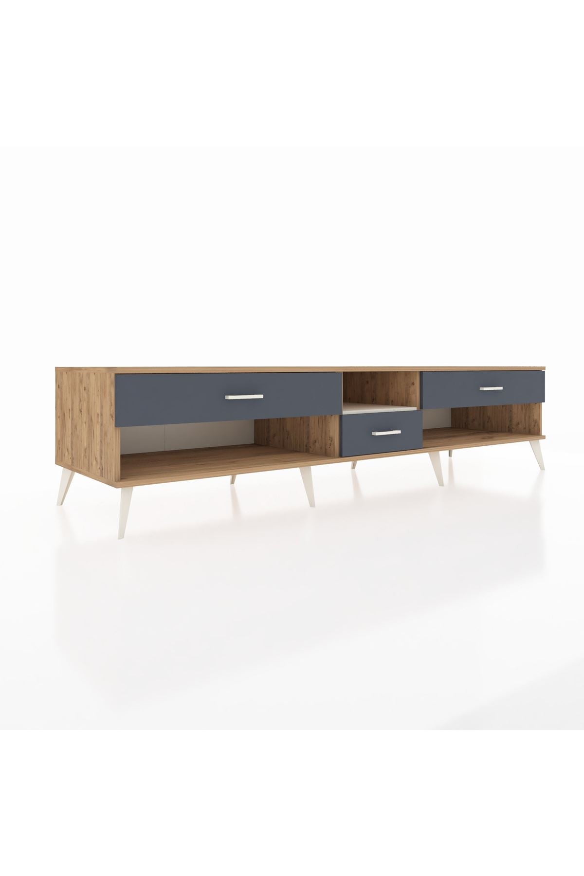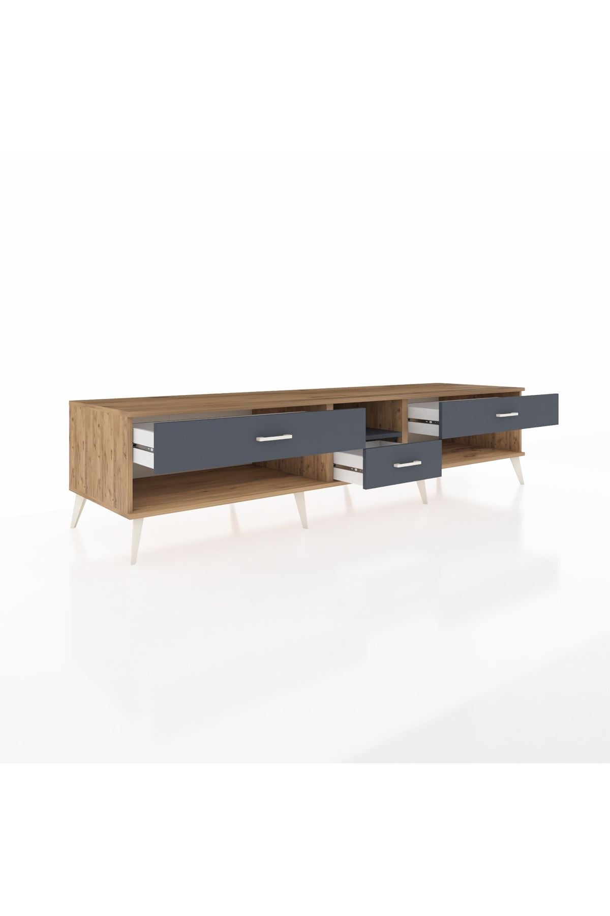 🦾 Metal ayaklar, Kronos TV Ünitesi'ne modern ve şık bir görünüm kazandırır. Metal kulplar, çekmecelerin kolayca açılmasını sağlarken, ürünün genel tasarımına uyum sağlar ve uzun yıllar sorunsuz bir kullanım sunar.