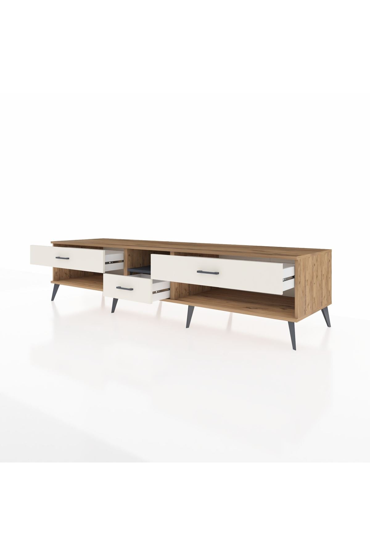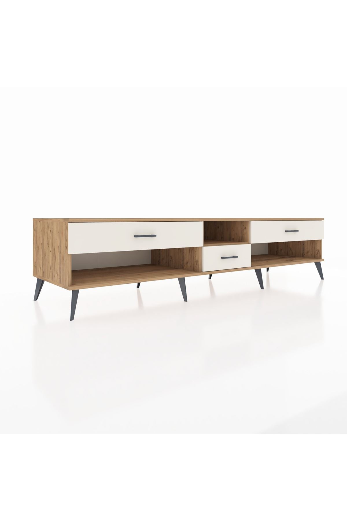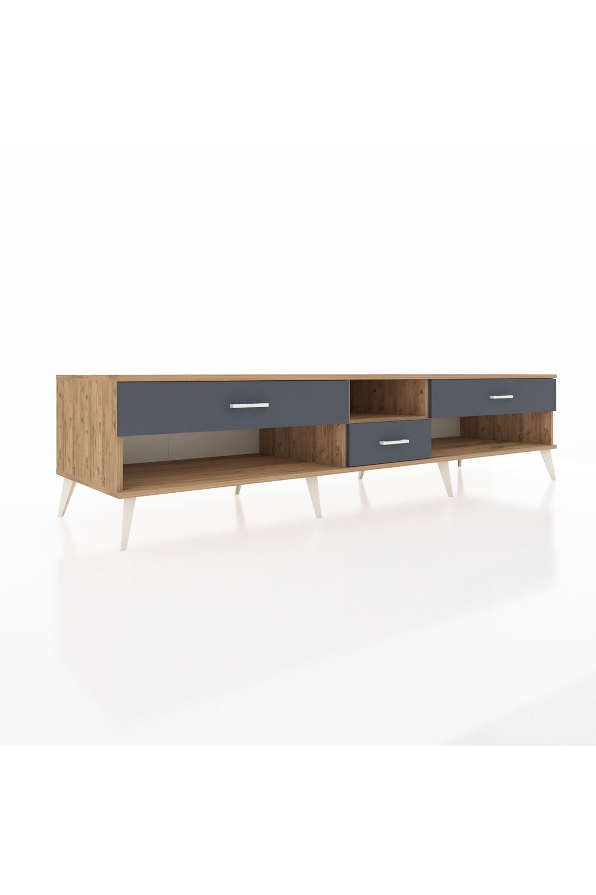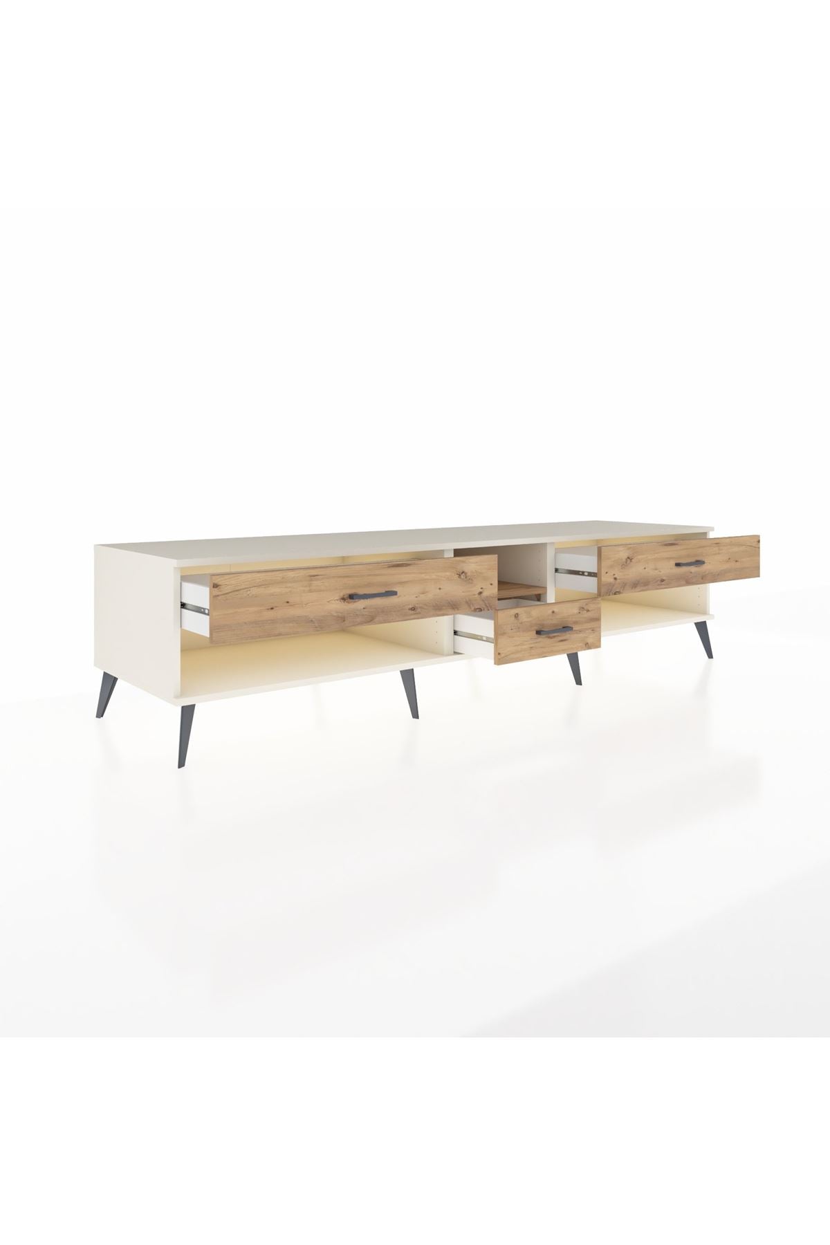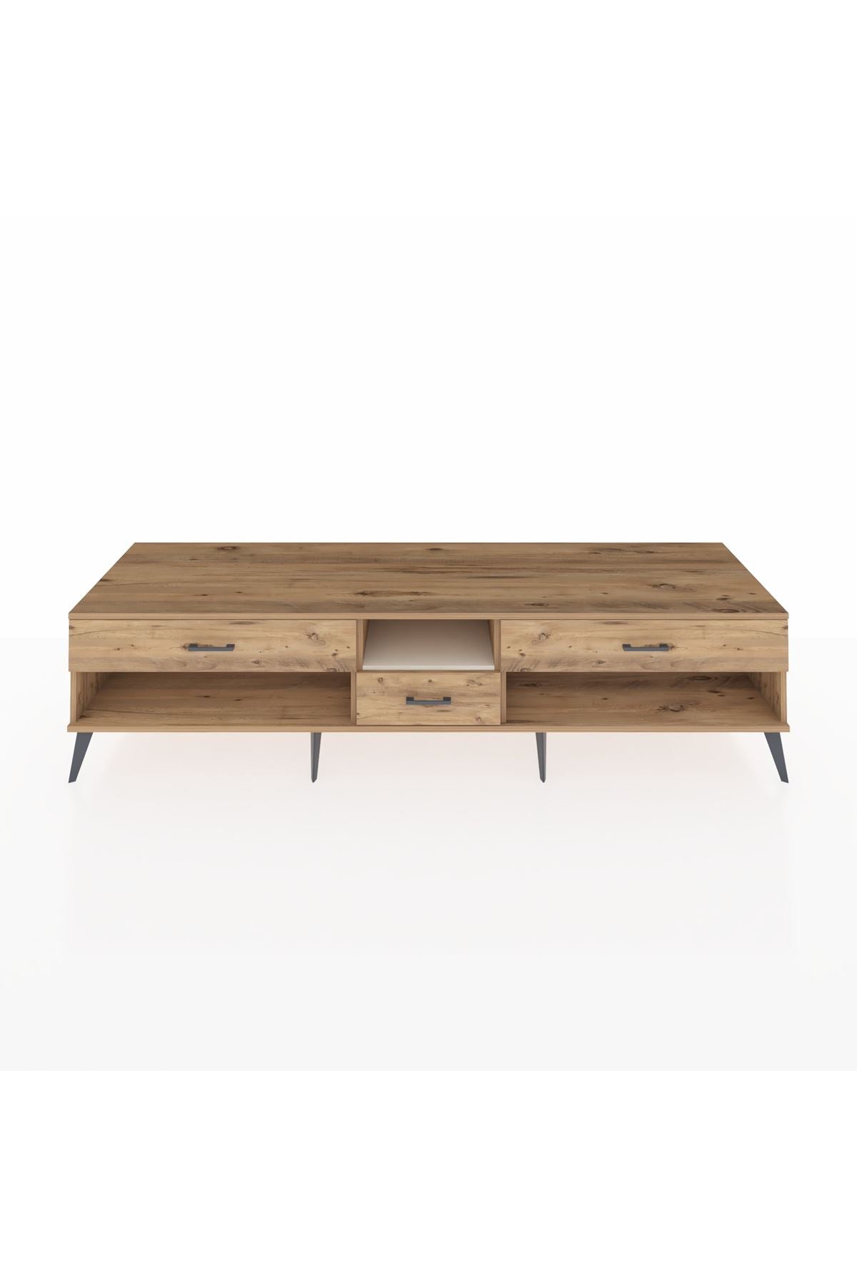 🦾 Metal ayaklar, Kronos TV Ünitesi'ne modern ve şık bir görünüm kazandırır. Metal kulplar, çekmecelerin kolayca açılmasını sağlarken, ürünün genel tasarımına uyum sağlar ve uzun yıllar sorunsuz bir kullanım sunar.