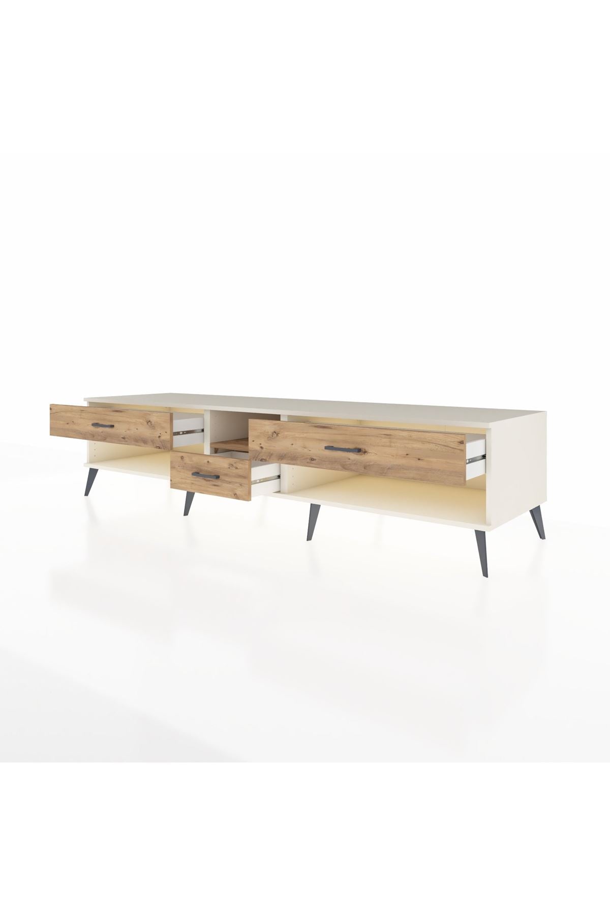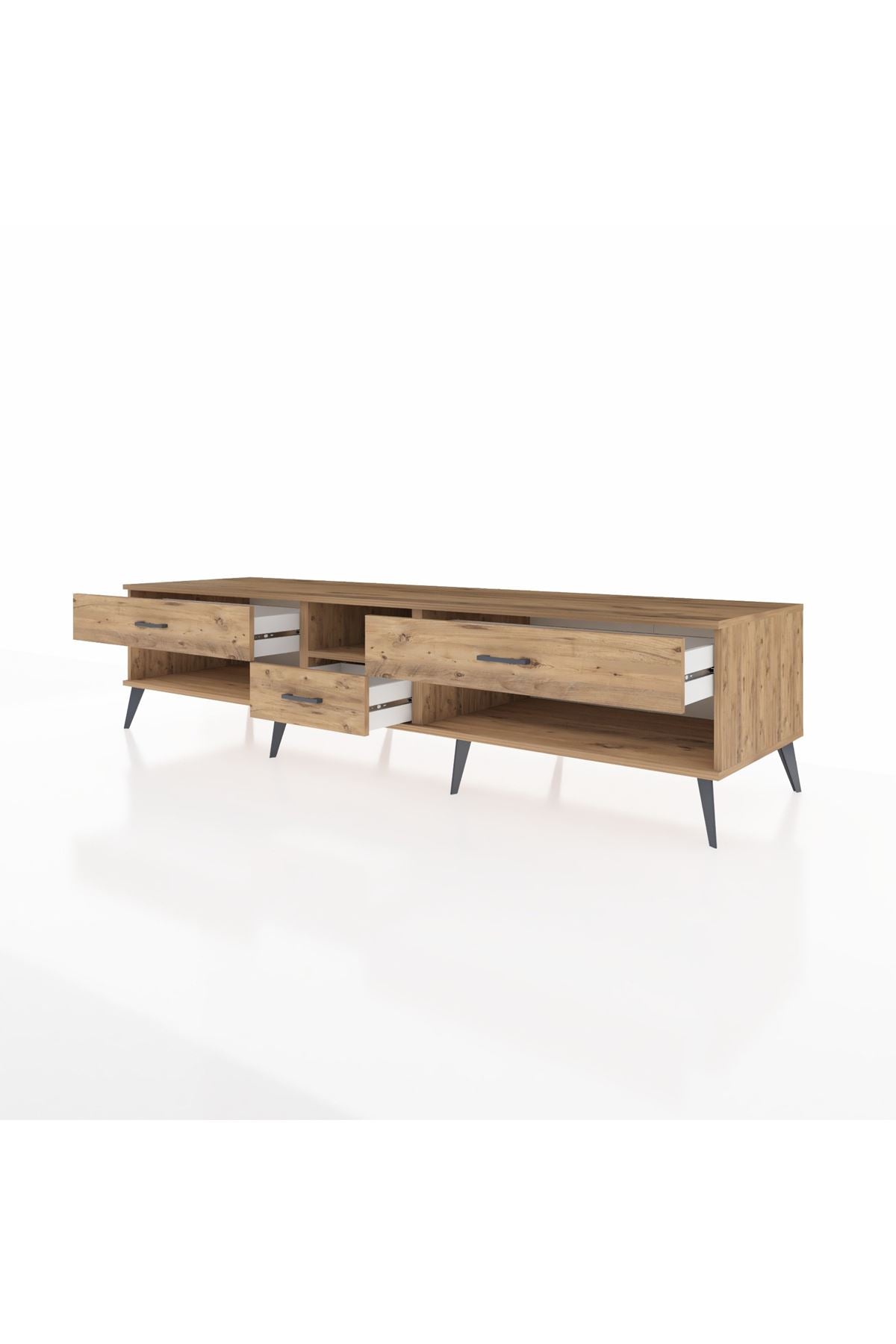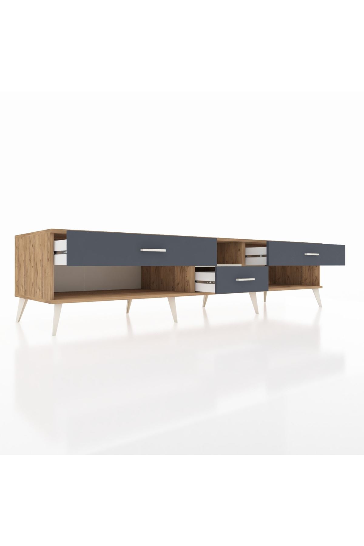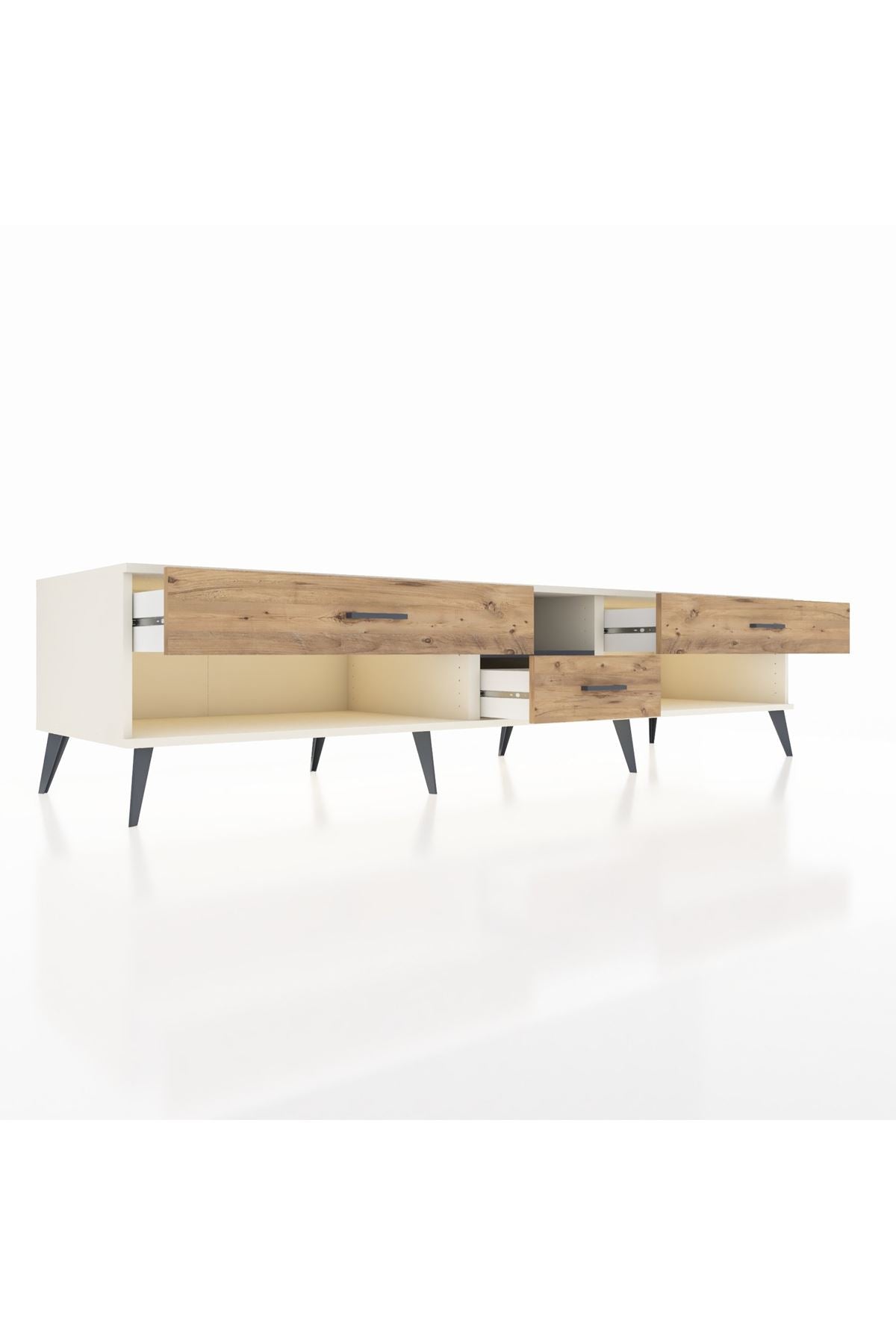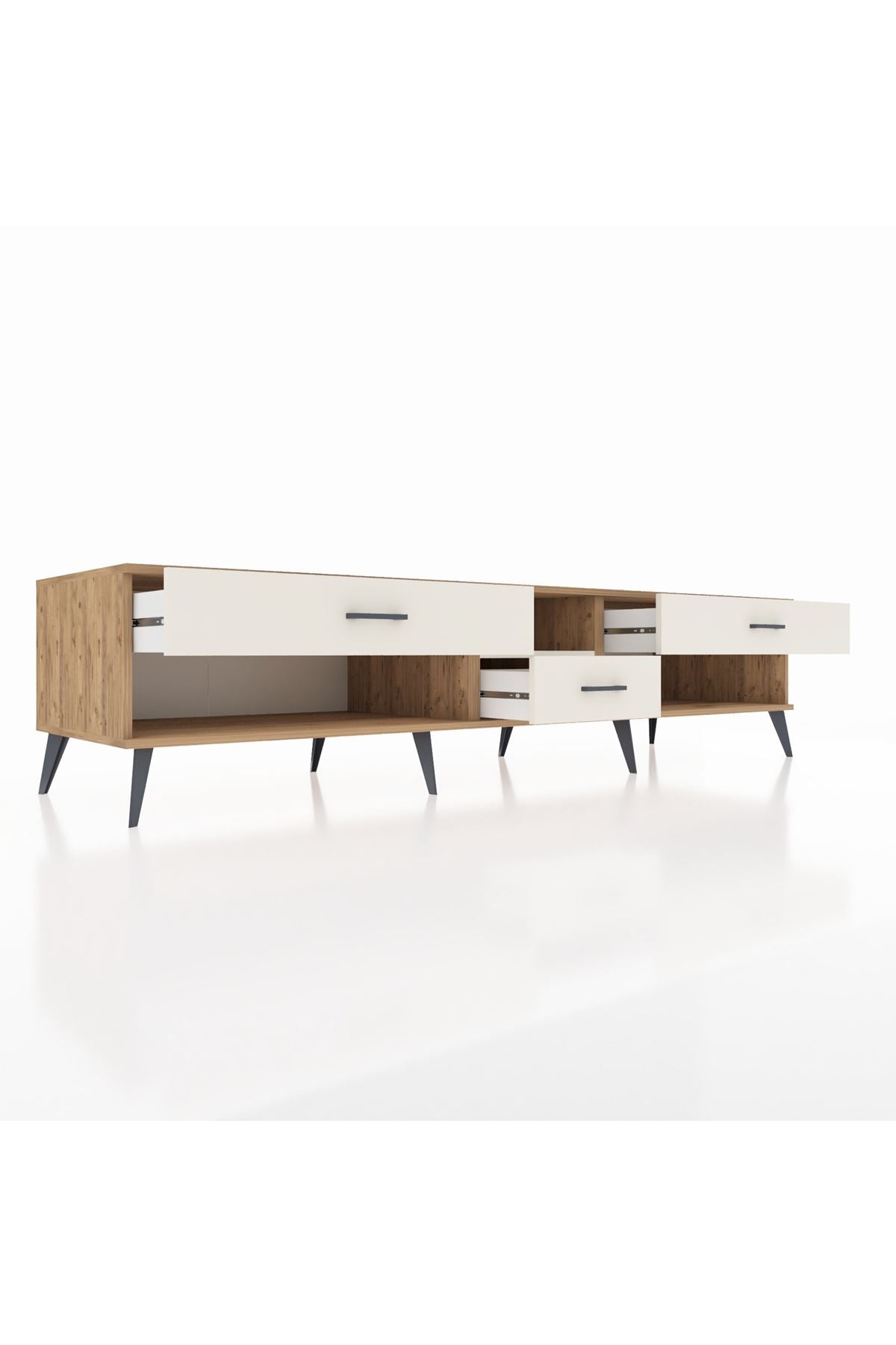 🦾 Metal ayaklar, Kronos TV Ünitesi'ne modern ve şık bir görünüm kazandırır. Metal kulplar, çekmecelerin kolayca açılmasını sağlarken, ürünün genel tasarımına uyum sağlar ve uzun yıllar sorunsuz bir kullanım sunar.