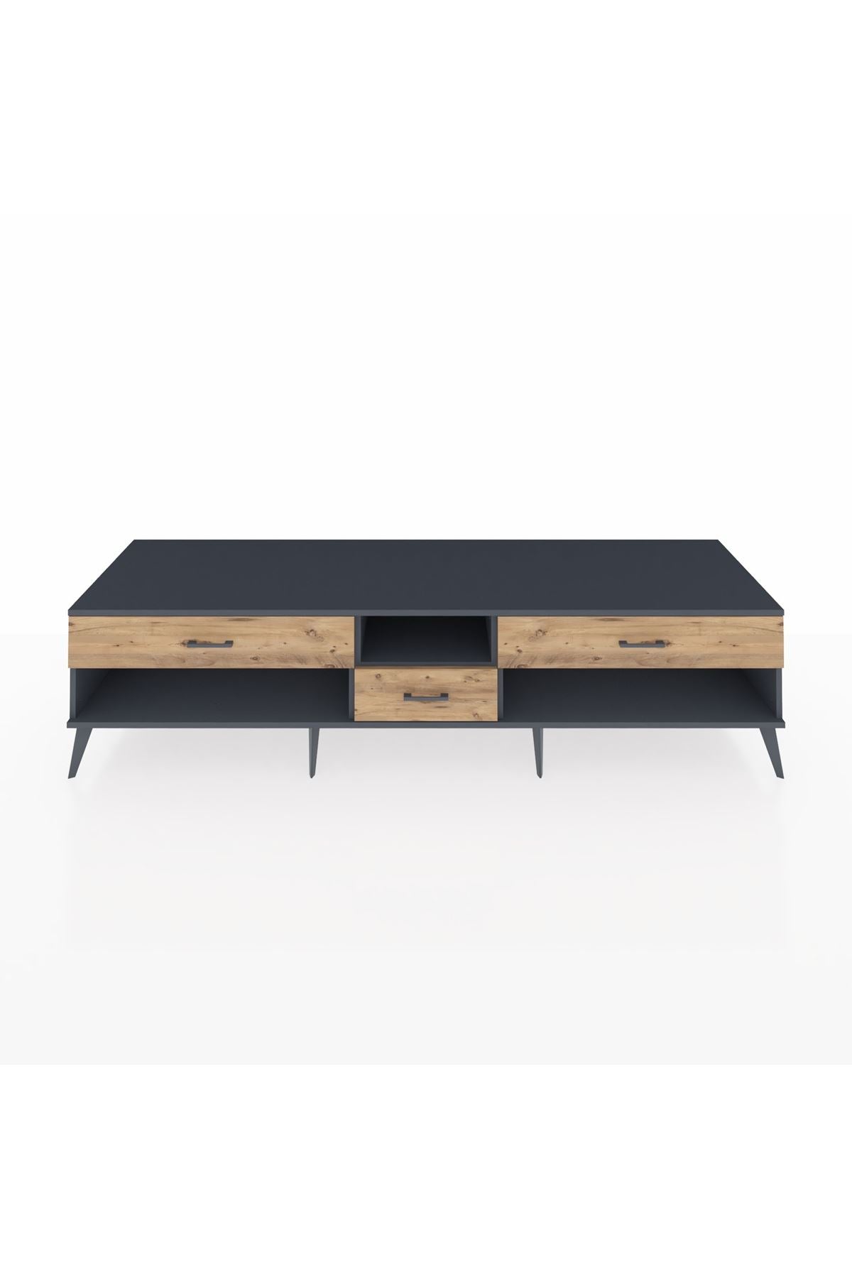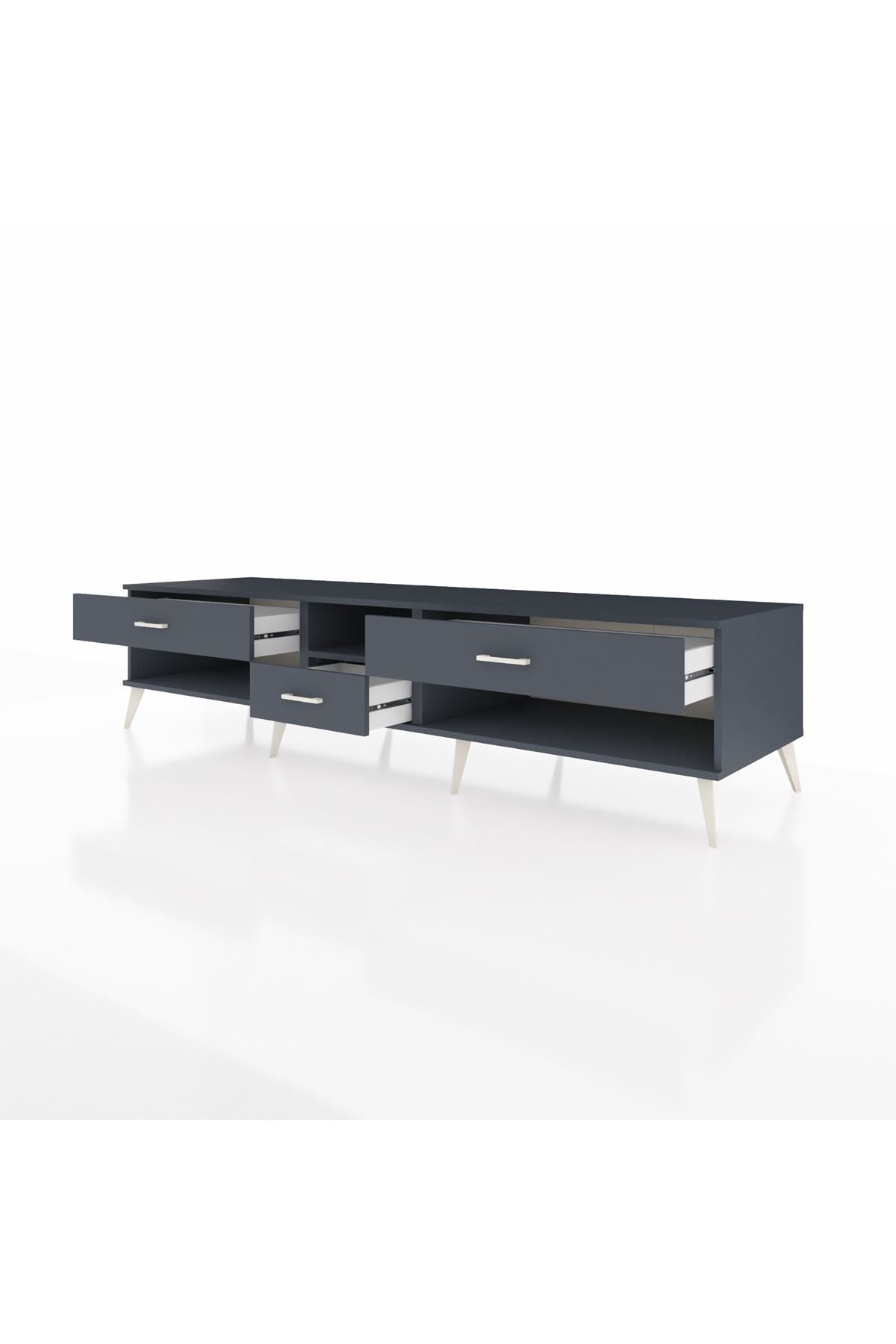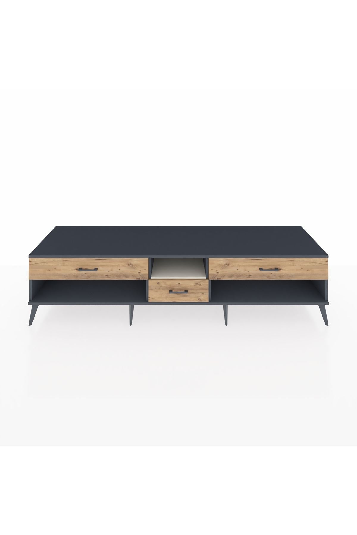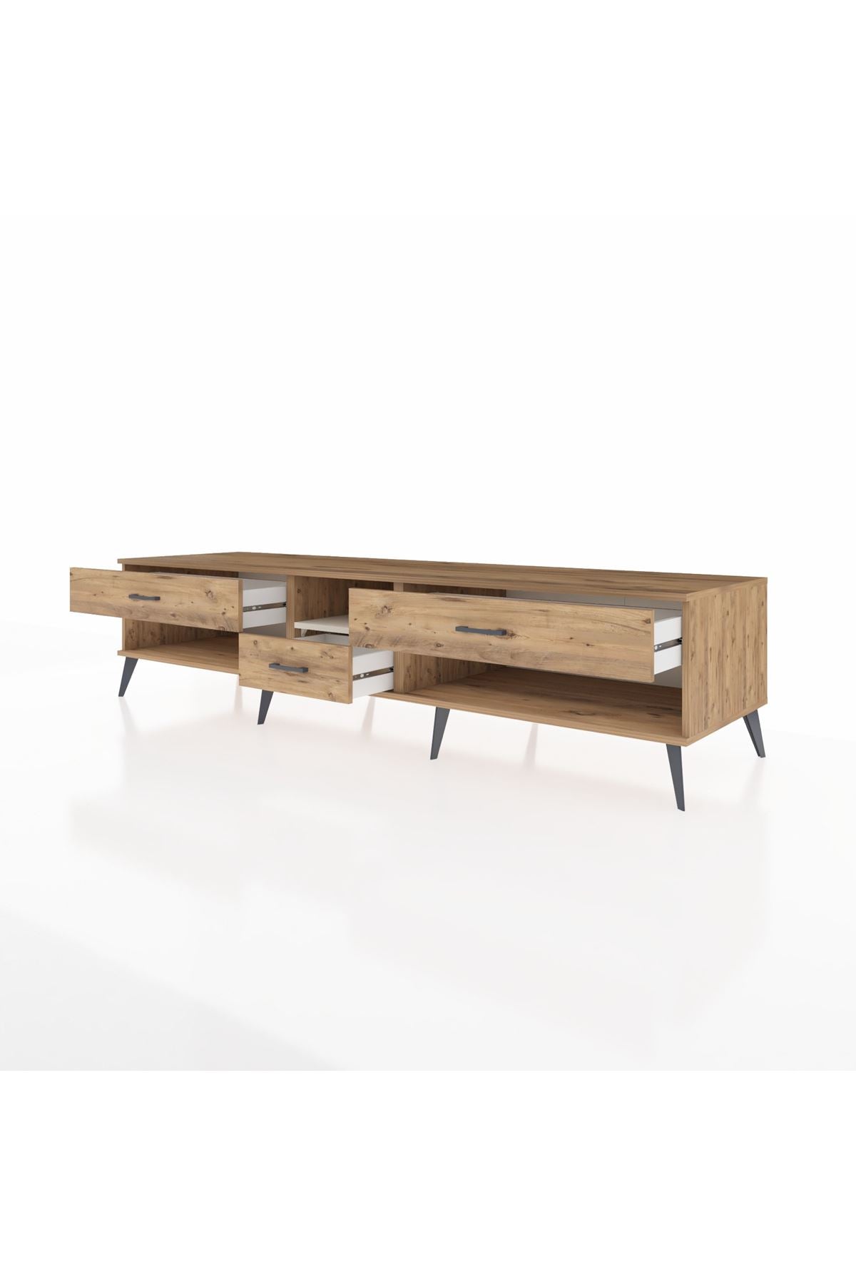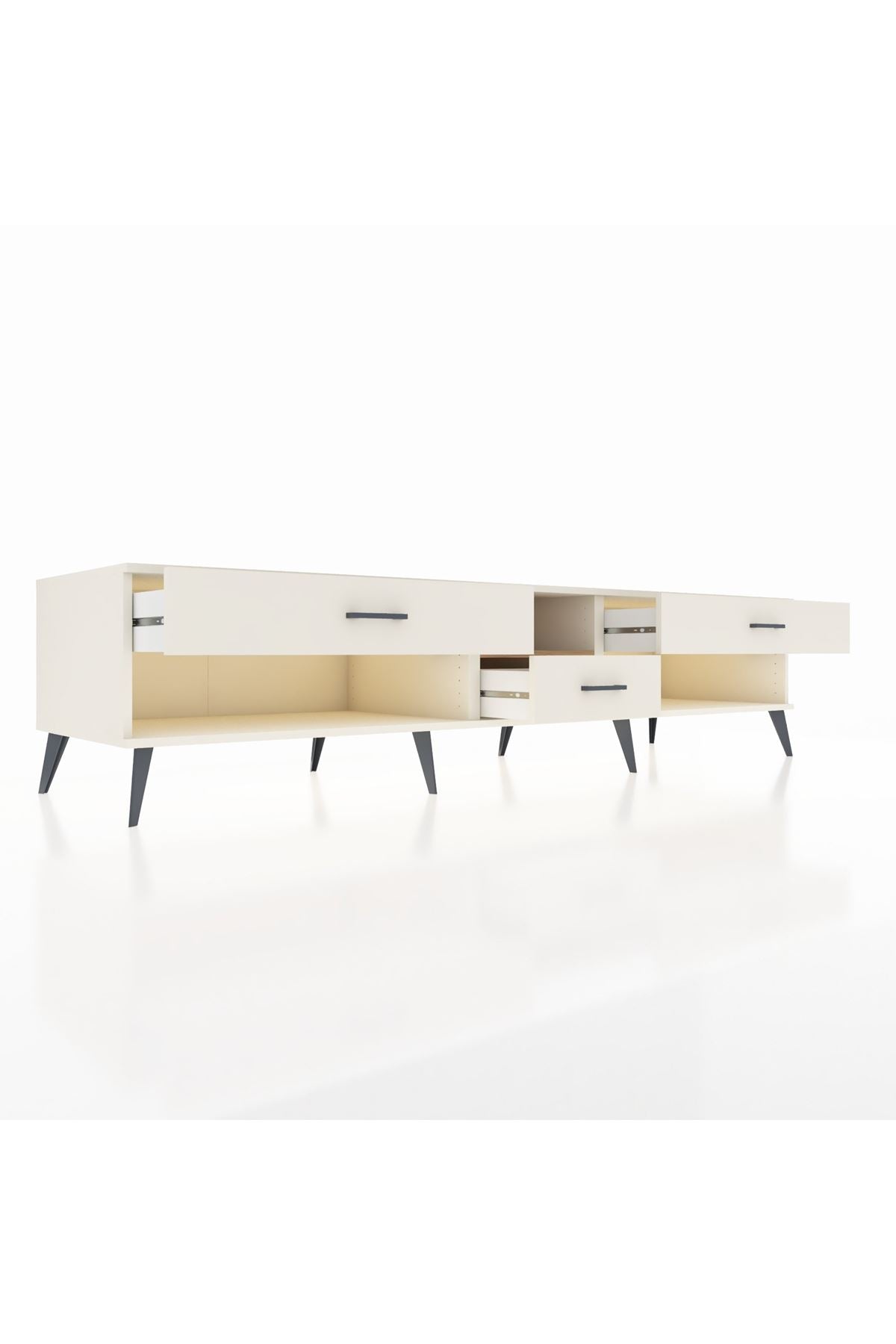 🦾 Metal ayaklar, Kronos TV Ünitesi'ne modern ve şık bir görünüm kazandırır. Metal kulplar, çekmecelerin kolayca açılmasını sağlarken, ürünün genel tasarımına uyum sağlar ve uzun yıllar sorunsuz bir kullanım sunar.