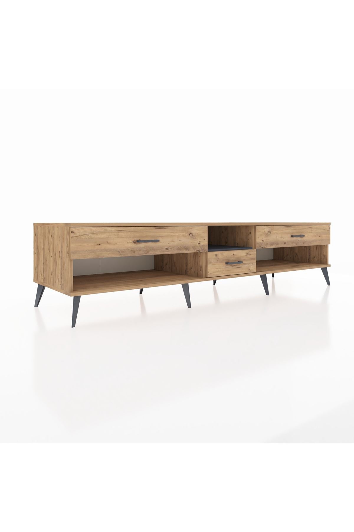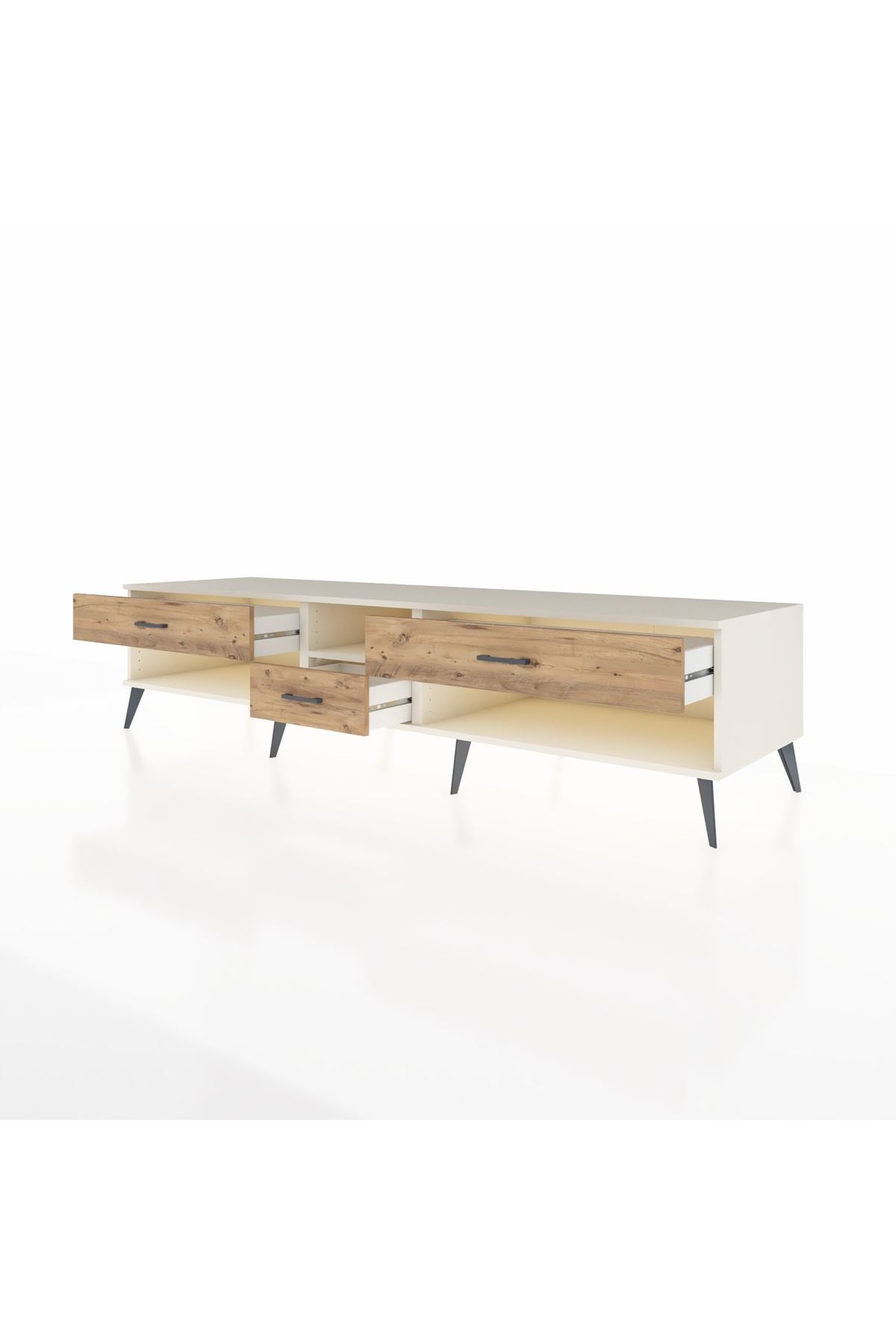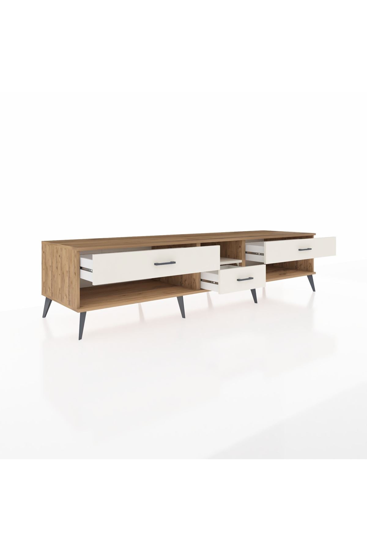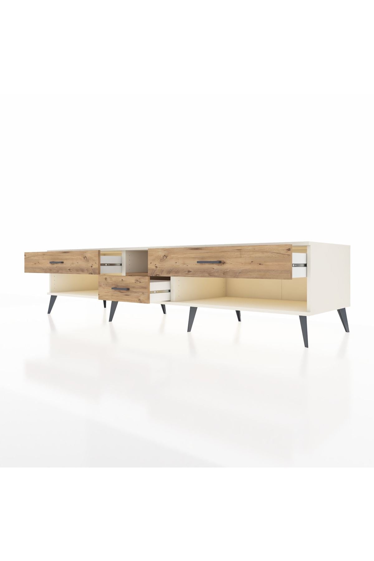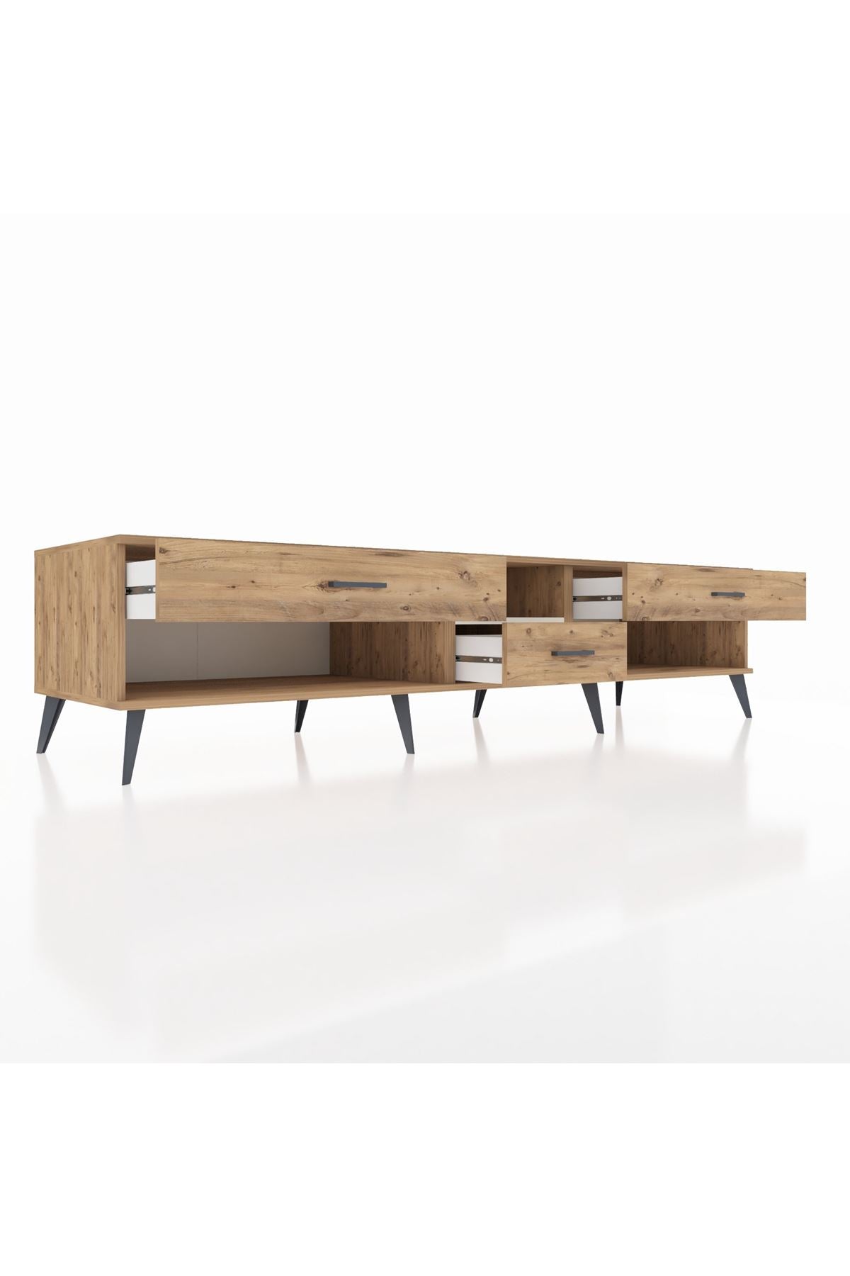 🦾 Metal ayaklar, Kronos TV Ünitesi'ne modern ve şık bir görünüm kazandırır. Metal kulplar, çekmecelerin kolayca açılmasını sağlarken, ürünün genel tasarımına uyum sağlar ve uzun yıllar sorunsuz bir kullanım sunar.