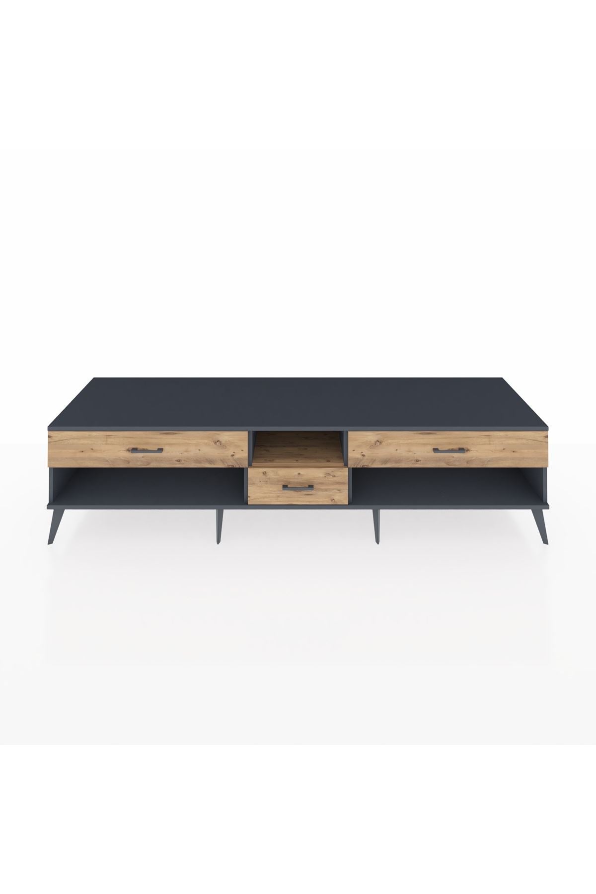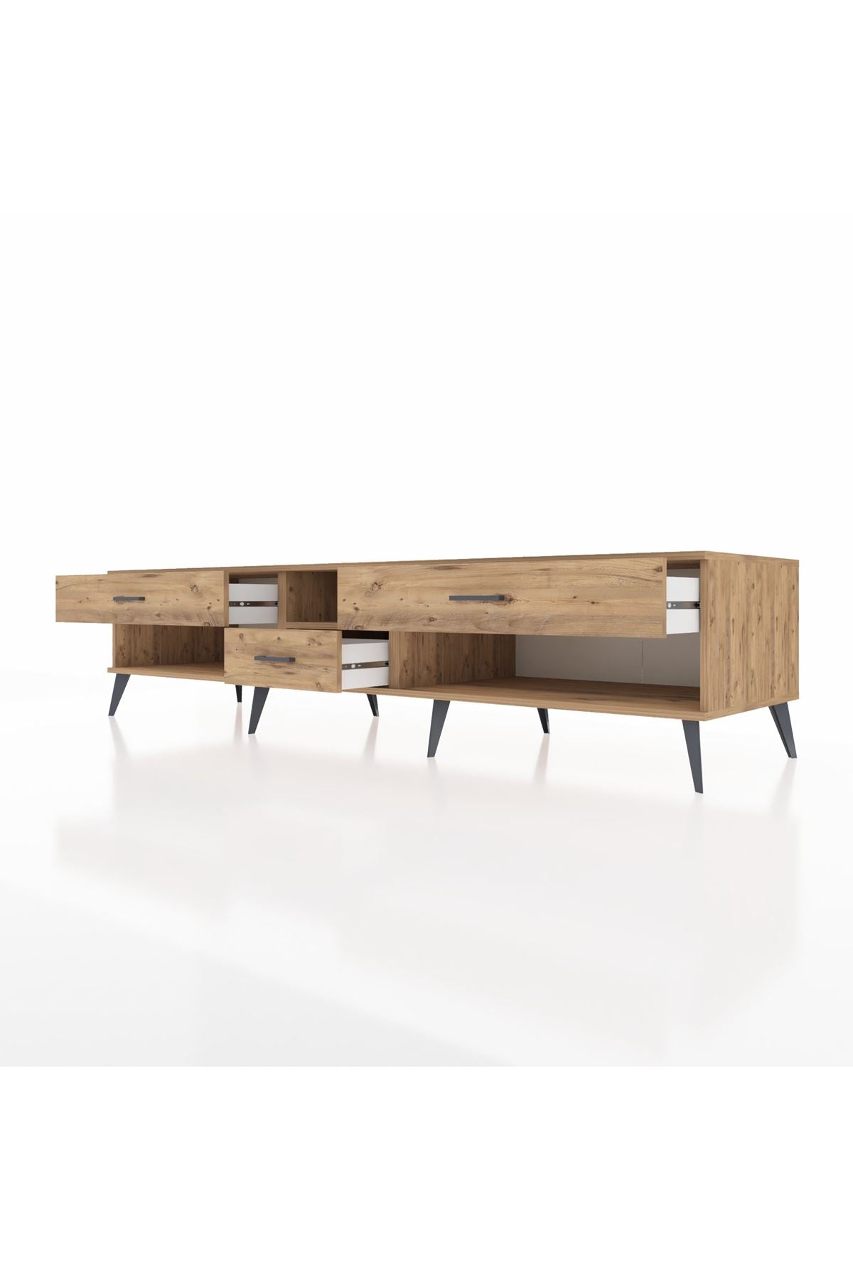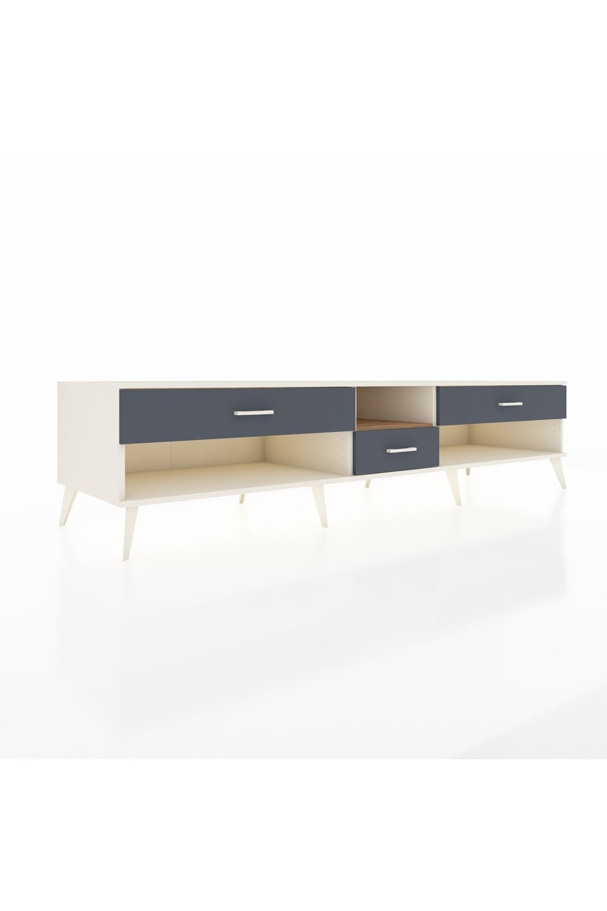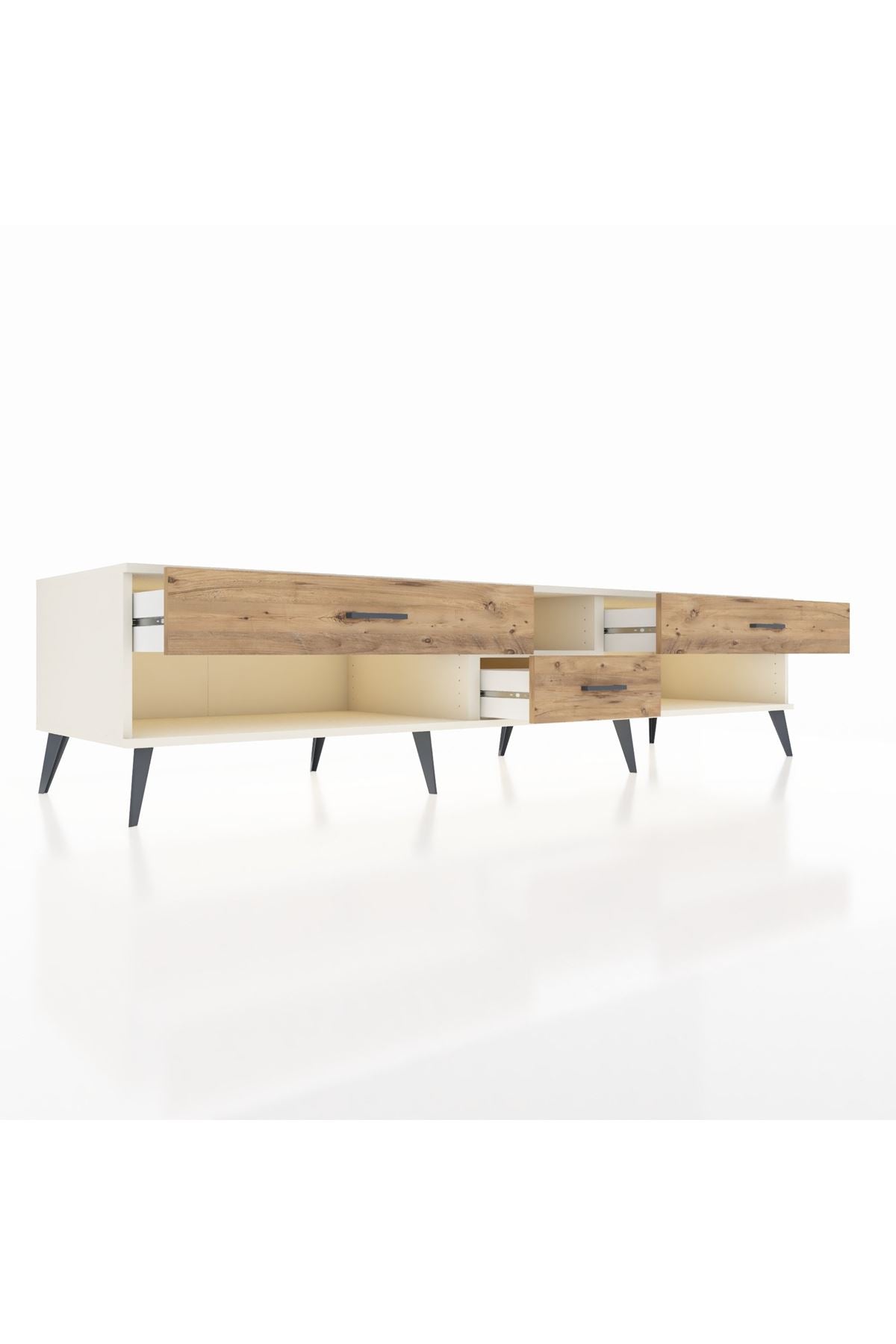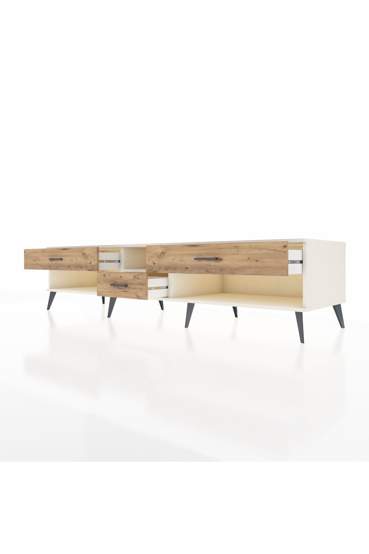 🦾 Metal ayaklar, Kronos TV Ünitesi'ne modern ve şık bir görünüm kazandırır. Metal kulplar, çekmecelerin kolayca açılmasını sağlarken, ürünün genel tasarımına uyum sağlar ve uzun yıllar sorunsuz bir kullanım sunar.