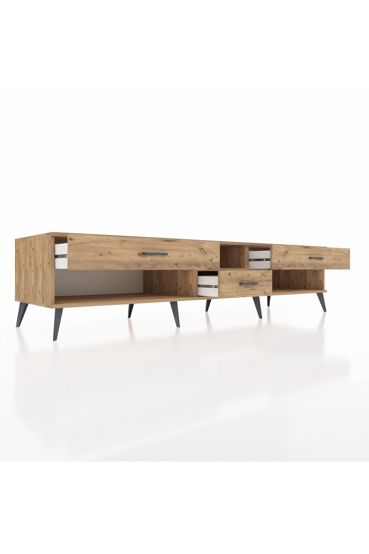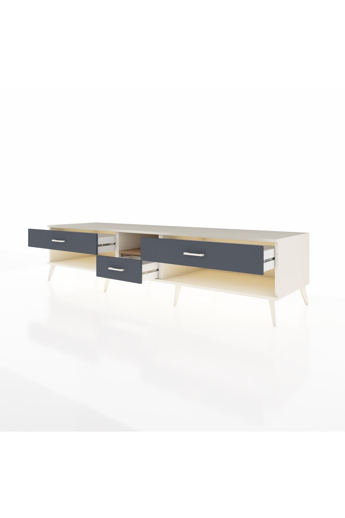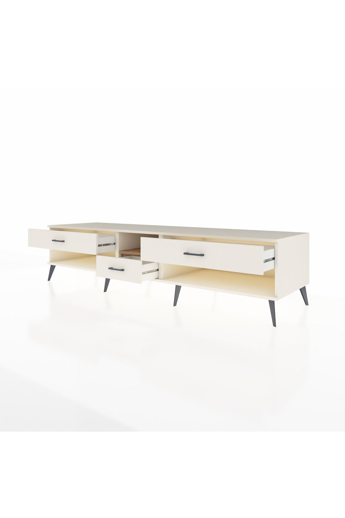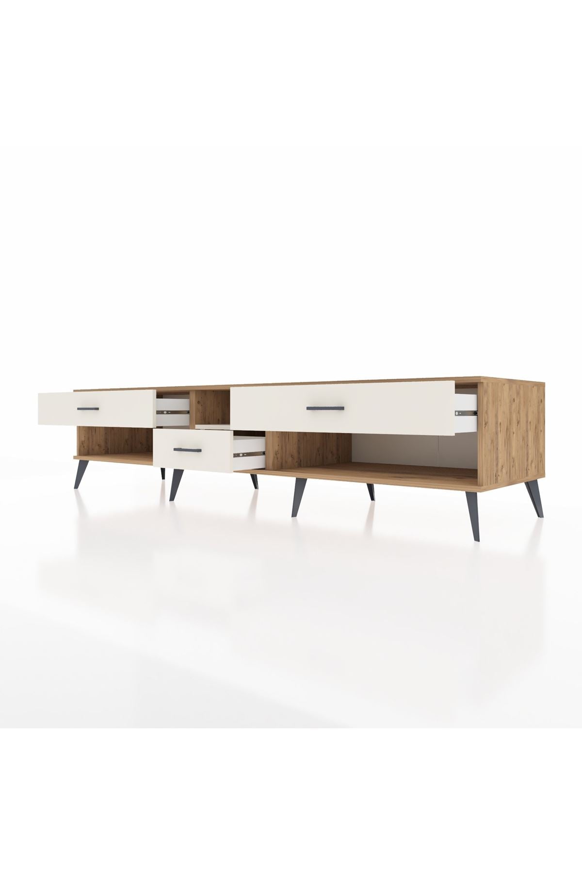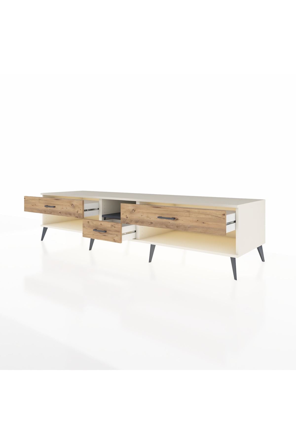 🦾 Metal ayaklar, Kronos TV Ünitesi'ne modern ve şık bir görünüm kazandırır. Metal kulplar, çekmecelerin kolayca açılmasını sağlarken, ürünün genel tasarımına uyum sağlar ve uzun yıllar sorunsuz bir kullanım sunar.
