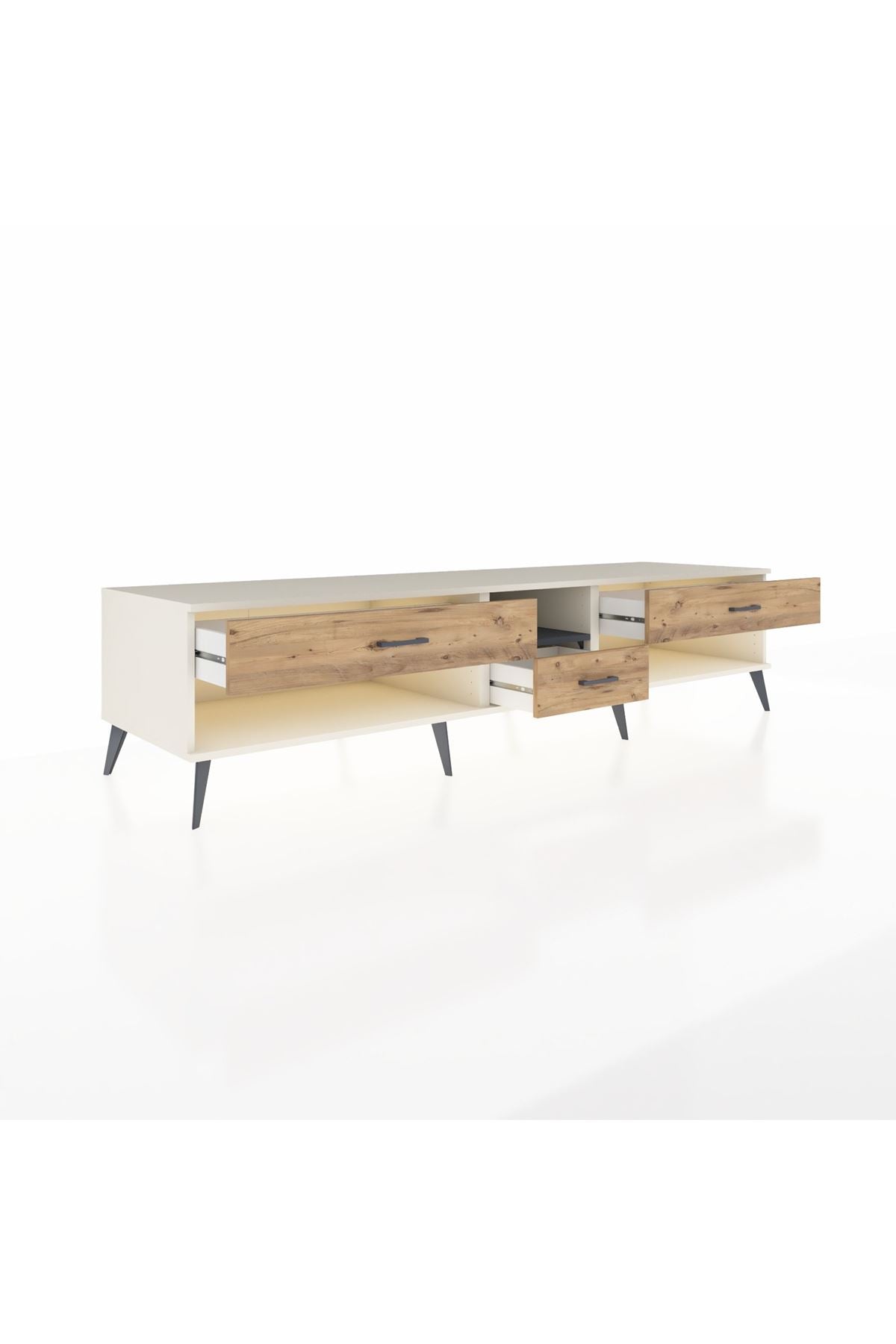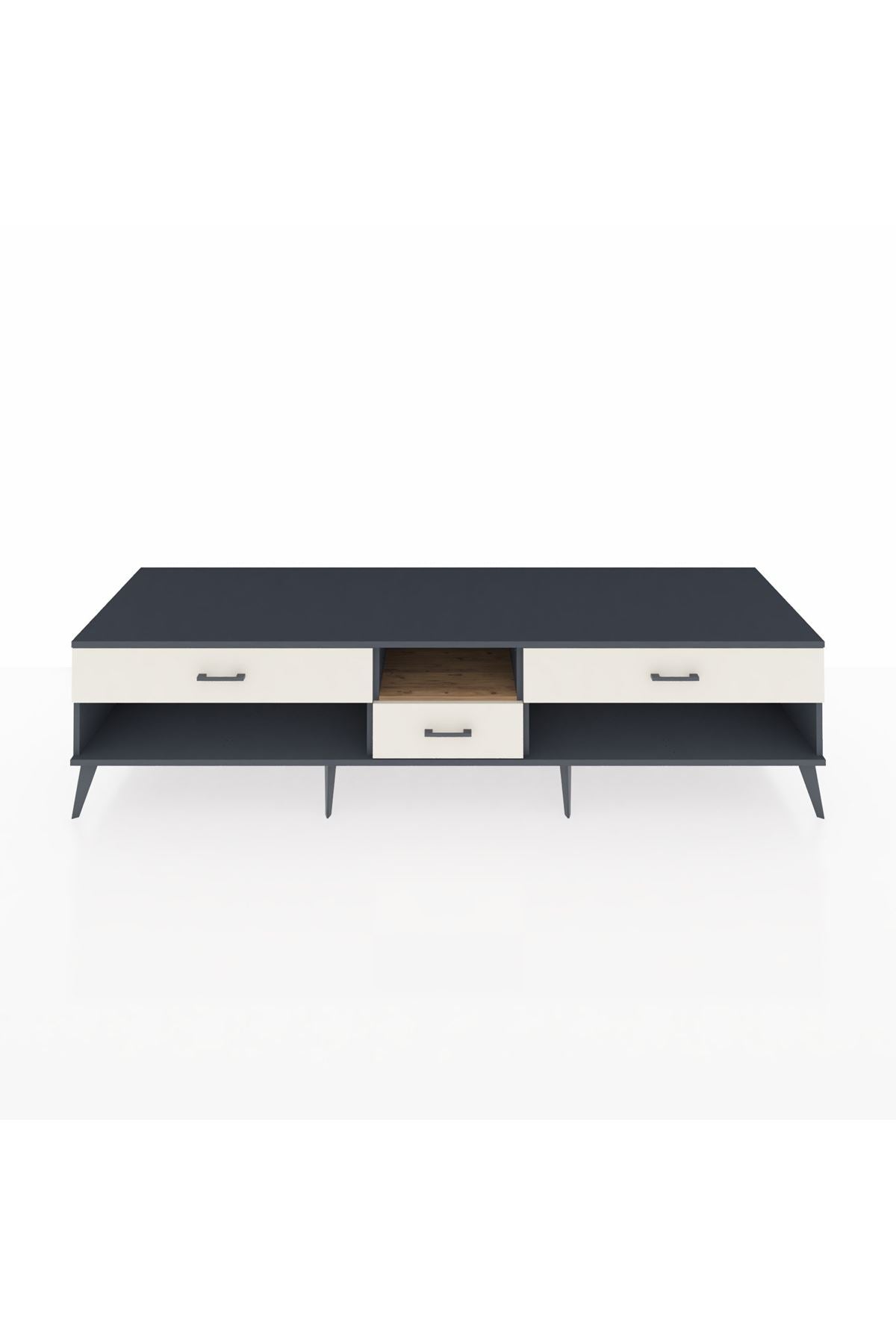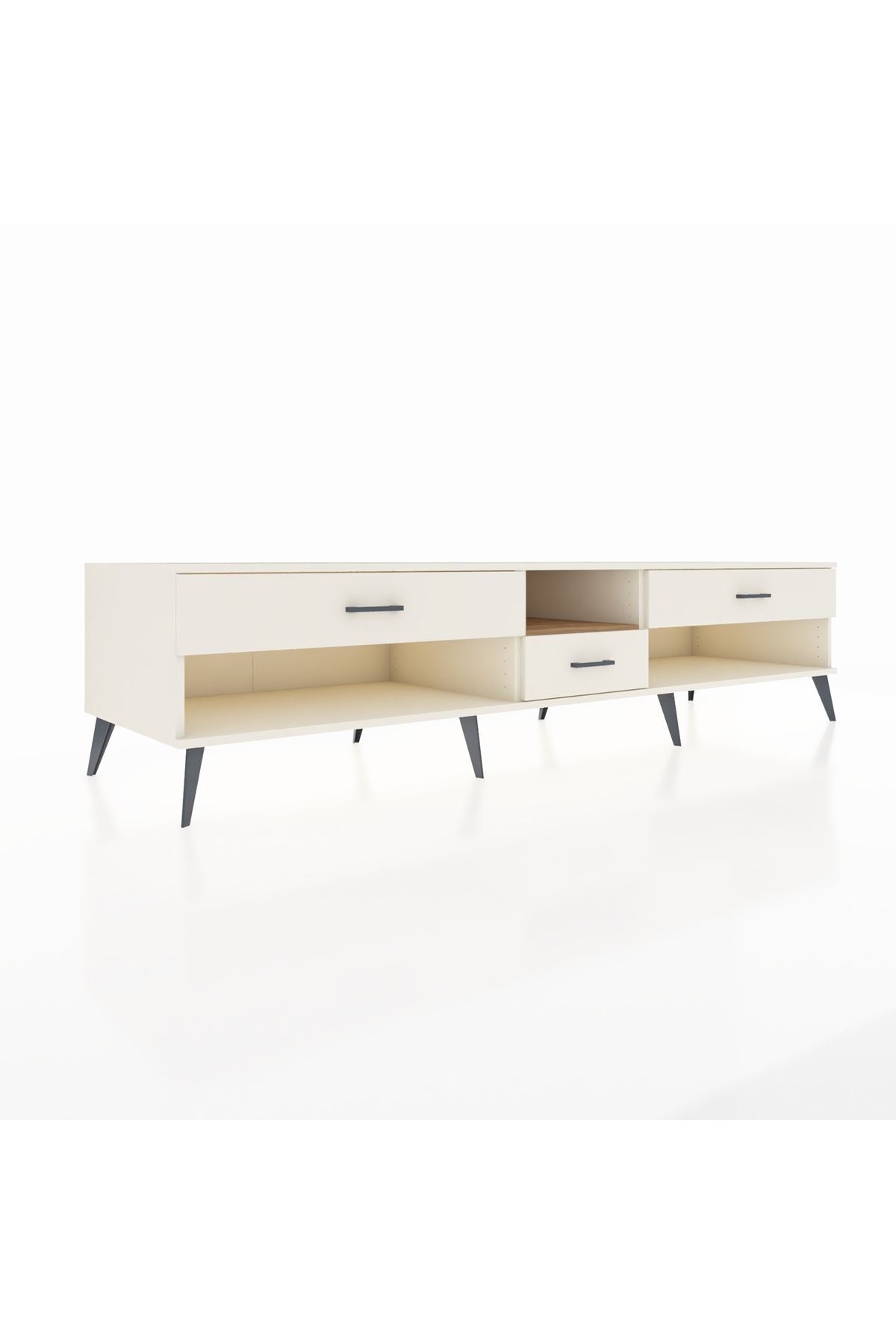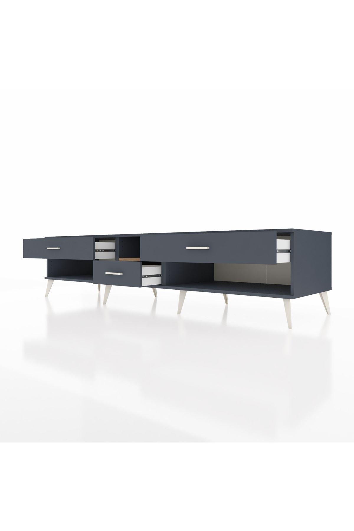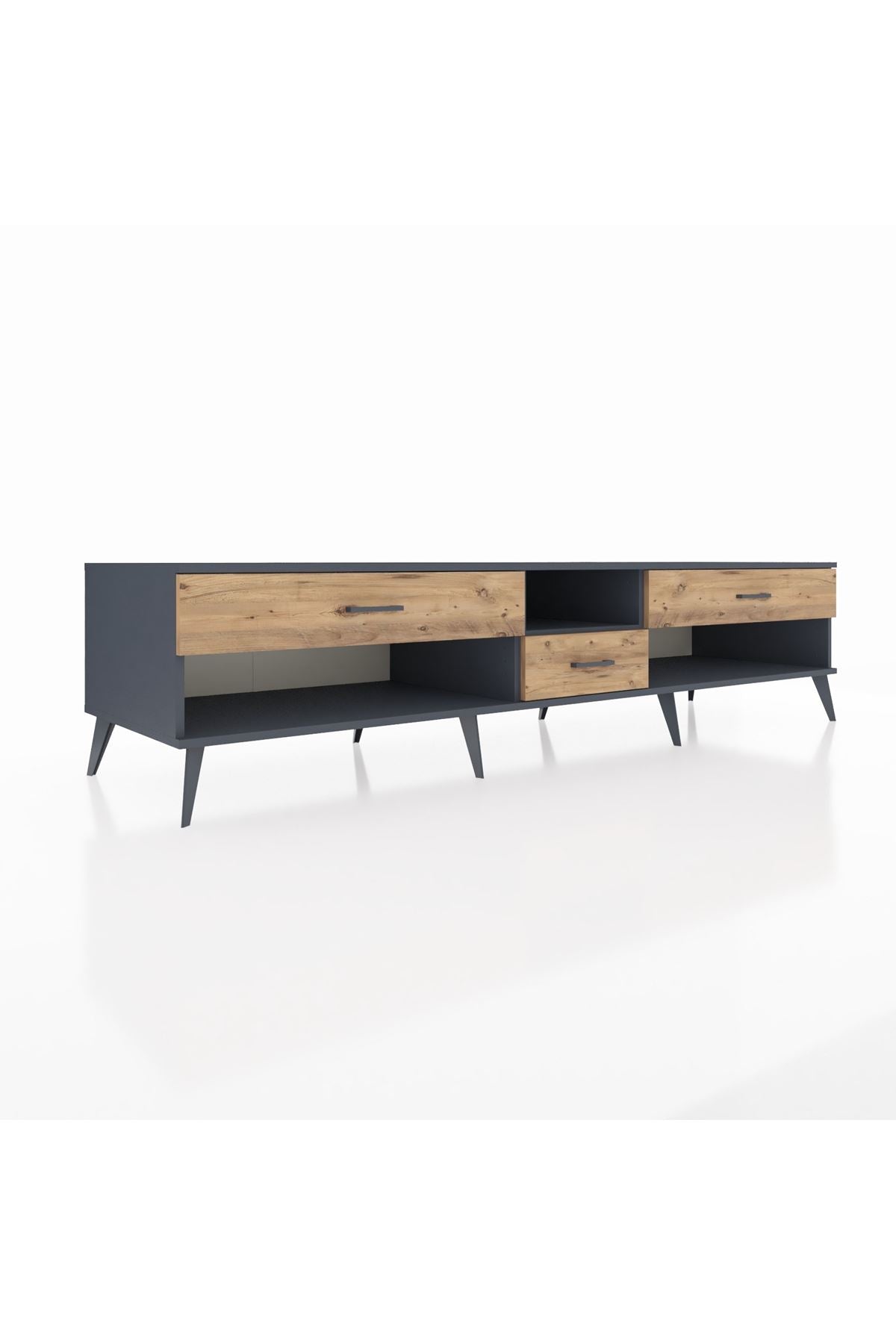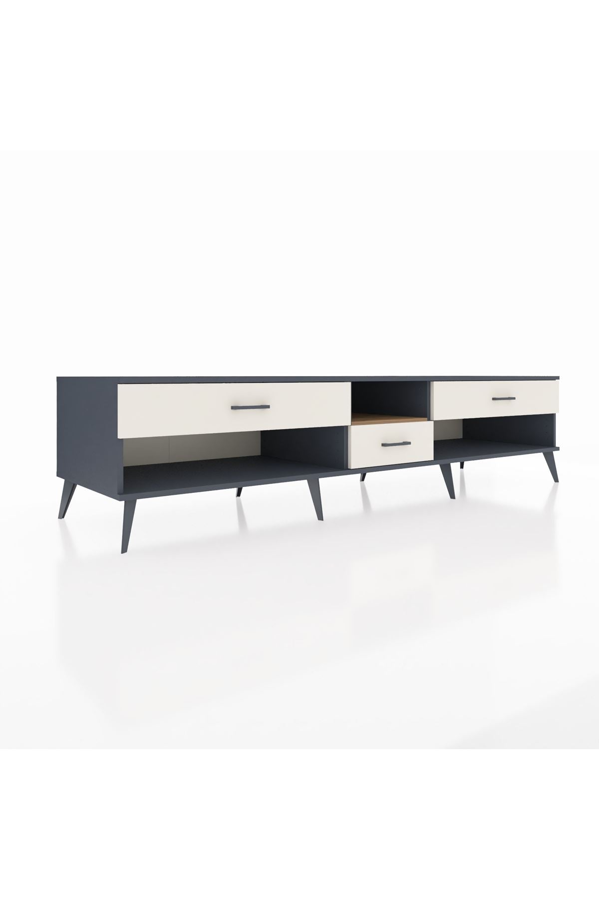 🦾 Metal ayaklar, Kronos TV Ünitesi'ne modern ve şık bir görünüm kazandırır. Metal kulplar, çekmecelerin kolayca açılmasını sağlarken, ürünün genel tasarımına uyum sağlar ve uzun yıllar sorunsuz bir kullanım sunar.