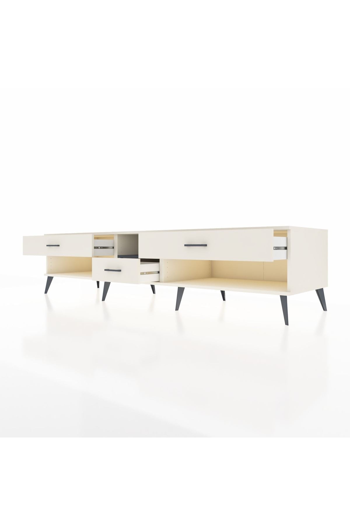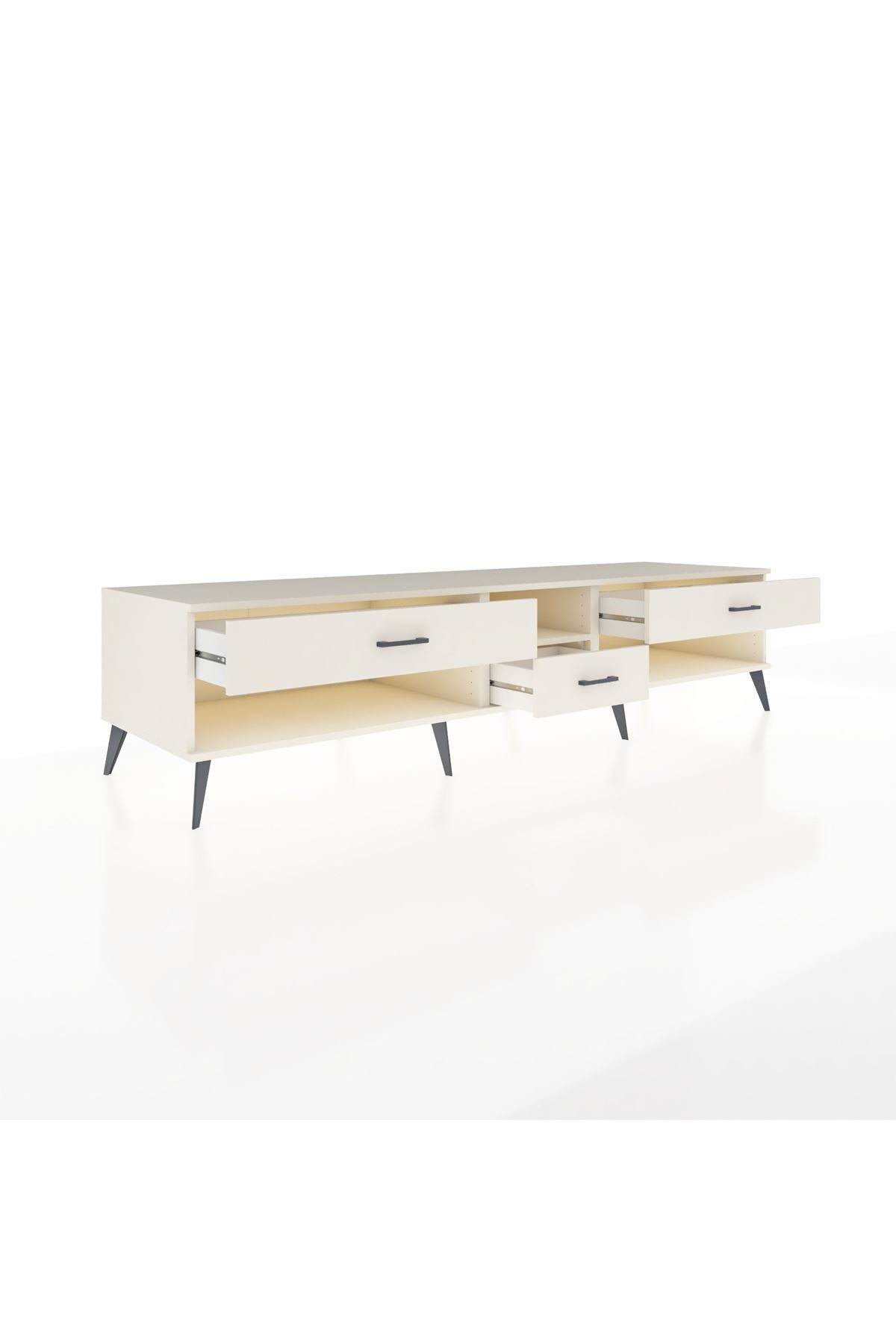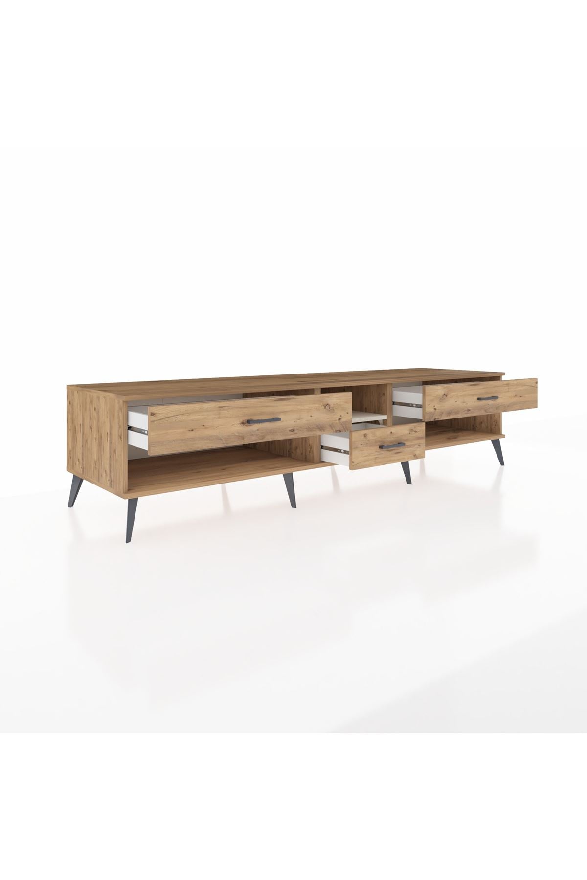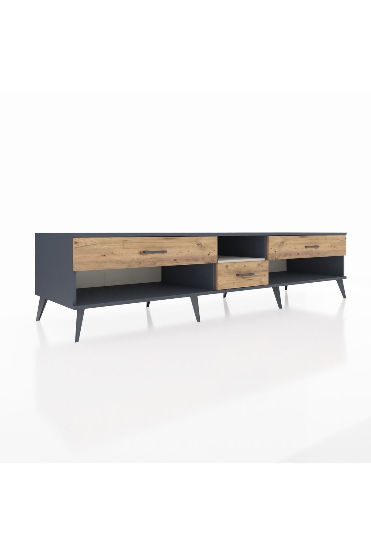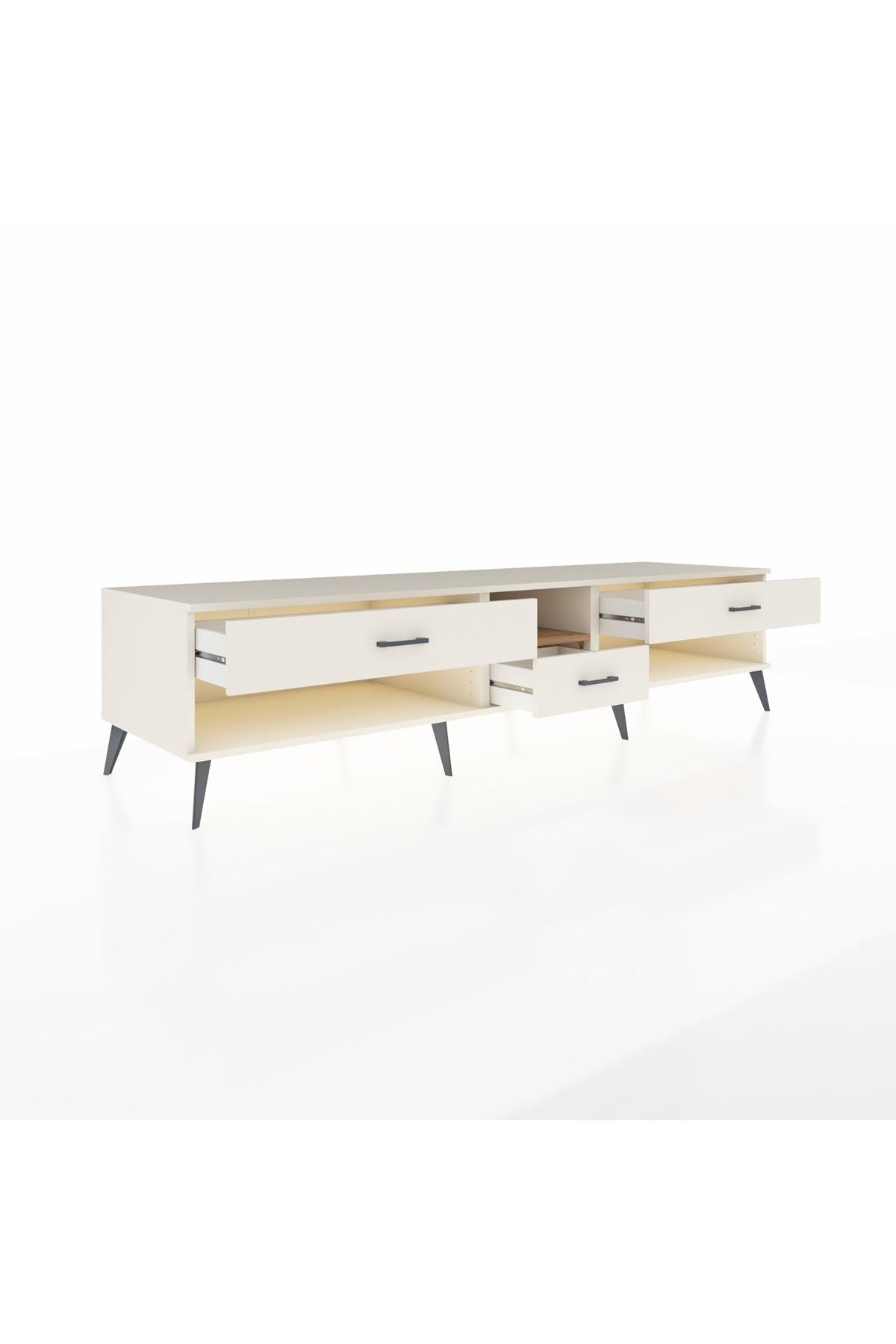 🦾 Metal ayaklar, Kronos TV Ünitesi'ne modern ve şık bir görünüm kazandırır. Metal kulplar, çekmecelerin kolayca açılmasını sağlarken, ürünün genel tasarımına uyum sağlar ve uzun yıllar sorunsuz bir kullanım sunar.