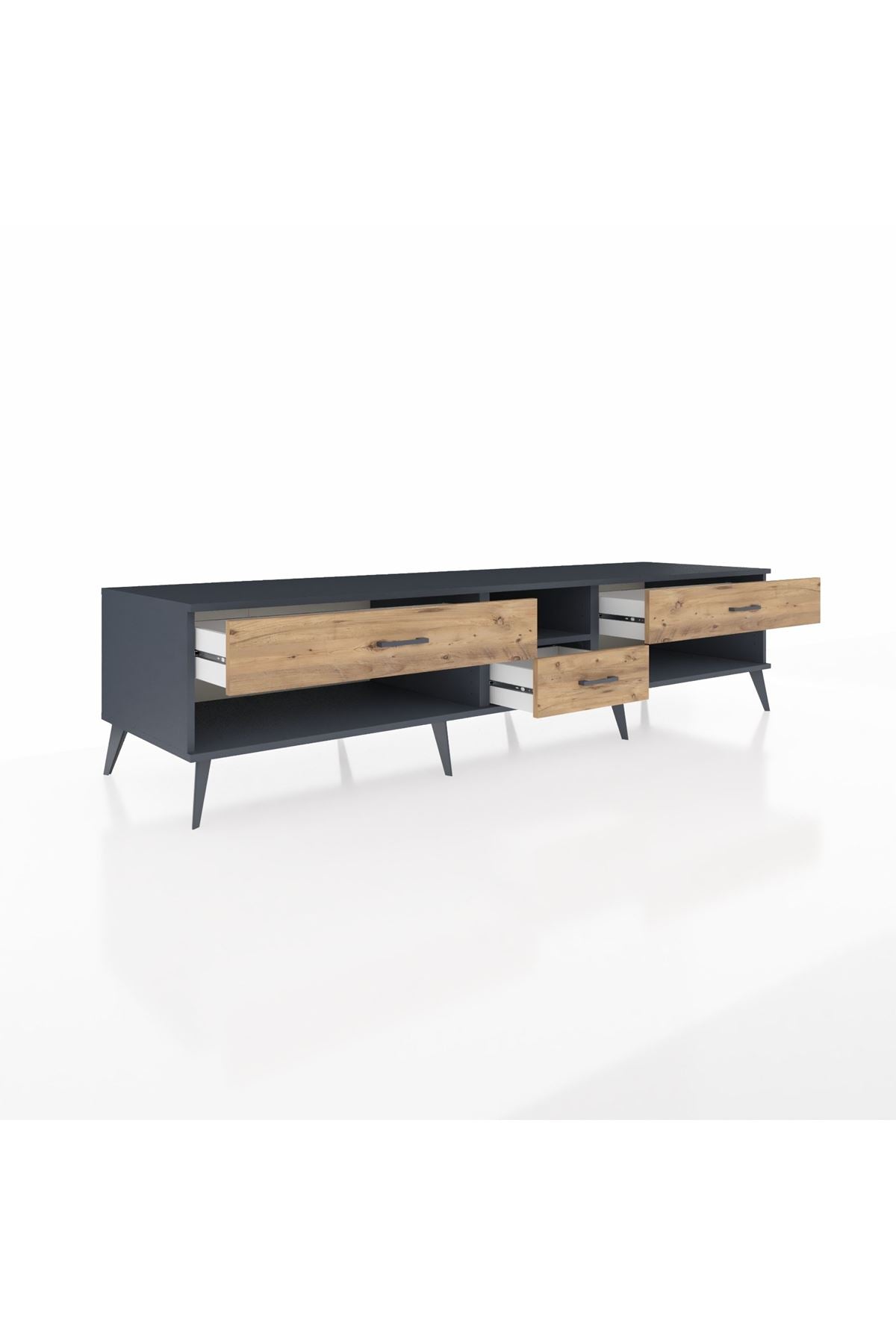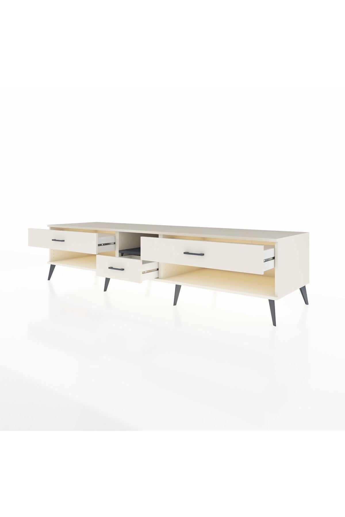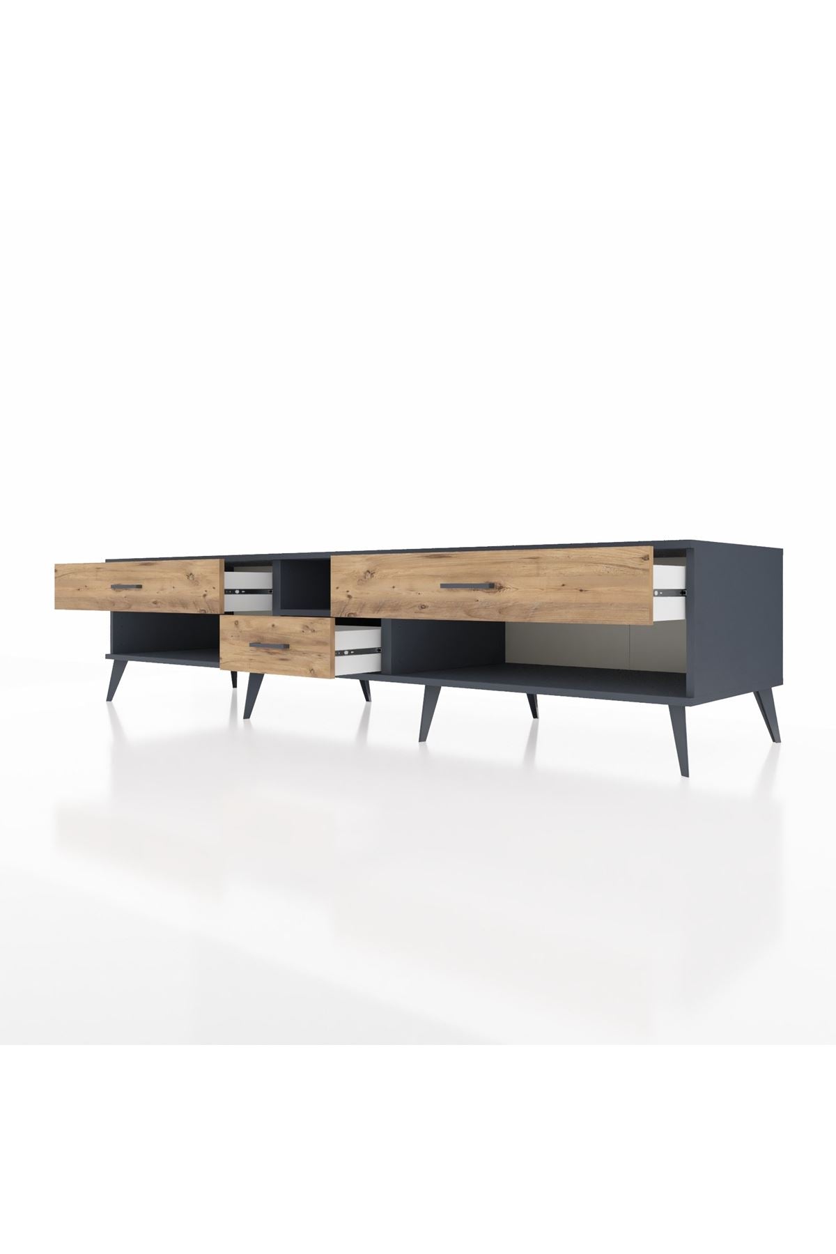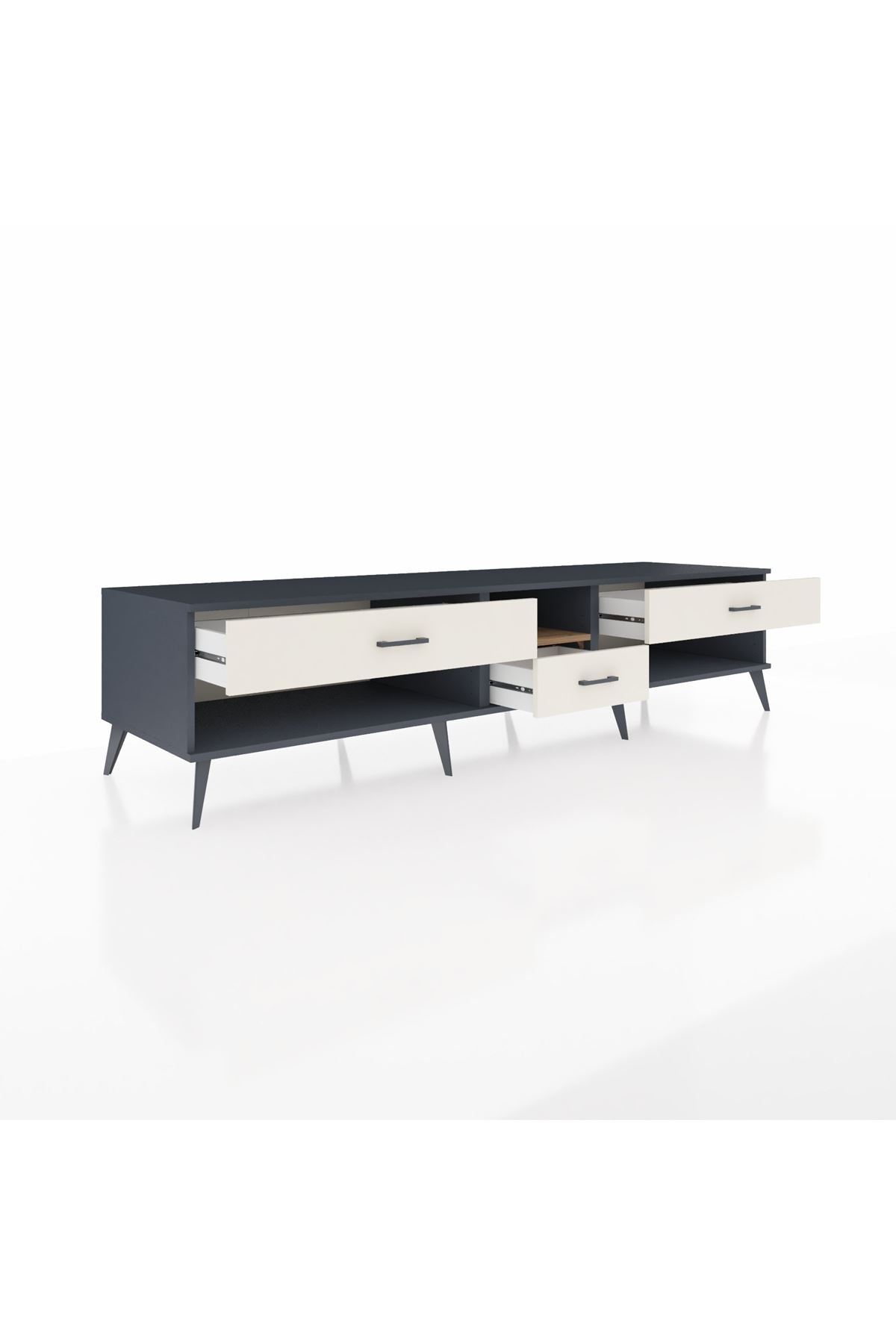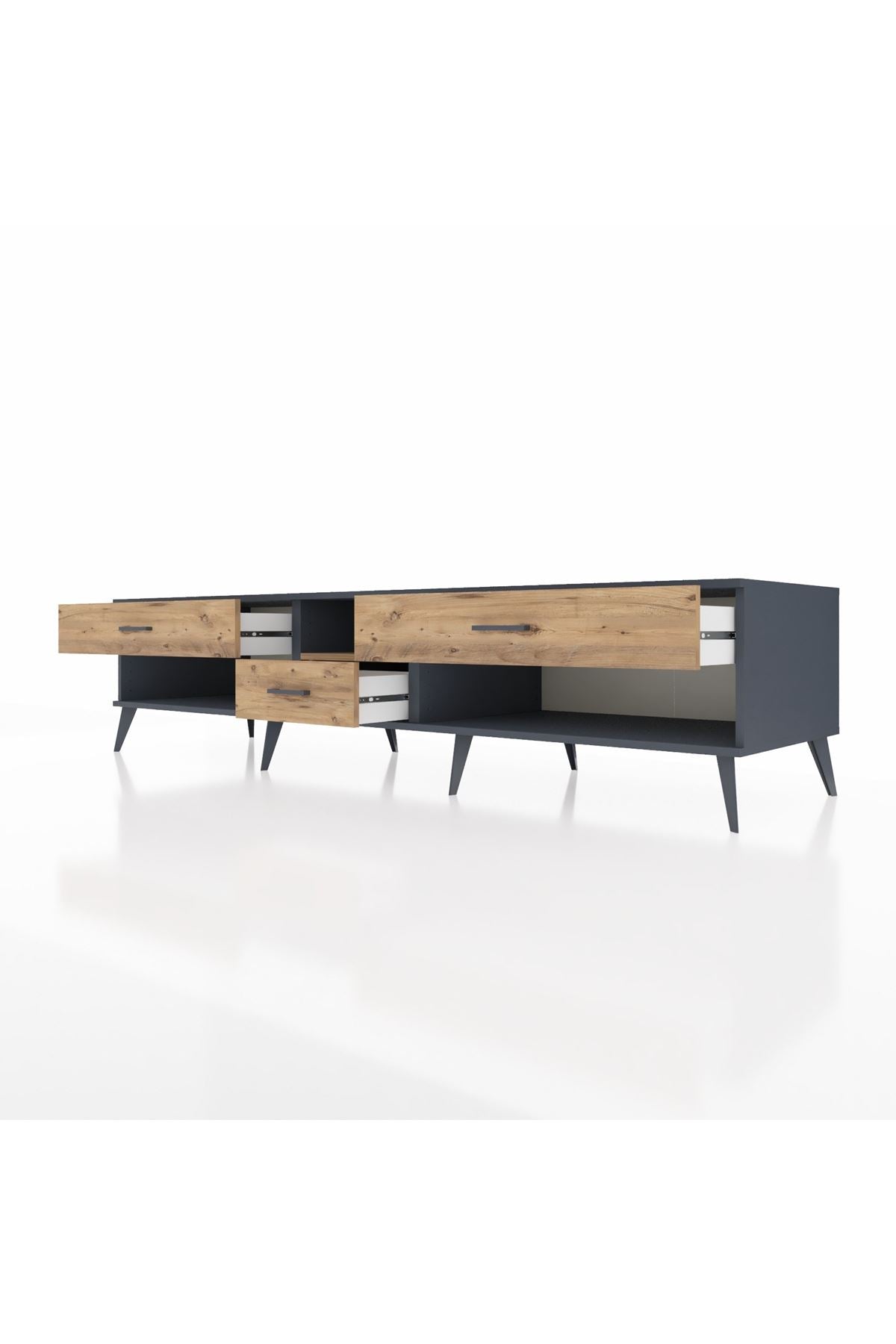 🦾 Metal ayaklar, Kronos TV Ünitesi'ne modern ve şık bir görünüm kazandırır. Metal kulplar, çekmecelerin kolayca açılmasını sağlarken, ürünün genel tasarımına uyum sağlar ve uzun yıllar sorunsuz bir kullanım sunar.
