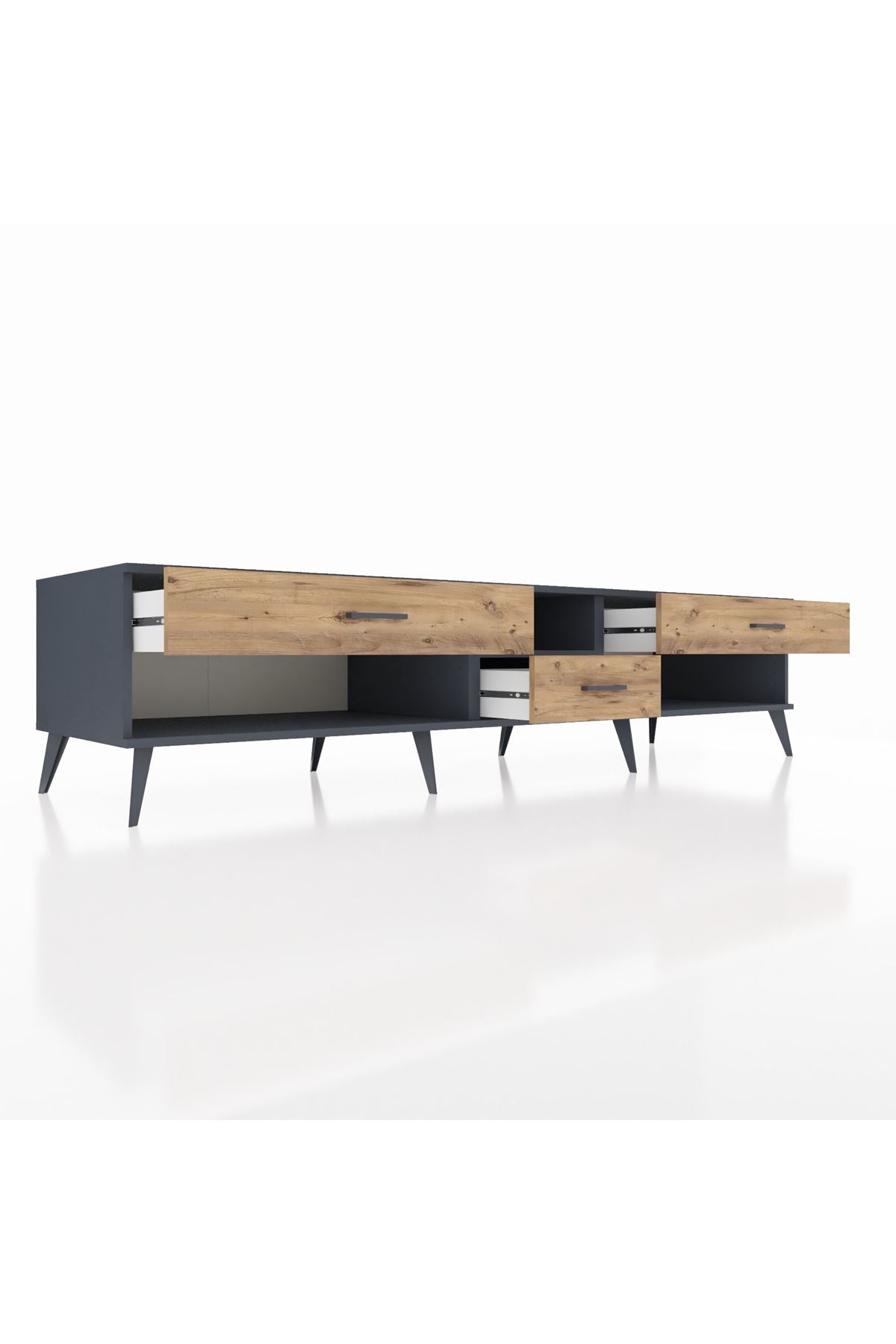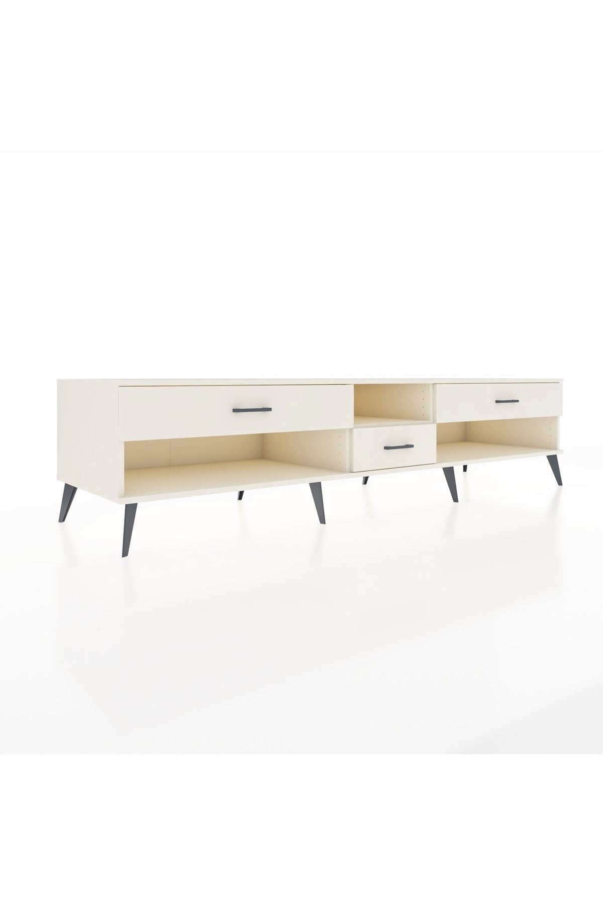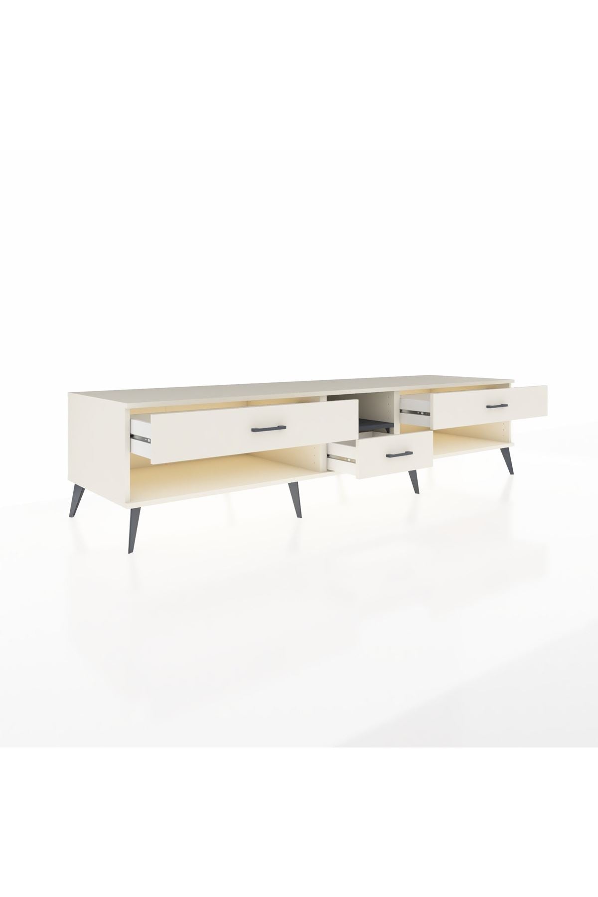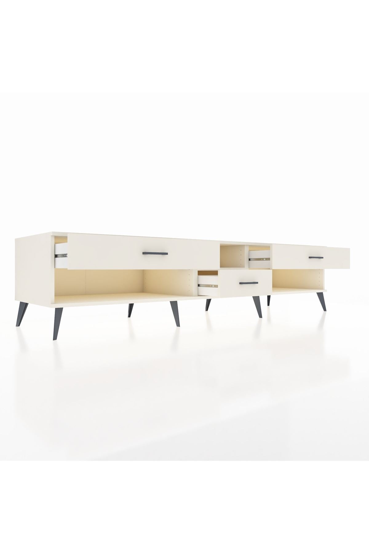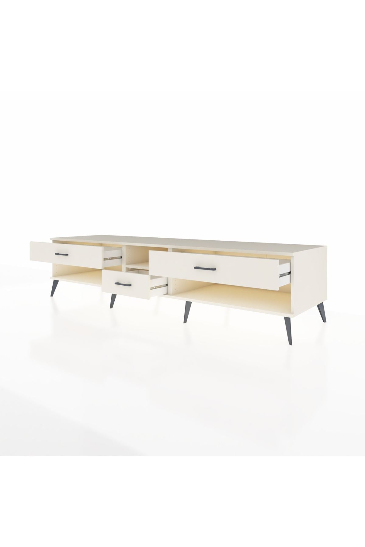 🦾 Metal ayaklar, Kronos TV Ünitesi'ne modern ve şık bir görünüm kazandırır. Metal kulplar, çekmecelerin kolayca açılmasını sağlarken, ürünün genel tasarımına uyum sağlar ve uzun yıllar sorunsuz bir kullanım sunar.