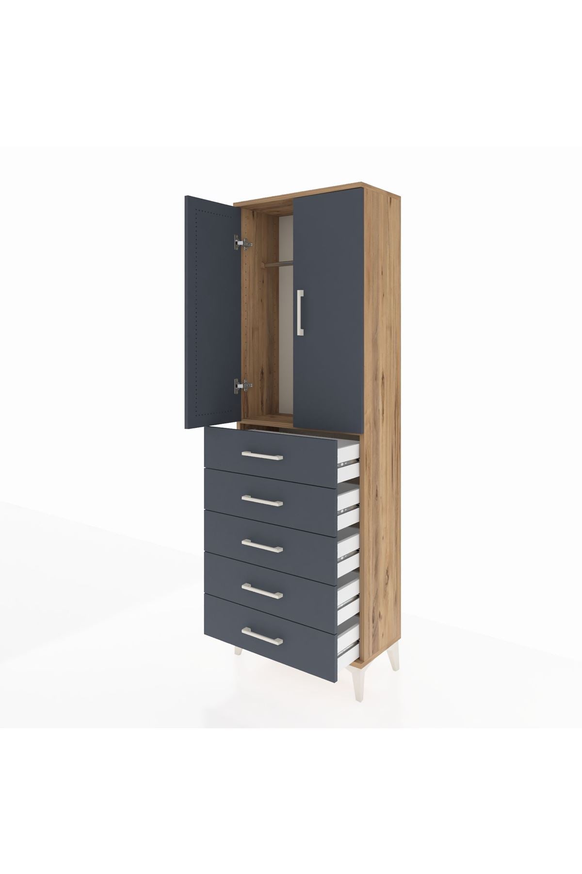 Arges Dolap Tek Raflı 5 Çekmeceli Tek Askılı 60x30x182 Çam-Antrasit