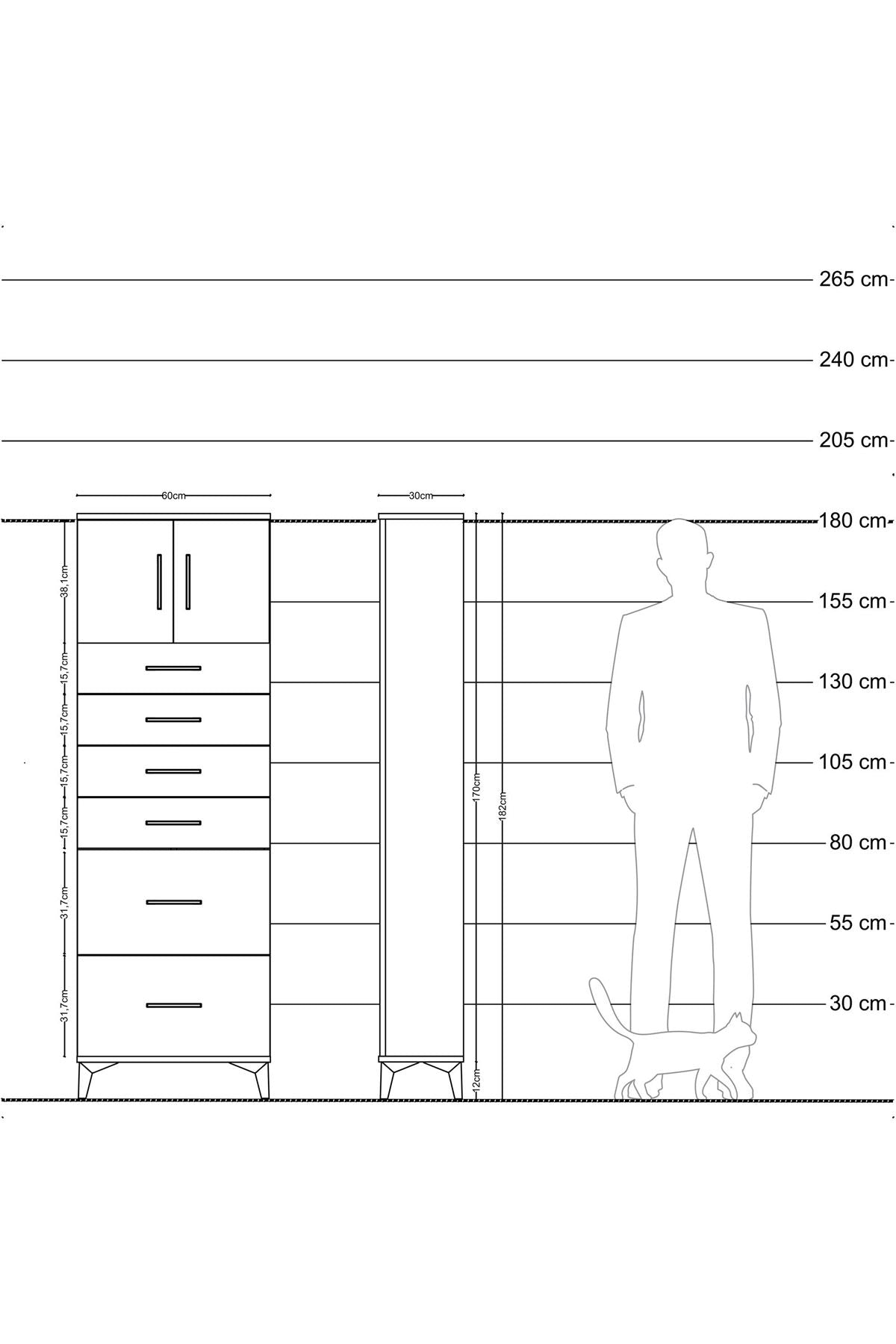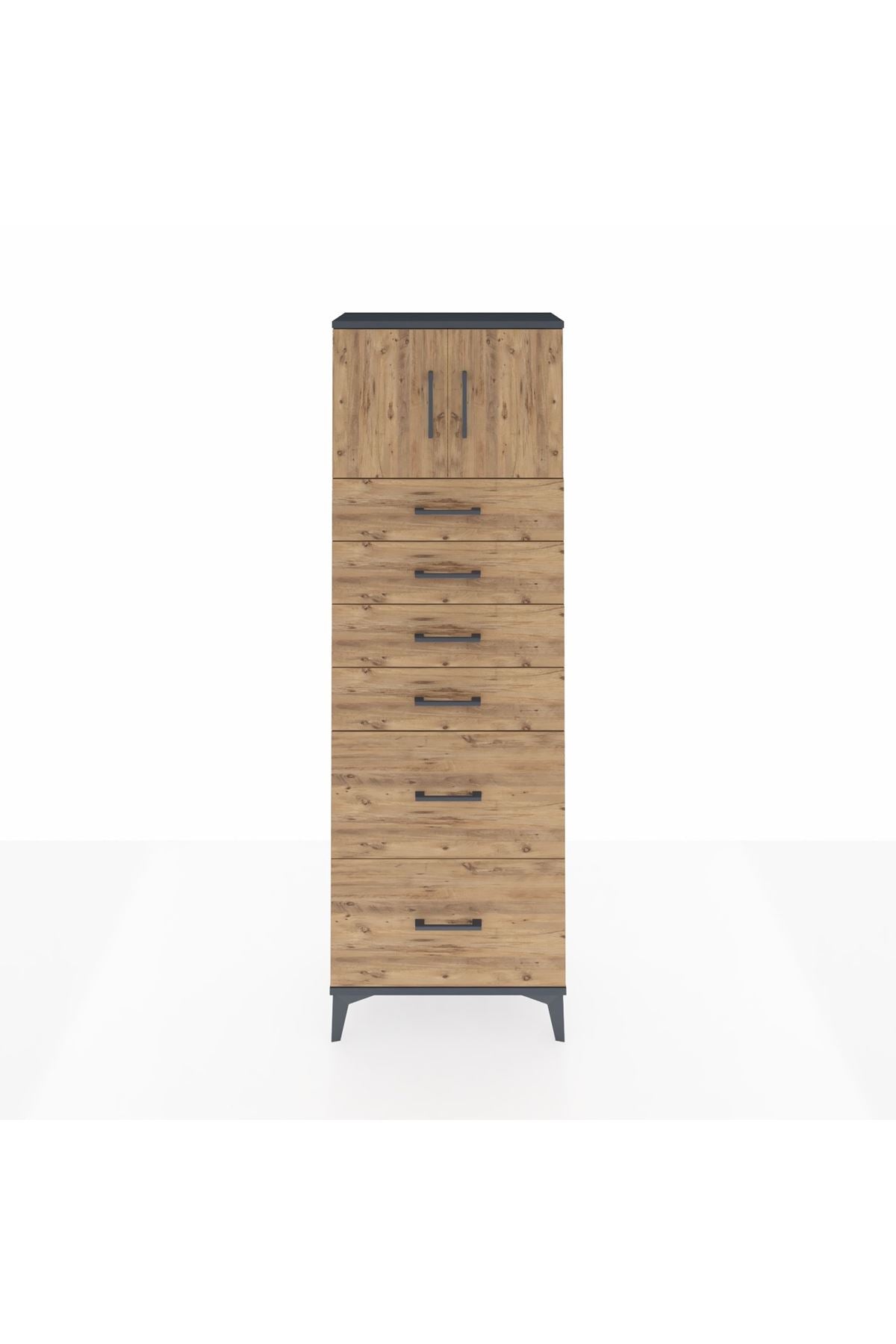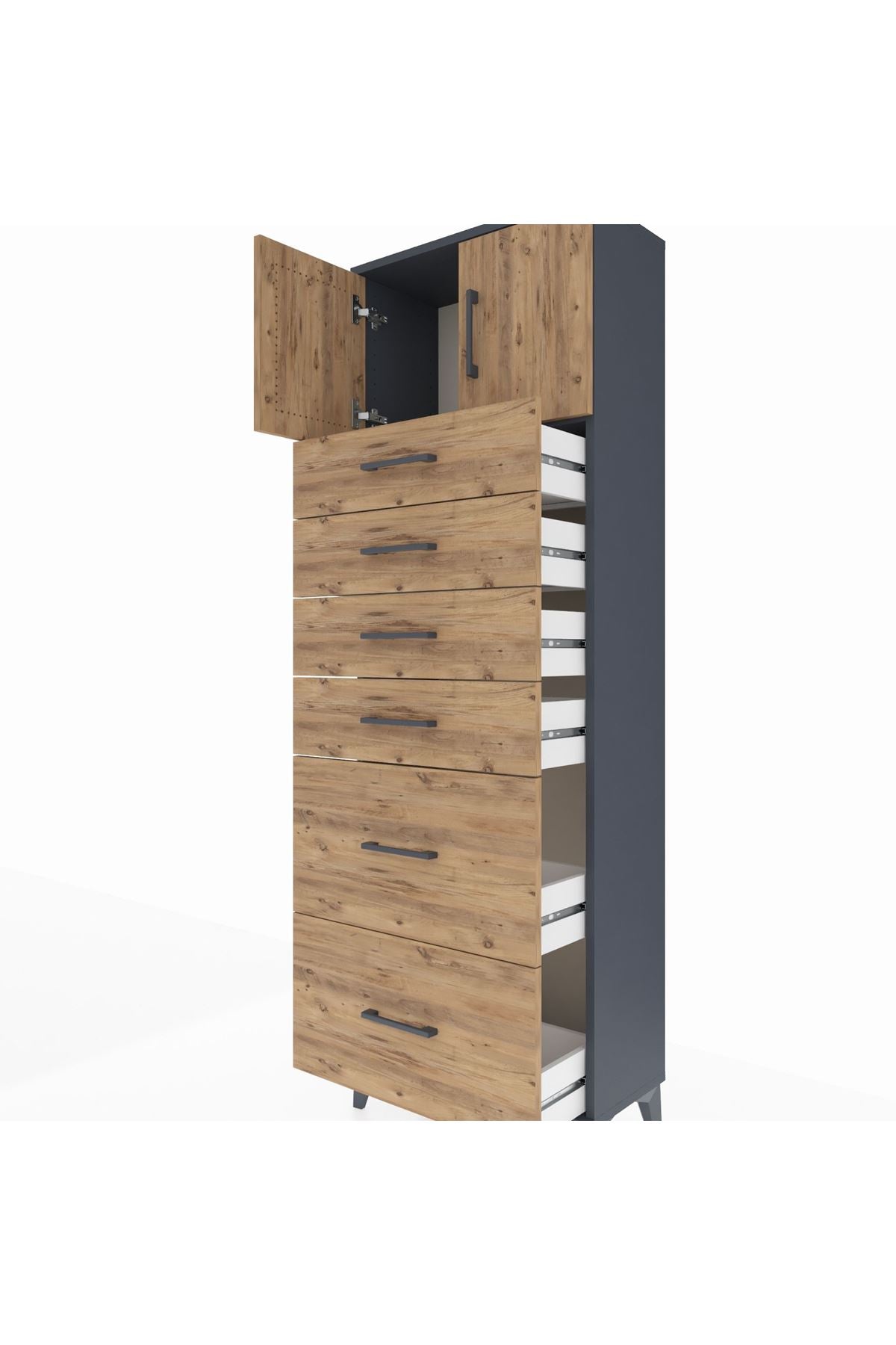 Arges Dolap Tek Raflı 6 Çekmeceli 2 Kapaklı 60x30x182 Antrasit-Çam