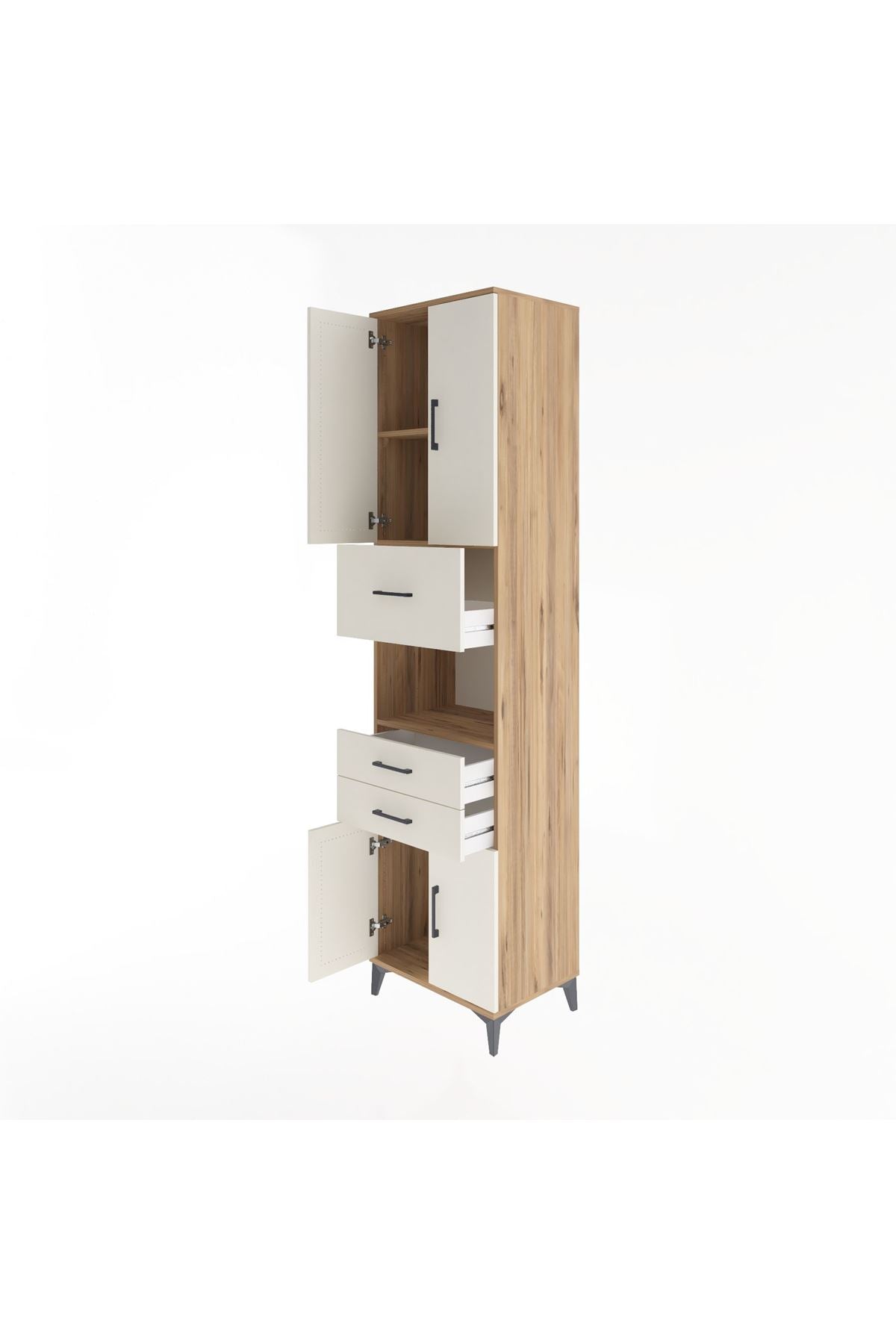 🔧 Dolabın metal ayakları ve kulpları, şıklığı ve dayanıklılığı bir arada sunarken, Kastamonu Entegre'nin 1. sınıf suntalam gövde ve kapakları kalitenin yanı sıra estetik bir görünüm sağlıyor. 1.2 mm kalınlığındaki kenar bandı, uzun ömürlü bir kullanım vaat ediyor.