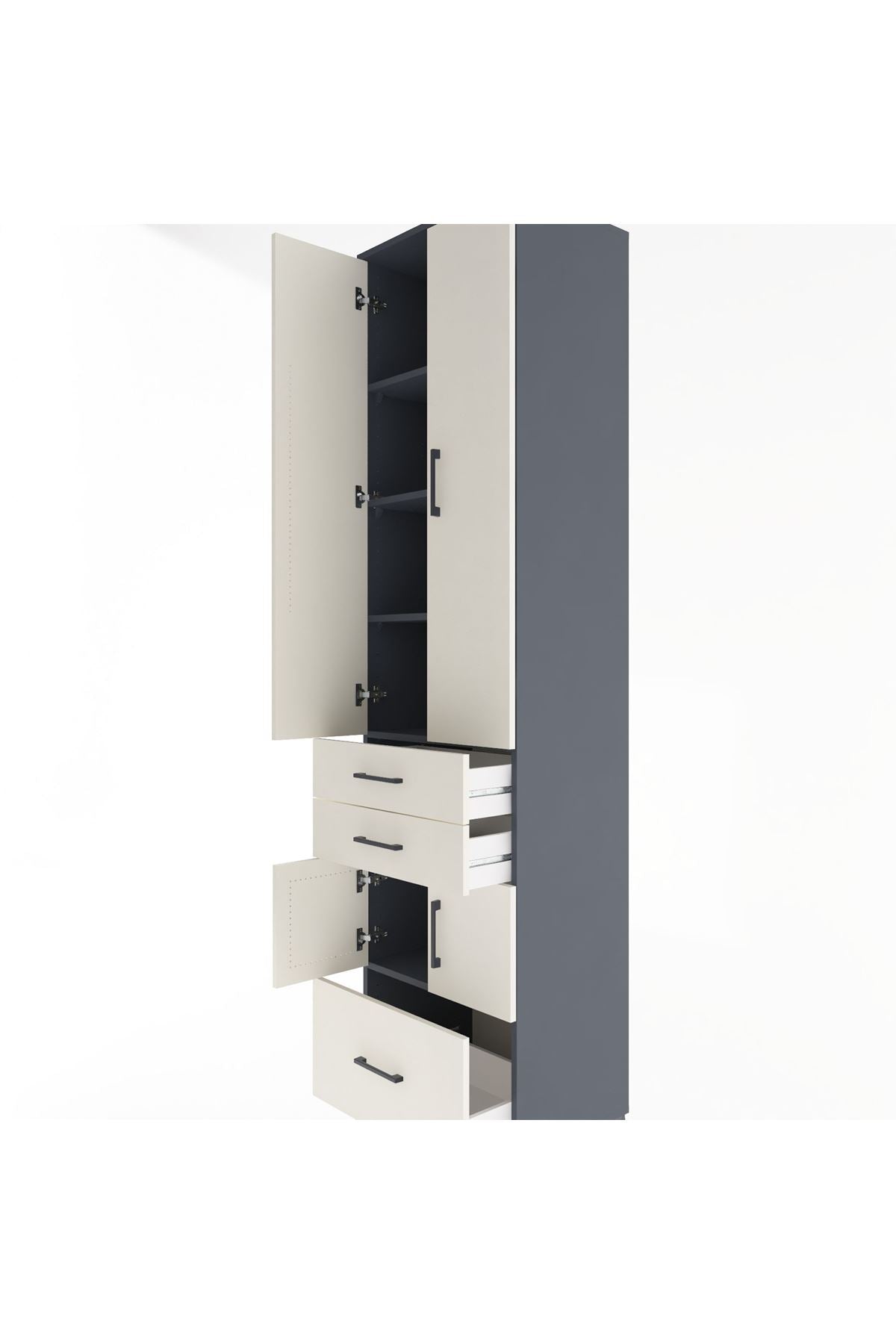 🖤 Hyperion Dolap, modern yaşam alanlarına şıklık kazandırıyor! Antrasit ve ay taşı renk kombinasyonuyla tasarlanan bu dolap, 60x44x243 cm boyutlarıyla hem göze hitap ediyor hem de geniş depolama alanı sunuyor.