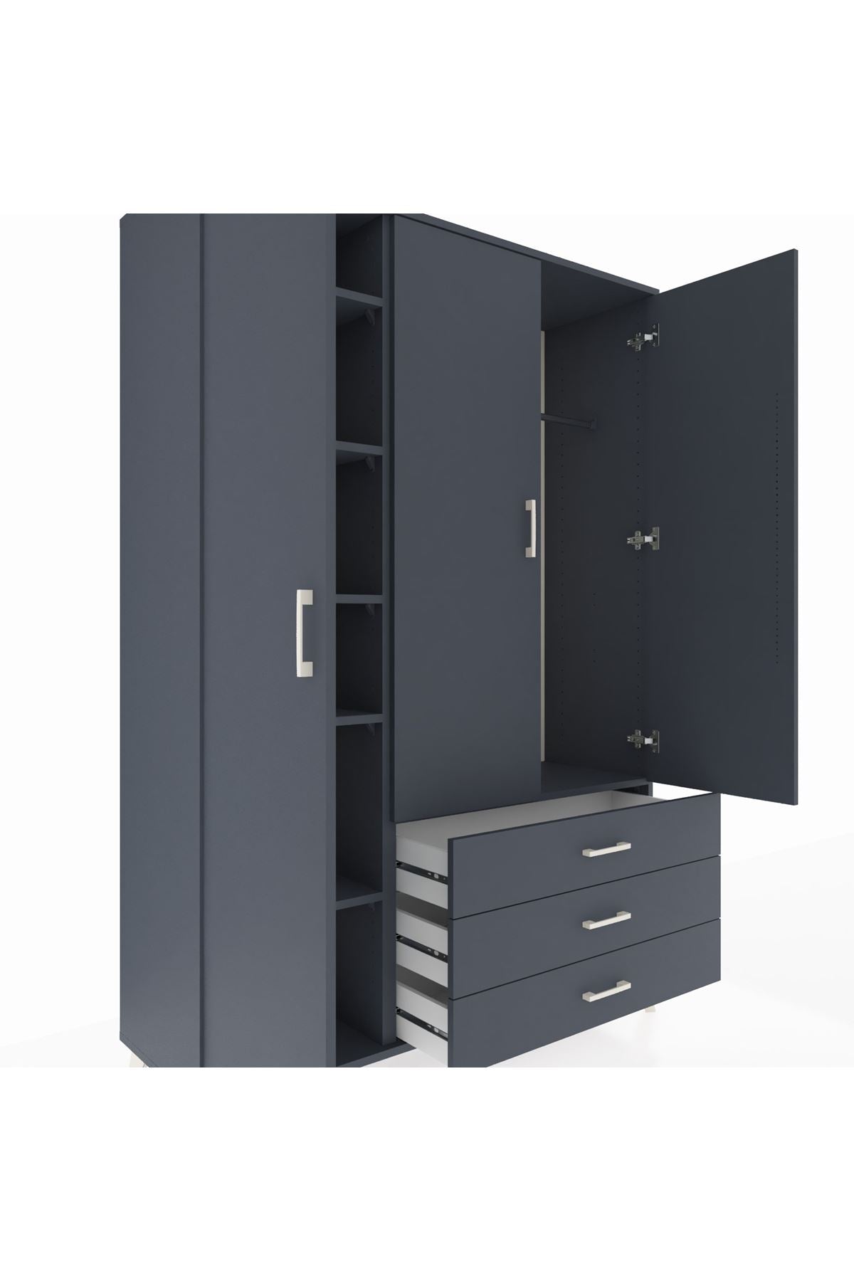 Geniş askılık ve ayarlanabilir raf kombinasyonu sayesinde sezonluk giysilerinizi, ayakkabı kutularınızı ve aksesuarlarınızı düzenler. Çekmeceler iç çamaşırı, çorap ve küçük aksesuarların ayrı tutulmasını sağlar; estetik antrasit rengi modern dolap düzeniyle uyum sunar.