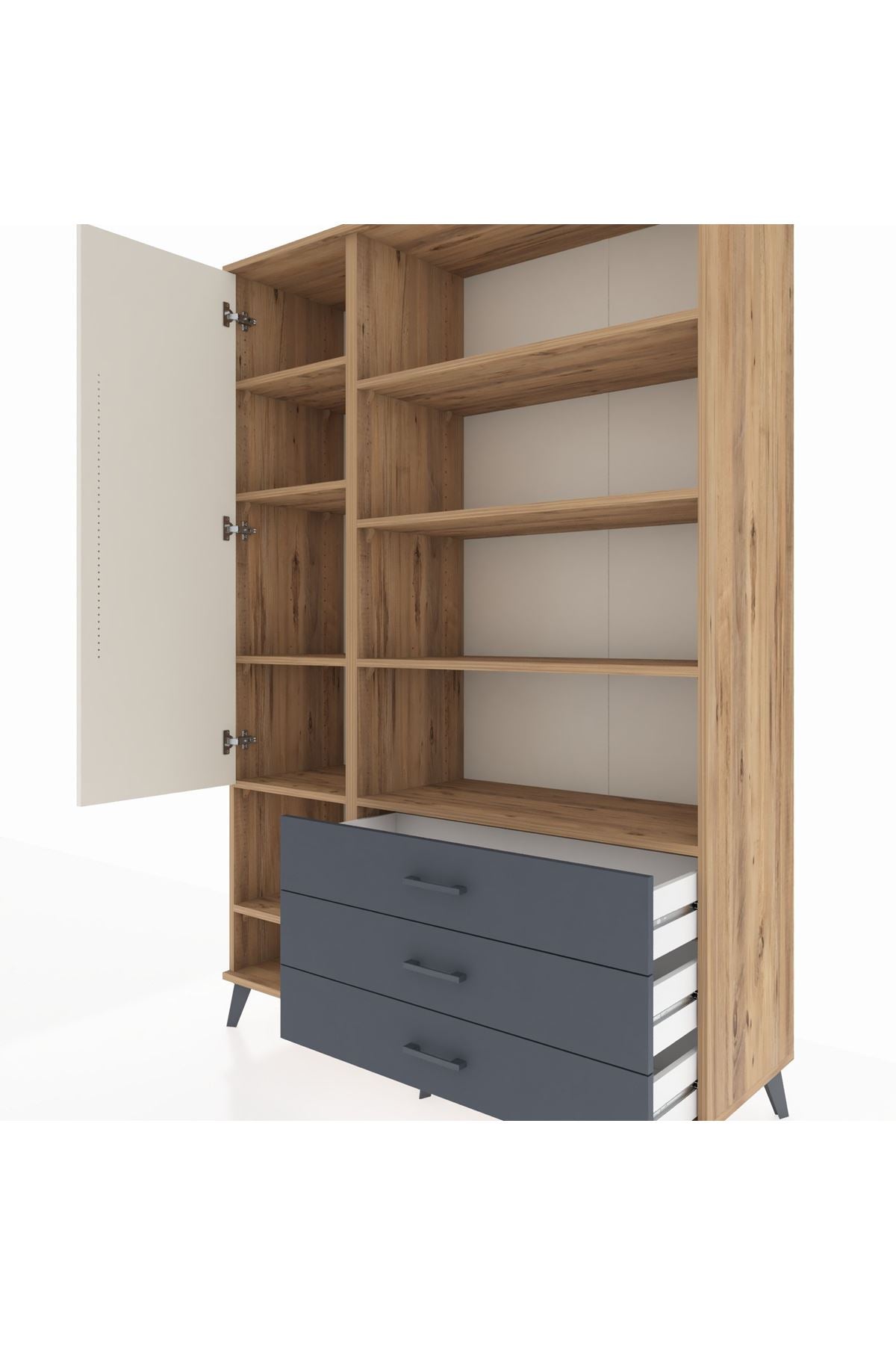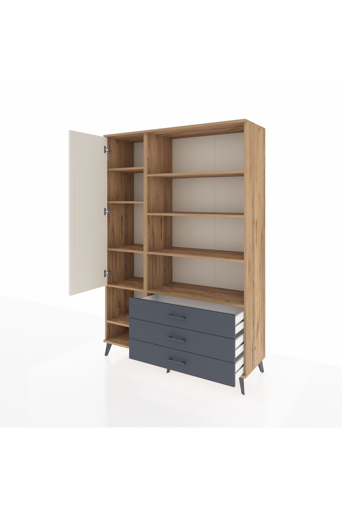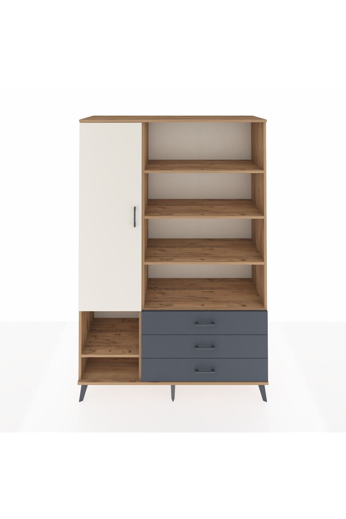 Geniş raf düzeni ve ayarlanabilir raf yapısı sayesinde giysi, kitap, belgeler, oyuncu ekipmanları veya dekoratif objeler kolayca sınıflandırılabilir. Kapaklı bölüm özel eşyalarınız veya görünmesini istemediğiniz eşyalar için ideal gizleme alanı sunar. Çekmeceler küçük eşyaların düzenlenmesini sağlar; iç bölmeler ve ilave düzenleyicilerle kullanım kişiselleştirilebilir. Metal ayaklar zemine zarar vermeden sabitlik sağlarken alt kısmın temiz tutulmasını kolaylaştırır. Modern renk seçenekleri dekorasyonla uyum sağlayarak mekânın genel estetiğini güçlendirir.