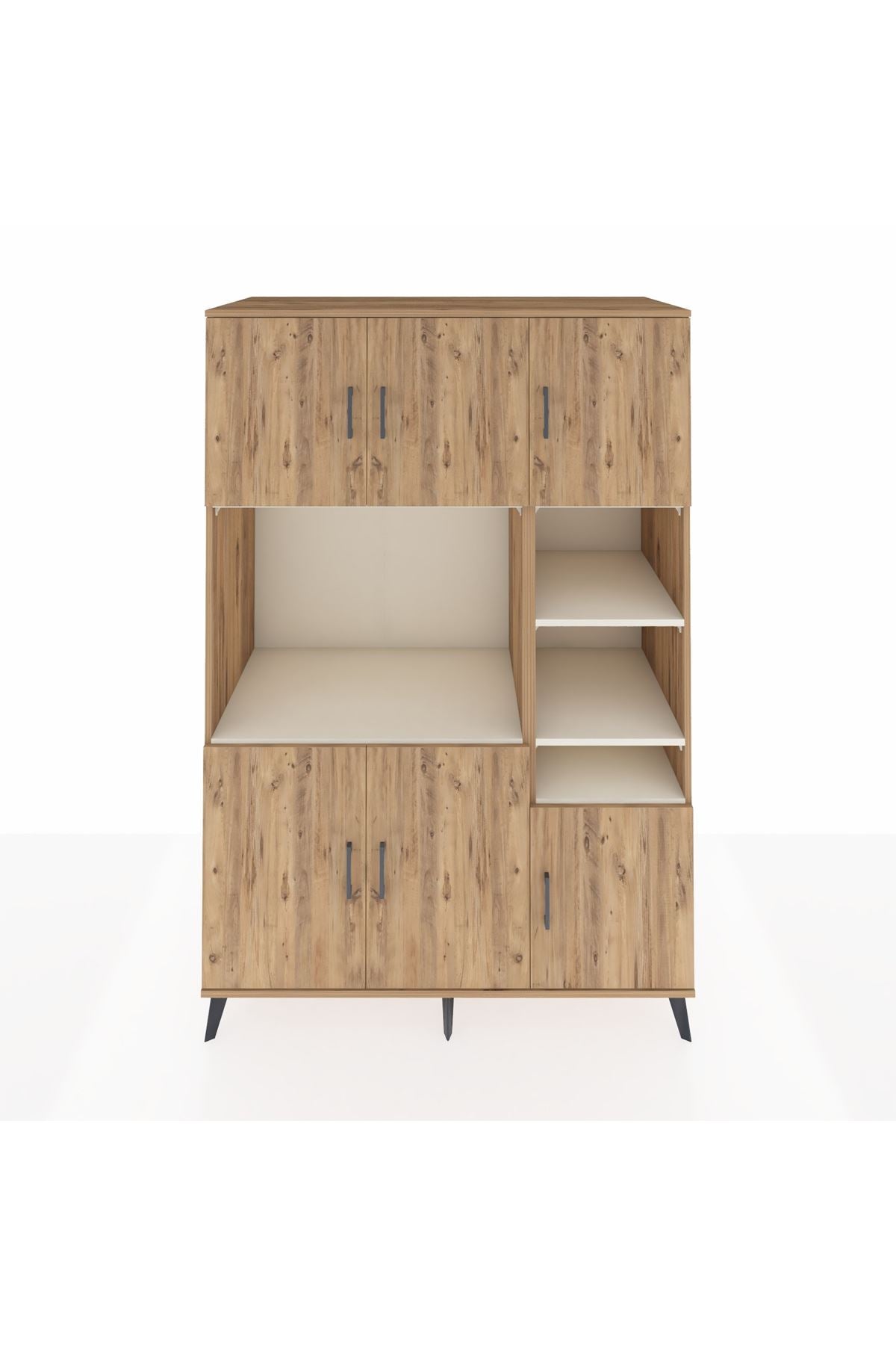 Etkileyici 195 cm yüksekliği, 132 cm genişliği ve 59 cm derinliğiyle hem yatay hem dikey alanı verimli kullanır; Atlas Çam ve Aytaşı renk kombinasyonu ile modern, sıcak bir atmosfer yaratır.