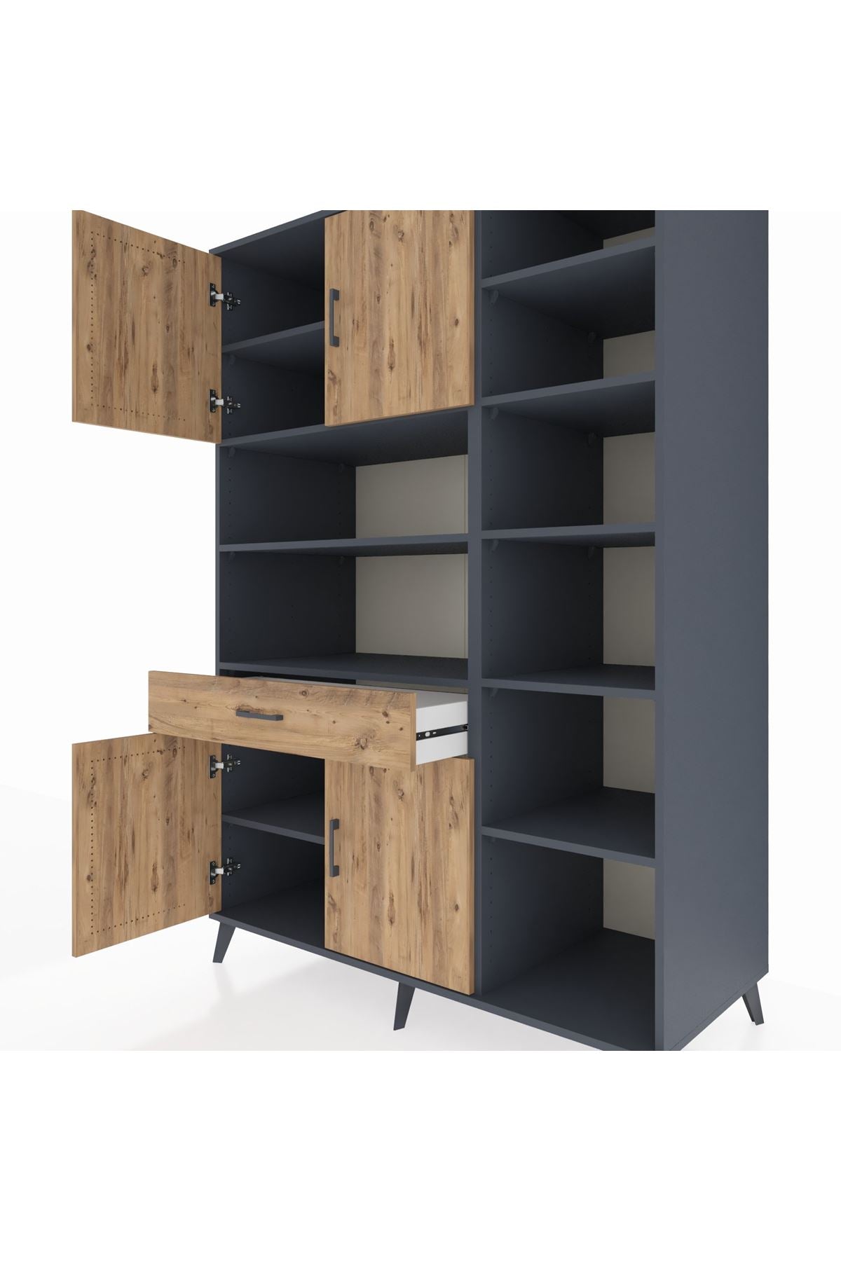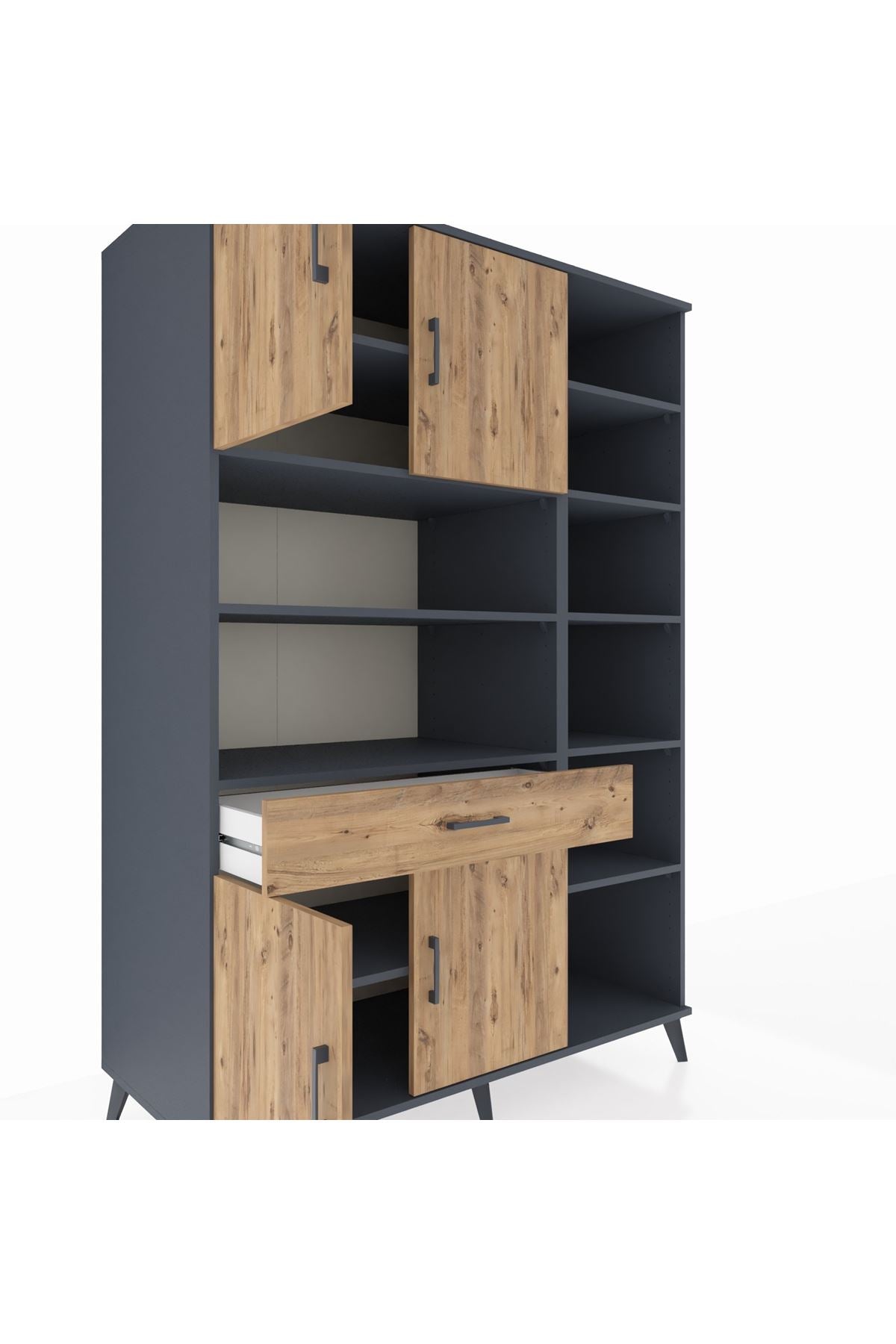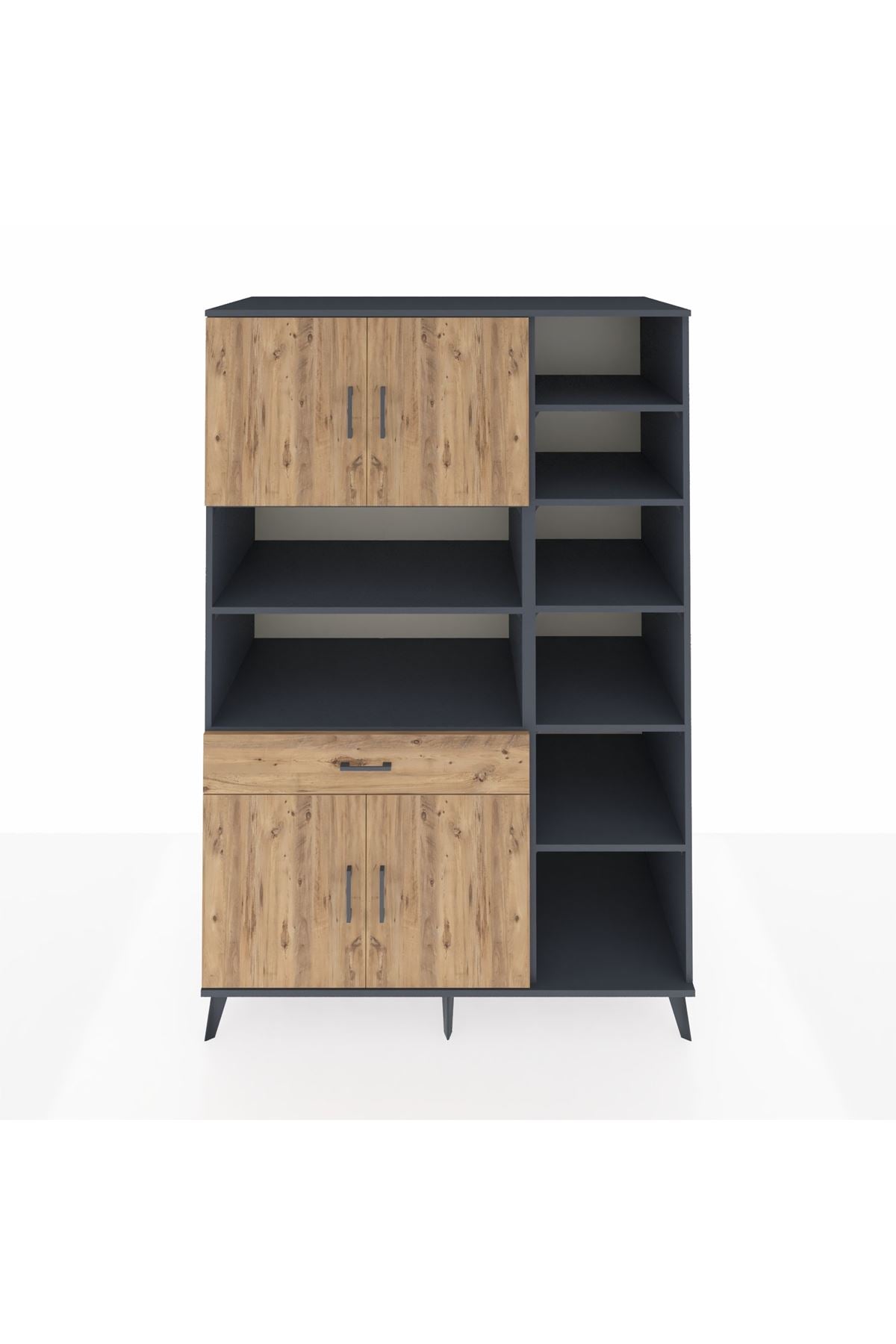 🔹 Kronos Dolap 10 Raflı Tek Çekmeceli 4 Kapaklı 132x59x195 Antrasit-Çam/Çam ile şıklık ve düzen bir arada!