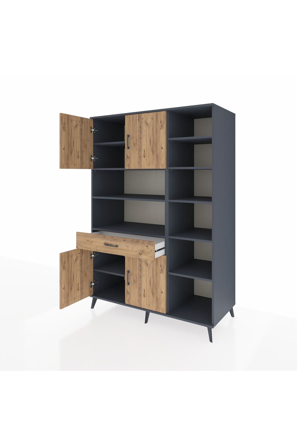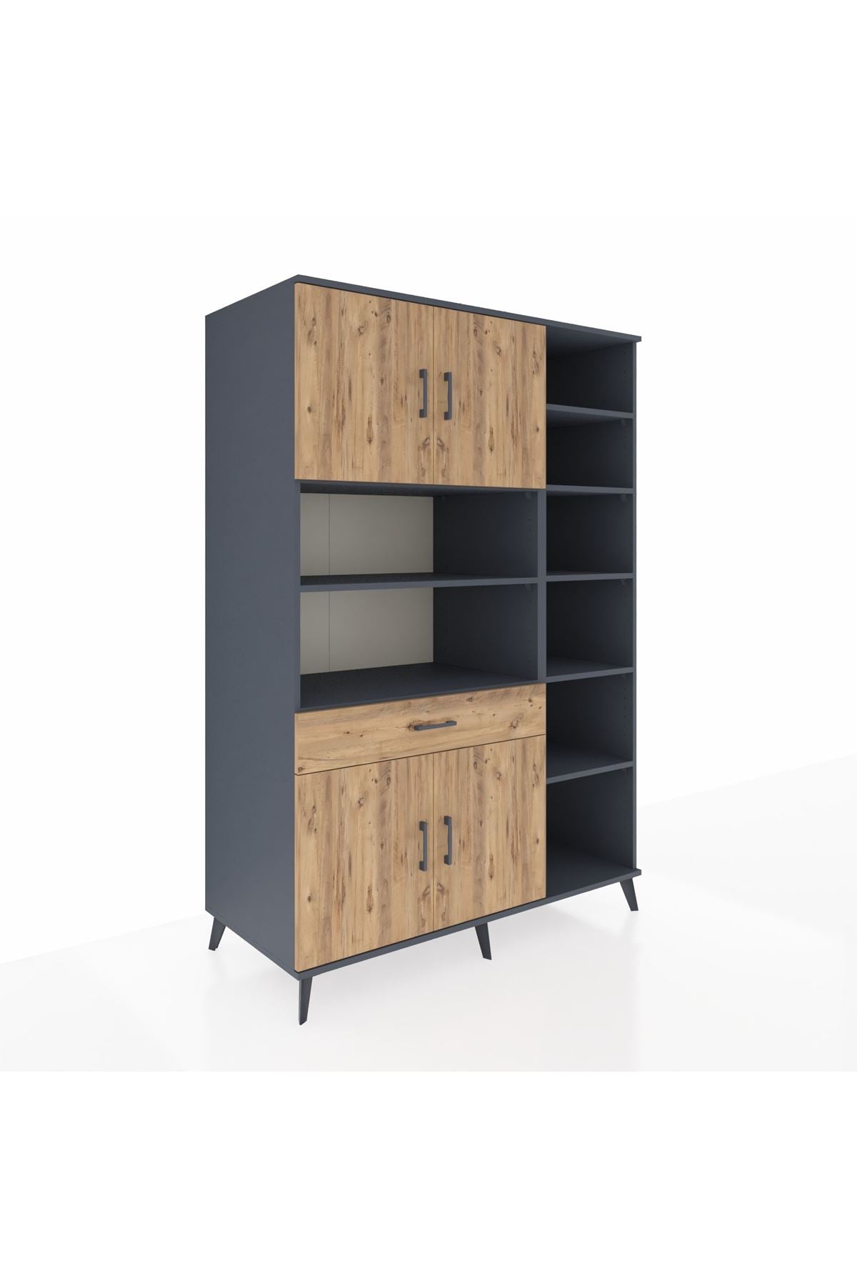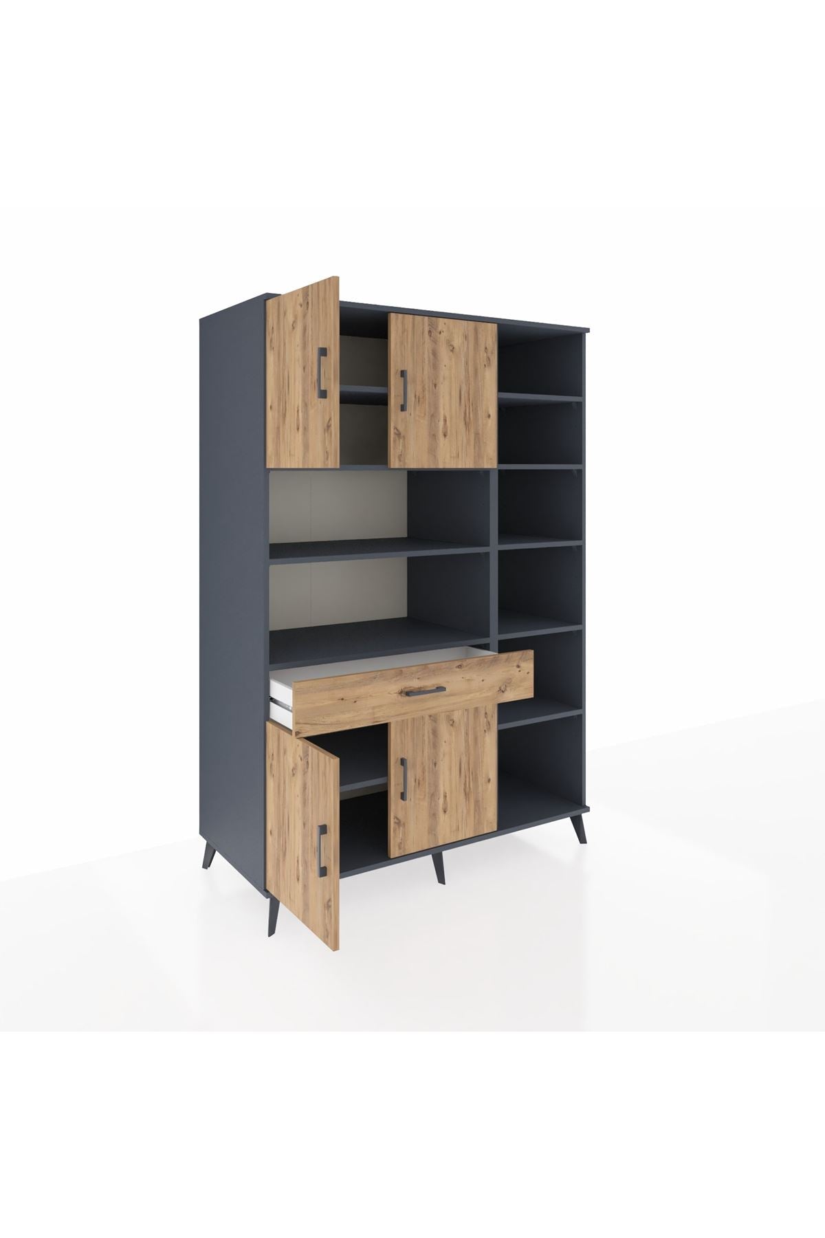🔹 Kronos Dolap 10 Raflı Tek Çekmeceli 4 Kapaklı 132x59x195 Antrasit-Çam/Çam ile şıklık ve düzen bir arada!