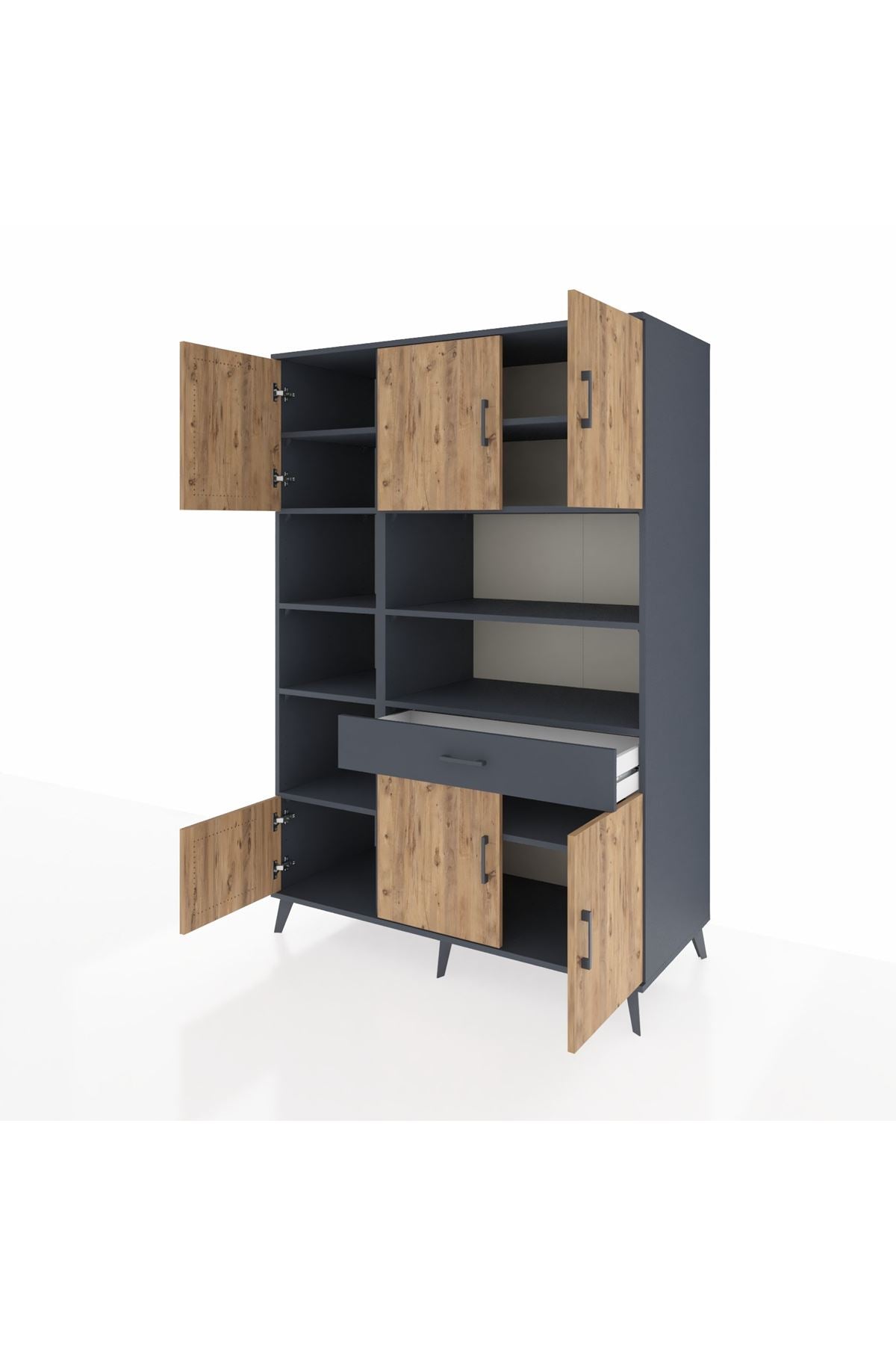 🌞 Kronos Dolap 10 Raflı Tek Çekmeceli 6 Kapaklı 132x59x195 Antrasit-Çam/Antrasit