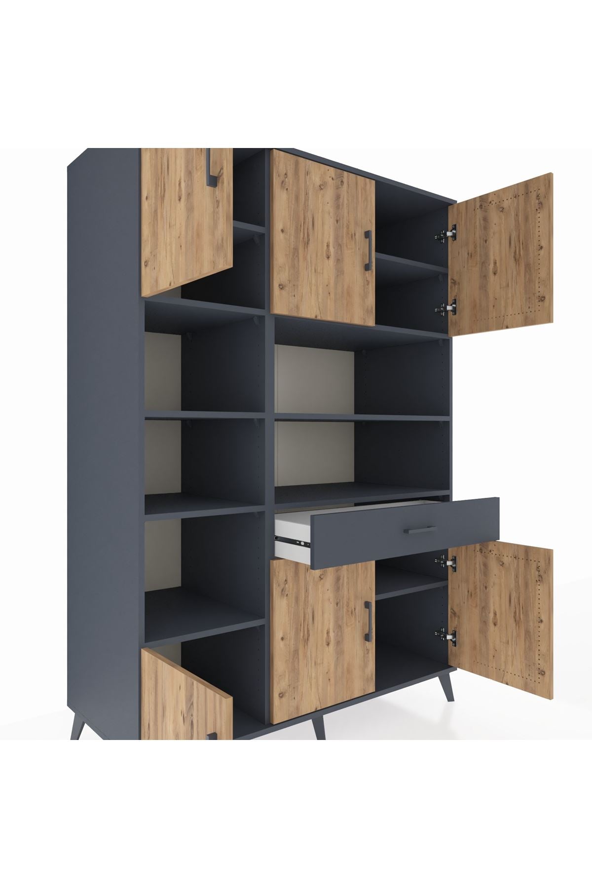 - 📏 10 raflı, 1 çekmeceli ve 6 kapaklı geniş tasarım