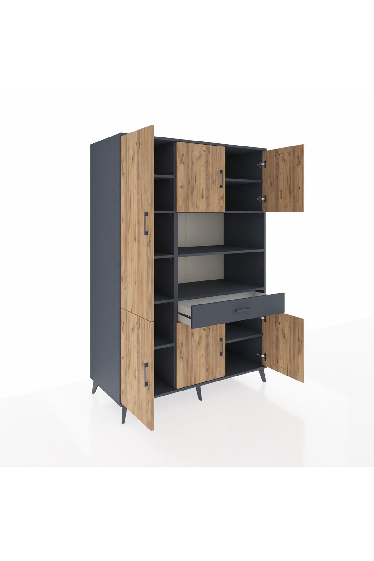 🌟 Kronos Dolap 10 Raflı Tek Çekmeceli 6 Kapaklı 132x59x195 Antrasit-Çam/Antrasit
