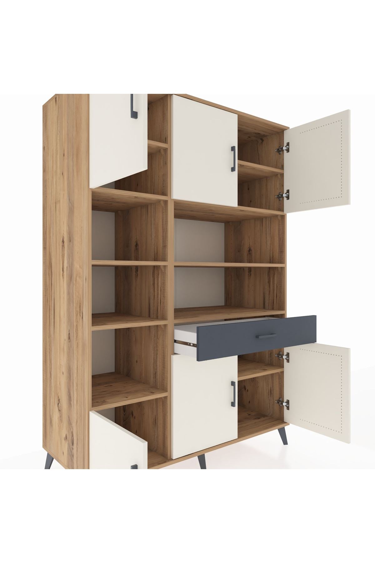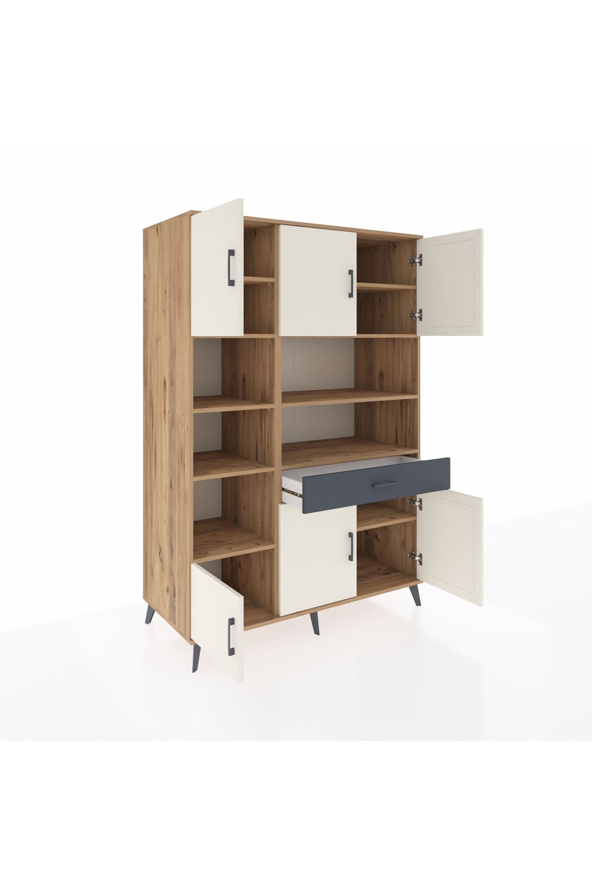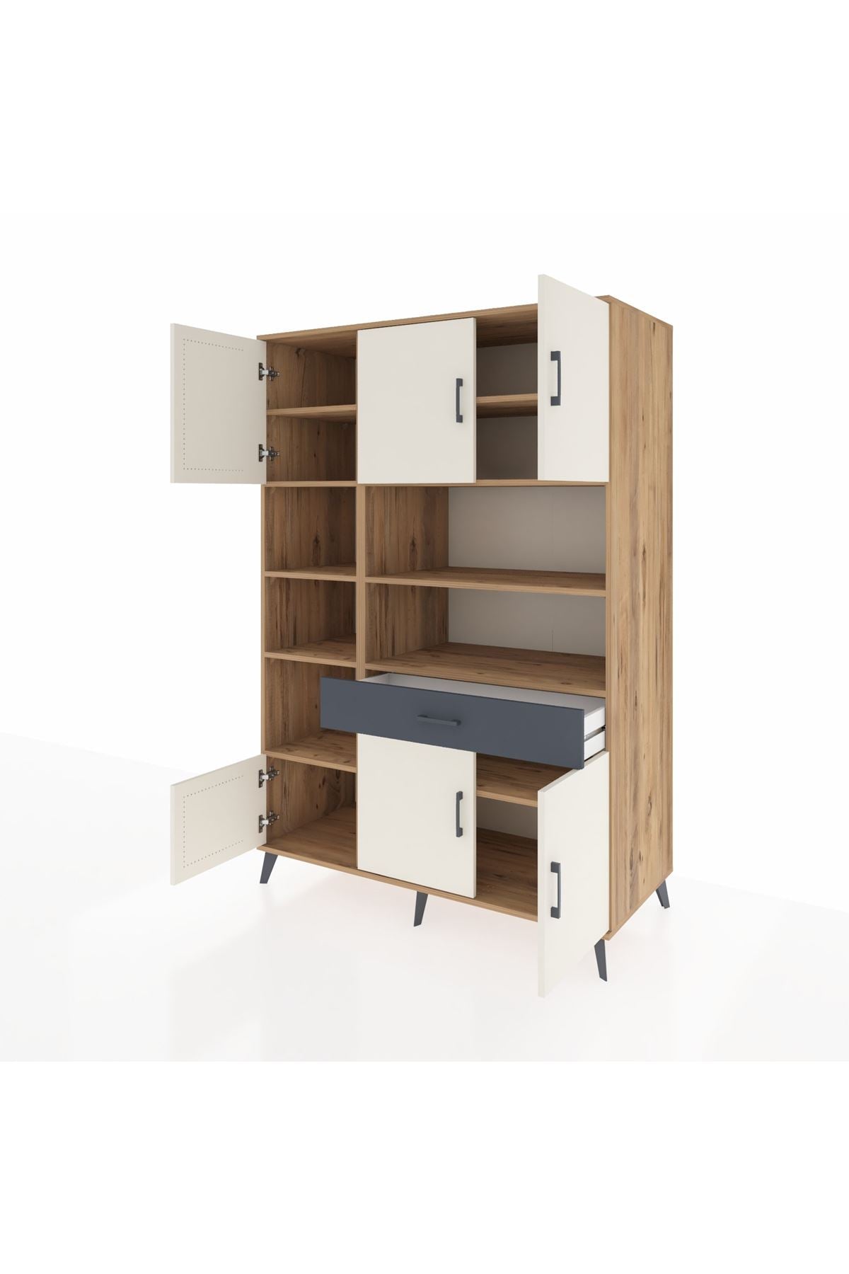 6 kapaklı ve tek çekmeceli tasarımı ile hem gizli hem açık saklama alanı sunar. Çam, aytaşı ve antrasit renk kombinasyonu modern dekorasyonlara mükemmel uyum sağlar 🎨.