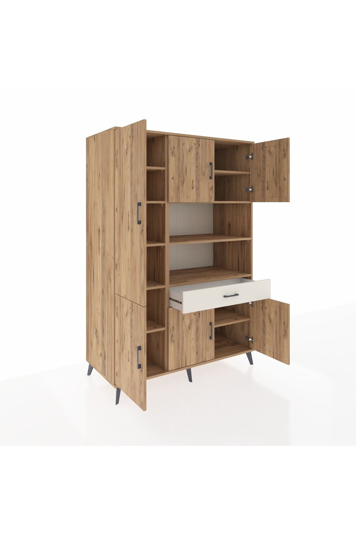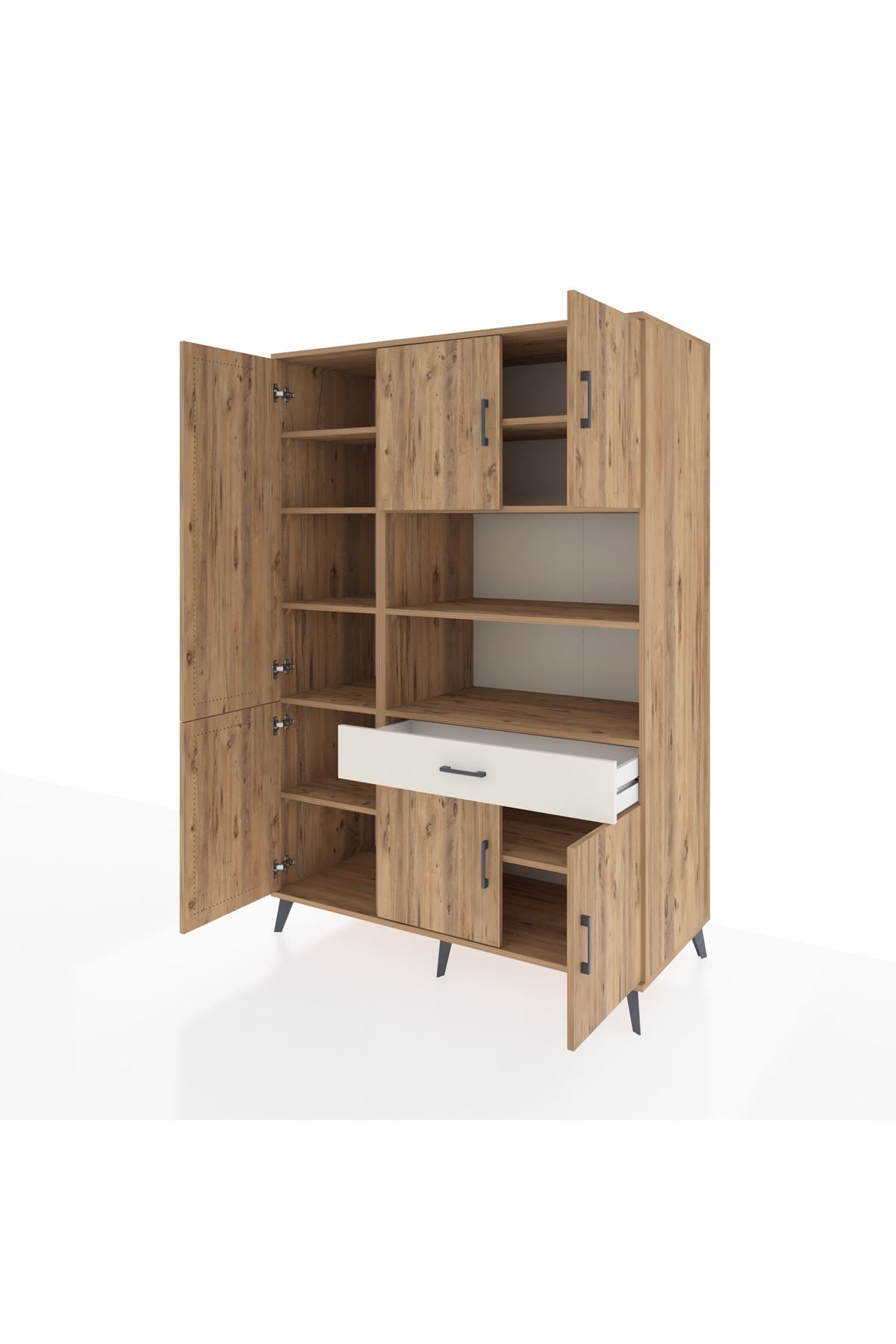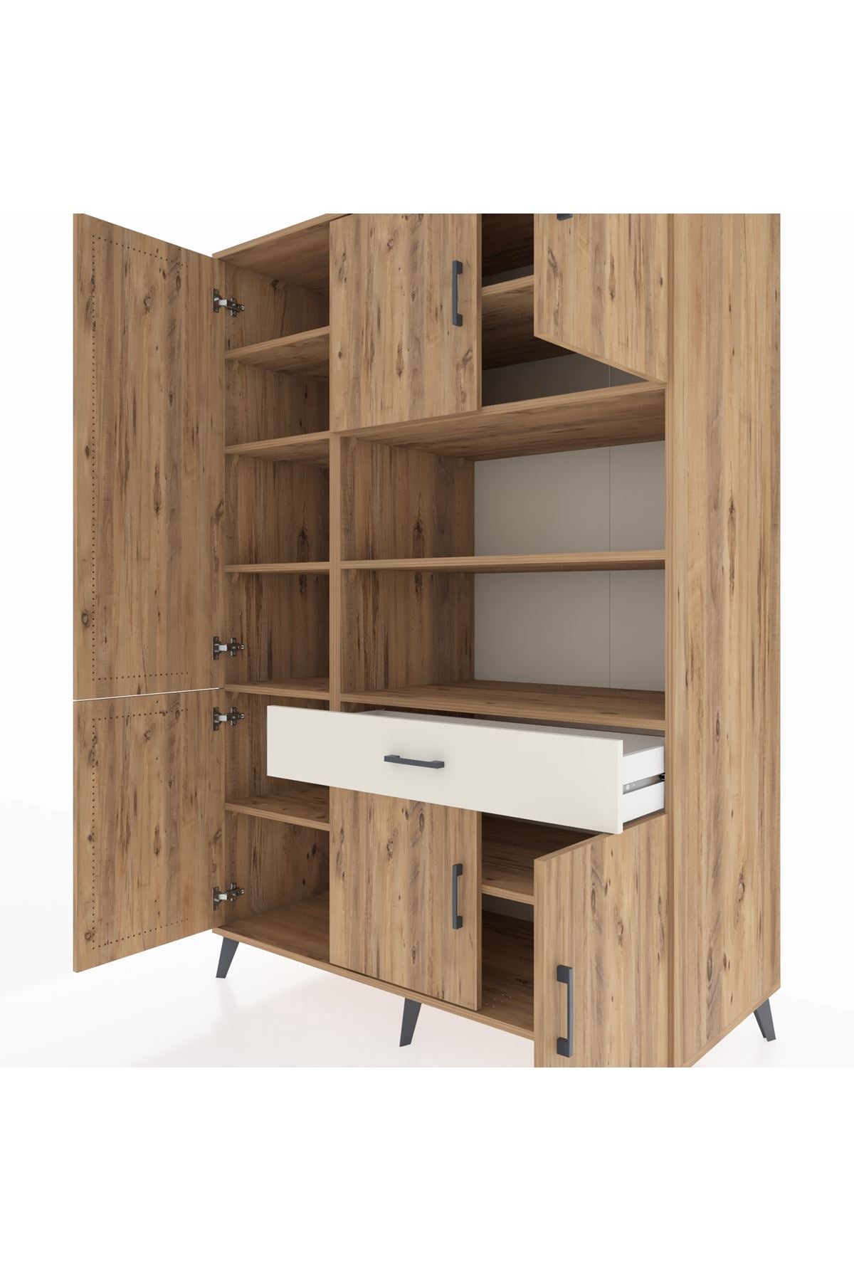 - 🛋️ Salon dolabı: 10 raflı tasarımı ile salon veya oturma odasında geniş depolama sunar.