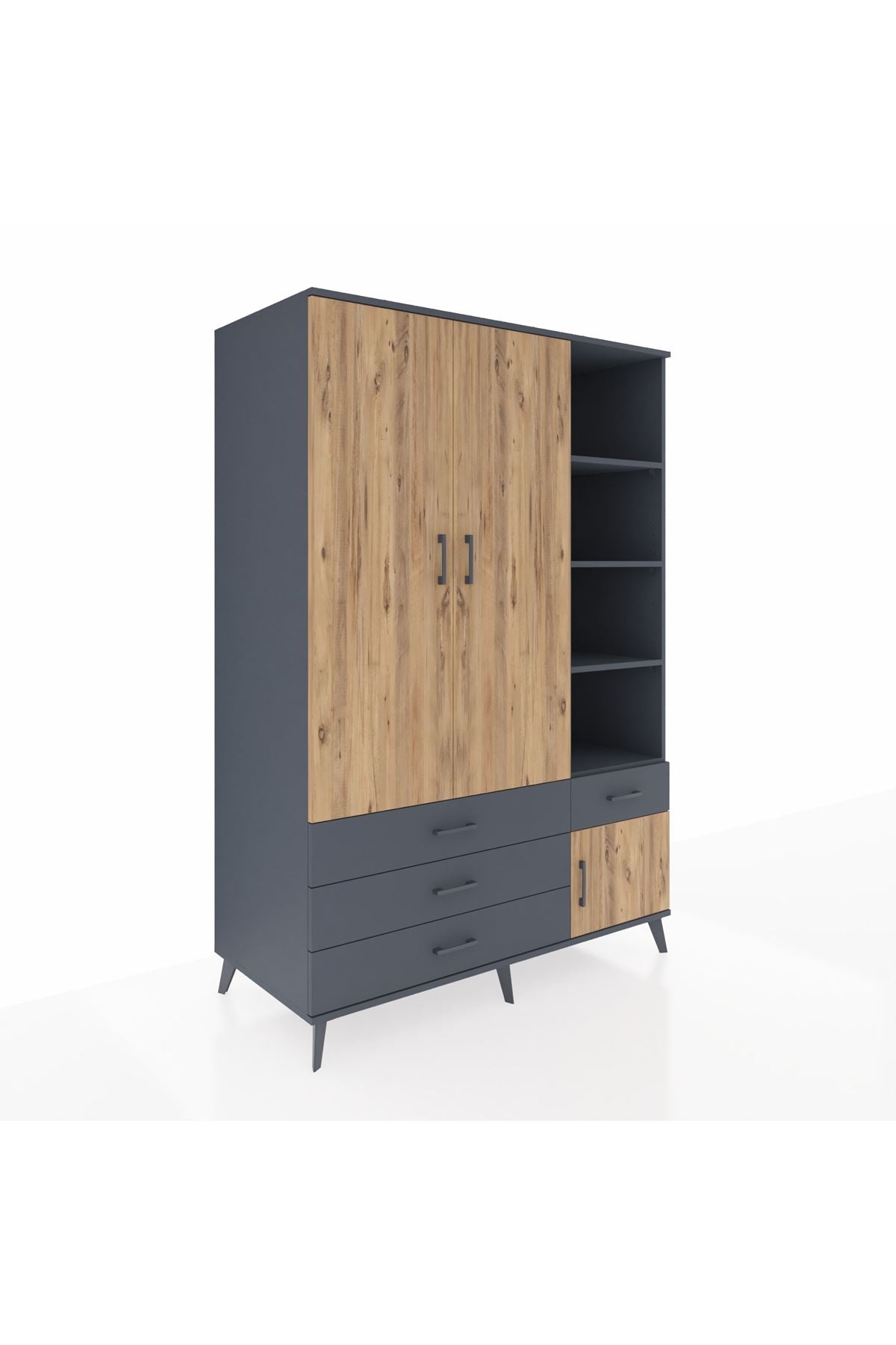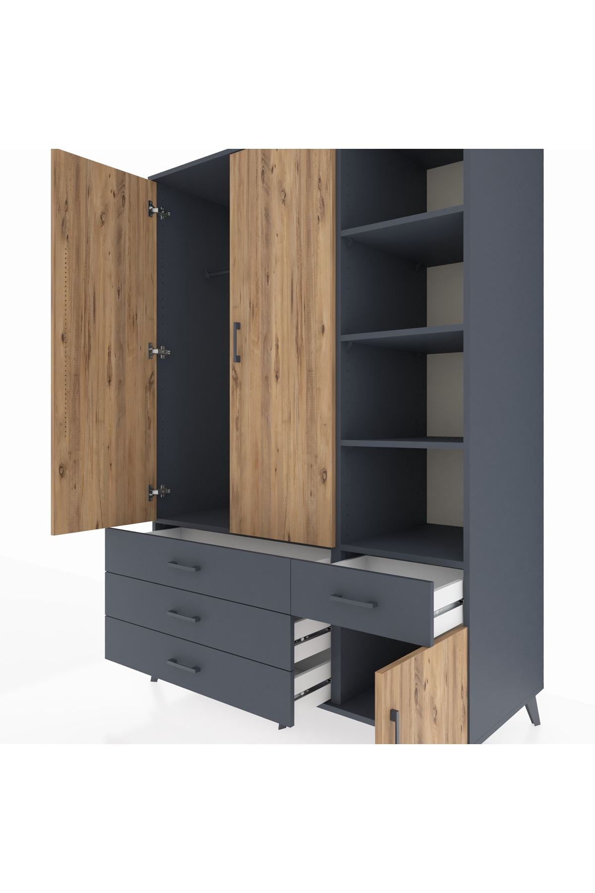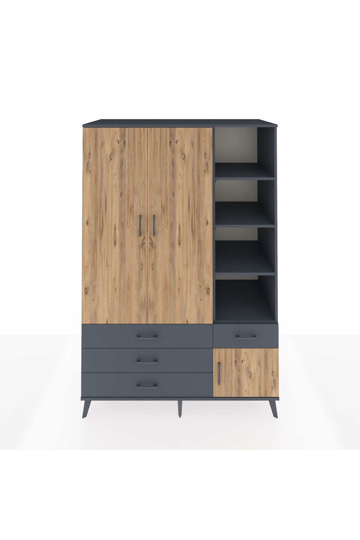 Kronos Dolap 5 Raflı 4 Çekmeceli Tek Askılı 132x59x195 Antrasit-Çam/Antrasit