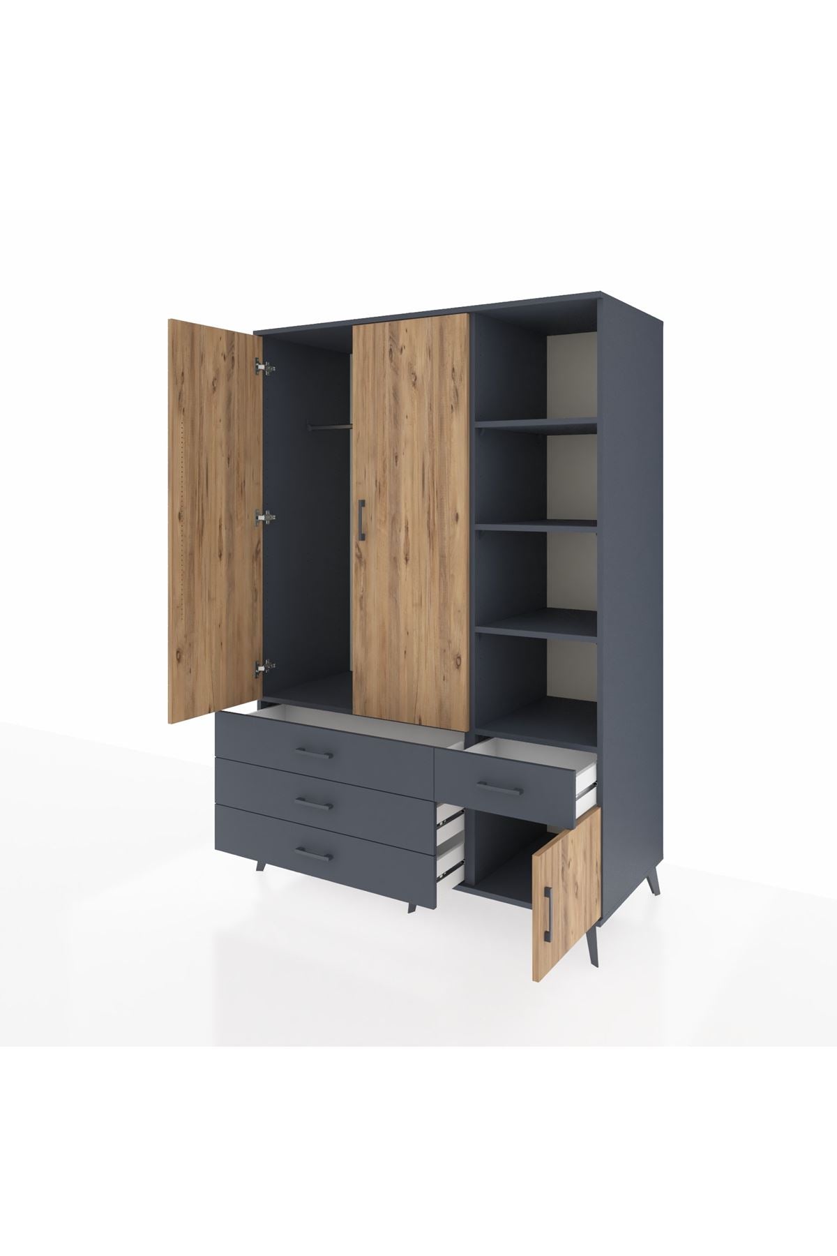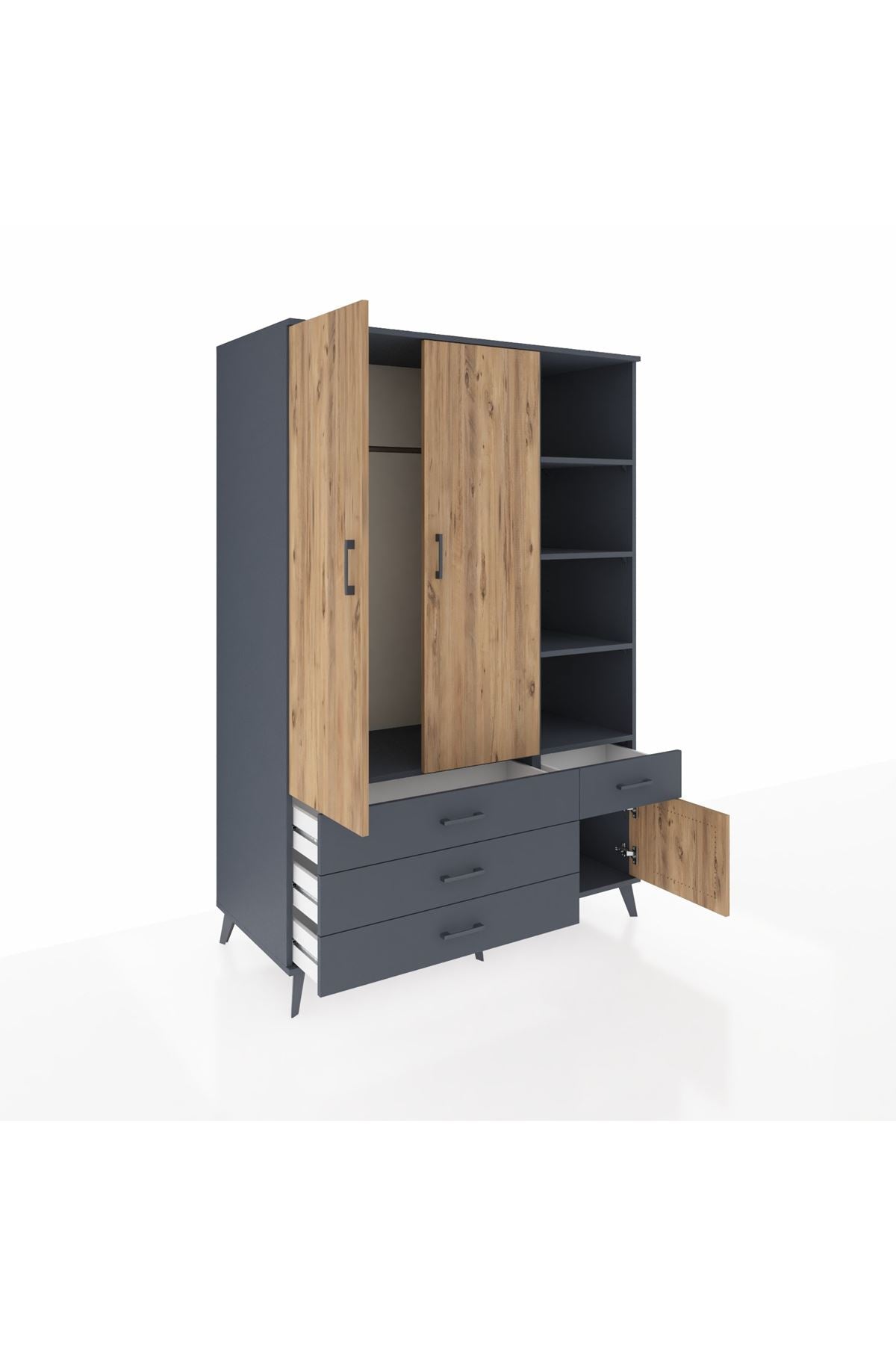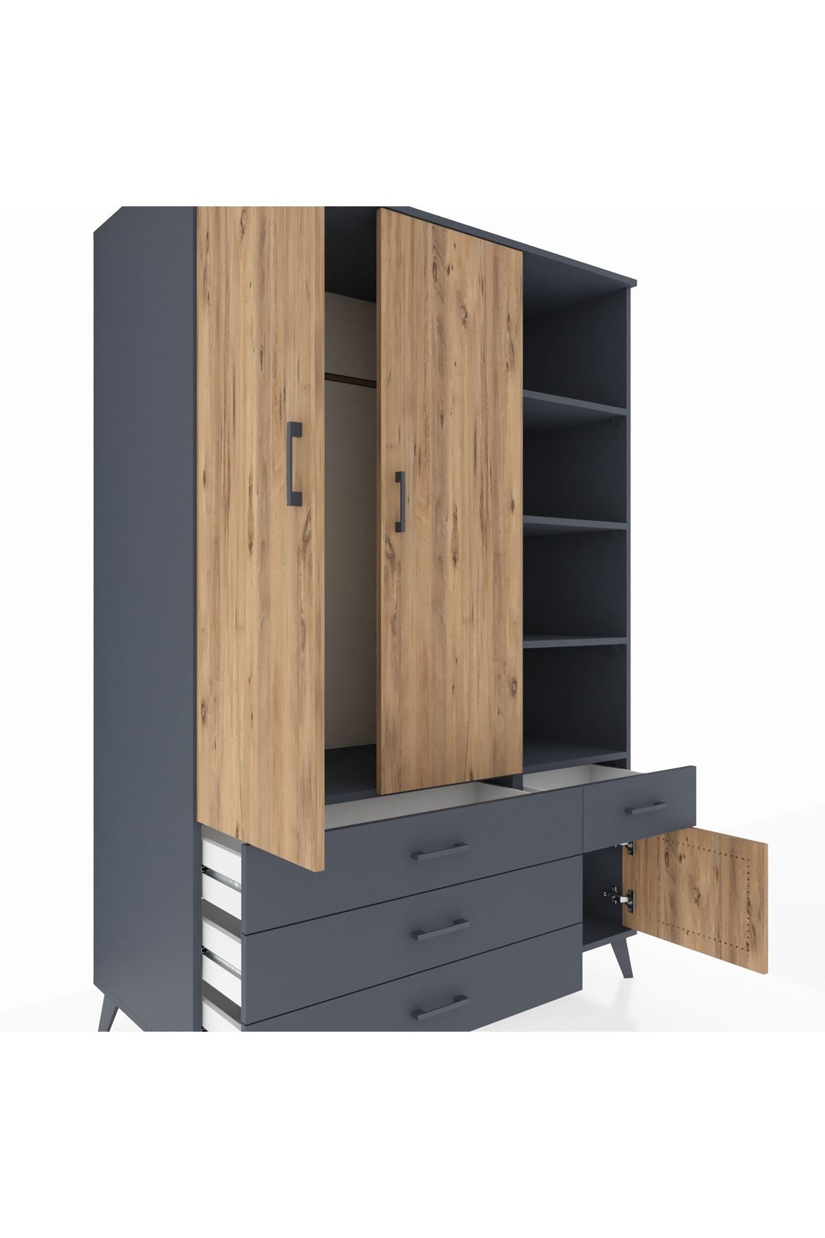 Kronos Dolap 5 Raflı 4 Çekmeceli Tek Askılı 132x59x195 Antrasit-Çam/Antrasit