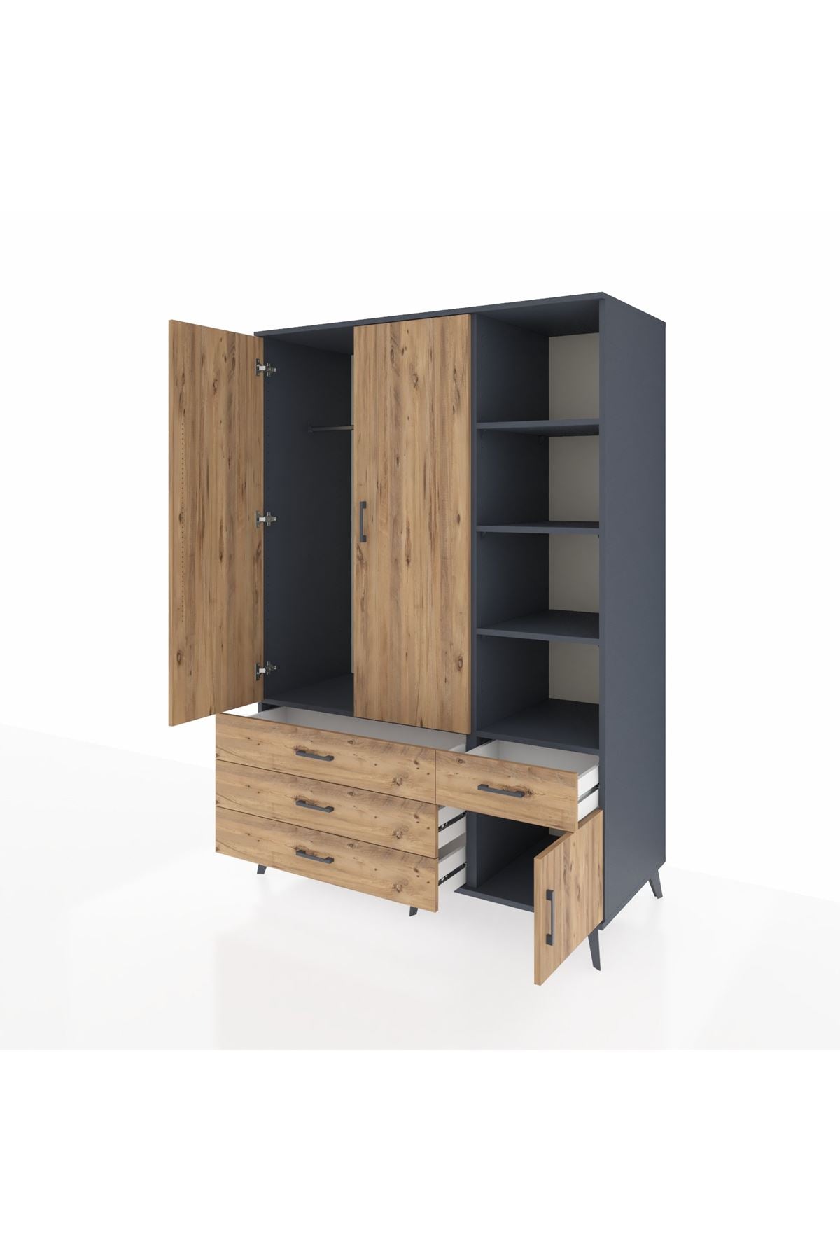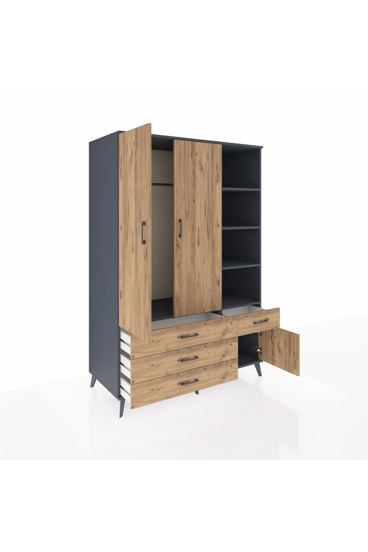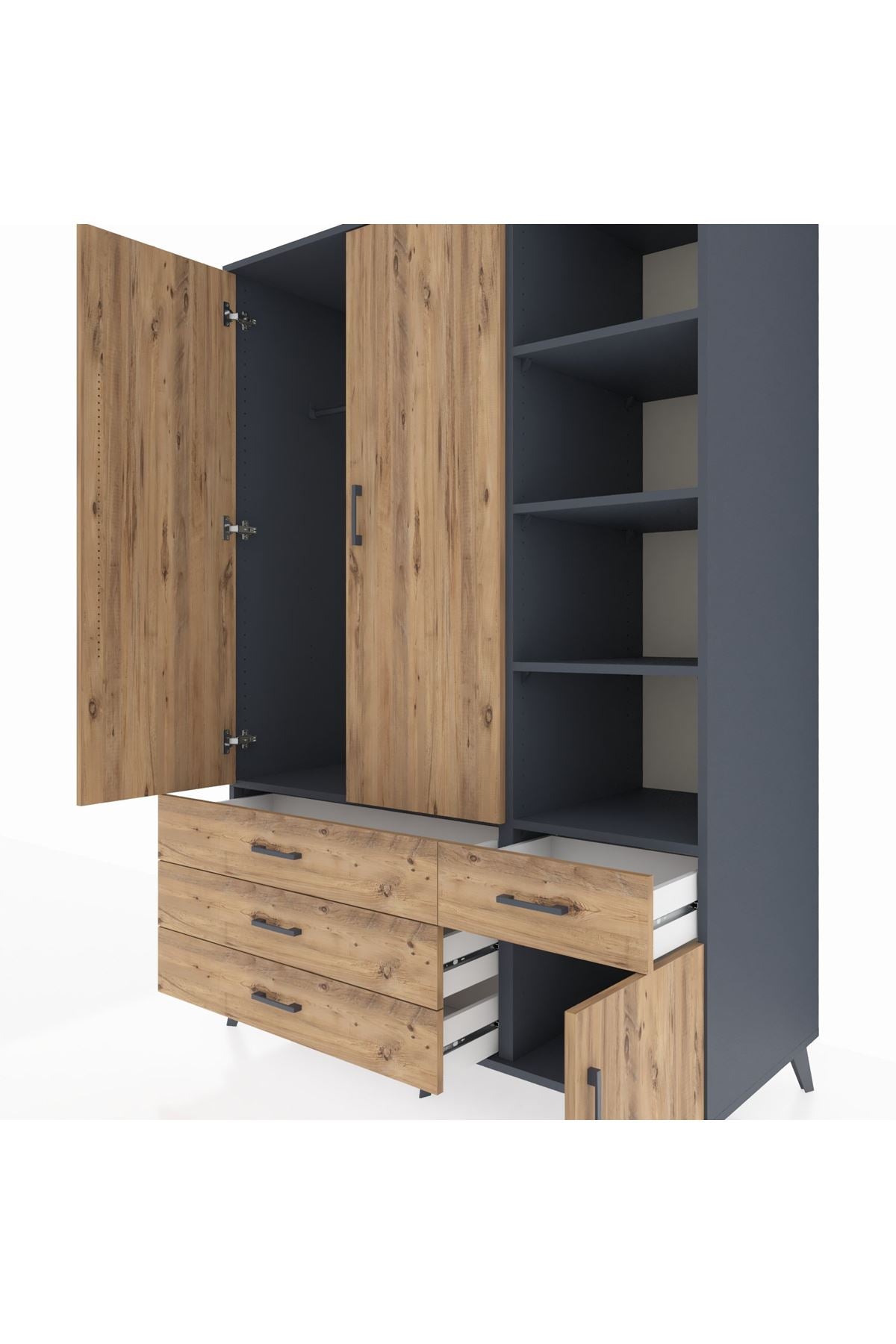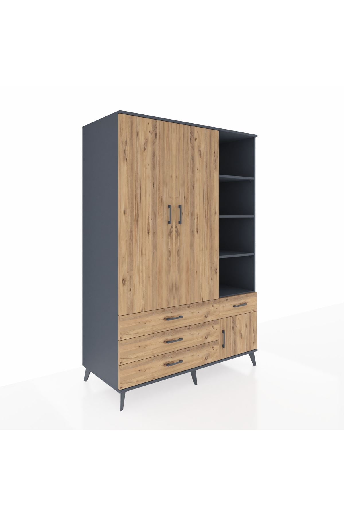 Kronos Dolap 5 Raflı 4 Çekmeceli Tek Askılı 132x59x195 Antrasit-Çam/Çam