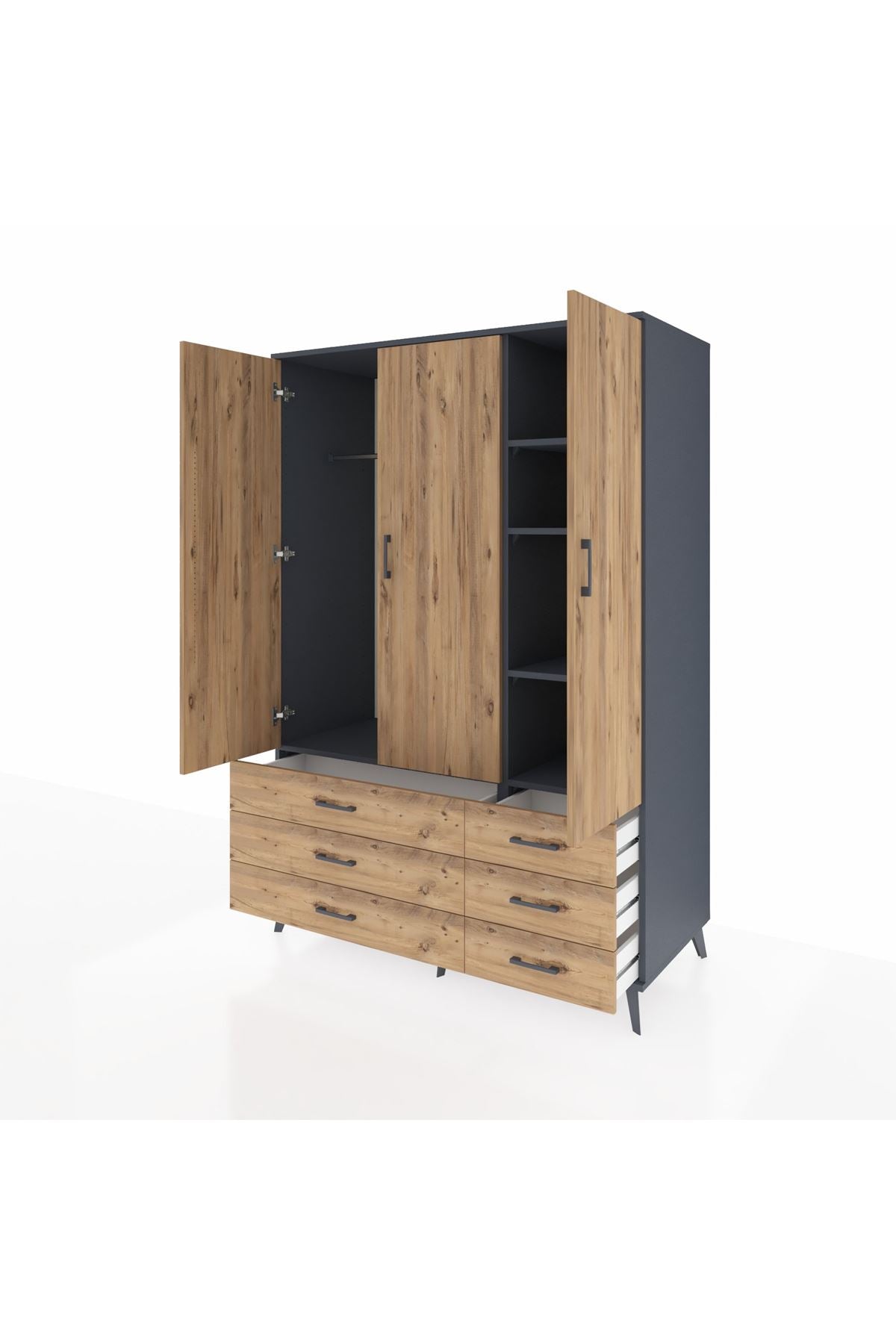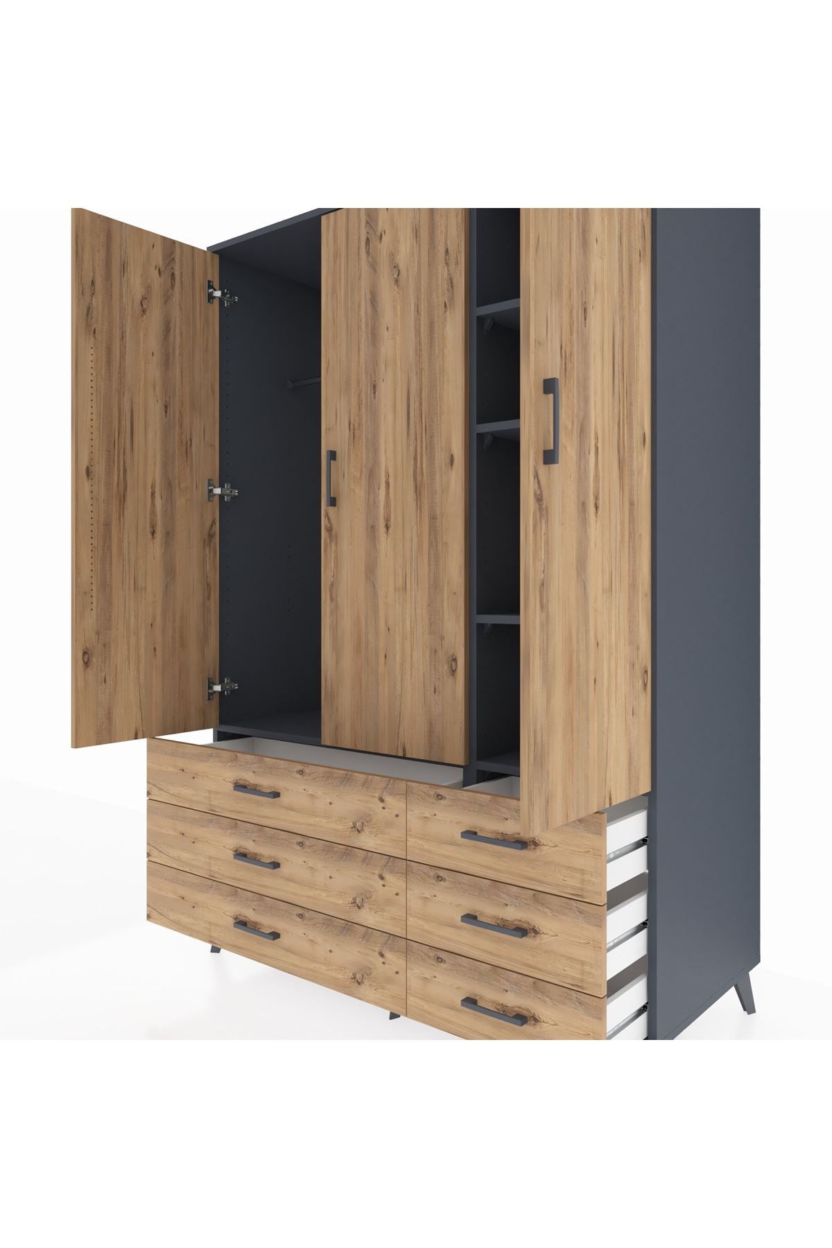 • 🛋️ Salon dolabı: Antrasit ve çam renk uyumu ile dekorasyonunuza şıklık katar.
