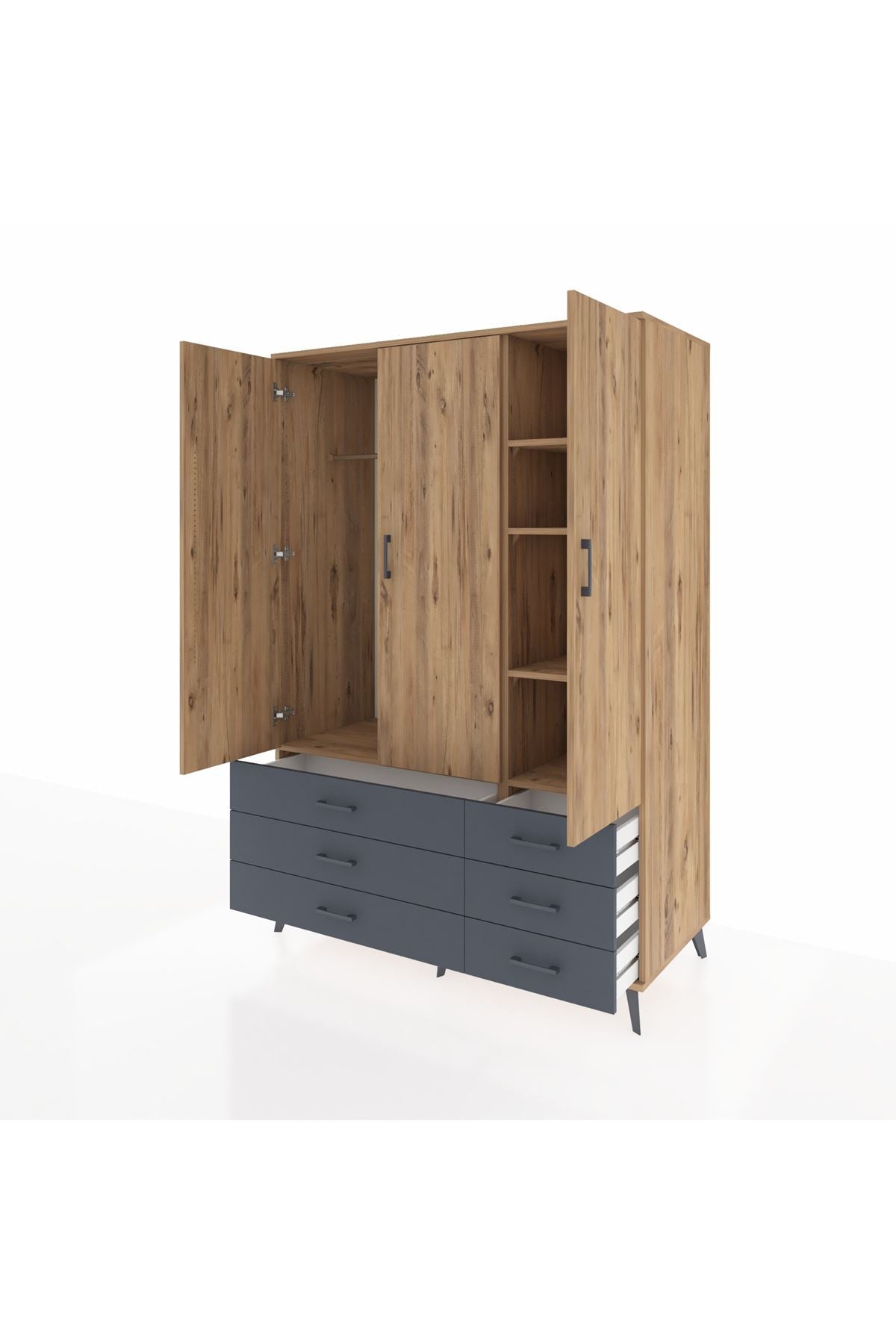 Kronos Dolap 5 Raflı 6 Çekmeceli Tek Askılı 132x59x195 Çam-Çam/Antrasit