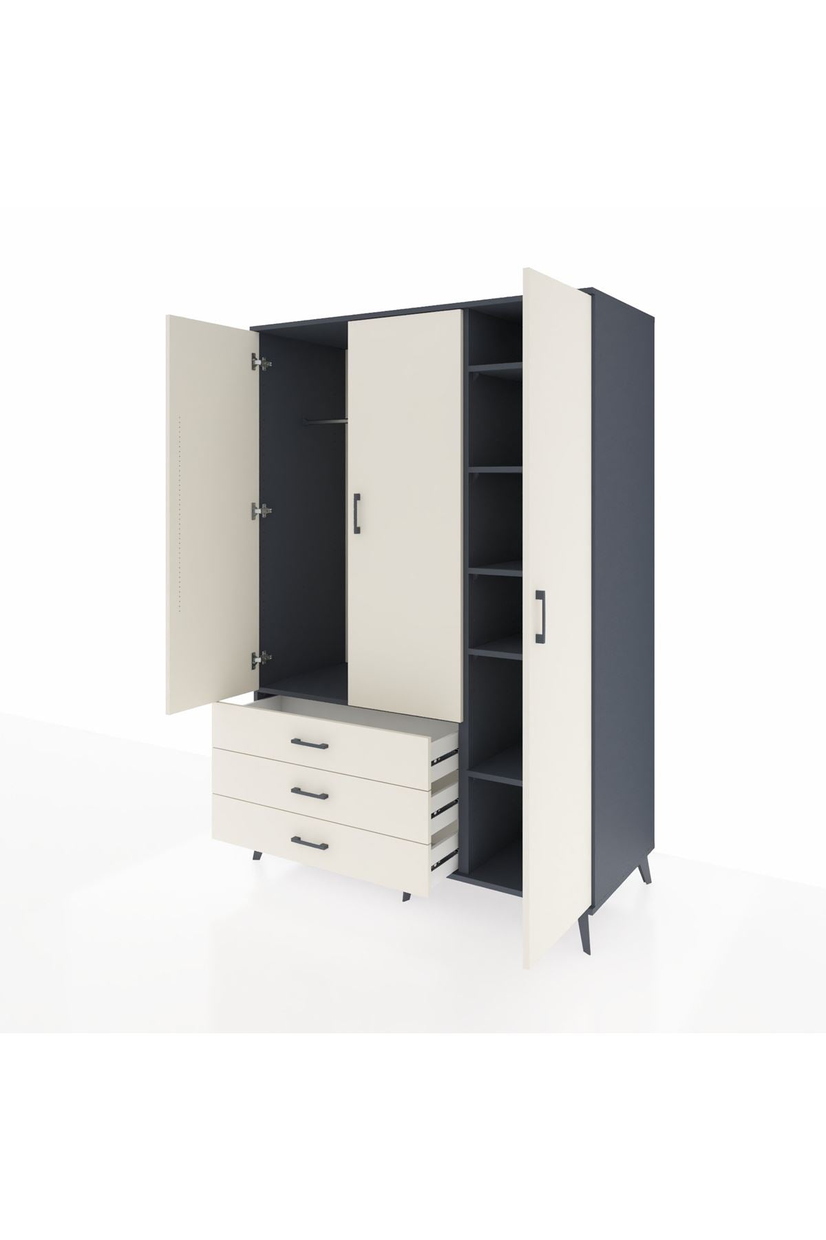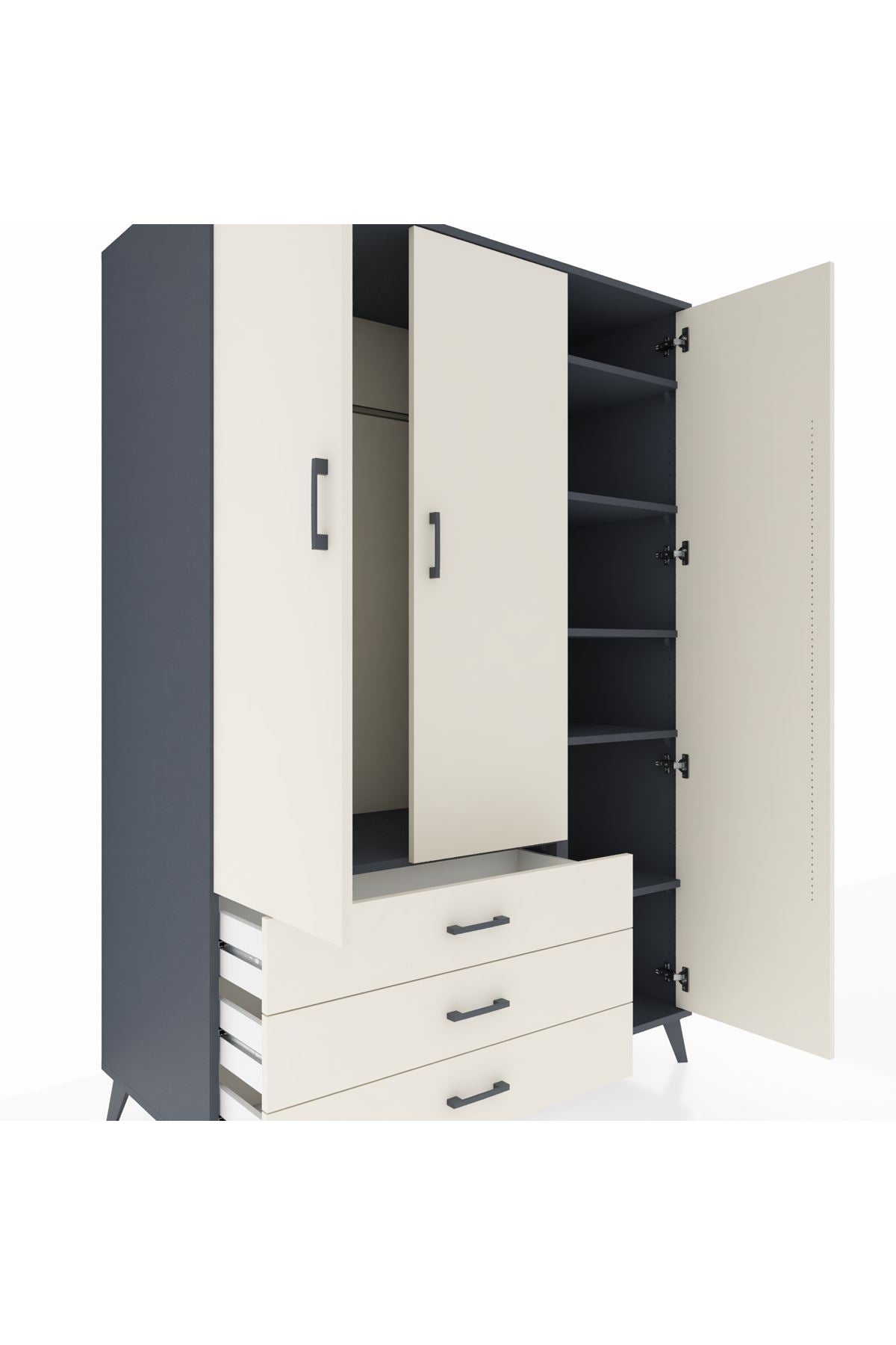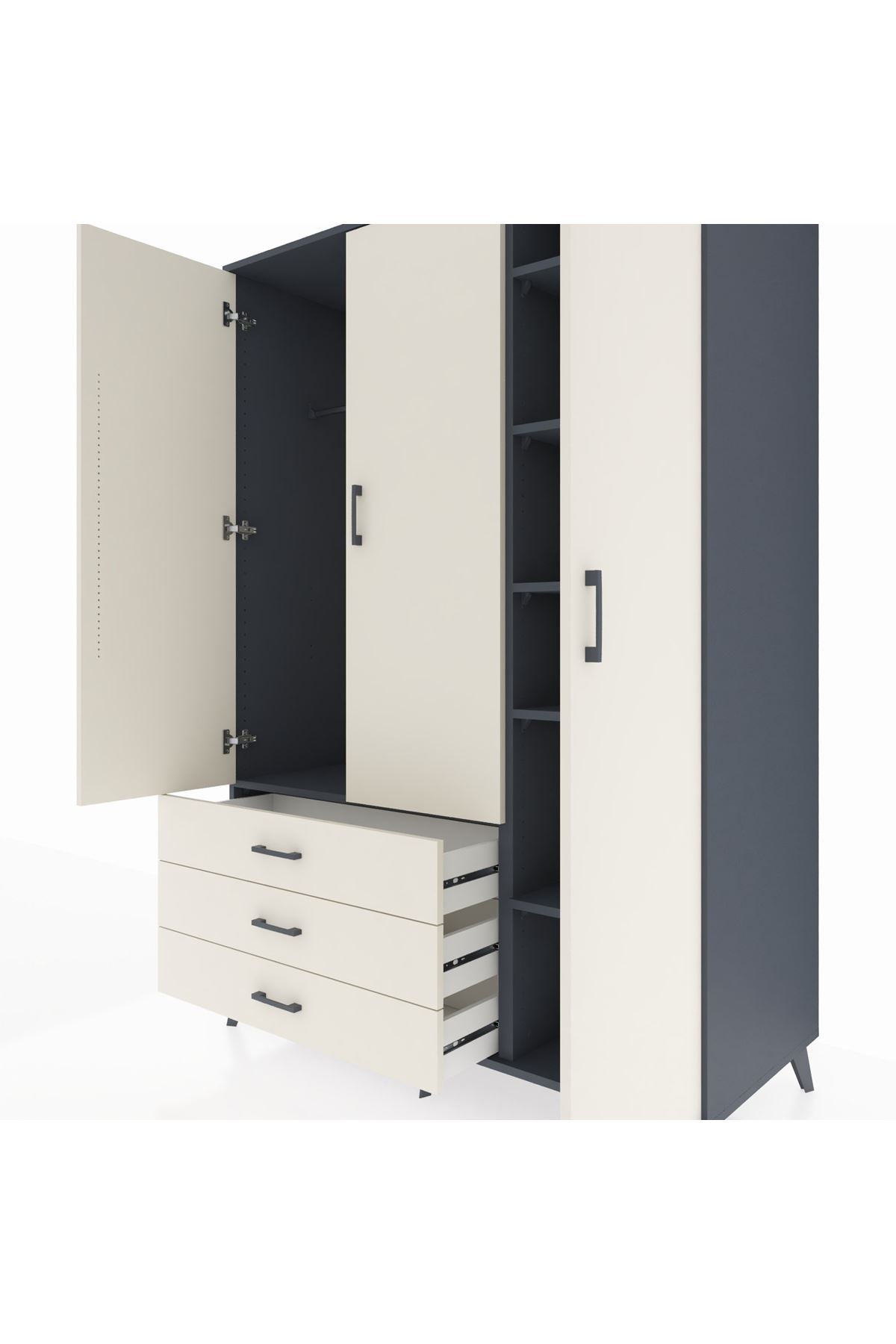 Kronos Dolap, 8 adet geniş rafı ve 5 kullanışlı çekmecesiyle tüm ihtiyaçlarınızı karşılar 3 kapaklı yapısı sayesinde hem gizli hem de açık depolama alanı sunar Antrasit ve Aytaşı renk kombinasyonu, zamansız bir şıklık ve uyum sağlar 🎨