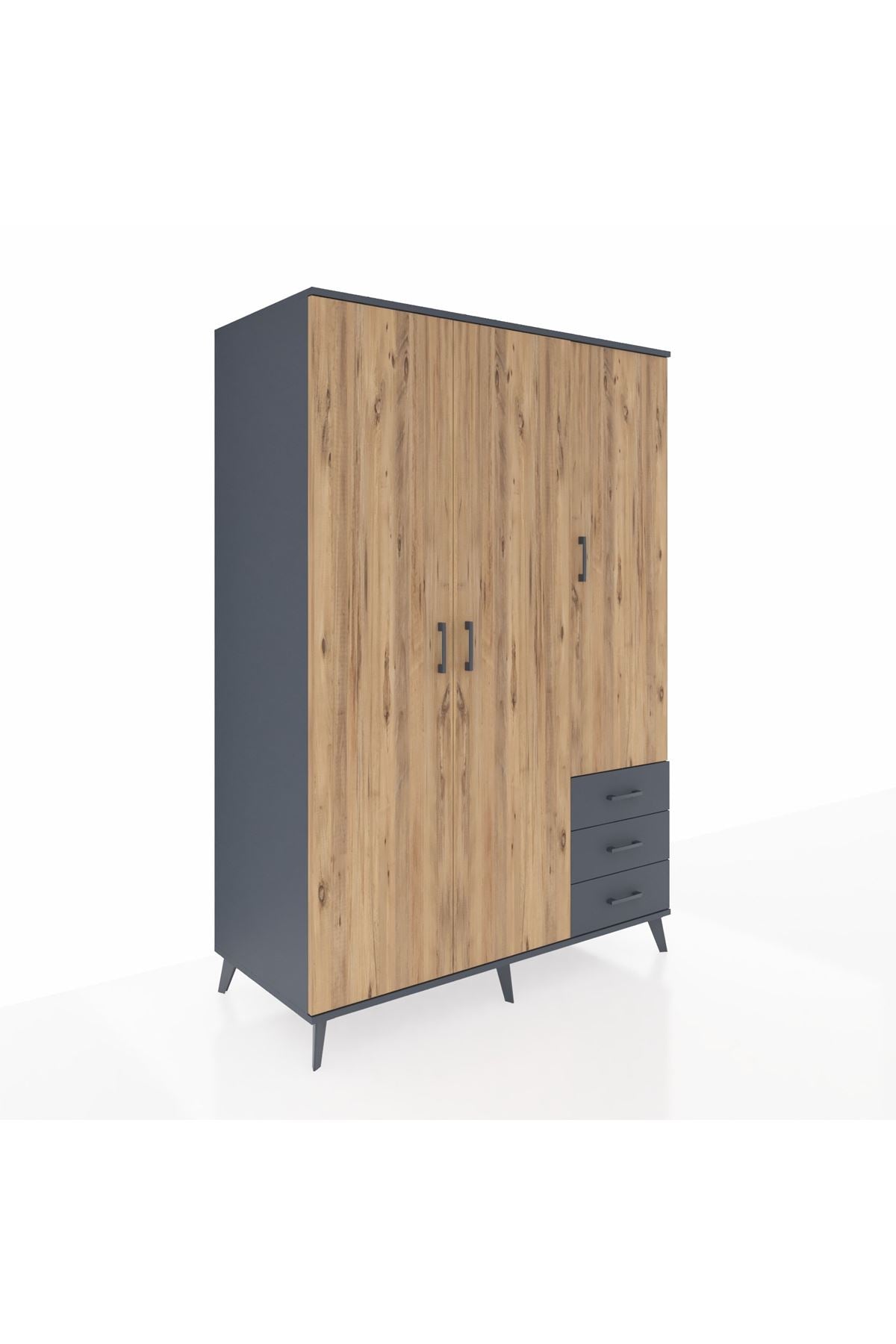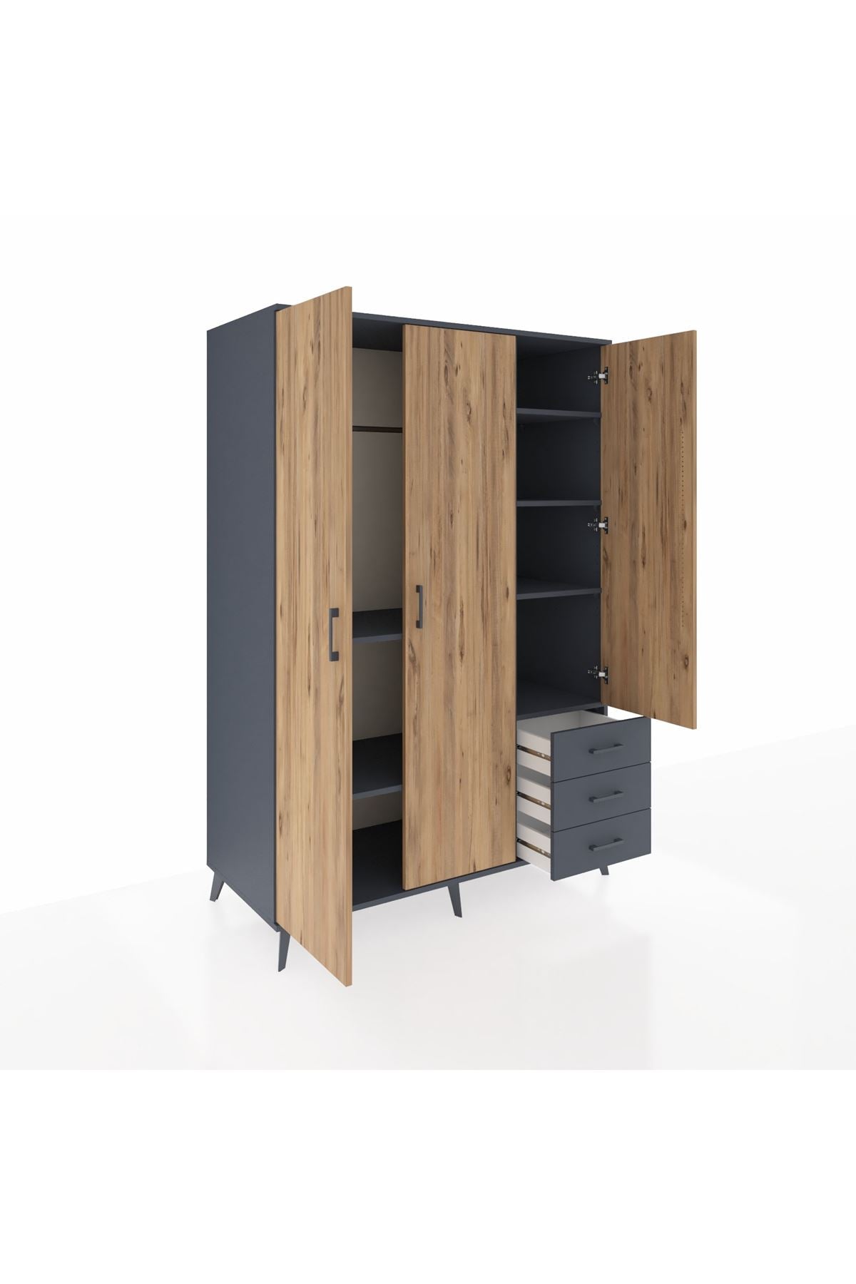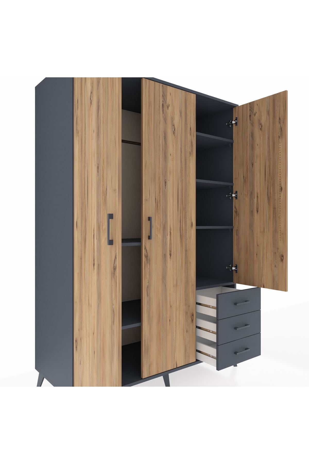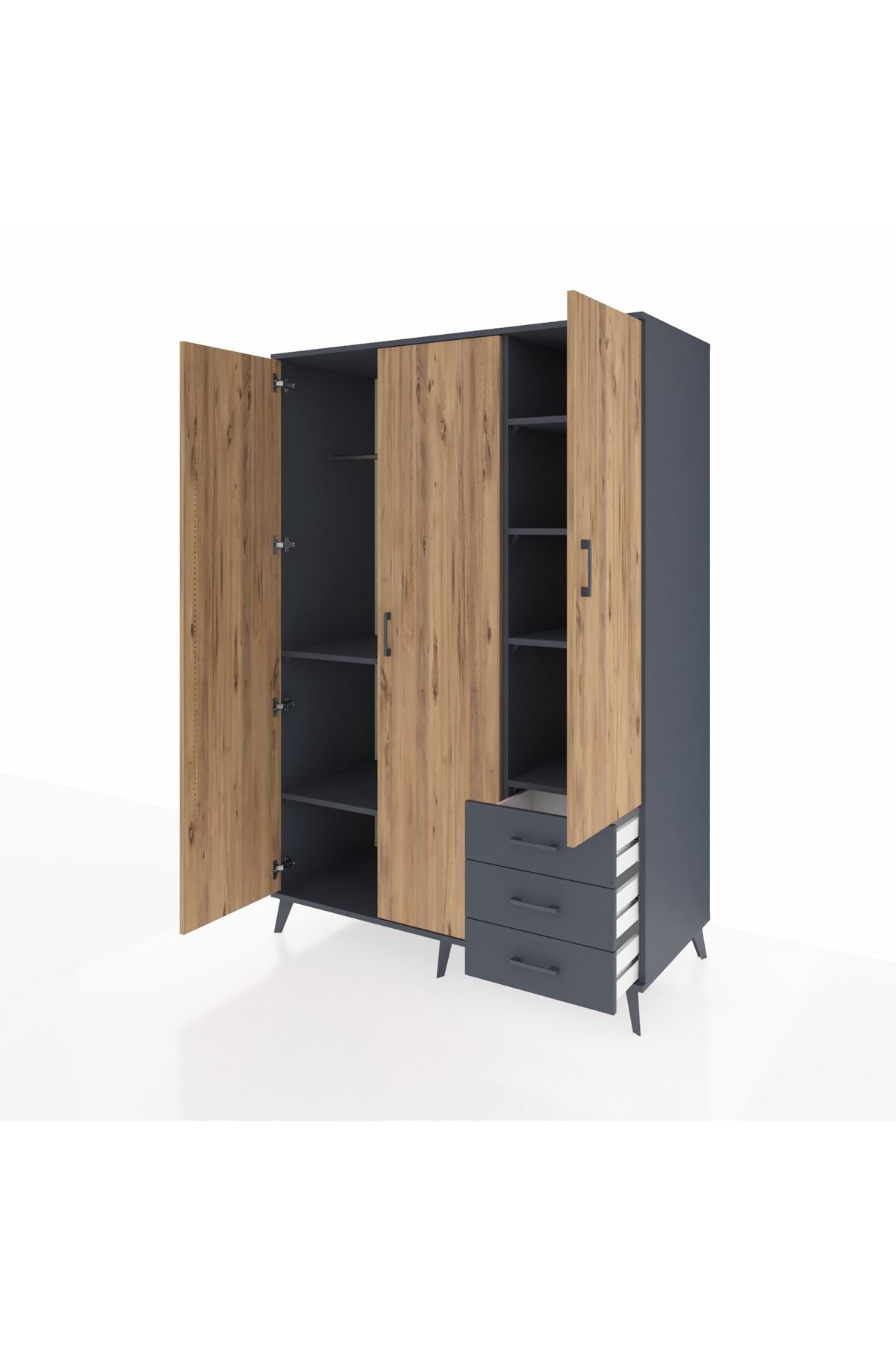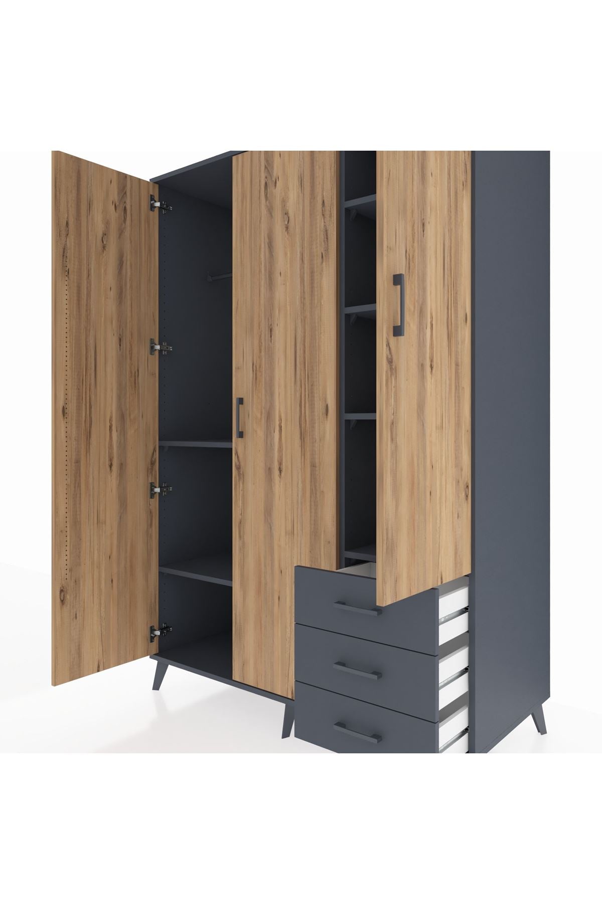 Kronos Dolap 6 Raflı 3 Çekmeceli Tek Askılı 132x59x195 Antrasit-Çam/Antrasit