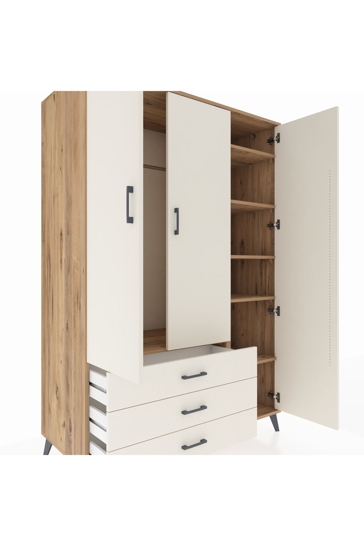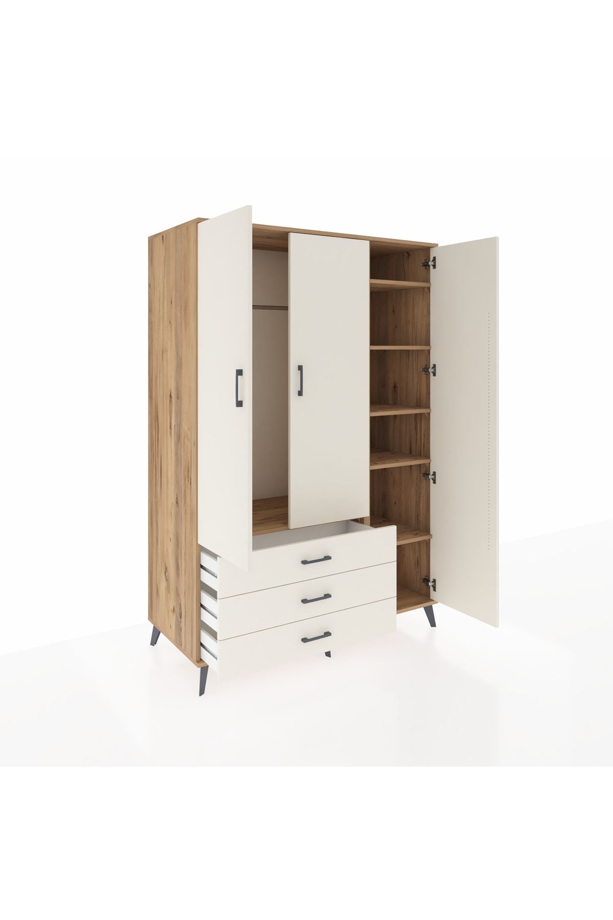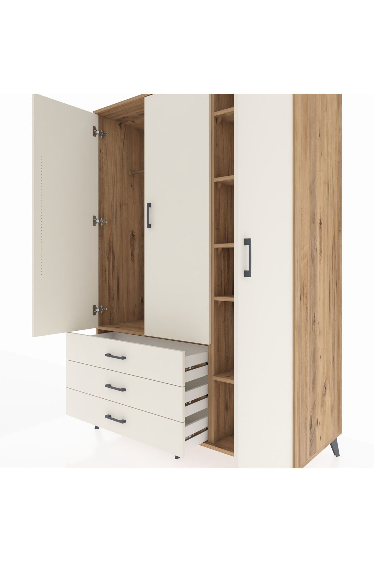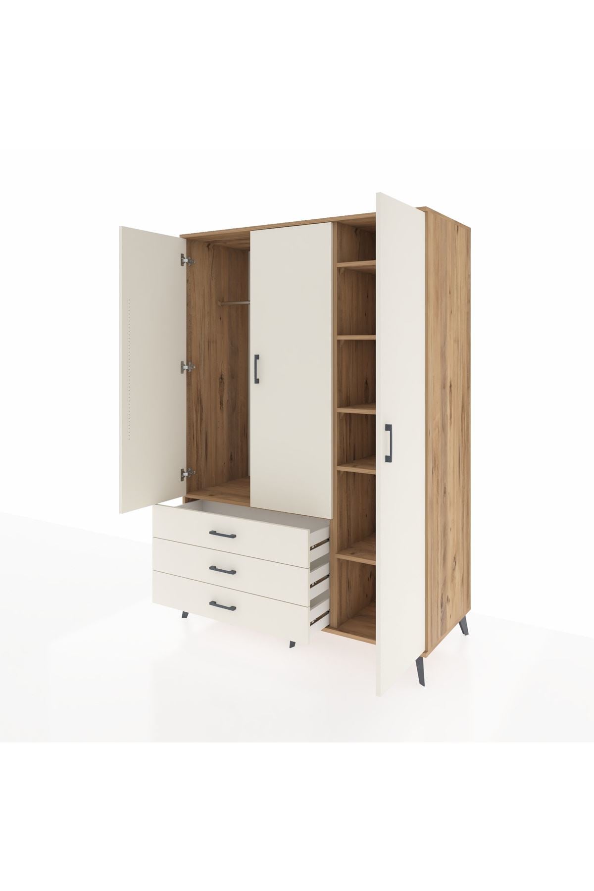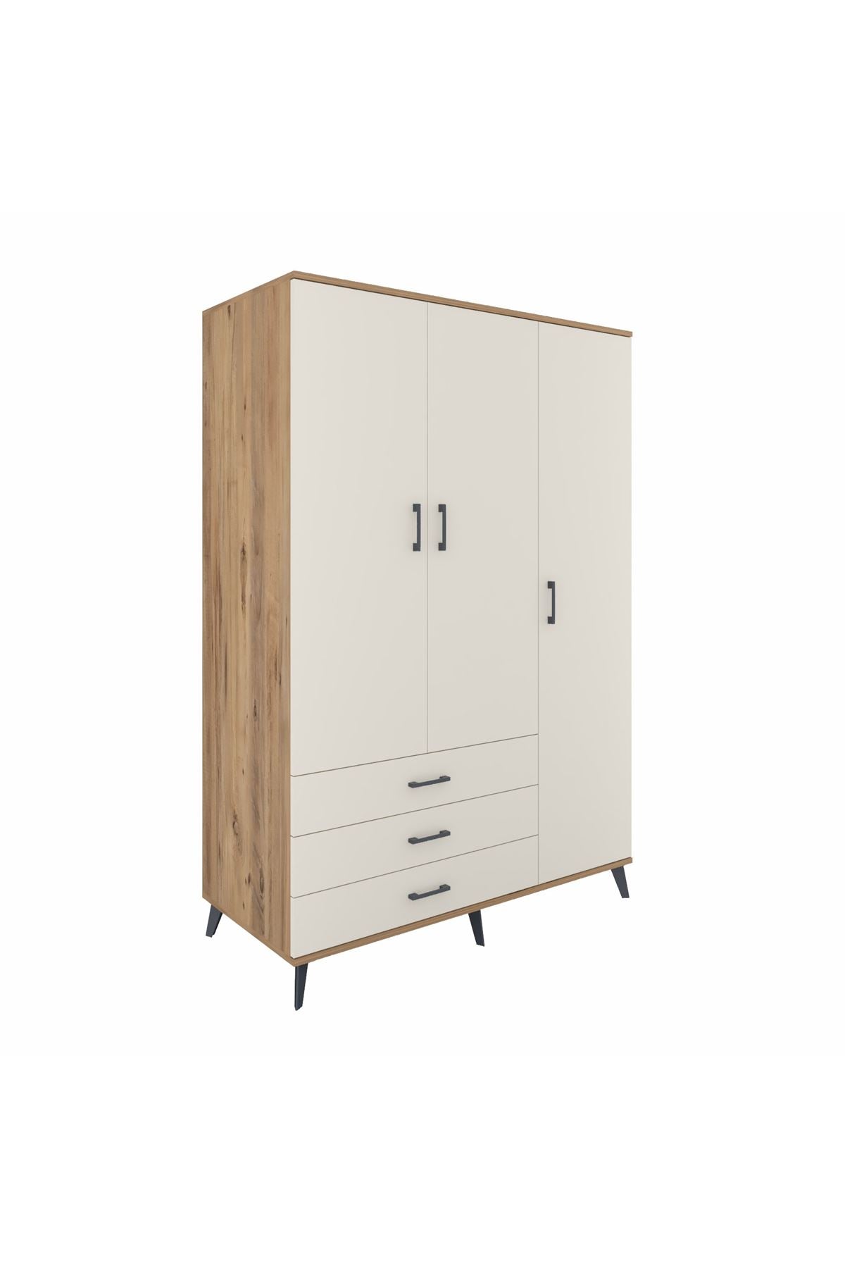 Dayanıklılığı ve şıklığı bir arada sunan Kronos Dolap, 1. sınıf Kastamonu Entegre suntalam gövdeye sahip. Kapak ve gövdede Atlas Çam rengiyle doğallığın sıcaklığını yansıtır. Metal ayaklar ve metal kulplar uzun ömürlü kullanım sunarken, 1.2 mm kalın kenar bandı sayesinde ekstra sağlamlık sağlar. 🪵🔩