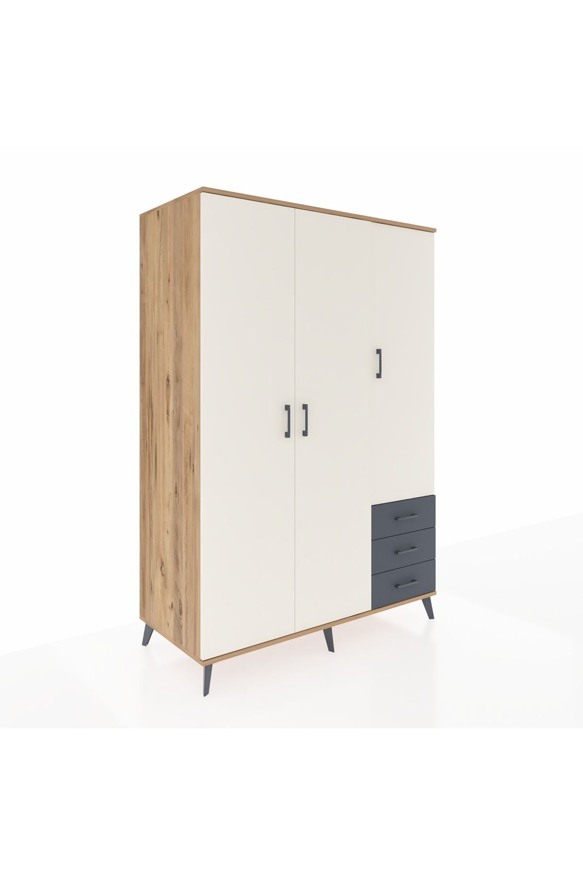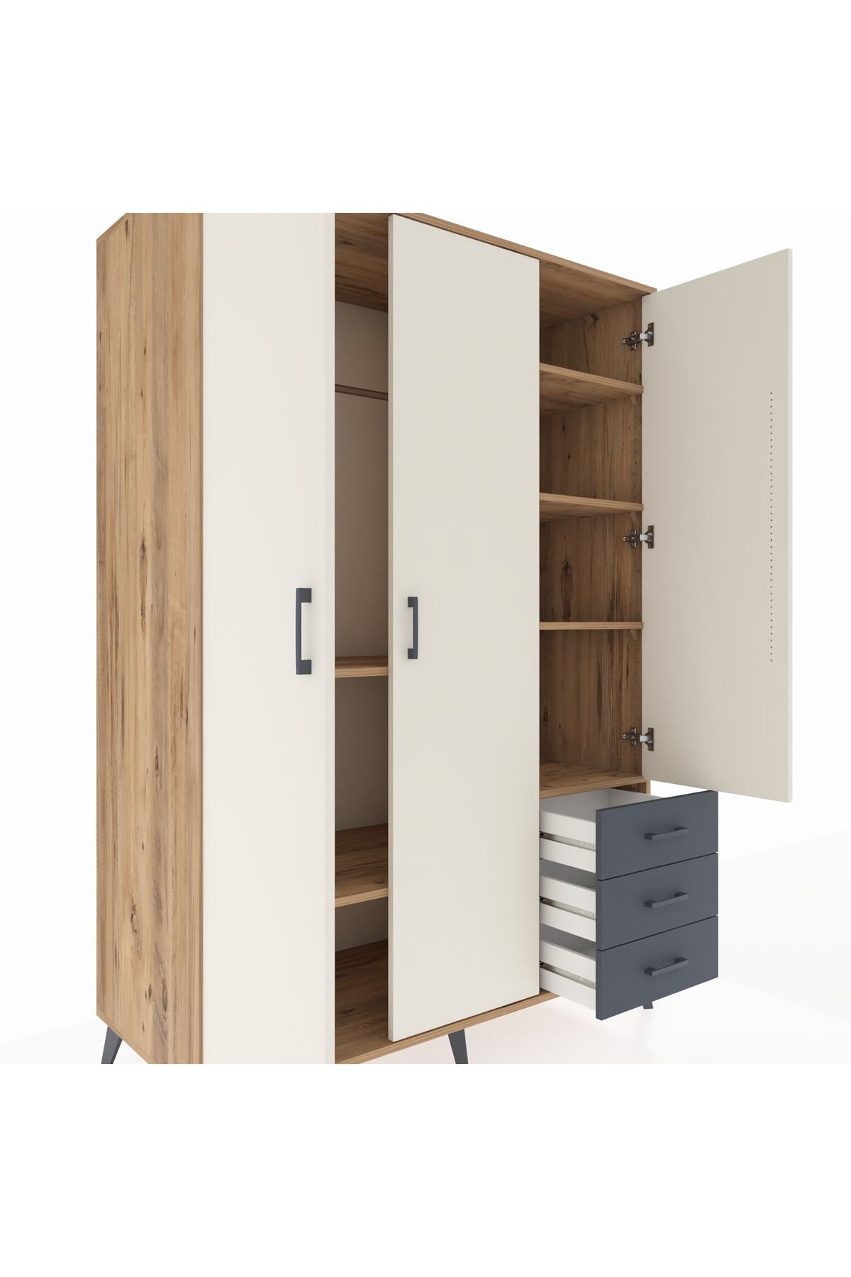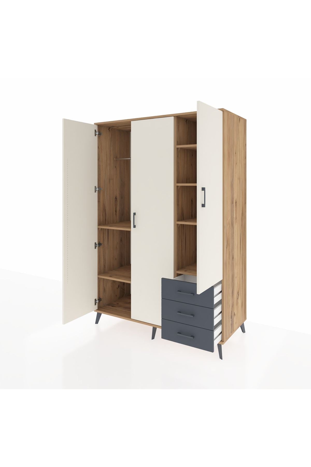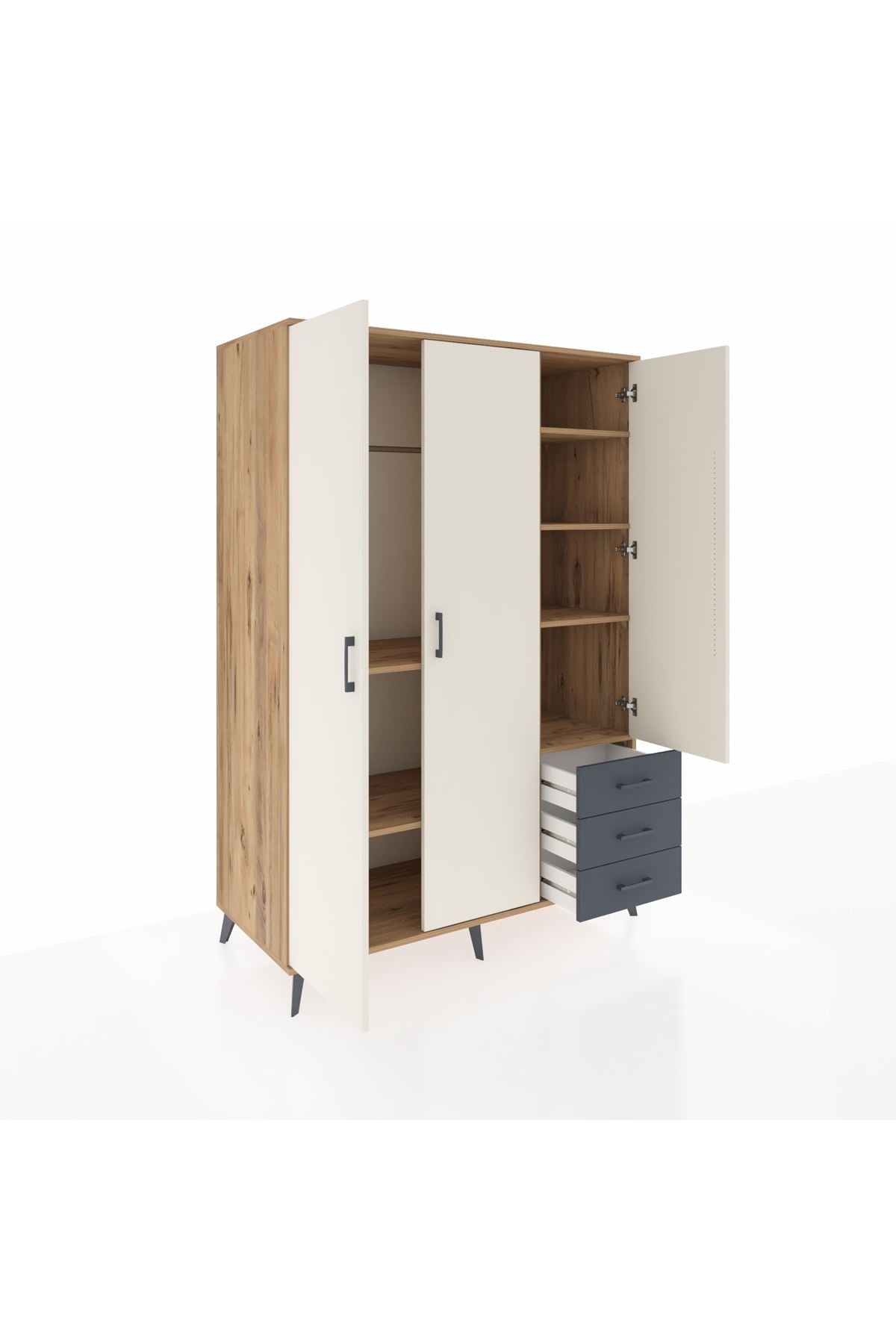 Kronos Dolap 6 Raflı 3 Çekmeceli Tek Askılı 132x59x195 Çam-Aytaşı/Antrasit
