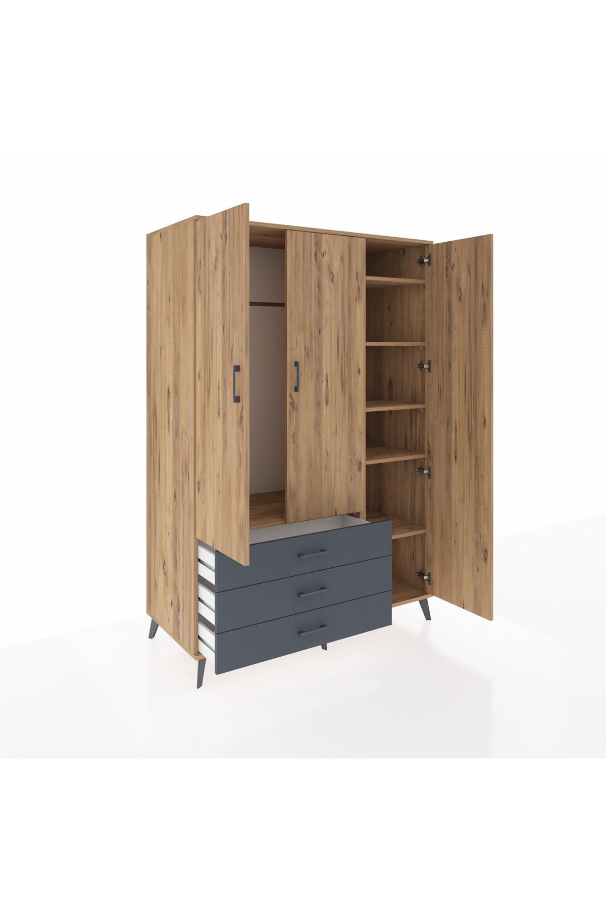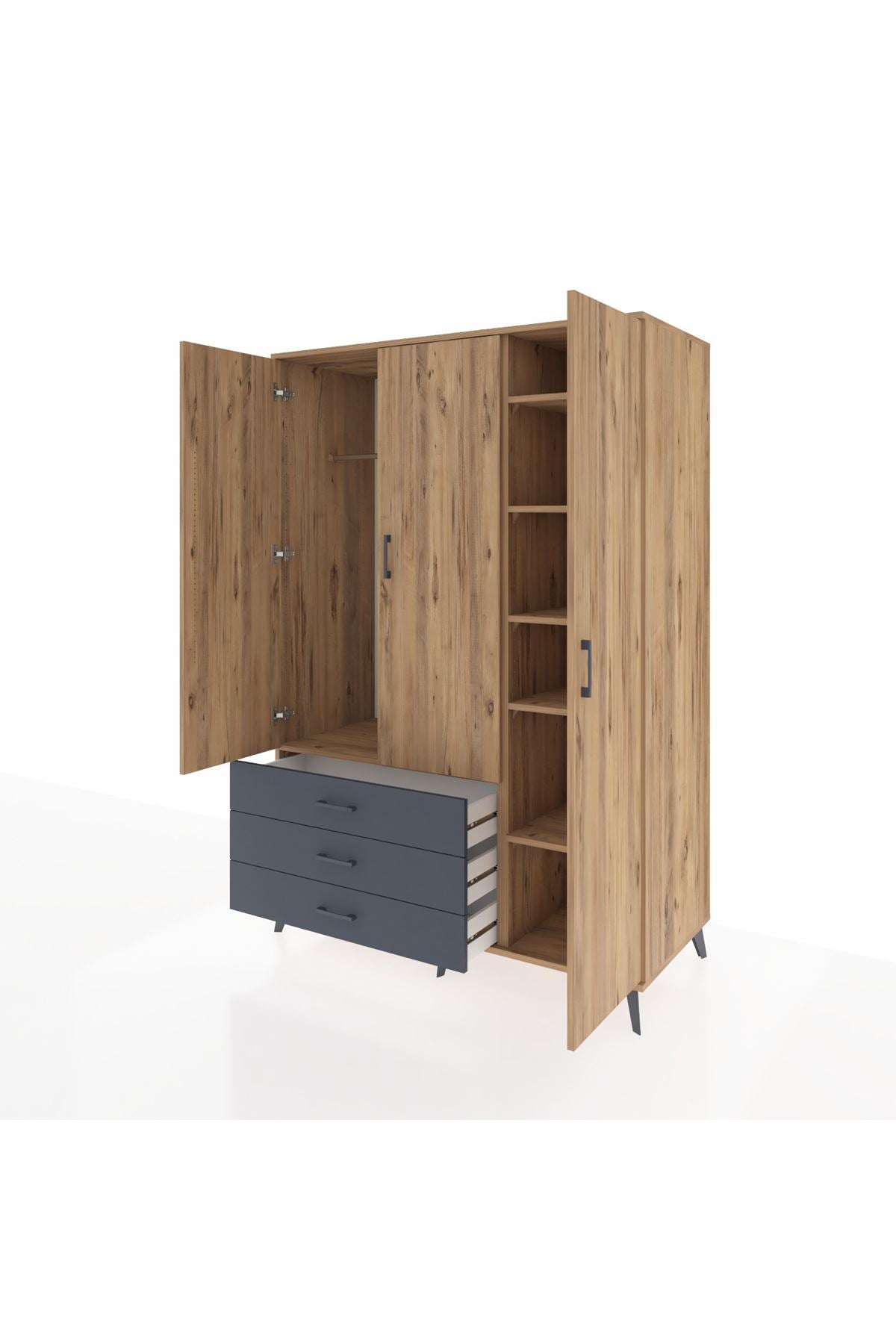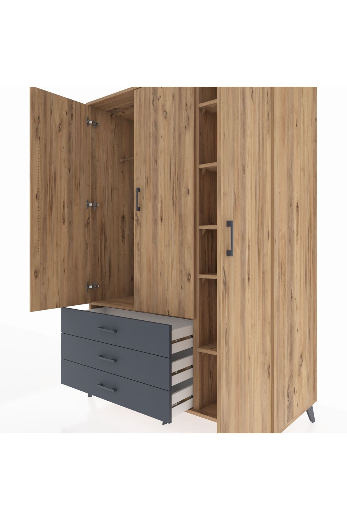 Kronos Dolap 6 Raflı 3 Çekmeceli Tek Askılı 132x59x195 Çam-Çam/Antrasit