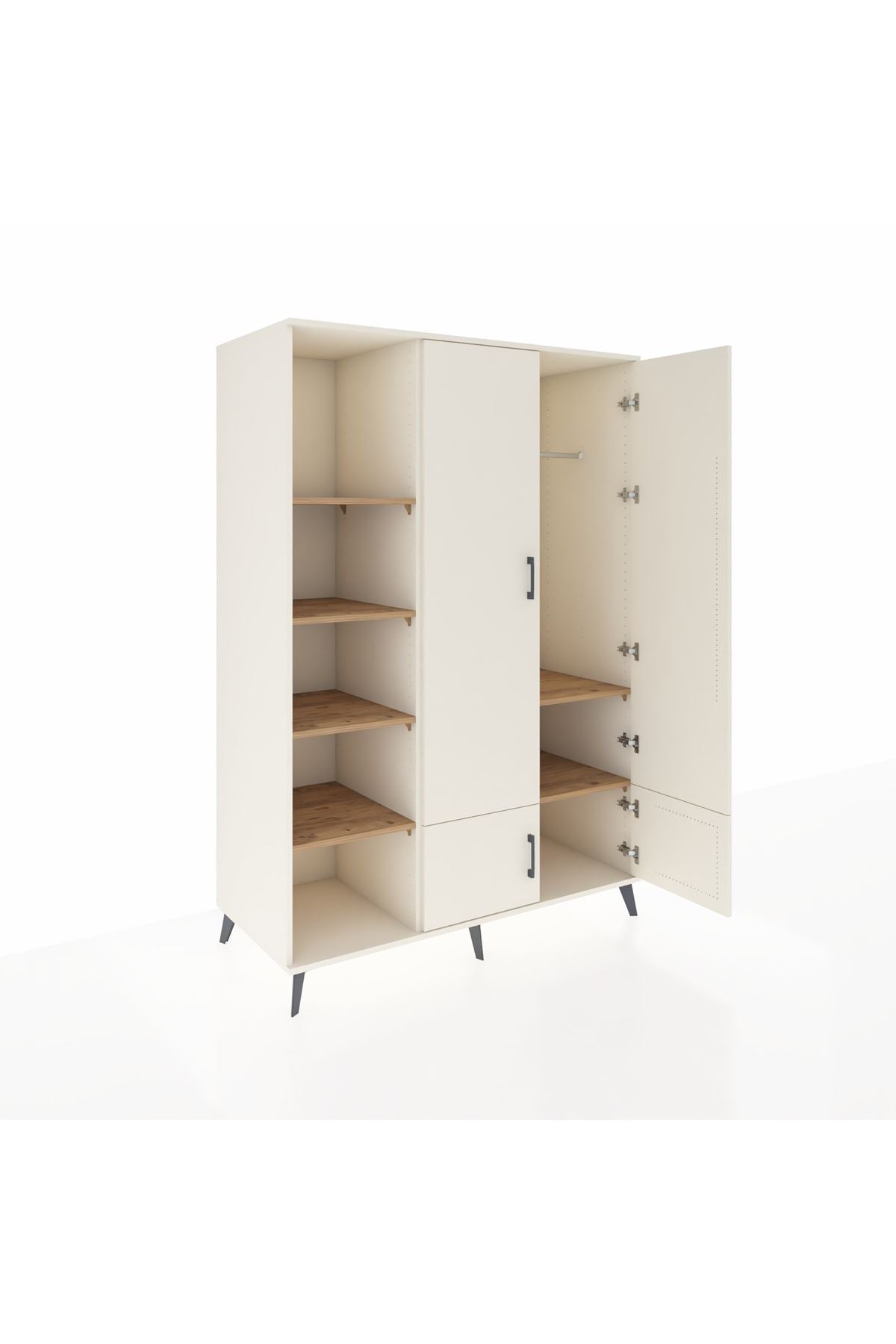 Geniş iç hacmi sayesinde 6 adet sağlam rafı ve tek askılık bölümüyle hem kıyafetlerinizi hem de çeşitli eşyalarınızı kolayca düzenleyebilirsiniz 👗👚📦 132 cm genişliği ve 195 cm yüksekliği, farklı oda boyutlarına uyum sağlar Aytaşı ve çam tonlarındaki gövde ve kapaklar, doğal ve ferah bir atmosfer sunar 🌲🤍
