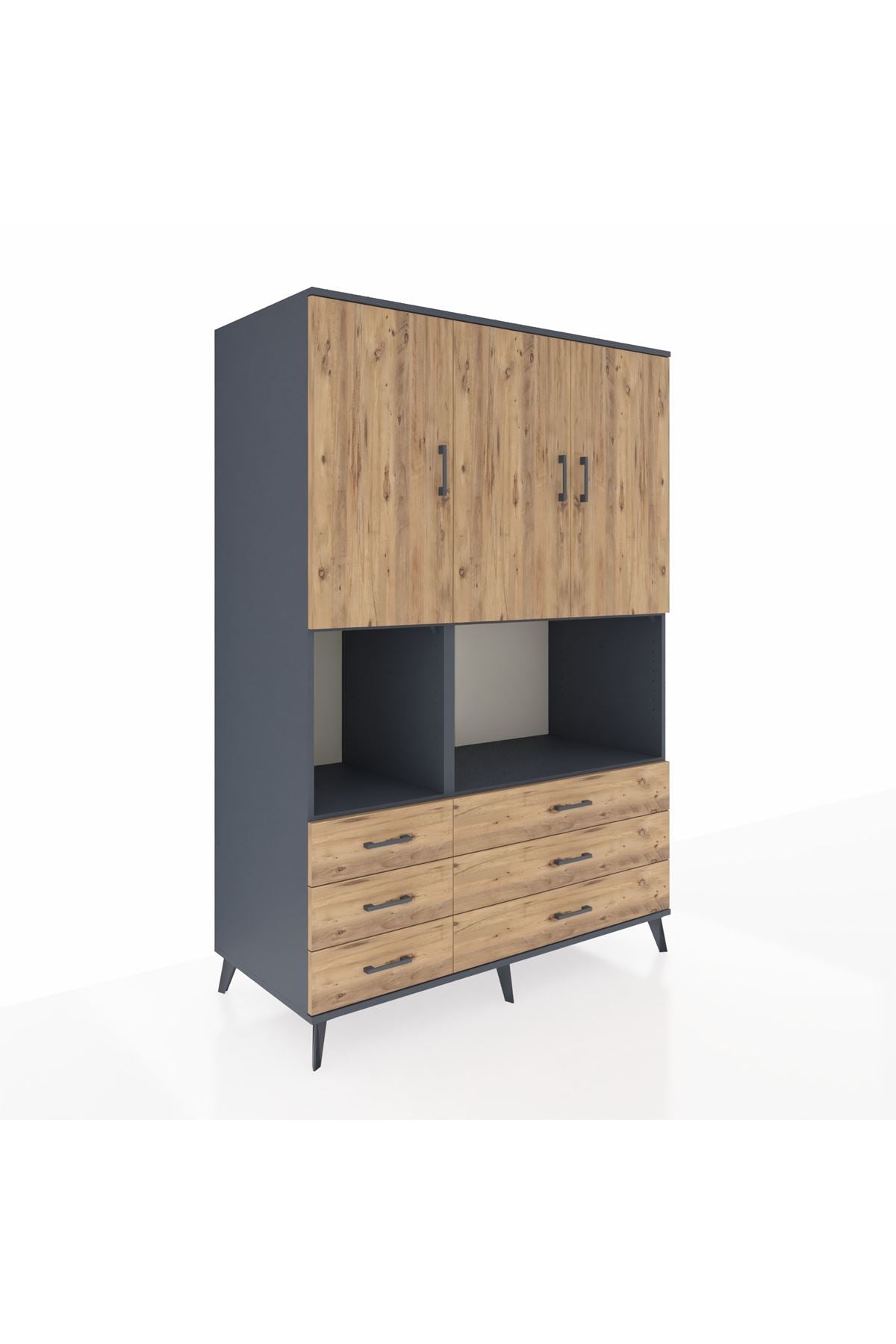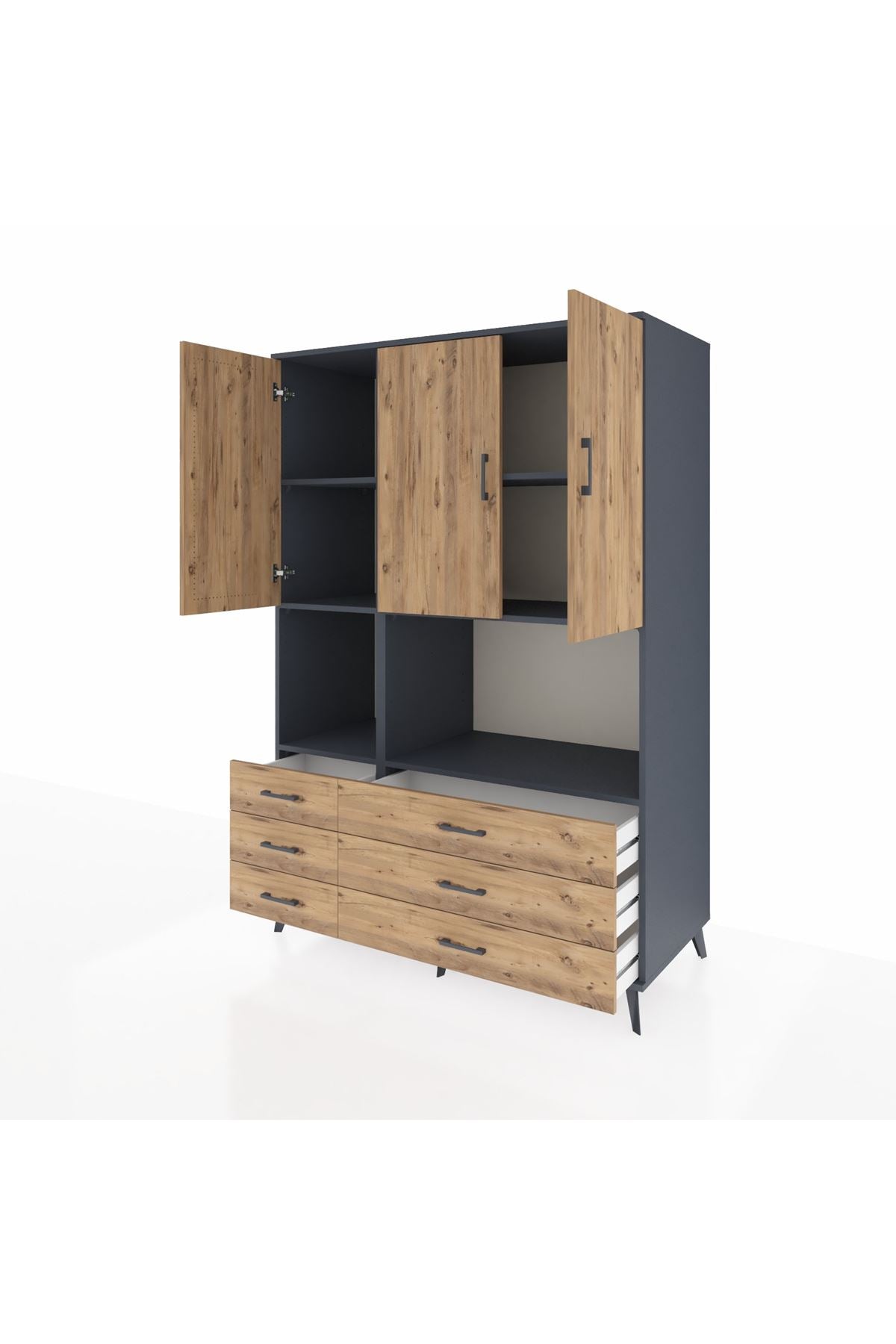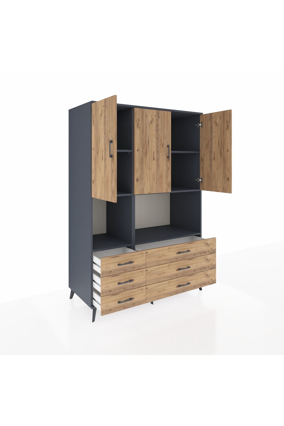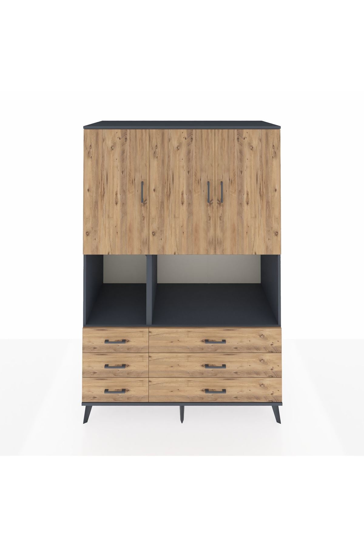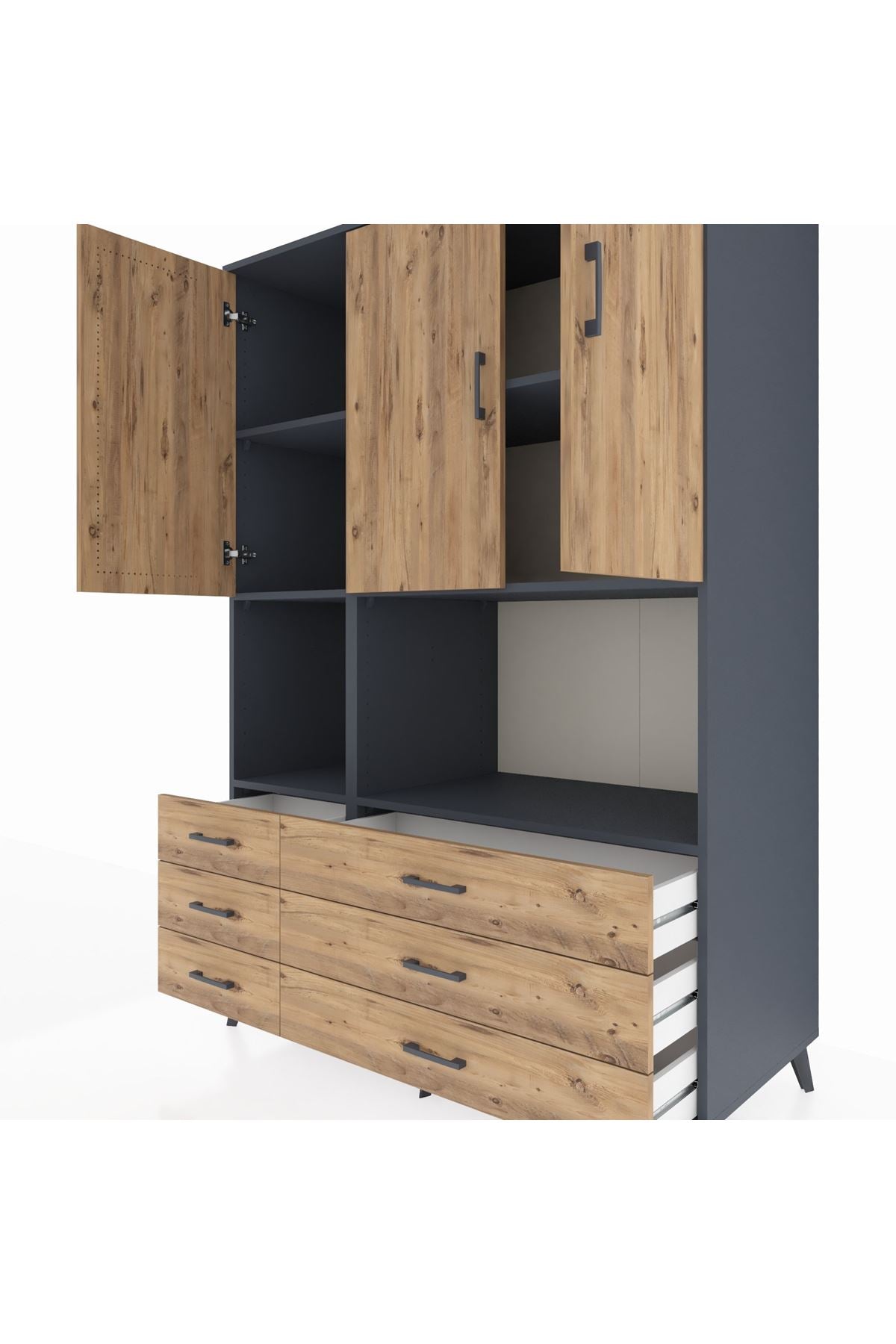 Kronos Dolap 6 Raflı 6 Çekmeceli 3 Kapaklı 132x59x195 Antrasit-Çam/Çam